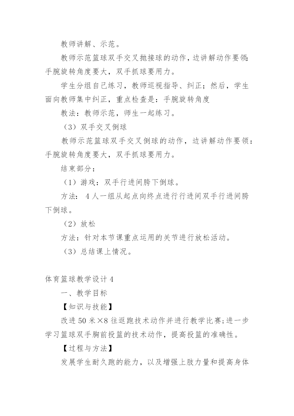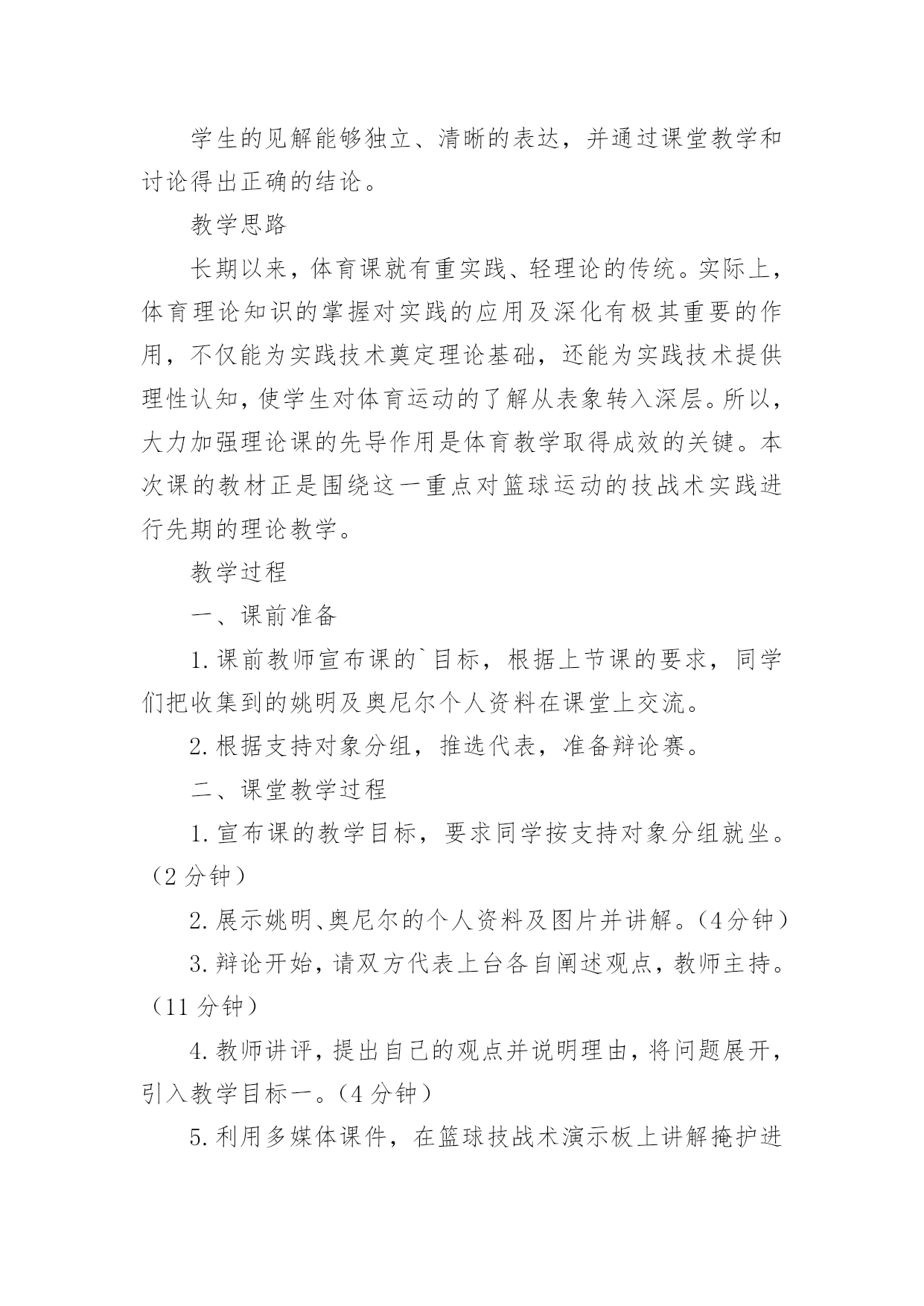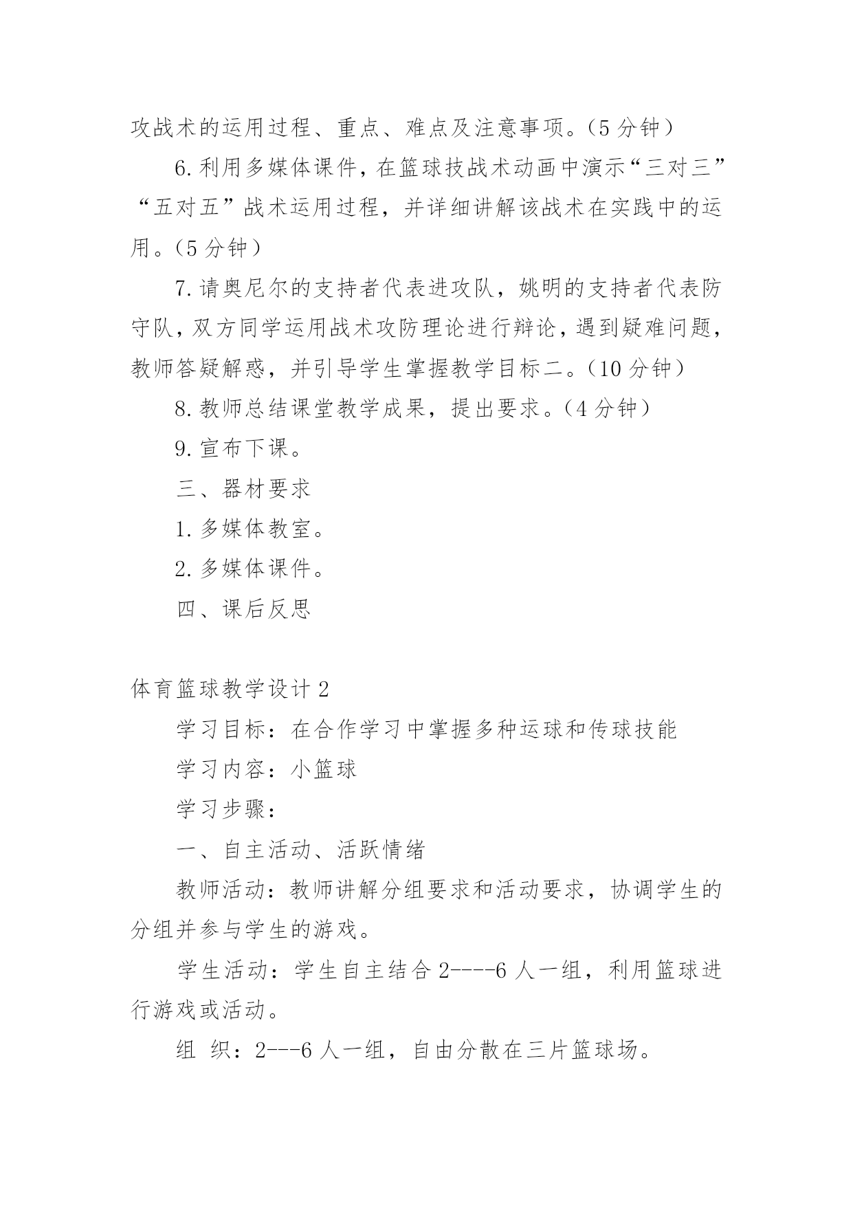 体育篮球教学设计作为一名教职工,总归要编写教学设计,教学设计是对学业业绩问题的解决措施进行策划的过程。那么问题来了,教学设计应该怎么写?下面是小编为大家收集的体育篮球教学设计,供大家参考借鉴,希望可以帮助到有需要的朋友。体育篮球教学设计1教育教学目标一、知识目标1.了解篮球比赛运动员身体对抗的三大要素:身高、体重、技术。2.了解简单的篮球技战术理论和实践运用手段。二、能力目标1.通过多媒体课件演示,让学生初步了解篮球运动技战术配合意识。2.通过引入课堂辩论的教学方式,提高学生分析问题、解决问题的能力。三、情感目标培养学生公平竞争,集体合作的学习意识,激发学生对篮球运动的兴趣。教学重点现代及未来篮球运动技战术的发展方向及趋势。教学难点学生的见解能够独立、清晰的表达,并通过课堂教学和讨论得出正确的结论。教学思路长期以来,体育课就有重实践、轻理论的传统。实际上,体育理论知识的掌握对实践的应用及深化有极其重要的作用,不仅能为实践技术奠定理论基础,还能为实践技术提供理性认知,使学生对体育运动的了解从表象转入深层。所以,大力加强理论课的先导作用是体育教学取得成效的关键。本次课的教材正是围绕这一重点对篮球运动的技战术实践进行先期的理论教学。教学过程一、课前准备1.课前教师宣布课的`目标,根据上节课的要求,同学们把收集到的姚明及奥尼尔个人资料在课堂上交流。2.根据支持对象分组,推选代表,准备辩论赛。二、课堂教学过程1.宣布课的教学目标,要求同学按支持对象分组就坐。(2分钟)2.展示姚明、奥尼尔的个人资料及图片并讲解。(4分钟)3.辩论开始,请双方代表上台各自阐述观点,教师主持。(11分钟)4.教师讲评,提出自己的观点并说明理由,将问题展开,引入教学目标一。(4分钟)5.利用多媒体课件,在篮球技战术演示板上讲解掩护进攻战术的运用过程、重点、难点及注意事项。(5分钟)6.利用多媒体课件,在篮球技战术动画中演示“三对三”“五对五”战术运用过程,并详细讲解该战术在实践中的运用。(5分钟)7.请奥尼尔的支持者代表进攻队,姚明的支持者代表防守队,双方同学运用战术攻防理论进行辩论,遇到疑难问题,教师答疑解惑,并引导学生掌握教学目标二。(10分钟)8.教师总结课堂教学成果,提出要求。(4分钟)9.宣布下课。三、器材要求1.多媒体教室。2.多媒体课件。四、课后反思体育篮球教学设计2学习目标:在合作学习中掌握多种运球和传球技能学习内容:小篮球学习步骤:一、自主活动、活跃情绪教师活动:教师讲解分组要求和活动要求,协调学生的分组并参与学生的游戏。学生活动:学生自主结合2----6人一组,利用篮球进行游戏或活动。组织:2---6人一组,自由分散在三片篮球场。二、合作探究、掌握技能重点:传接球时上下肢的协调动作。难点:传接球时两人间的默契配合。教师活动:提出分组要求和活动要求,组织学生分小组练习,巡回指导,及时点评,加以鼓励。学生活动:1、自主分小组,通过相互观察、帮助进行各种运球练习,并通过相互的协商进行多种形式的运球练习,通过互动合作的练习熟练运球技能。2、组织各小组展示1---2种本小组最得意的练习形式,通过相互的'了解,进行取长补短地练习。教师活动:提出分组要求,巡回指导,及时示范纠错。学生活动:1、两人一组,一位男生带领一位女生进行胸前传接球习,利用男生的动作优势来带领女生练习。3、小组扩大,6---8人一组,学生小组商讨传球练习的形式,利用多种形式进行传球,体验同伴间的相互配合和传球时的上下肢协调用力动作。4、分小组展示,相互学习、积极交流(以你觉得他们一组什么地方最好进行点评)组织:自由分散自主组织(确保小组活动有安全距离)三、创新延伸、展示技能教师活动:鼓励、提示,协助游戏。学生活动:1、小组商讨、利用篮球,借助所掌握的技能创编一个游戏,并亲身体验游戏的乐趣。2、游戏表演、展示,评选最佳创思小组、最善于合作小组、技能娴熟小组,每个小组评出进步最大的组员、合作最好的伙伴。组织:自由分散,形式自主场地器材:二片篮球场、每生一球体育篮球教学设计3学情分析:小学三年级学生,生性好动,经过第一学期的篮球学习,学生已经掌握了篮球运球的基本动作,有了篮球运球的基本雏形,同时具备了一定的身体素质。学生对篮球运动还保持了良好的学习兴趣和学习习惯,特别是对有对抗性的练习项目比较感兴趣教材技术结构分析:篮球运动是一项综合性体育活动。经常参加篮球运动,可以提高儿童少年观察、判断、快速反应的能力,促进身体素质的全面发展。篮球运动的对抗性,有利于学生在经历挫折和困难的过程中,提高抗挫能力和情绪调节能力,培养坚强的意志品质。篮球运动的集体性,使学生建立起对自我、群体的`社会责任感,形成现代社会所必需的合作与竞争意识,学会尊重和关心他人,培养良好的体育道德和集体主义精神。篮球的趣味