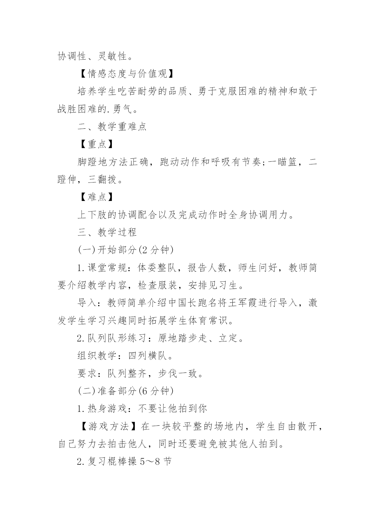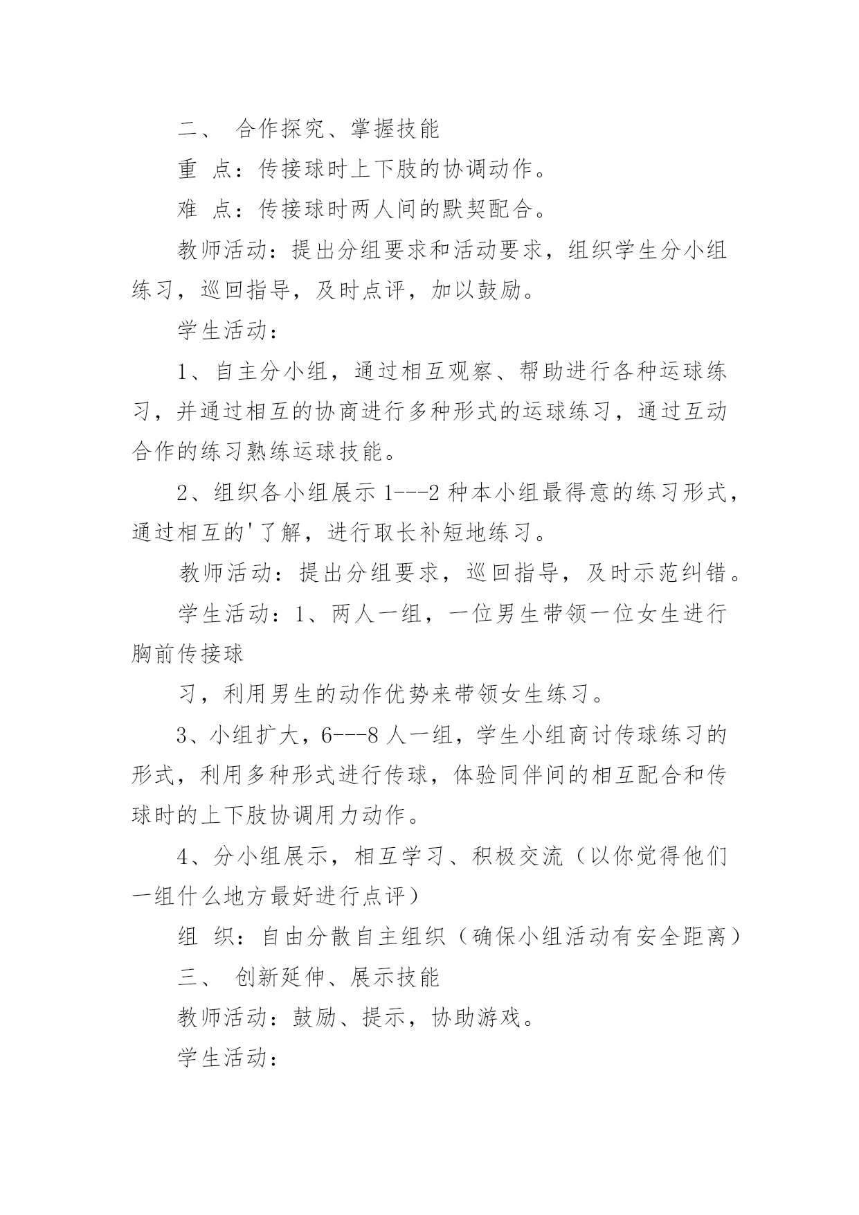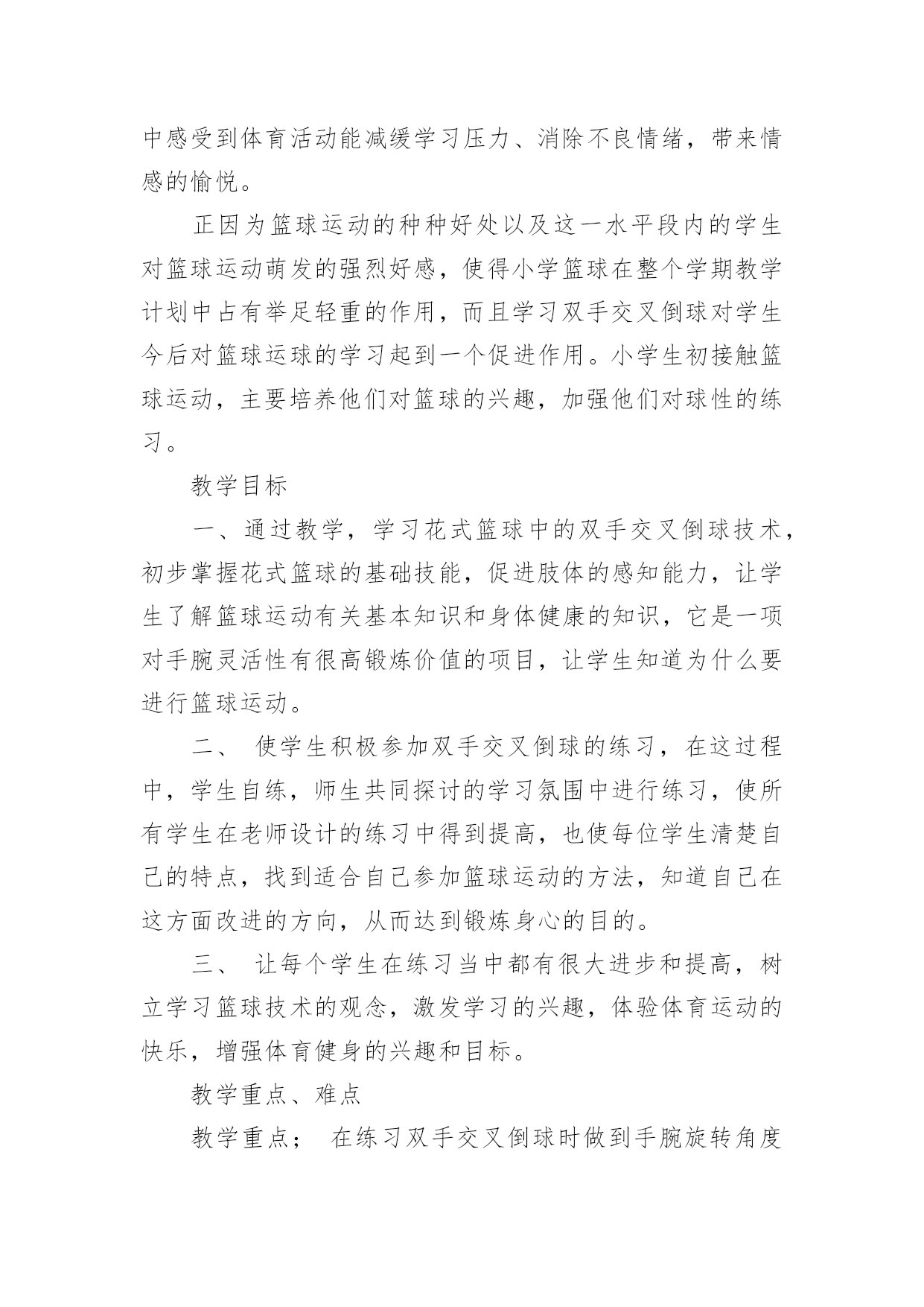 体育篮球教学设计作为一名教职工,总归要编写教学设计,教学设计是对学业业绩问题的解决措施进行策划的过程。那么问题来了,教学设计应该怎么写?下面是小编为大家收集的体育篮球教学设计,供大家参考借鉴,希望可以帮助到有需要的朋友。体育篮球教学设计1教育教学目标一、知识目标1.了解篮球比赛运动员身体对抗的三大要素:身高、体重、技术。2.了解简单的篮球技战术理论和实践运用手段。二、能力目标1.通过多媒体课件演示,让学生初步了解篮球运动技战术配合意识。2.通过引入课堂辩论的教学方式,提高学生分析问题、解决问题的能力。三、情感目标培养学生公平竞争,集体合作的学习意识,激发学生对篮球运动的兴趣。教学重点现代及未来篮球运动技战术的发展方向及趋势。教学难点学生的见解能够独立、清晰的表达,并通过课堂教学和讨论得出正确的结论。教学思路长期以来,体育课就有重实践、轻理论的传统。实际上,体育理论知识的掌握对实践的应用及深化有极其重要的作用,不仅能为实践技术奠定理论基础,还能为实践技术提供理性认知,使学生对体育运动的了解从表象转入深层。所以,大力加强理论课的先导作用是体育教学取得成效的关键。本次课的教材正是围绕这一重点对篮球运动的技战术实践进行先期的理论教学。教学过程一、课前准备1.课前教师宣布课的`目标,根据上节课的要求,同学们把收集到的姚明及奥尼尔个人资料在课堂上交流。2.根据支持对象分组,推选代表,准备辩论赛。二、课堂教学过程1.宣布课的教学目标,要求同学按支持对象分组就坐。(2分钟)2.展示姚明、奥尼尔的个人资料及图片并讲解。(4分钟)3.辩论开始,请双方代表上台各自阐述观点,教师主持。(11分钟)4.教师讲评,提出自己的观点并说明理由,将问题展开,引入教学目标一。(4分钟)5.利用多媒体课件,在篮球技战术演示板上讲解掩护进攻战术的运用过程、重点、难点及注意事项。(5分钟)6.利用多媒体课件,在篮球技战术动画中演示“三对三”“五对五”战术运用过程,并详细讲解该战术在实践中的运用。(5分钟)7.请奥尼尔的支持者代表进攻队,姚明的支持者代表防守队,双方同学运用战术攻防理论进行辩论,遇到疑难问题,教师答疑解惑,并引导学生掌握教学目标二。(10分钟)8.教师总结课堂教学成果,提出要求。(4分钟)9.宣布下课。三、器材要求1.多媒体教室。2.多媒体课件。四、课后反思体育篮球教学设计2学习目标:在合作学习中掌握多种运球和传球技能学习内容:小篮球学习步骤:一、自主活动、活跃情绪教师活动:教师讲解分组要求和活动要求,协调学生的分组并参与学生的游戏。学生活动:学生自主结合2----6人一组,利用篮球进行游戏或活动。组织:2---6人一组,自由分散在三片篮球场。二、合作探究、掌握技能重点:传接球时上下肢的协调动作。难点:传接球时两人间的默契配合。教师活动:提出分组要求和活动要求,组织学生分小组练习,巡回指导,及时点评,加以鼓励。学生活动:1、自主分小组,通过相互观察、帮助进行各种运球练习,并通过相互的协商进行多种形式的运球练习,通过互动合作的练习熟练运球技能。2、组织各小组展示1---2种本小组最得意的练习形式,通过相互的'了解,进行取长补短地练习。教师活动:提出分组要求,巡回指导,及时示范纠错。学生活动:1、两人一组,一位男生带领一位女生进行胸前传接球习,利用男生的动作优势来带领女生练习。3、小组扩大,6---8人一组,学生小组商讨传球练习的形式,利用多种形式进行传球,体验同伴间的相互配合和传球时的上下肢协调用力动作。4、分小组展示,相互学习、积极交流(以你觉得他们一组什么地方最好进行点评)组织:自由分散自主组织(确保小组活动有安全距离)三、创新延伸、展示技能教师活动:鼓励、提示,协助游戏。学生活动:1、小组商讨、利用篮球,借助所掌握的技能创编一个游戏,并亲身体验游戏的乐趣。2、游戏表演、展示,评选最佳创思小组、最善于合作小组、技能娴熟小组,每个小组评出进步最大的组员、合作最好的伙伴。组织:自由分散,形式自主场地器材:二片篮球场、每生一球体育篮球教学设计3学情分析:小学三年级学生,生性好动,经过第一学期的篮球学习,学生已经掌握了篮球运球的基本动作,有了篮球运球的基本雏形,同时具备了一定的身体素质。学生对篮球运动还保持了良好的学习兴趣和学习习惯,特别是对有对抗性的练习项目比较感兴趣教材技术结构分析:篮球运动是一项综合性体育活动。经常参加篮球运动,可以提高儿童少年观察、判断、快速反应的能力,促进身体素质的全面发展。篮球运动的对抗性,有利于学生在经历挫折和困难的过程中,提高抗挫能力和情绪调节能力,培养坚强的意志品质。篮球运动的集体性,使学生建立起对自我、群体的`社会责任感,形成现代社会所必需的合作与竞争意识,学会尊重和关心他人,培养良好的体育道德和集体主义精神。篮球的趣味