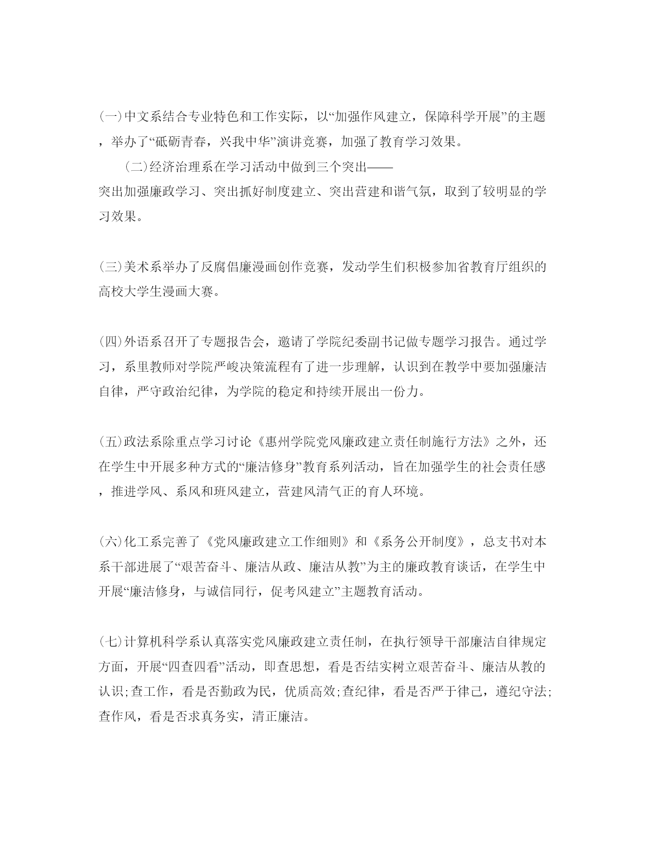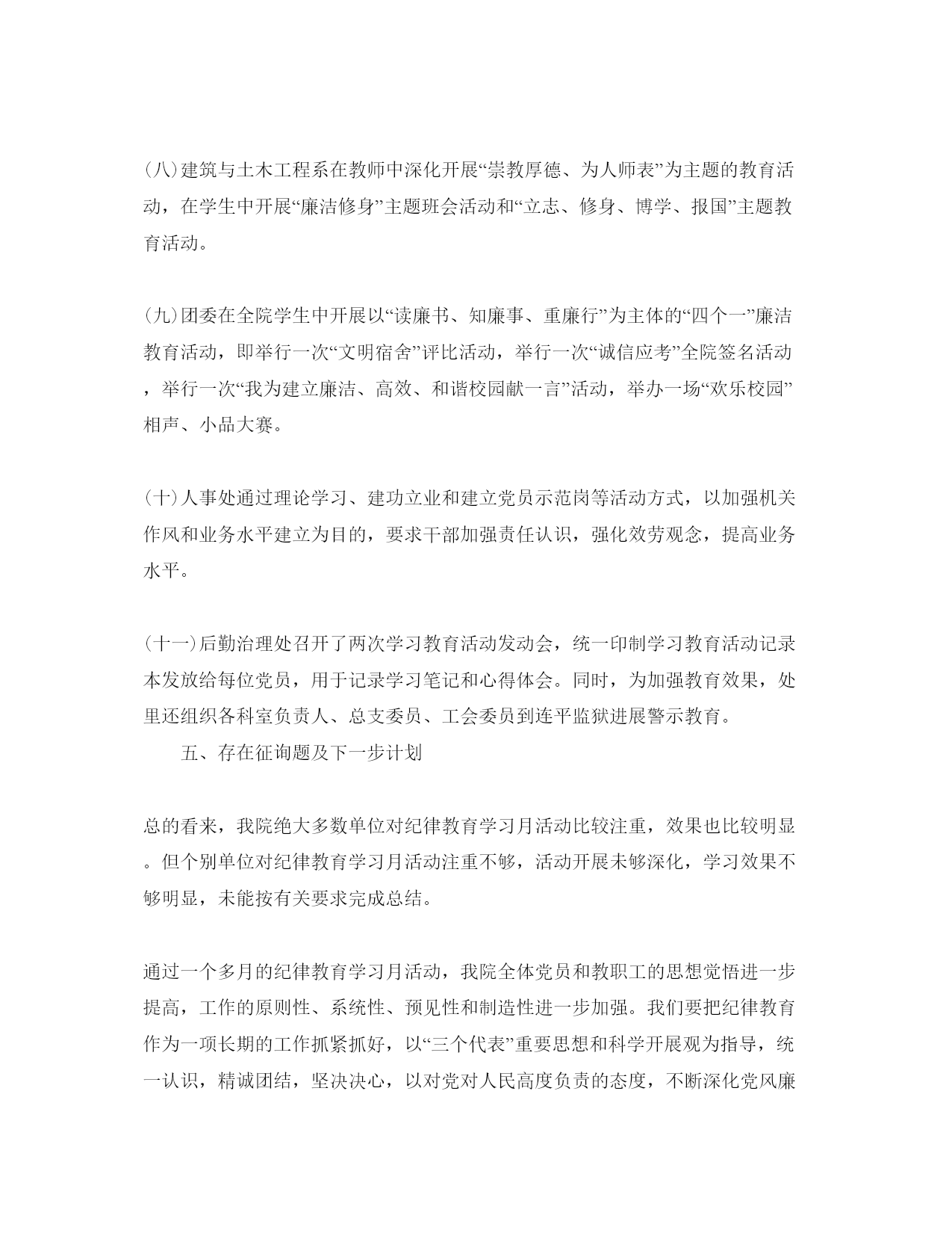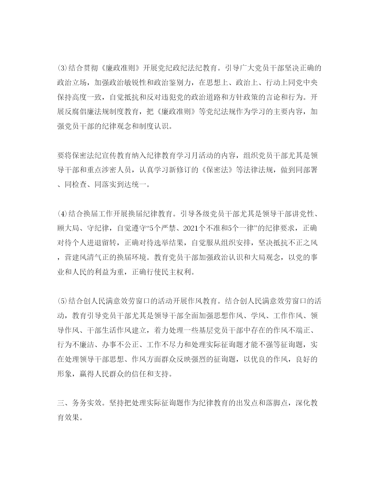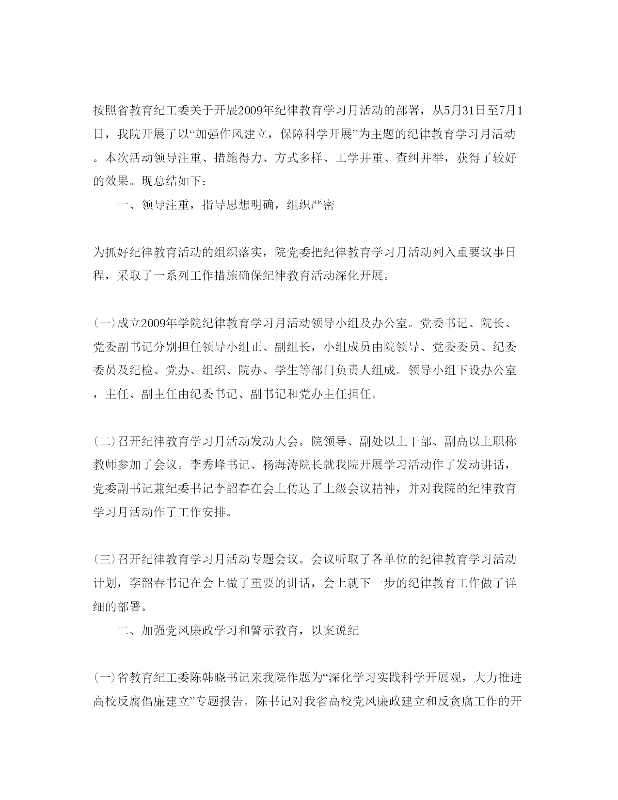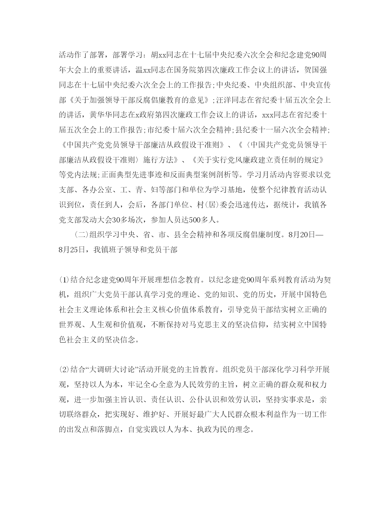 2021年工商纪律教育月参考总结工商纪律教育月总结范文一自从活动开展以来,邓小平理论和“三个代表”重要思想为指导,深化贯彻落实开展观和党的xx大和十七届五中全会精神,以“以人为本、执政为民”为主题,加强对党员干部的反腐倡廉教育。实在抓好公务员队伍和企事业单位领导成员的廉洁教育。这成为我镇坚持的主要思想,通过这次学习,对提高党员的思想觉悟有特别大的协助,下面就对我镇纪律教育学习月活动总结如下:一、精心组织纪律教育学习月活动为抓好纪律教育活动组织,我镇党委把纪律教育学习月活动列入重要议事日程,制定一系列措施,确保教育活动落到实处:一、成立领导小组,由镇委书记任组长,分管党风廉政工作的领导担任副组长,成员由各部门人员、村(居)支书主任组成,确保工作落到实处。各村(居)委会也成立了工作小组,构成一级抓一级,层层抓落实的组织机制。二、精心制定方案,结合我镇实际,制定《莫村镇关于2011年开展纪律教育学习活动月施行意见》,科学安排、缜密部署我镇党员干部学习纪律教育学习月活动内容和学习时间,为教育活动实效奠定了根底。三、划定教育范围,我镇纪律教育学习月活动教育对象是全镇党员干部,对教育对象还作了分类教育,对党员干部开展以制度为重点的党性党纪教育,对公职人员开展廉政教育,对全社会开展廉洁教育。我镇侧重地抓了领导班子成员的纪律教育,以此带动全镇纪律教育自上而下铺开。四、抓好催促检查,为防止教育活动流于和走过场,我镇对教育活动进展检查和催促,要求总结汇报在学习中遇到征询题和好经历,写好学习心得体会,保证了教育活动落到实处。二、做好学习培训(一)开好发动会。8月9日我镇举行纪律教育学习月发动大会,镇府全体干部职工,及各村(居)委会支书主任共100多人参加了会议,会议学习了文件精神并对教育活动作了部署,部署学习:胡xx同志在十七届中央纪委六次全会和纪念建党90周年大会上的重要讲话,温xx同志在国务院第四次廉政工作会议上的讲话,贺国强同志在十七届中央纪委六次全会上的工作报告;中央纪委、中央组织部、中央宣传部《关于加强领导干部反腐倡廉教育的意见》;汪洋同志在省纪委十届五次全会上的讲话,黄华华同志在x政府第四次廉政工作会议上的讲话,xxx同志在省纪委十届五次全会上的工作报告;市纪委十届六次全会精神;县纪委十一届六次全会精神;《中国共产党党员领导干部廉洁从政假设干准则》、《〈中国共产党党员领导干部廉洁从政假设干准则〉施行方法》、《关于实行党风廉政建立责任制的规定》等党内法规;正面典型先进事迹和反面典型案例剖析等。学习月活动内容要求以党支部、各办公室、工、青、妇等部门和单位为学习基地,使整个纪律教育活动认识到位,责任到人,会后,各部门单位、村(居)委会迅速传达,据统计,我镇各党支部发动大会30多场次,参加人员达500多人。(二)组织学习中央、省、市、县全会精神和各项反腐倡廉制度。8月20日—8月25日,我镇班子领导和党员干部(1)结合纪念建党90周年开展理想信念教育。以纪念建党90周年系列教育活动为契机,组织广大党员干部认真学习党的理论、党的知识、党的历史,开展中国特色社会主义理论体系和社会主义核心价值体系教育,引导党员干部结实树立正确的世界观、人生观和价值观,不断保持对马克思主义的坚决信仰,结实树立中国特色社会主义的坚决信念。(2)结合“大调研大讨论”活动开展党的主旨教育。组织党员干部深化学习科学开展观,坚持以人为本,牢记全心全意为人民效劳的主旨,树立正确的群众观和权力观,进一步加强主旨认识、责任认识、公仆认识和效劳认识,坚持实事求是,亲切联络群众,把实现好、维护好、开展好最广大人民群众根本利益作为一切工作的出发点和落脚点,自觉实践以人为本、执政为民的理念。(3)结合贯彻《廉政准则》开展党纪政纪法纪教育。引导广大党员干部坚决正确的政治立场,加强政治敏锐性和政治鉴别力,在思想上、政治上、行动上同党中央保持高度一致,自觉抵抗和反对违犯党的政治道路和方针政策的言论和行为。开展反腐倡廉法规制度教育,把《廉政准则》等党纪法规作为学习的主要内容,加强党员干部的纪律观念和制度认识。要将保密法纪宣传教育纳入纪律教育学习月活动的内容,组织党员干部尤其是领导干部和重点涉密人员,认真学习新修订的《保密法》等法律法规,做到同部署、同检查、同落实到达统一。(4)结合换届工作开展换届纪律教育。引导各级党员干部尤其是领导干部讲党性、顾大局、守纪律,自觉遵守“5个严禁、2021个不准和5个一律”的纪律要求,正确对待个人进退留转,正确对待选举结果,自觉服从组织安排,坚决抵抗不正之风,营建风清气正的换届环境。教育党员干部加强政治认识和大局观念,以党的事业和人民的利益为重,正确行使民主权利。(5)结合创人民满意效劳窗口的活动开展作风教育。结合创人民满意效劳窗口的活动,教
