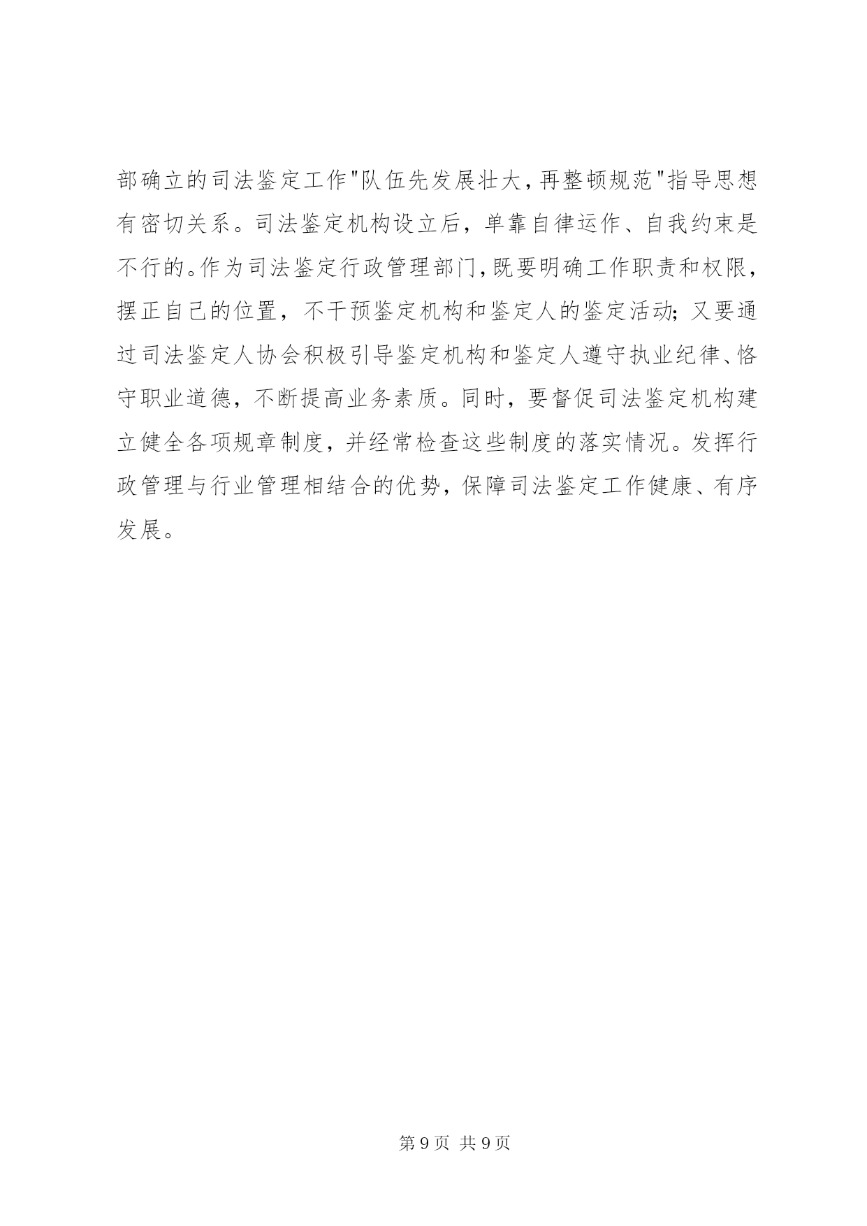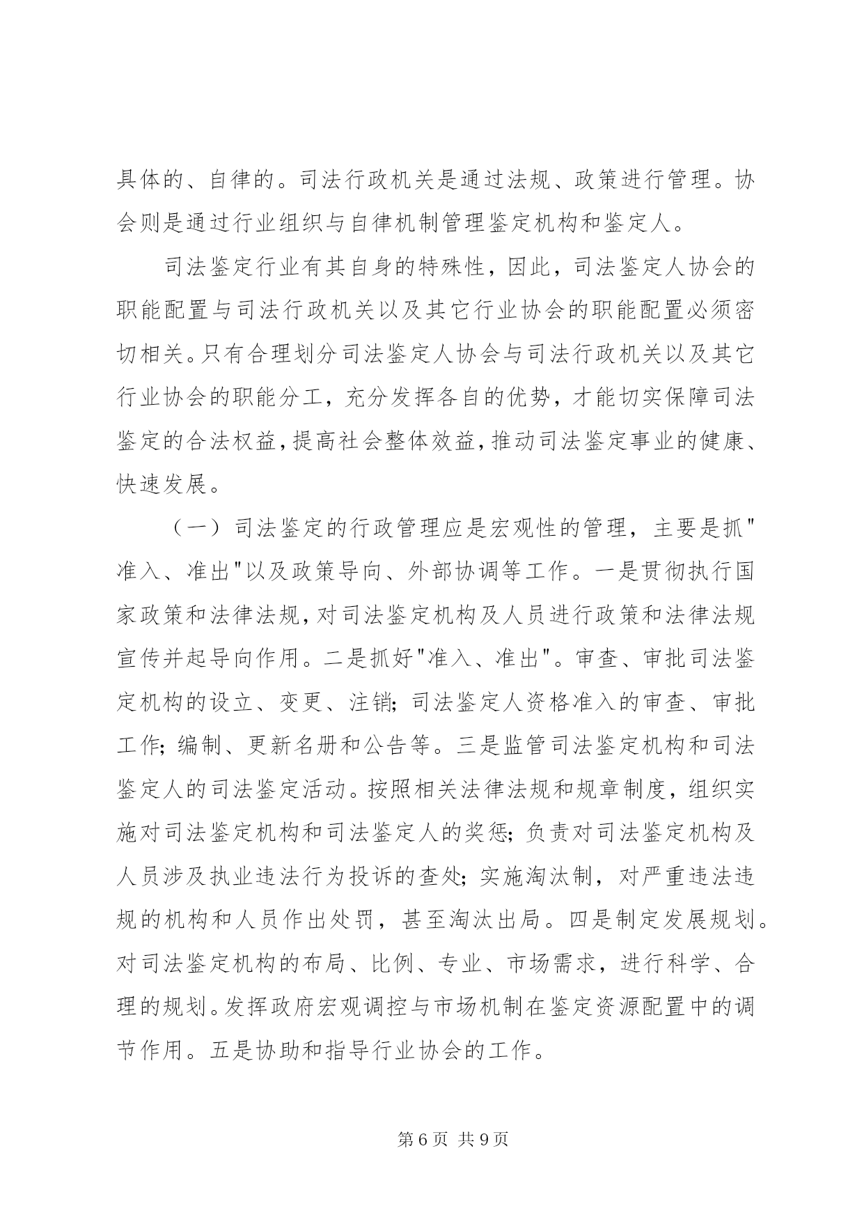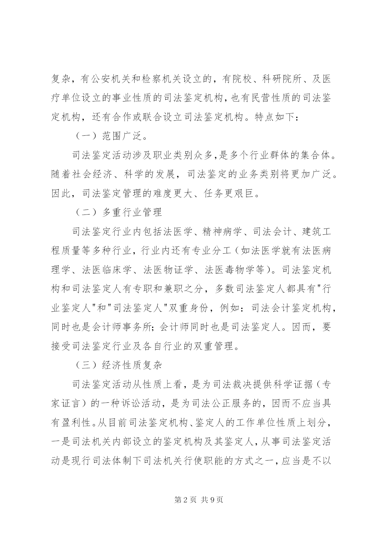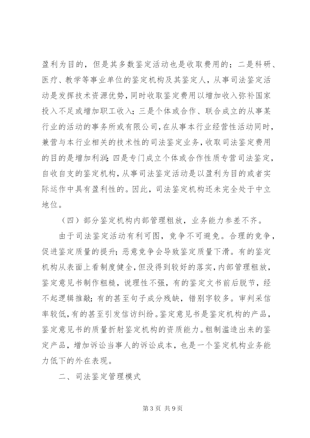 第PAGE\*Arabic\*MERGEFORMAT9页共NUMPAGES\*MERGEFORMAT9页司法鉴定管理与行业相关问题探讨司法鉴定是一项系统社会工程,需要在改革中解决的问题很多也很复杂。诸如:司法鉴定的管理体制、运行体制、启动制度、实施制度、质证制度、采信制度等等。在以上诸多问题中,一个首要问题就是要构建科学的司法鉴定管理体制。1998年,国务院将面向社会服务的司法鉴定管理工作划归司法部负责。党的十六大提出"推进司法体制改革,逐步实现司法审判和检察同司法行政事务相分离"的目标。20xx年2月28日,全国人大常委会通过《关于司法鉴定管理问题的决定》,并决定于20xx年10月1日施行。20xx年9月30日,经国务院批准,司法部公布了《司法鉴定机构登记管理办法》和《司法鉴定人登记管理办法》(以下简称"两办法")。"两办法"中提出:"司法鉴定管理实行行政管理与行业管理相结合的管理制度。司法行政机关对司法鉴定机构及其司法鉴定活动依法进行指导、管理和监督、检查。司法鉴定行业协会依法进行自律管理"。"司法行政机关对司法鉴定人及其执业活动进行指导、管理和监督、检查,司法鉴定行业协会依法进行自律管理"。本文以司法鉴定行业的性质和特点为切入点,就司法鉴定行政管理与行业管理的相关问题进行探讨。一、司法鉴定行业的性质和特点一个行业的管理体制受其行业自身性质、特点限制和决定,司法鉴定管理体制也是如此。目前我国司法鉴定行业的性质比较复杂,有公安机关和检察机关设立的,有院校、科研院所、及医疗单位设立的事业性质的司法鉴定机构,也有民营性质的司法鉴定机构,还有合作或联合设立司法鉴定机构。特点如下:(一)范围广泛。司法鉴定活动涉及职业类别众多,是多个行业群体的集合体。随着社会经济、科学的发展,司法鉴定的业务类别将更加广泛。因此,司法鉴定管理的难度更大、任务更艰巨。(二)多重行业管理司法鉴定行业内包括法医学、精神病学、司法会计、建筑工程质量等多种行业,行业内还有专业分工(如法医学就有法医病理学、法医临床学、法医物证学、法医毒物学等)。司法鉴定机构和司法鉴定人有专职和兼职之分,多数司法鉴定人都具有"行业鉴定人"和"司法鉴定人"双重身份,例如:司法会计鉴定机构,同时也是会计师事务所;会计师同时也是司法鉴定人。因而,要接受司法鉴定行业及各自行业的双重管理。(三)经济性质复杂司法鉴定活动从性质上看,是为司法裁决提供科学证据(专家证言)的一种诉讼活动,是为司法公正服务的,因而不应当具有盈利性。从目前司法鉴定机构、鉴定人的工作单位性质上划分,一是司法机关内部设立的鉴定机构及其鉴定人,从事司法鉴定活动是现行司法体制下司法机关行使职能的方式之一,应当是不以盈利为目的,但是其多数鉴定活动也是收取费用的;二是科研、医疗、教学等事业单位的鉴定机构及其鉴定人,从事司法鉴定活动是发挥技术资源优势,同时收取鉴定费用以增加收入弥补国家投入不足或增加职工收入;三是个体或合作、联合成立的从事某行业的活动的事务所或有限公司,在从事本行业经营性活动同时,兼营与本行业相关的技术性的司法鉴定业务,收取司法鉴定费用的目的是增加利润;四是专门成立个体或合作性质专营司法鉴定,自收自支的鉴定机构,从事司法鉴定活动是以盈利为目的或者实际运作中具有盈利性的。因此,司法鉴定机构还未完全处于中立地位。(四)部分鉴定机构内部管理粗放,业务能力参差不齐。由于司法鉴定活动有利可图,竞争不可避免。合理的竞争,促进鉴定质量的提升;恶意竞争会导致鉴定质量下滑。有的鉴定机构从表面上看制度健全,但没得到较好的落实,内部管理粗放,鉴定意见书制作粗糙,说理性不强,有的鉴定文书前后脱节,经不起逻辑推敲;有的甚至句子成分残缺,错别字较多。审判采信率较低,有的甚至引发信访纠纷。鉴定意见书是鉴定机构的产品,鉴定意见书的质量折射鉴定机构的资质能力。粗制滥造出来的鉴定产品,增加诉讼当事人的诉讼成本,也是一个鉴定机构业务能力低下的外在表现。二、司法鉴定管理模式司法鉴定管理的现状及今后的发展趋势来看,大至有三种管理模式:一是由司法行政机关承担所有的管理职能;二是由司法行政机关与司法鉴定人行业组织分工协作,共同管理司法鉴定行业;三是由司法鉴定人自发组成的行业组织实行独立的自治管理。第一种模式不可取。司法鉴定涉及面较广、专业性极强,对鉴定人的培训、制定鉴定规程以及对外交流等工作由司法行政机关承担,既不方便,也难以胜任。第三种模式不符合我国司法鉴定工作的实际情况,我国司法鉴定行业发展还极不成熟、完善。司法鉴定在我国不过50余年的历史,目前全国还没有一部统一的法律予以规范,司法鉴定人员的素质参差不齐,还不可能实现高度自律,让司法鉴定人协会独立实司法鉴定管理与行业相关问题探讨行行业管理,实在难担此任。第二种模式,不失为目前我国司
