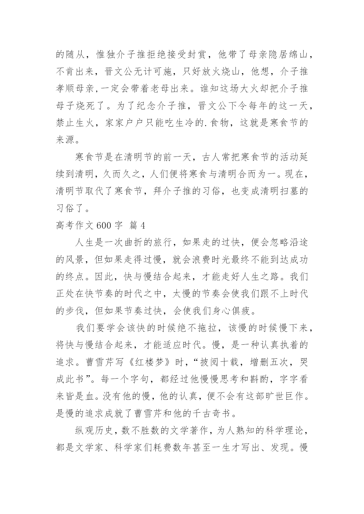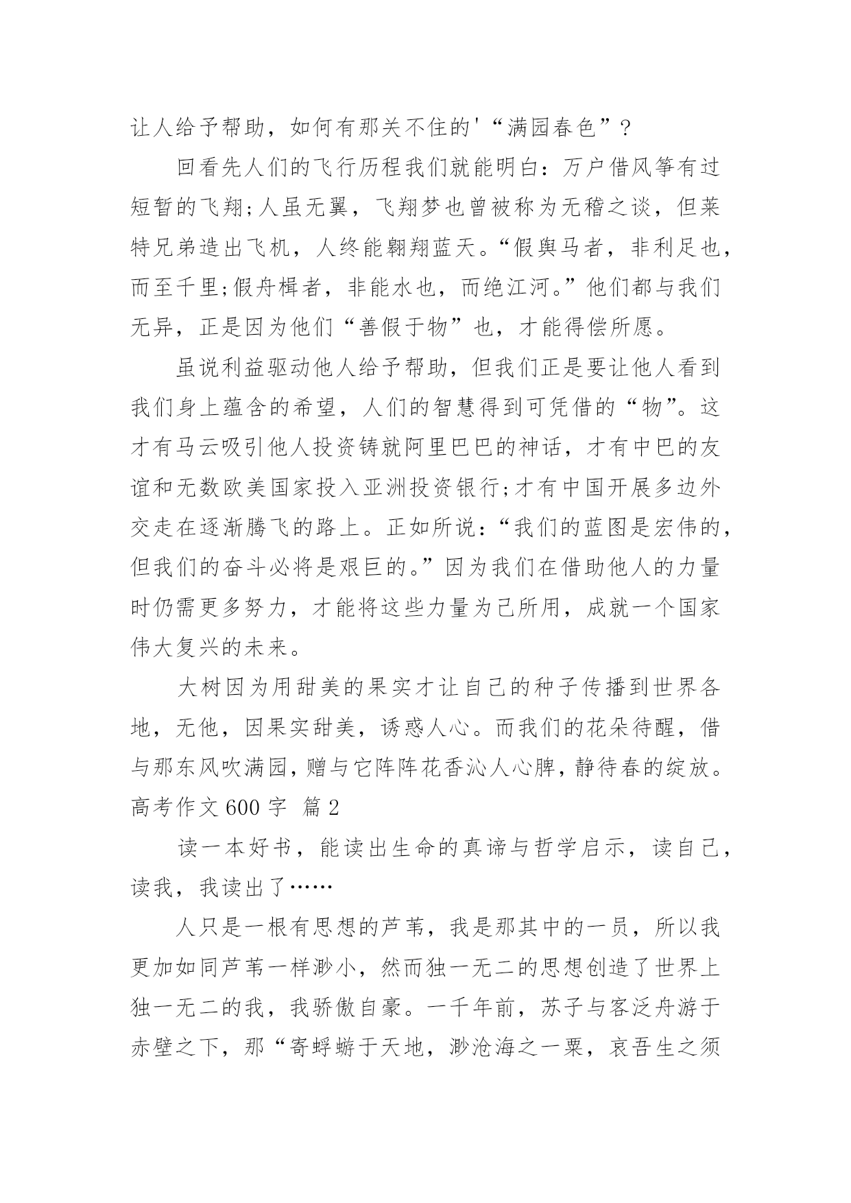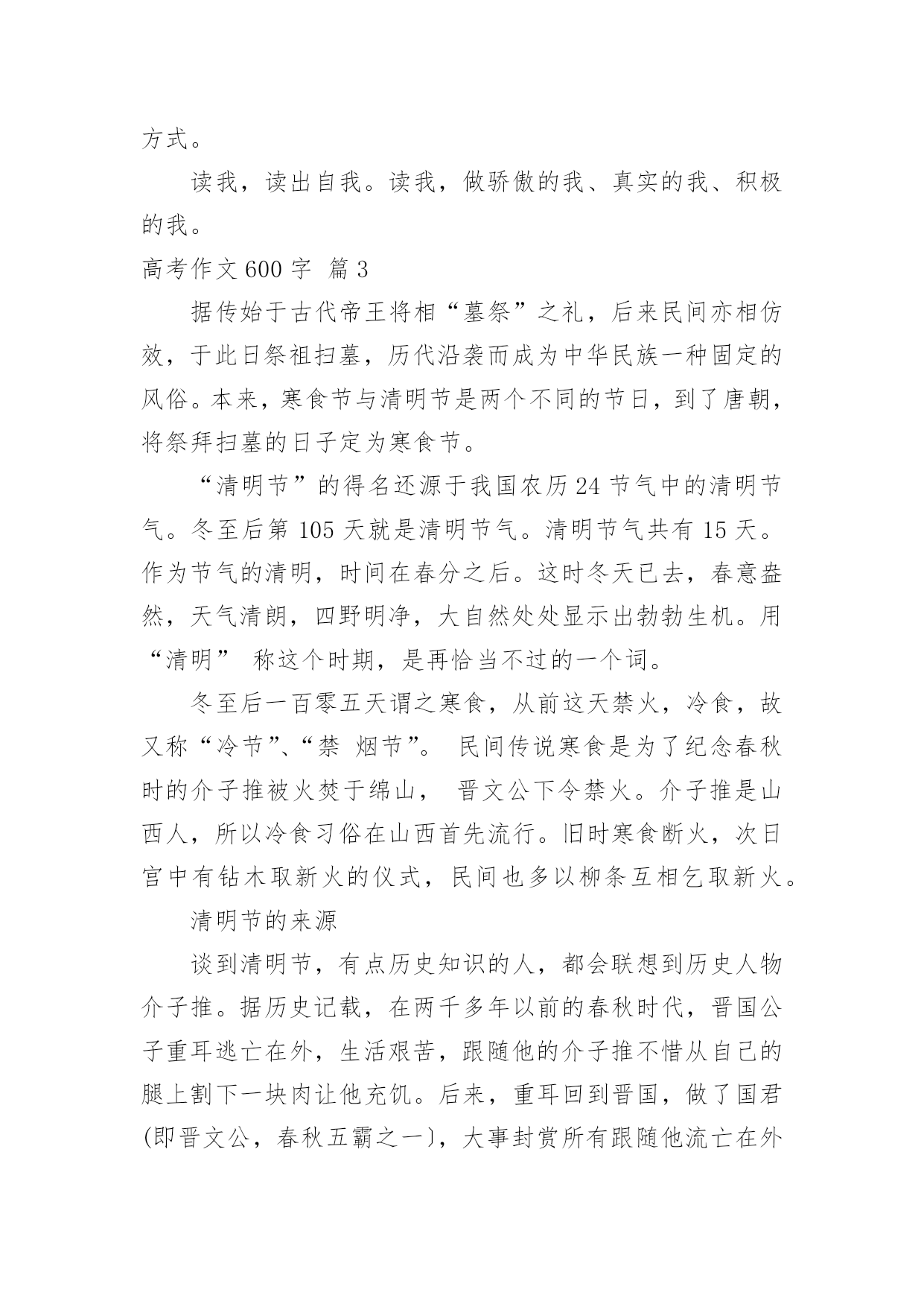 高考作文600字关于高考作文600字汇总7篇在平平淡淡的日常中,许多人都有过写作文的经历,对作文都不陌生吧,作文可分为小学作文、中学作文、大学作文(论文)。如何写一篇有思想、有文采的作文呢?以下是小编为大家整理的高考作文600字9篇,仅供参考,欢迎大家阅读。高考作文600字篇1结束了漫长冬日,东风却迟迟不来。萧瑟依旧,寒冷彻骨,花儿难以绽放。唤与东风来,相许一枝春,才换回满园姹紫嫣红竞相开放。是以借东风亦有道,唯有运用自己的智慧,让他人心甘情愿地给予帮助,才能成就心中所想。徐志摩说:“是人没有不想飞,凌空去看一个明白,这才是做人的趣味,做人的权威,做人的交待。”欲飞之人,不愁无翼,因为他们不会在寻求帮助无果之时轻易气馁。国人知周杰伦者皆知方文山。年轻时的他默默写过几大本歌词,也投给过演唱公司希望借成名歌手之口让自己被业界承认。颠沛流离数载,艰辛苦楚在歌词中写尽,终于让他等来一个周杰伦。他的词成就了一代巨星,也是经周杰伦之口众人才认识了背后的方文山。若他在演唱公司碰壁之后便果断放弃,乐坛也迎不来这样一个辉煌的传奇。无助似乎就无望,然而不用自己的智慧想出妙计,怎么让人给予帮助,如何有那关不住的'“满园春色”?回看先人们的飞行历程我们就能明白:万户借风筝有过短暂的飞翔;人虽无翼,飞翔梦也曾被称为无稽之谈,但莱特兄弟造出飞机,人终能翱翔蓝天。“假舆马者,非利足也,而至千里;假舟楫者,非能水也,而绝江河。”他们都与我们无异,正是因为他们“善假于物”也,才能得偿所愿。虽说利益驱动他人给予帮助,但我们正是要让他人看到我们身上蕴含的希望,人们的智慧得到可凭借的“物”。这才有马云吸引他人投资铸就阿里巴巴的神话,才有中巴的友谊和无数欧美国家投入亚洲投资银行;才有中国开展多边外交走在逐渐腾飞的路上。正如所说:“我们的蓝图是宏伟的,但我们的奋斗必将是艰巨的。”因为我们在借助他人的力量时仍需更多努力,才能将这些力量为己所用,成就一个国家伟大复兴的未来。大树因为用甜美的果实才让自己的种子传播到世界各地,无他,因果实甜美,诱惑人心。而我们的花朵待醒,借与那东风吹满园,赠与它阵阵花香沁人心脾,静待春的绽放。高考作文600字篇2读一本好书,能读出生命的真谛与哲学启示,读自己,读我,我读出了……人只是一根有思想的芦苇,我是那其中的一员,所以我更加如同芦苇一样渺小,然而独一无二的思想创造了世界上独一无二的我,我骄傲自豪。一千年前,苏子与客泛舟游于赤壁之下,那“寄蜉蝣于天地,渺沧海之一粟,哀吾生之须臾,羡长江之无穷”的言论是客人的真情实感,是的,我如蜉蝣,如粟粒,我的一生就如宇宙一眨眼的瞬间。我没有彭祖的长久,但不必莫名感伤,芸芸众生中,每一个人都是平等的,每一个人的生命都是短暂的、渺小的。我肯定我的渺小。我肯定我的独一无二。在这个物欲横流的社会,我们每个人都仿佛是一块块洁白无渍的布匹,被命运之手投进一只只大染缸,等待着被同化,被染上色彩斑斓的花色,既然我是独一无二的,又怎能被同化,怎能沾染上世俗的'颜色?我的思想不能被同化,就像不能找出另一个我来一样。陶渊明种菊、赏菊不就是一种坚持自我的表现吗?读曹禺的《女神》,我震撼了,那激进的天狗,象天神一般,吞噬太阳,月亮甚至整个宇宙,与众不同,独立的个性正是我所追求的。好罢,就让我变成天狗,吞噬一切,蔑视一切,追求个性,追求自我。时间总是在我不经意间悄悄溜走,即使我的生命是如此短暂。生命的短暂警示我珍惜一分一秒,不为碌碌无为而羞愧,不为虚度光阴而后悔,虽然我只走过了短短的几十年,但是这个过程对我来说是漫长的、充满回忆的。正因为它充满了对与错,失败的教训与成功的喜悦,我才更应该不时停下来,回头看看那些曲折的脚印,细细回味那些曾经坎坷、曾经深刻的地方。无论是失败还是成功,都是我骄傲的资本,是我人生中宝贵的财富,审视自己的不足,肯定自己的长处,将那些资本当作推动我前进的动力,当做失意时的鼓励,我相信我能走得更远更轻松。审视自我,也是一种前进的独特方式。读我,读出自我。读我,做骄傲的我、真实的我、积极的我。高考作文600字篇3据传始于古代帝王将相“墓祭”之礼,后来民间亦相仿效,于此日祭祖扫墓,历代沿袭而成为中华民族一种固定的风俗。本来,寒食节与清明节是两个不同的节日,到了唐朝,将祭拜扫墓的日子定为寒食节。“清明节”的得名还源于我国农历24节气中的清明节气。冬至后第105天就是清明节气。清明节气共有15天。作为节气的清明,时间在春分之后。这时冬天已去,春意盎然,天气清朗,四野明净,大自然处处显示出勃勃生机。用“清明”称这个时期,是再恰当不过的一个词。冬至后一百零五天谓之寒食,从前这天禁火,冷食,故又称“冷节”、“禁烟节”。民间传说寒食是为了纪念春秋时的介子推被火焚于绵山,晋文公下令禁火。介子推是山西人,所以冷食习俗在山西首先流行