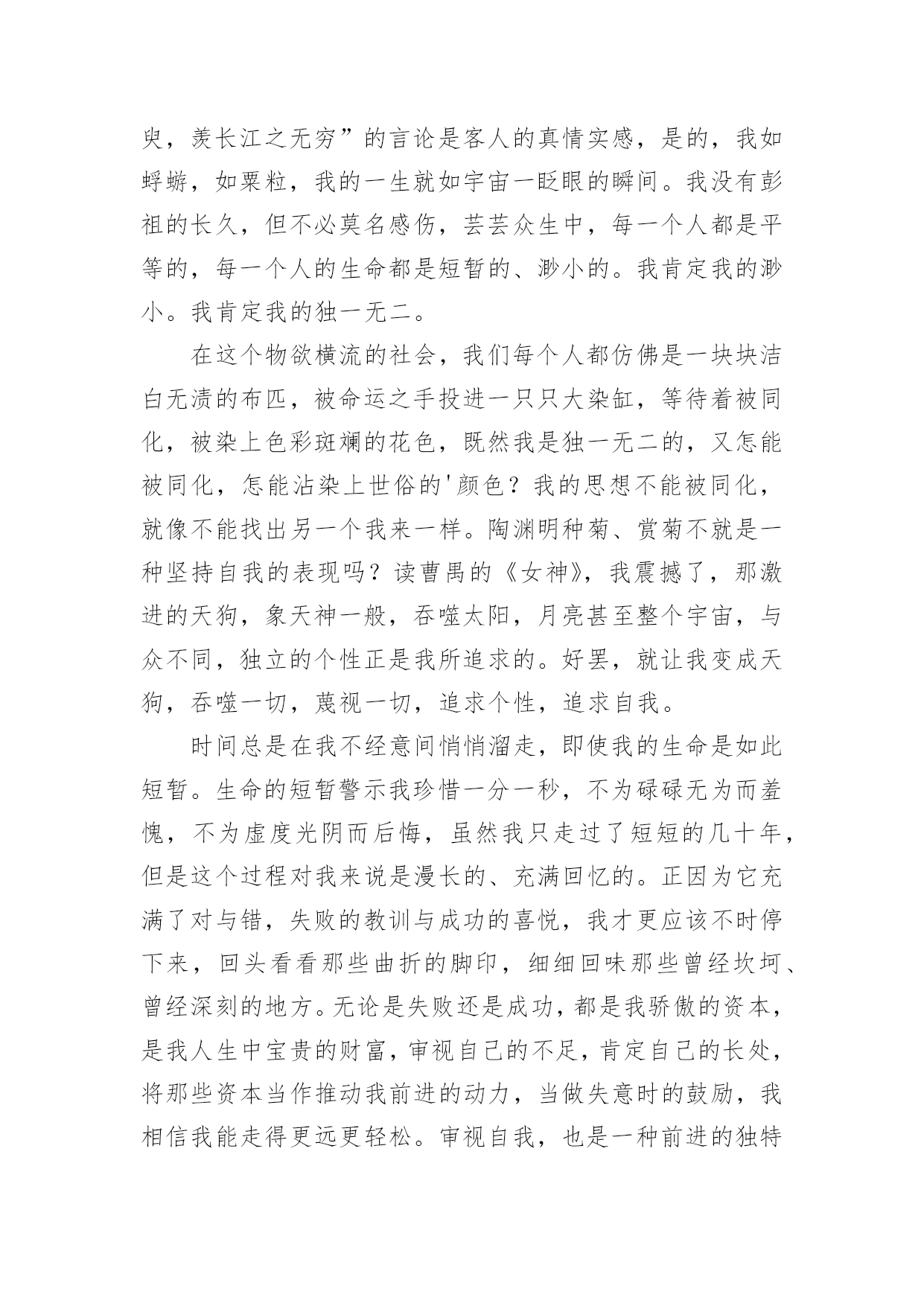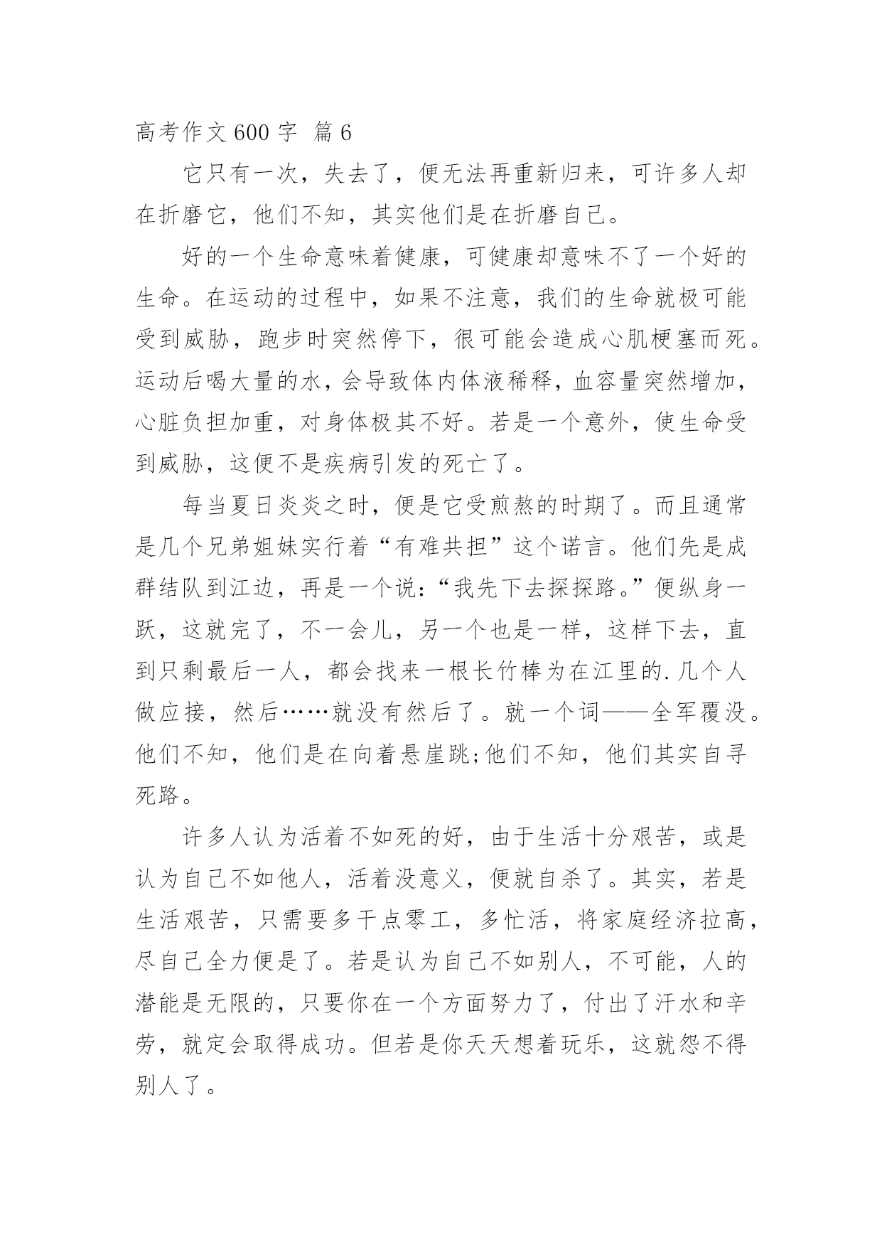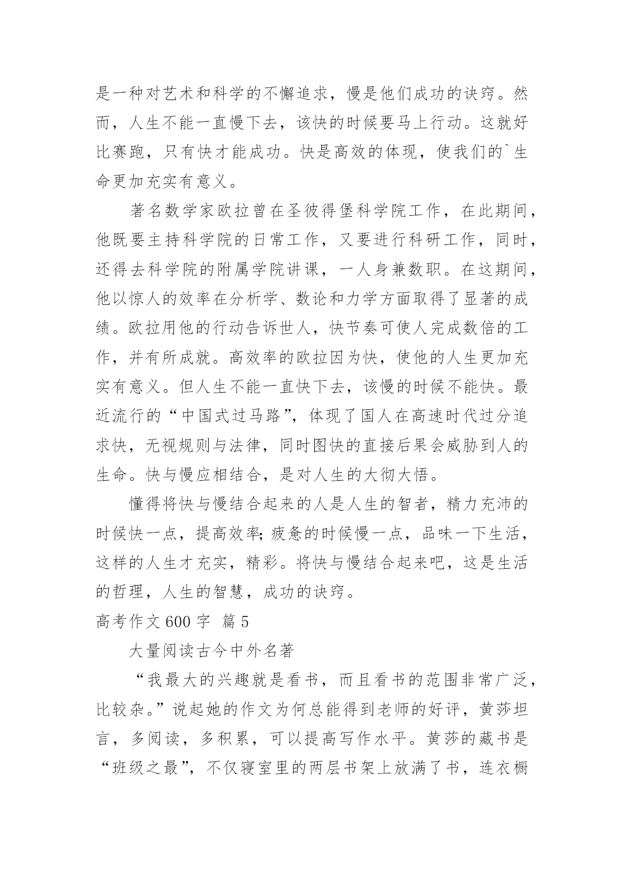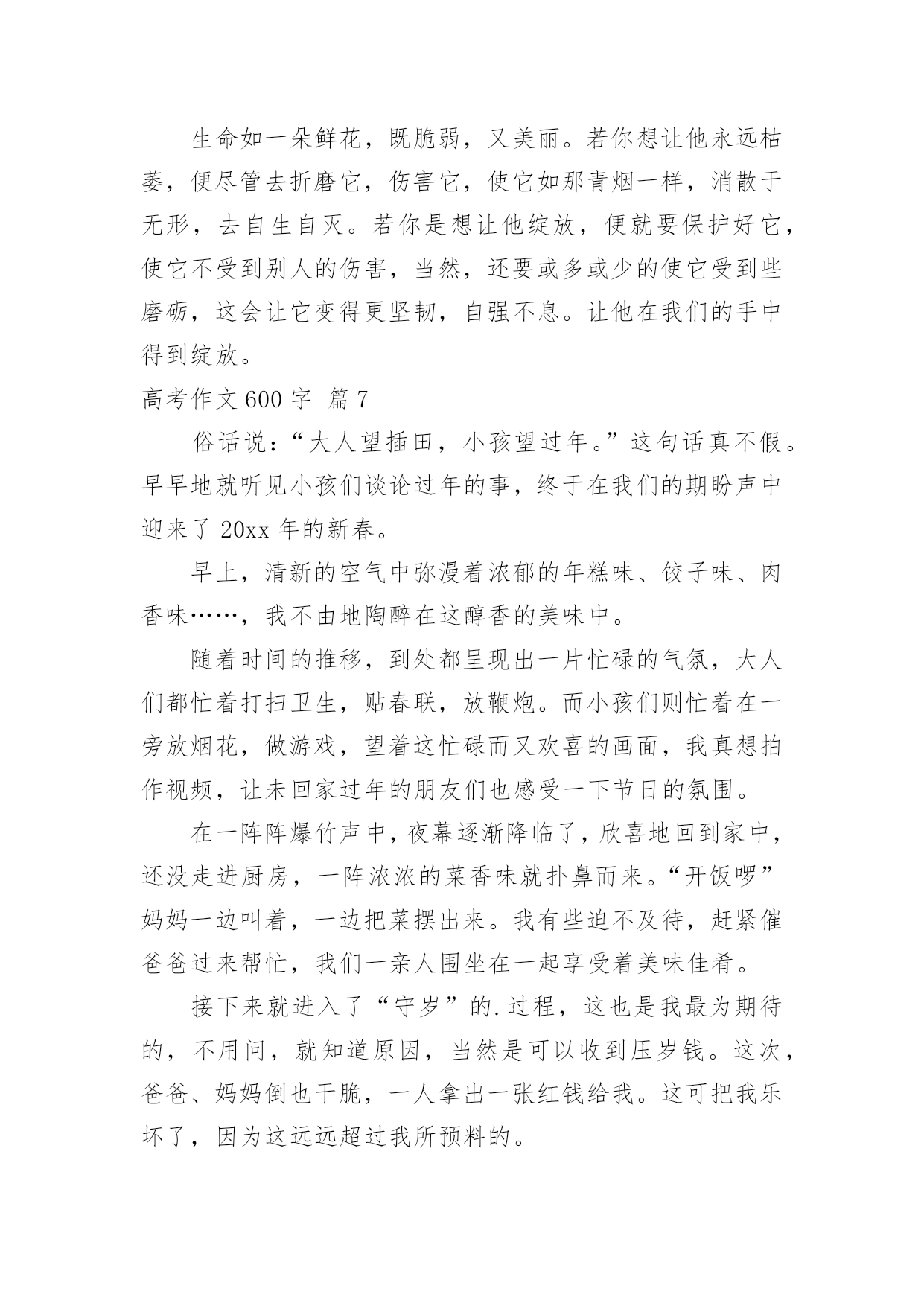 高考作文600字关于高考作文600字汇总7篇在平平淡淡的日常中,许多人都有过写作文的经历,对作文都不陌生吧,作文可分为小学作文、中学作文、大学作文(论文)。如何写一篇有思想、有文采的作文呢?以下是小编为大家整理的高考作文600字9篇,仅供参考,欢迎大家阅读。高考作文600字篇1结束了漫长冬日,东风却迟迟不来。萧瑟依旧,寒冷彻骨,花儿难以绽放。唤与东风来,相许一枝春,才换回满园姹紫嫣红竞相开放。是以借东风亦有道,唯有运用自己的智慧,让他人心甘情愿地给予帮助,才能成就心中所想。徐志摩说:“是人没有不想飞,凌空去看一个明白,这才是做人的趣味,做人的权威,做人的交待。”欲飞之人,不愁无翼,因为他们不会在寻求帮助无果之时轻易气馁。国人知周杰伦者皆知方文山。年轻时的他默默写过几大本歌词,也投给过演唱公司希望借成名歌手之口让自己被业界承认。颠沛流离数载,艰辛苦楚在歌词中写尽,终于让他等来一个周杰伦。他的词成就了一代巨星,也是经周杰伦之口众人才认识了背后的方文山。若他在演唱公司碰壁之后便果断放弃,乐坛也迎不来这样一个辉煌的传奇。无助似乎就无望,然而不用自己的智慧想出妙计,怎么让人给予帮助,如何有那关不住的'“满园春色”?回看先人们的飞行历程我们就能明白:万户借风筝有过短暂的飞翔;人虽无翼,飞翔梦也曾被称为无稽之谈,但莱特兄弟造出飞机,人终能翱翔蓝天。“假舆马者,非利足也,而至千里;假舟楫者,非能水也,而绝江河。”他们都与我们无异,正是因为他们“善假于物”也,才能得偿所愿。虽说利益驱动他人给予帮助,但我们正是要让他人看到我们身上蕴含的希望,人们的智慧得到可凭借的“物”。这才有马云吸引他人投资铸就阿里巴巴的神话,才有中巴的友谊和无数欧美国家投入亚洲投资银行;才有中国开展多边外交走在逐渐腾飞的路上。正如所说:“我们的蓝图是宏伟的,但我们的奋斗必将是艰巨的。”因为我们在借助他人的力量时仍需更多努力,才能将这些力量为己所用,成就一个国家伟大复兴的未来。大树因为用甜美的果实才让自己的种子传播到世界各地,无他,因果实甜美,诱惑人心。而我们的花朵待醒,借与那东风吹满园,赠与它阵阵花香沁人心脾,静待春的绽放。高考作文600字篇2读一本好书,能读出生命的真谛与哲学启示,读自己,读我,我读出了……人只是一根有思想的芦苇,我是那其中的一员,所以我更加如同芦苇一样渺小,然而独一无二的思想创造了世界上独一无二的我,我骄傲自豪。一千年前,苏子与客泛舟游于赤壁之下,那“寄蜉蝣于天地,渺沧海之一粟,哀吾生之须臾,羡长江之无穷”的言论是客人的真情实感,是的,我如蜉蝣,如粟粒,我的一生就如宇宙一眨眼的瞬间。我没有彭祖的长久,但不必莫名感伤,芸芸众生中,每一个人都是平等的,每一个人的生命都是短暂的、渺小的。我肯定我的渺小。我肯定我的独一无二。在这个物欲横流的社会,我们每个人都仿佛是一块块洁白无渍的布匹,被命运之手投进一只只大染缸,等待着被同化,被染上色彩斑斓的花色,既然我是独一无二的,又怎能被同化,怎能沾染上世俗的'颜色?我的思想不能被同化,就像不能找出另一个我来一样。陶渊明种菊、赏菊不就是一种坚持自我的表现吗?读曹禺的《女神》,我震撼了,那激进的天狗,象天神一般,吞噬太阳,月亮甚至整个宇宙,与众不同,独立的个性正是我所追求的。好罢,就让我变成天狗,吞噬一切,蔑视一切,追求个性,追求自我。时间总是在我不经意间悄悄溜走,即使我的生命是如此短暂。生命的短暂警示我珍惜一分一秒,不为碌碌无为而羞愧,不为虚度光阴而后悔,虽然我只走过了短短的几十年,但是这个过程对我来说是漫长的、充满回忆的。正因为它充满了对与错,失败的教训与成功的喜悦,我才更应该不时停下来,回头看看那些曲折的脚印,细细回味那些曾经坎坷、曾经深刻的地方。无论是失败还是成功,都是我骄傲的资本,是我人生中宝贵的财富,审视自己的不足,肯定自己的长处,将那些资本当作推动我前进的动力,当做失意时的鼓励,我相信我能走得更远更轻松。审视自我,也是一种前进的独特方式。读我,读出自我。读我,做骄傲的我、真实的我、积极的我。高考作文600字篇3据传始于古代帝王将相“墓祭”之礼,后来民间亦相仿效,于此日祭祖扫墓,历代沿袭而成为中华民族一种固定的风俗。本来,寒食节与清明节是两个不同的节日,到了唐朝,将祭拜扫墓的日子定为寒食节。“清明节”的得名还源于我国农历24节气中的清明节气。冬至后第105天就是清明节气。清明节气共有15天。作为节气的清明,时间在春分之后。这时冬天已去,春意盎然,天气清朗,四野明净,大自然处处显示出勃勃生机。用“清明”称这个时期,是再恰当不过的一个词。冬至后一百零五天谓之寒食,从前这天禁火,冷食,故又称“冷节”、“禁烟节”。民间传说寒食是为了纪念春秋时的介子推被火焚于绵山,晋文公下令禁火。介子推是山西人,所以冷食习俗在山西首先流行