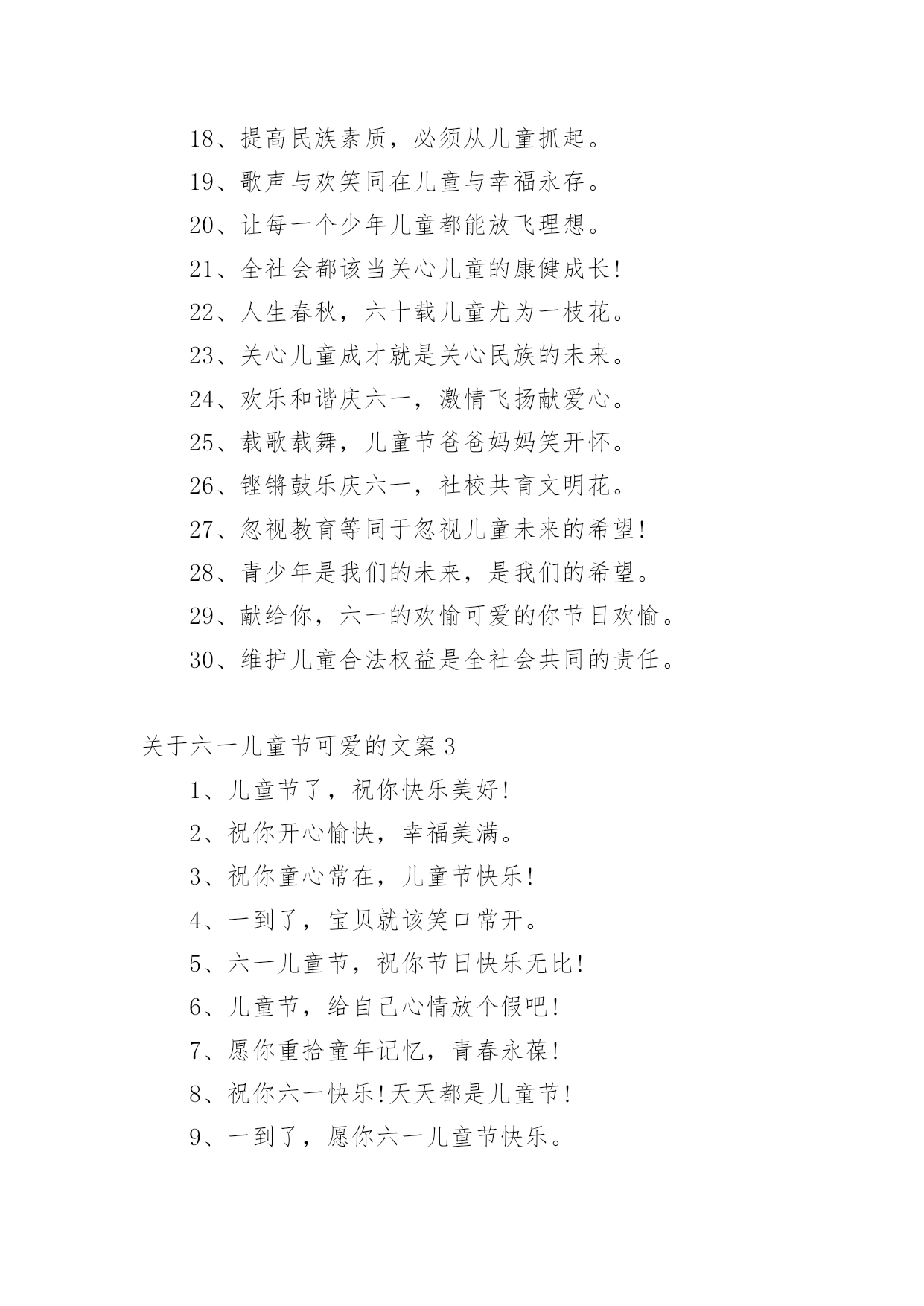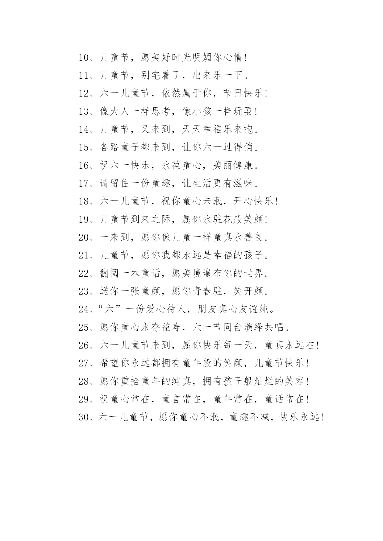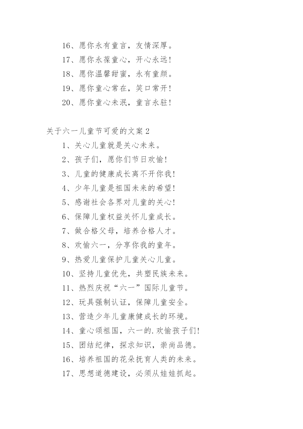 六一儿童节可爱的文案关于六一儿童节可爱的文案在日常学习、工作或生活中,许多人都接触过一些比较经典的文案吧,文案用以记录和分享生活日常。那什么样的文案才算得上是经典呢?下面是小编为大家收集的关于六一儿童节可爱的文案,欢迎阅读,希望大家能够喜欢。关于六一儿童节可爱的文案11、六一儿童节,记得保持童心!2、一点童年,美好永驻心间。3、一点童真,待人无比热忱。4、亲爱的小宝,儿童节快乐!5、儿童节,释放孩子们快乐!6、开心每一天,幸福到永远!7、愿你多快乐,永远笑哈哈。8、愿你天天开心,时时快乐!9、愿你开心六一,幸福一生!10、愿你拥有童心,好梦成真。11、愿你拥有童真,天天开心。12、愿你拥有童趣,快乐美意。13、愿你拥有童颜,青春不变。14、愿你无忧无虑,永有童真。15、愿你永有童心,生活甜蜜。16、愿你永有童言,友情深厚。17、愿你永葆童心,开心永远!18、愿你温馨甜蜜,永有童颜。19、愿你童心常在,笑口常开!20、愿你童心未泯,童言永驻!关于六一儿童节可爱的文案21、关心儿童就是关心未来。2、孩子们,愿你们节日欢愉!3、儿童的健康成长离不开你我!4、少年儿童是祖国未来的希望!5、感谢社会各界对儿童的关心!6、保障儿童权益关怀儿童成长。7、做合格父母,培养合格人才。8、欢愉六一,分享你我的童年。9、热爱儿童保护儿童关心儿童。10、坚持儿童优先,共塑民族未来。11、热烈庆祝“六一”国际儿童节。12、玩具强制认证,保障儿童安全。13、营造少年儿童康健成长的环境。14、童心颂祖国,六一的.欢愉孩子们!15、团结纪律,探求知识,崇尚品德。16、培养祖国的花朵抚育人类的未来。17、思想道德建设,必须从娃娃抓起。18、提高民族素质,必须从儿童抓起。19、歌声与欢笑同在儿童与幸福永存。20、让每一个少年儿童都能放飞理想。21、全社会都该当关心儿童的康健成长!22、人生春秋,六十载儿童尤为一枝花。23、关心儿童成才就是关心民族的未来。24、欢乐和谐庆六一,激情飞扬献爱心。25、载歌载舞,儿童节爸爸妈妈笑开怀。26、铿锵鼓乐庆六一,社校共育文明花。27、忽视教育等同于忽视儿童未来的希望!28、青少年是我们的未来,是我们的希望。29、献给你,六一的欢愉可爱的你节日欢愉。30、维护儿童合法权益是全社会共同的责任。关于六一儿童节可爱的文案31、儿童节了,祝你快乐美好!2、祝你开心愉快,幸福美满。3、祝你童心常在,儿童节快乐!4、一到了,宝贝就该笑口常开。5、六一儿童节,祝你节日快乐无比!6、儿童节,给自己心情放个假吧!7、愿你重拾童年记忆,青春永葆!8、祝你六一快乐!天天都是儿童节!9、一到了,愿你六一儿童节快乐。10、儿童节,愿美好时光明媚你心情!11、儿童节,别宅着了,出来乐一下。12、六一儿童节,依然属于你,节日快乐!13、像大人一样思考,像小孩一样玩耍!14、儿童节,又来到,天天幸福乐来抱。15、各路童子都来到,让你六一过得俏。16、祝六一快乐,永葆童心,美丽健康。17、请留住一份童趣,让生活更有滋味。18、六一儿童节,祝你童心未泯,开心快乐!19、儿童节到来之际,愿你永驻花般笑颜!20、一来到,愿你像儿童一样童真永善良。21、儿童节,愿你我都永远是幸福的孩子。22、翻阅一本童话,愿美境遍布你的世界。23、送你一张童颜,愿你青春驻,笑开颜。24、“六”一份爱心待人,朋友真心友谊纯。25、愿你童心永存益寿,六一节同台演绎共唱。26、六一儿童节来到,愿你快乐每一天,童真永远在!27、希望你永远都拥有童年般的笑颜,儿童节快乐!28、愿你重拾童年的纯真,拥有孩子般灿烂的笑容!29、祝童心常在,童言常在,童年常在,童话常在!30、六一儿童节,愿你童心不泯,童趣不减,快乐永远!