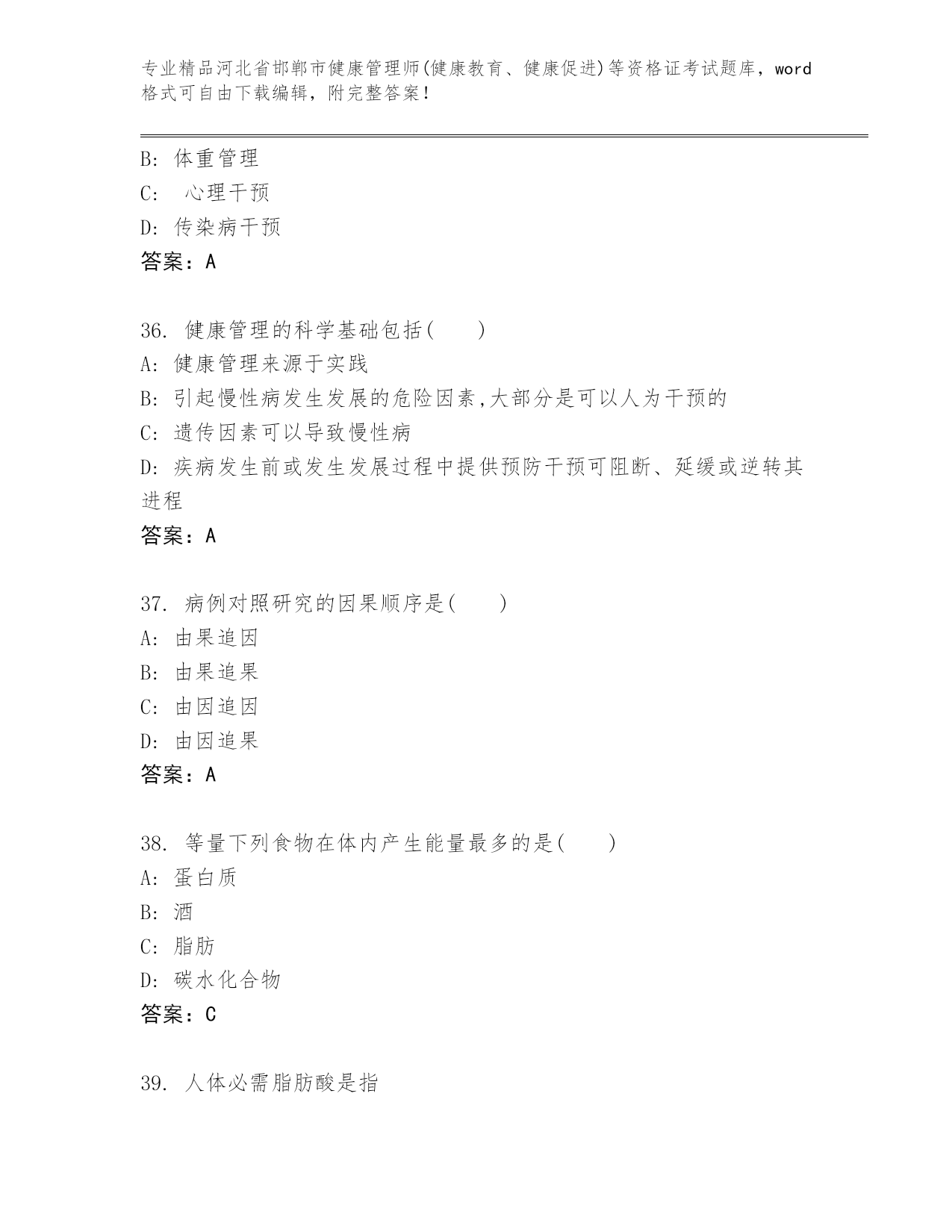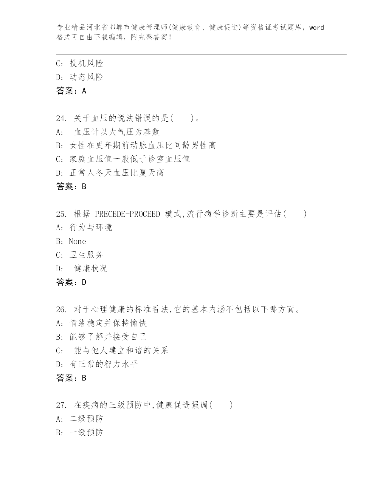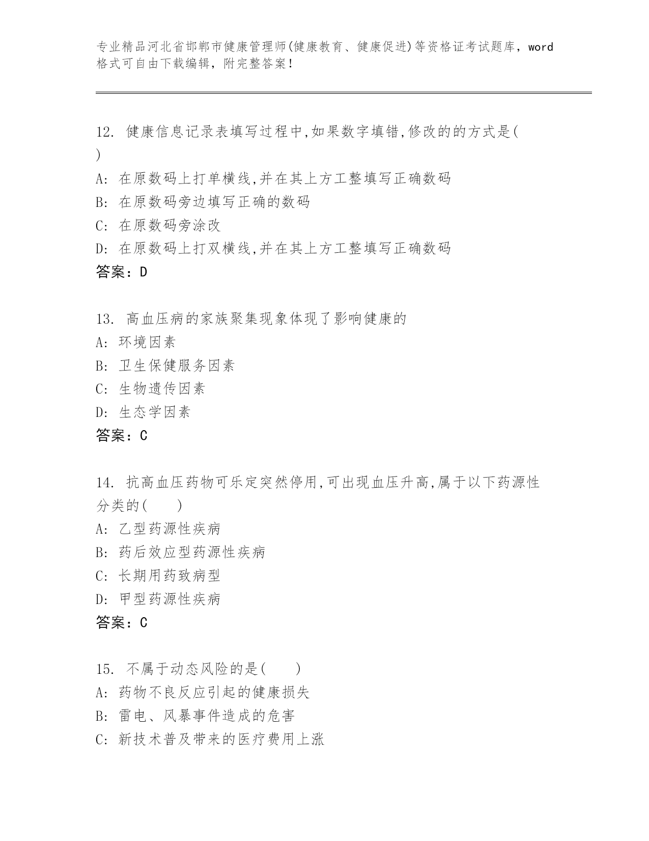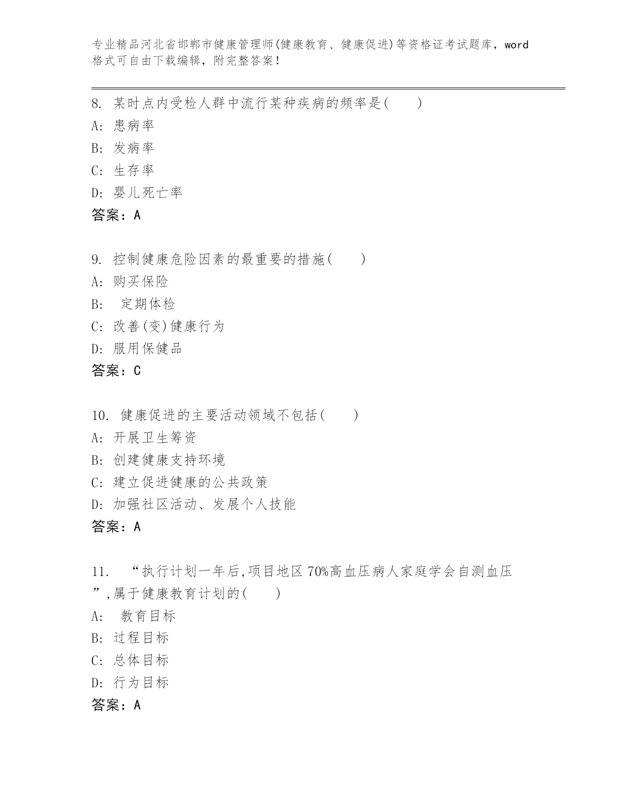 精编河北省邯郸市健康管理师(健康教育、健康促进)等资格证考试王牌题库精品(模拟题)
