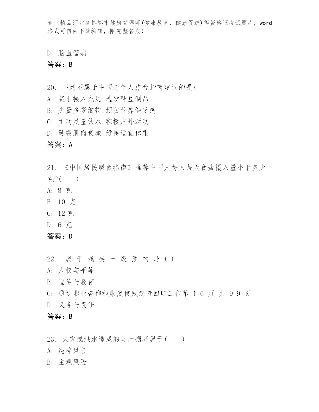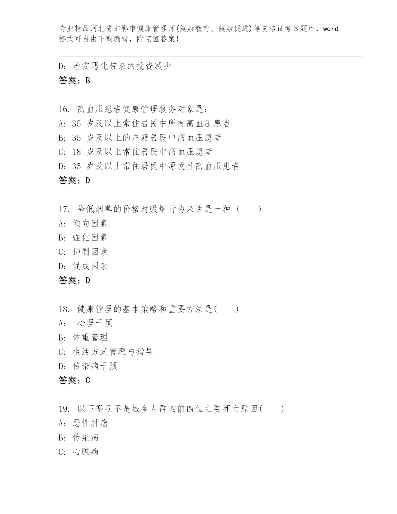 精编河北省邯郸市健康管理师(健康教育、健康促进)等资格证考试王牌题库精品(模拟题).docx
