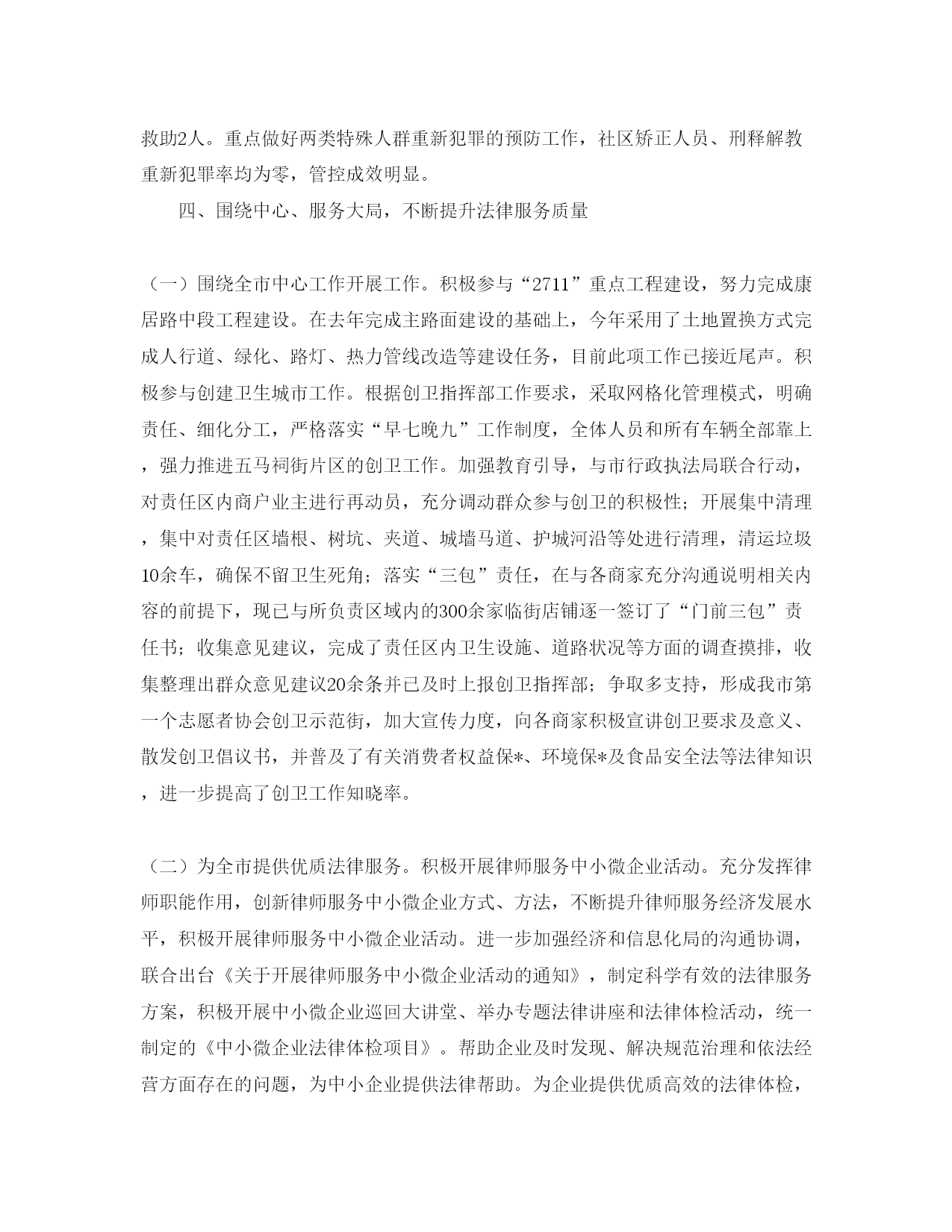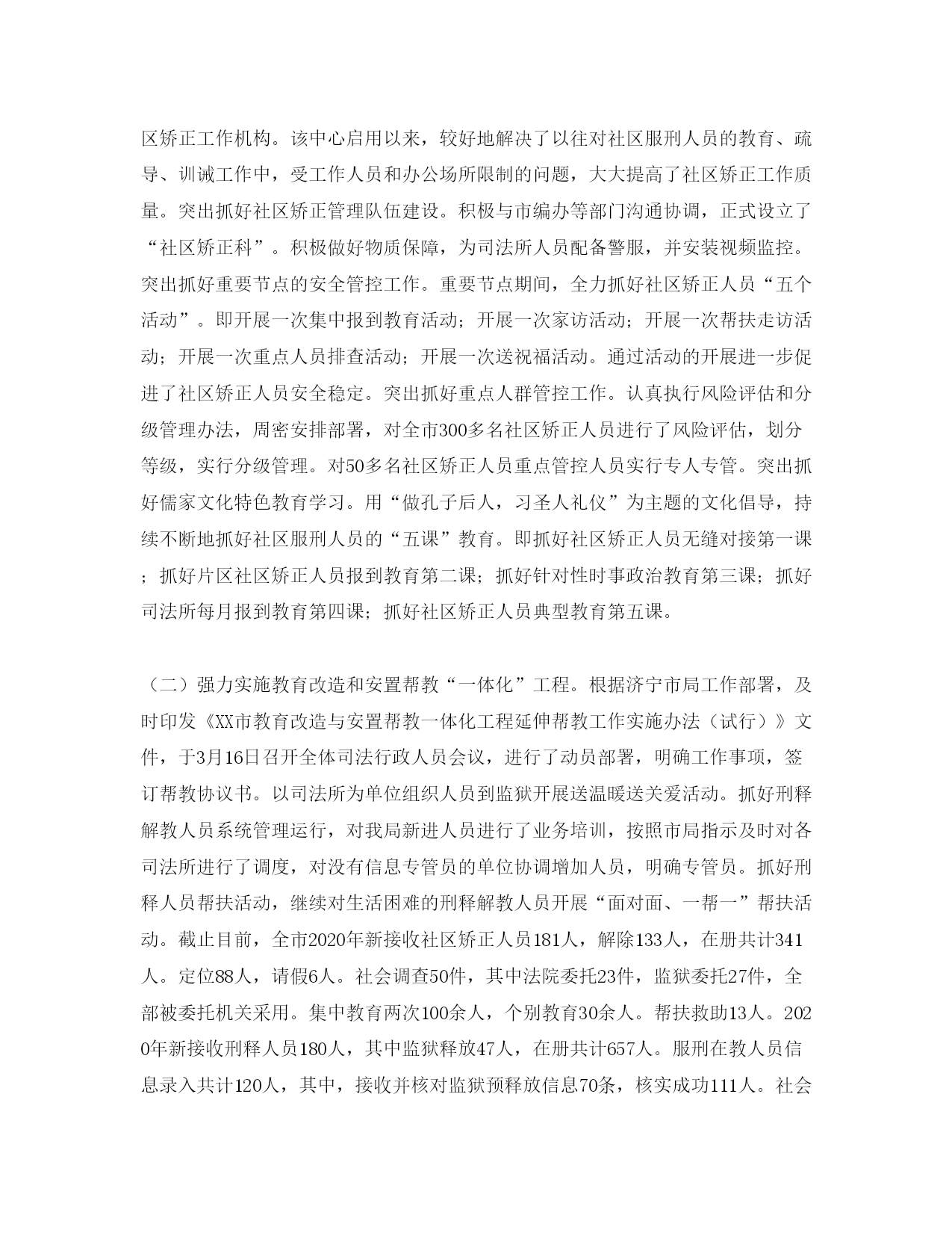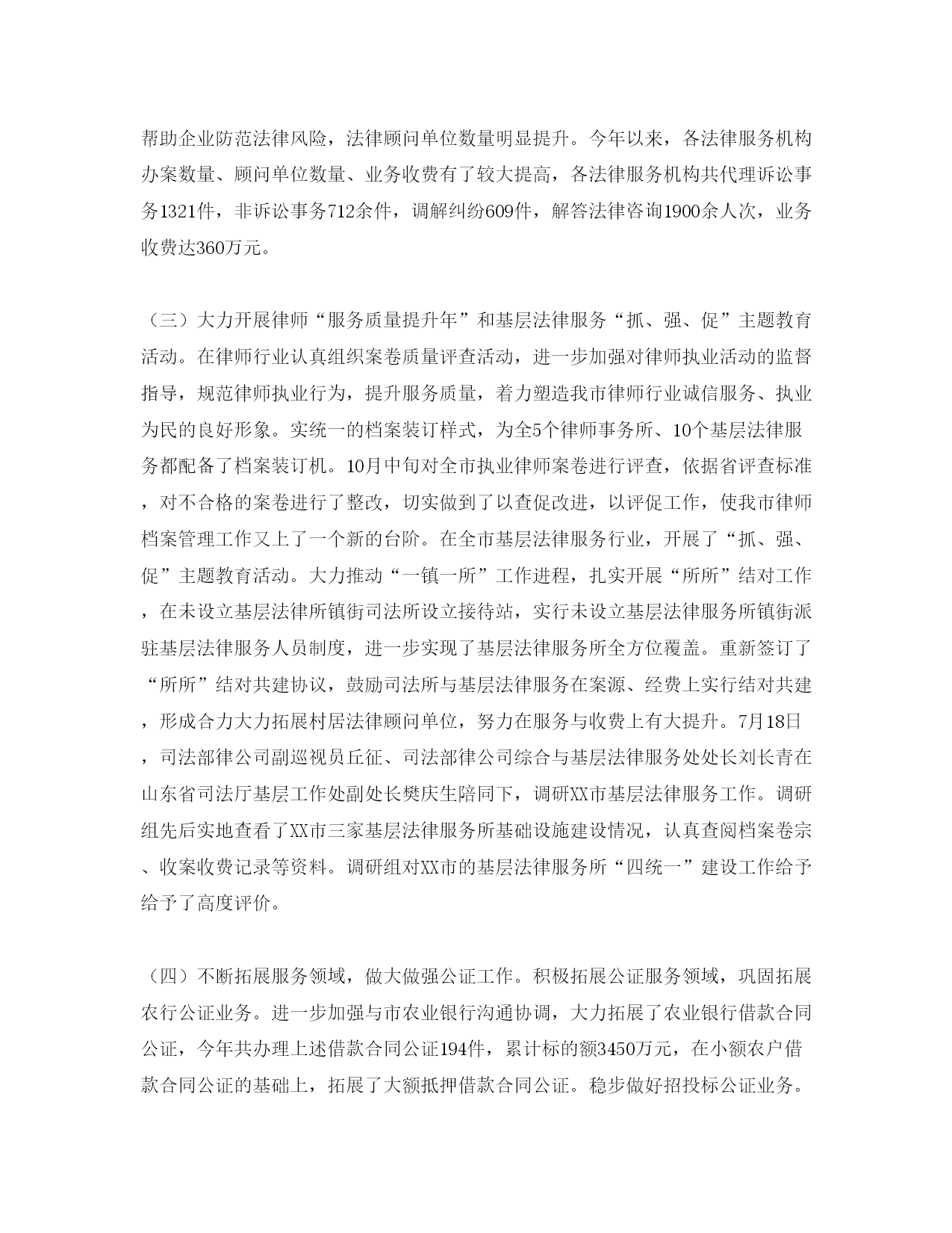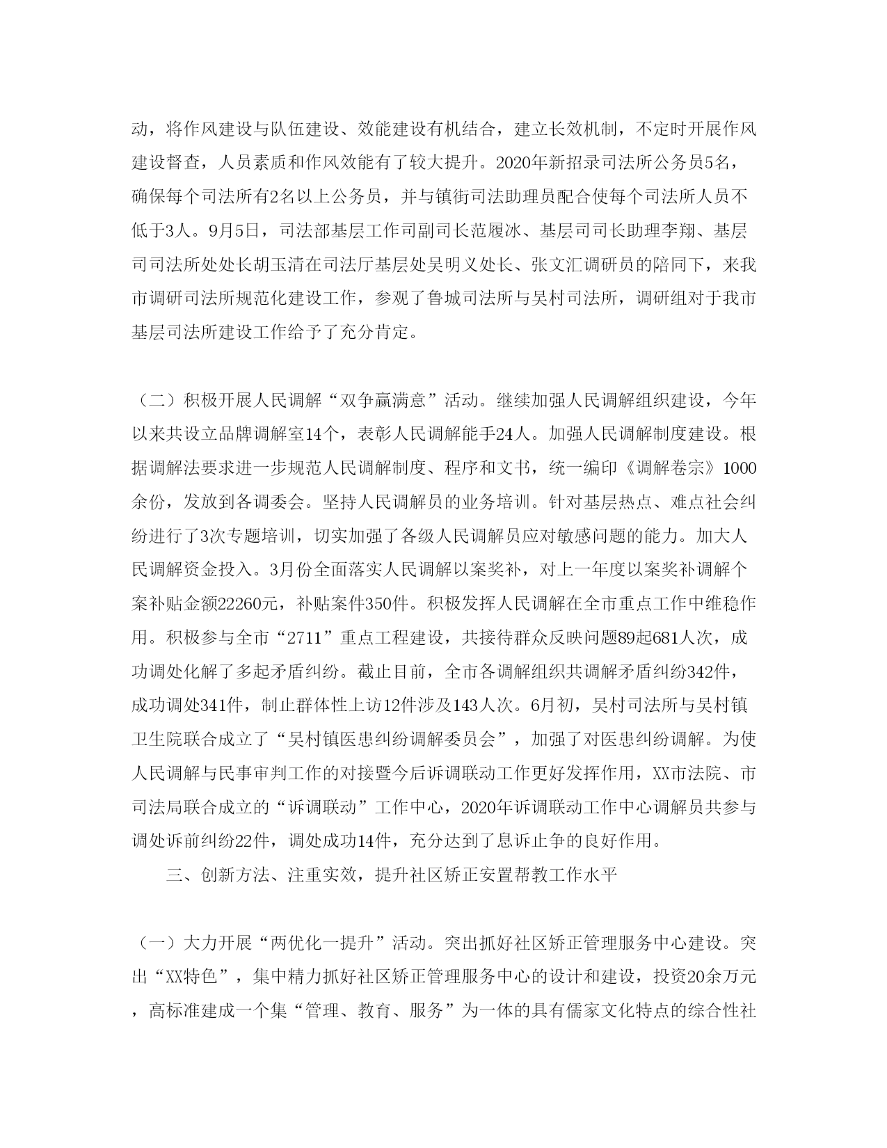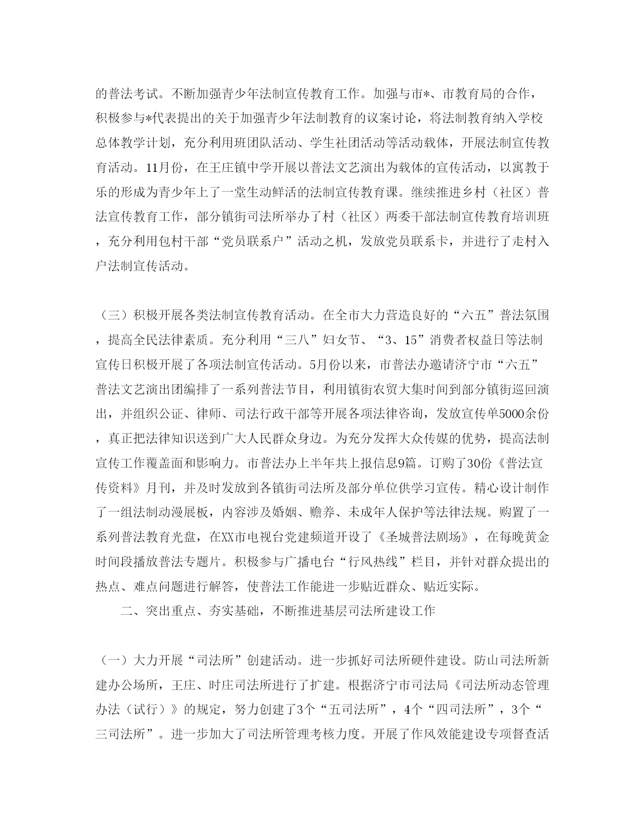 此资料由网络收集而来,如有侵权请告知上传者立即删除。资料共分享,我们负责传递知识。市司法局工作总结范文三篇篇一:今年以来,市司法局在市委、市政府和济宁市司法局的正确领导下,深入学习贯彻落实党的xx大精神,以服务“2711”工程为中心,以提升群众满意度为目标,强化法制宣传、法律服务、法律保障职能,大力推进依法治市进程,坚持把好维稳第一道防线,创新重点人群管控方式,努力提升法律服务水平,为我市经济发展、社会稳定作出了积极贡献。现将今年以来的主要工作汇报如下:一、认真谋划、精心组织,扎实开展普法依法治理工作(一)精心组织实施“六五”普法工作。认真贯彻“六五”普法总体规划。制定了《XX市2020年普法依法治理工作要点》并印发至各党(工)委。按照济宁市司法局中期检查验收实施方案,认真做好“六五”普法中期检查验收准备工作。先后培树了检察院、河套社区、燕京啤酒、岳村小学等一批普法依法治理示范点。整理了“六五”普法开展以来的档案资料,编印了《XX市“六五”普法工作画册》,图文并茂的展示了“六五”普法工作三年来取得的成效,顺利通过济宁市“六五”普法依法治理工作中期检查验收。3月份,市*常委会党组副书记、副主任孔令玉率人*工委委员、部分*代表和群众监督员对“六五”普法工作开展情况进行了专题视察,济宁市*常委会副主任商建设、副市长田志锋对我市普法工作进行视察,对我市普法依法治理工作取得的成绩和经验给予充分肯定。(二)加强重点人群的法制宣传工作。依托“法律六进”载体,推进领导干部、公务员、青少年、企业经营管理人员和农民等重点对象法制宣传教育的深入开展。切实加大了广大干部特别是领导干部的学法力度,提高依法行政和执法水平,每年坚持举办领导干部普法考试,联合组织部、宣传部、人社局等单位,定于12月7日举办2020年度全市机关干部、事业单位副科级以上干部、企业中层以上管理人员参加的普法考试。不断加强青少年法制宣传教育工作。加强与市*、市教育局的合作,积极参与*代表提出的关于加强青少年法制教育的议案讨论,将法制教育纳入学校总体教学计划,充分利用班团队活动、学生社团活动等活动载体,开展法制宣传教育活动。11月份,在王庄镇中学开展以普法文艺演出为载体的宣传活动,以寓教于乐的形成为青少年上了一堂生动鲜活的法制宣传教育课。继续推进乡村(社区)普法宣传教育工作,部分镇街司法所举办了村(社区)两委干部法制宣传教育培训班,充分利用包村干部“党员联系户”活动之机,发放党员联系卡,并进行了走村入户法制宣传活动。(三)积极开展各类法制宣传教育活动。在全市大力营造良好的“六五”普法氛围,提高全民法律素质。充分利用“三八”妇女节、“3、15”消费者权益日等法制宣传日积极开展了各项法制宣传活动。5月份以来,市普法办邀请济宁市“六五”普法文艺演出团编排了一系列普法节目,利用镇街农贸大集时间到部分镇街巡回演出,并组织公证、律师、司法行政干部等开展各项法律咨询,发放宣传单5000余份,真正把法律知识送到广大人民群众身边。为充分发挥大众传媒的优势,提高法制宣传工作覆盖面和影响力。市普法办上半年共上报信息9篇。订购了30份《普法宣传资料》月刊,并及时发放到各镇街司法所及部分单位供学习宣传。精心设计制作了一组法制动漫展板,内容涉及婚姻、赡养、未成年人保护等法律法规。购置了一系列普法教育光盘,在XX市电视台党建频道开设了《圣城普法剧场》,在每晚黄金时间段播放普法专题片。积极参与广播电台“行风热线”栏目,并针对群众提出的热点、难点问题进行解答,使普法工作能进一步贴近群众、贴近实际。二、突出重点、夯实基础,不断推进基层司法所建设工作(一)大力开展“司法所”创建活动。进一步抓好司法所硬件建设。防山司法所新建办公场所,王庄、时庄司法所进行了扩建。根据济宁市司法局《司法所动态管理办法(试行)》的规定,努力创建了3个“五司法所”,4个“四司法所”,3个“三司法所”。进一步加大了司法所管理考核力度。开展了作风效能建设专项督查活动,将作风建设与队伍建设、效能建设有机结合,建立长效机制,不定时开展作风建设督查,人员素质和作风效能有了较大提升。2020年新招录司法所公务员5名,确保每个司法所有2名以上公务员,并与镇街司法助理员配合使每个司法所人员不低于3人。9月5日,司法部基层工作司副司长范履冰、基层司司长助理李翔、基层司司法所处处长胡玉清在司法厅基层处吴明义处长、张文汇调研员的陪同下,来我市调研司法所规范化建设工作,参观了鲁城司法所与吴村司法所,调研组对于我市基层司法所建设工作给予了充分肯定。(二)积极开展人民调解“双争赢满意”活动。继续加强人民调解组织建设,今年以来共设立品牌调解室14个,表彰人民调解能手24人。加强人民调解制度建设。根据调解法要求进一步规范人民调解制度、程序和文书,统一编印《调