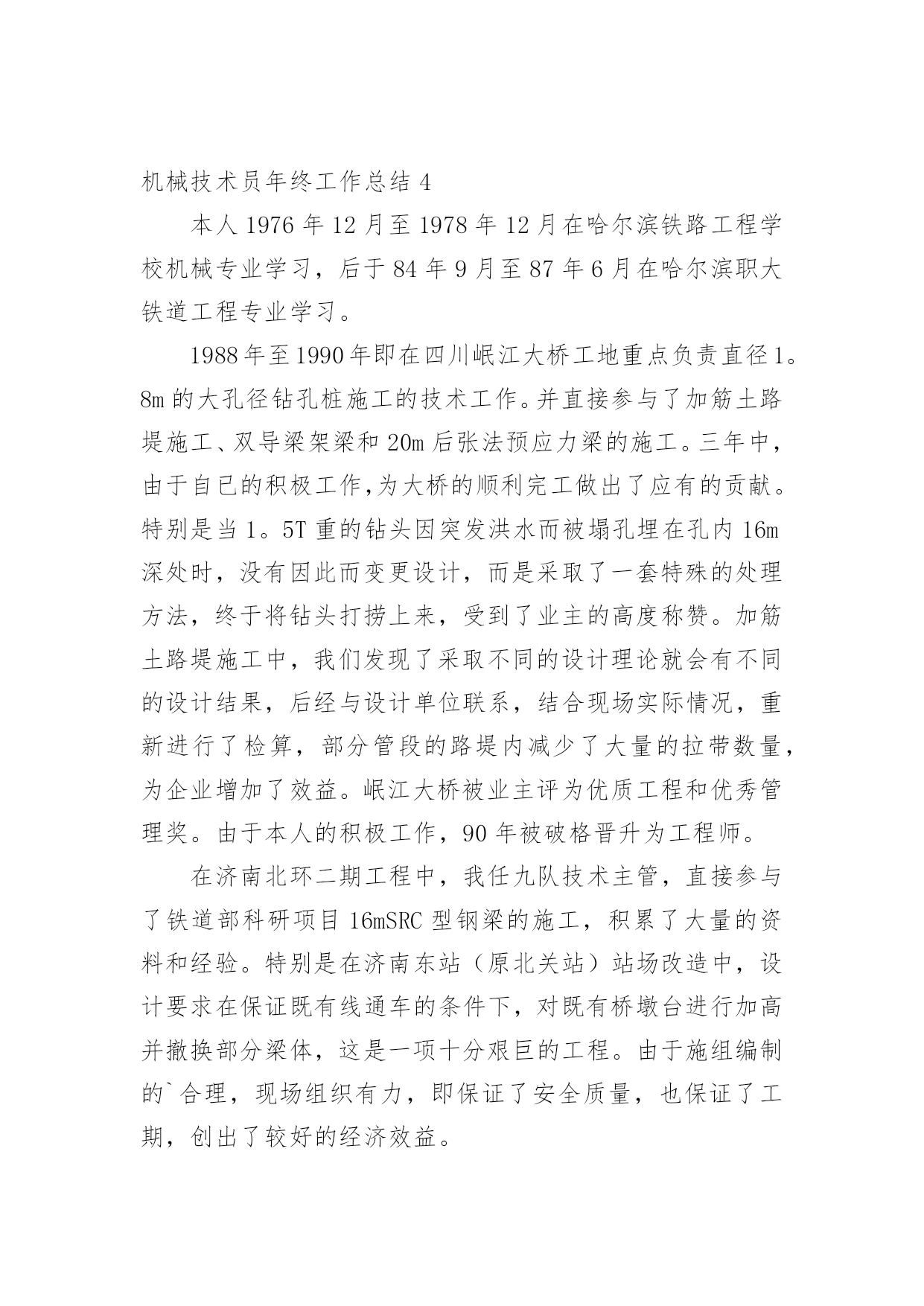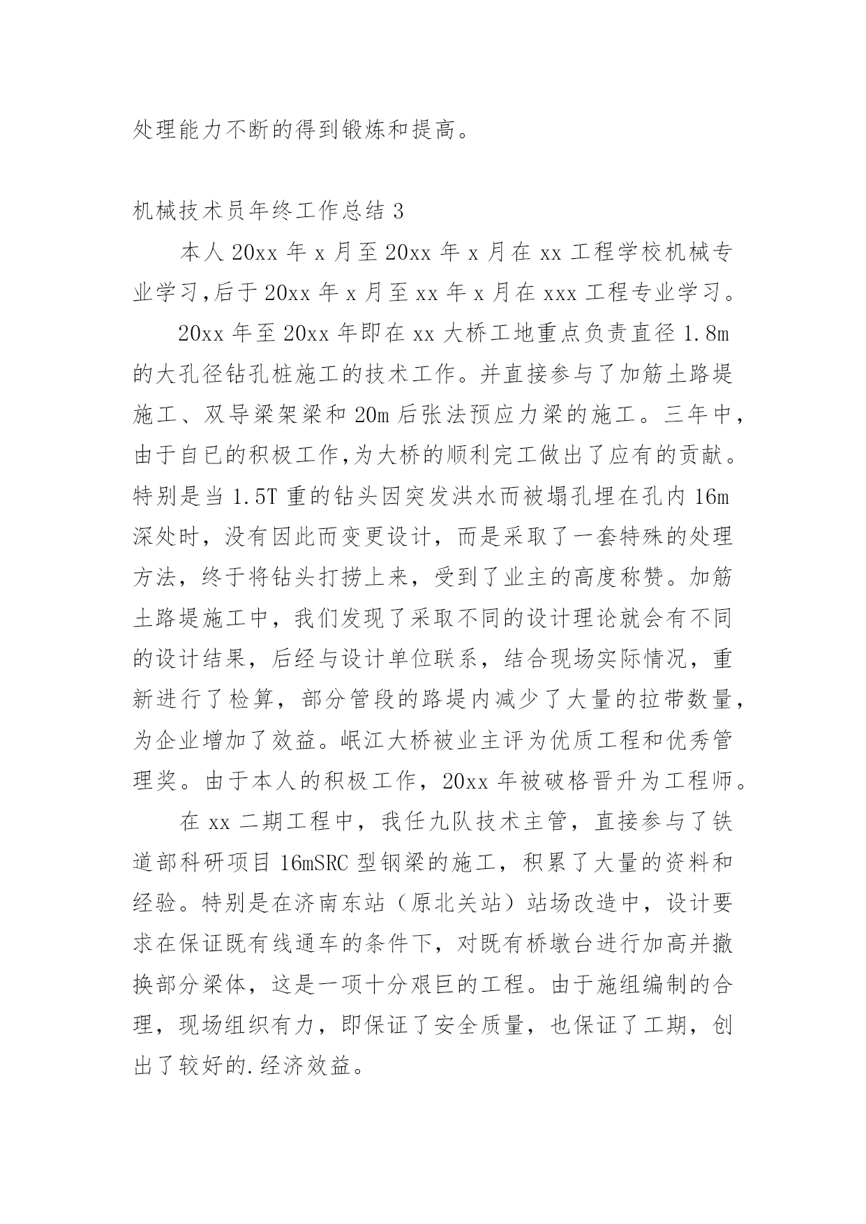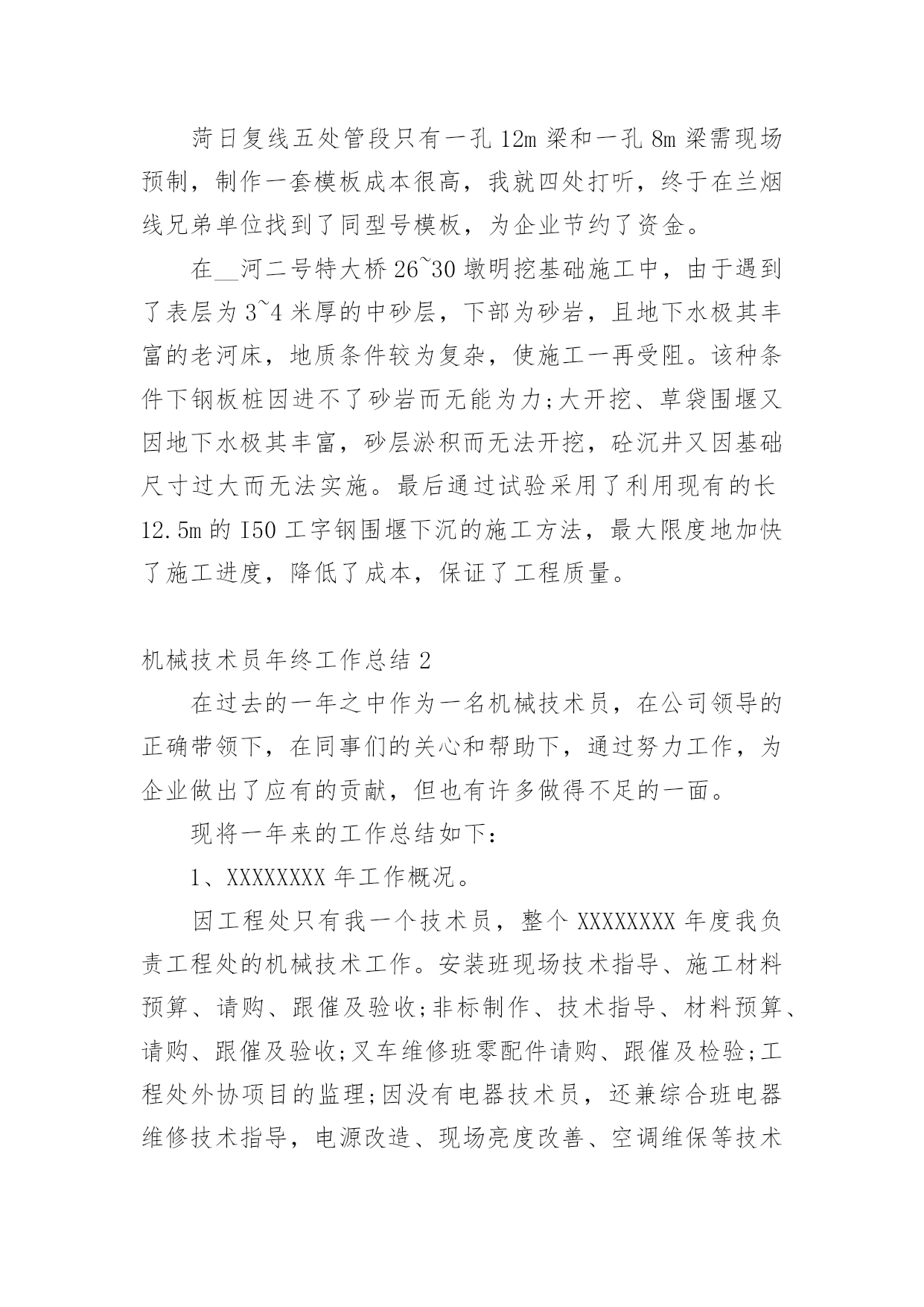 机械技术员年终工作总结机械技术员年终工作总结10篇总结是指社会团体、企业单位和个人在自身的某一时期、某一项目或某些工作告一段落或者全部完成后进行回顾检查、分析评价,从而肯定成绩,得到经验,找出差距,得出教训和一些规律性认识的一种书面材料,它是增长才干的一种好办法,为此要我们写一份总结。如何把总结做到重点突出呢?下面是小编为大家整理的机械技术员年终工作总结,欢迎大家分享。机械技术员年终工作总结1本人20__年_月至20__年_月在__工程学校机械专业学习,后于__年_月至__年_月在___工程专业学习。20__年至20__年即在__大桥工地重点负责直径1.8m的大孔径钻孔桩施工的技术工作。并直接参与了加筋土路堤施工、双导梁架梁和20m后张法预应力梁的施工。三年中,由于自已的积极工作,为大桥的顺利完工做出了应有的贡献。特别是当1.5T重的钻头因突发洪水而被塌孔埋在孔内16m深处时,没有因此而变更设计,而是采取了一套特殊的处理方法,终于将钻头打捞上来,受到了业主的高度称赞。加筋土路堤施工中,我们发现了采取不同的设计理论就会有不同的设计结果,后经与设计单位联系,结合现场实际情况,重新进行了检算,部分管段的路堤内减少了大量的拉带数量,为企业增加了效益。岷江大桥被业主评为优质工程和优秀管理奖。由于本人的积极工作,__年被破格晋升为工程师。在__二期工程中,我任九队技术主管,直接参与了铁道部科研项目16mSRC型钢梁的施工,积累了大量的资料和经验。特别是在济南东站(原北关站)站场改造中,设计要求在保证既有线通车的条件下,对既有桥墩台进行加高并撤换部分梁体,这是一项十分艰巨的工程。由于施组编制的合理,现场组织有力,即保证了安全质量,也保证了工期,创出了较好的'经济效益。在__铁路__大桥施工中,我对墩帽模板采取了特殊设计,利用墩身上的预留螺栓建立工作平台,不设地面支撑,而且砼内不设一根拉筋,减少了劳动强度,提高了工作效率,增加了砼的表面光洁度。菏日复线施工中,身为总工程师,主持了全标段58.4km包括180座桥涵工程、路基工程、轨道工程、给排水工程、房建工程、通信信号工程、电力工程等全面的技术工作,主持编写了全标段的实施性施工组织设计和三个站场改造,三处换边的过渡方案的制定。在__大桥板式墩身模板设计中,采用技术手段,砼内不设一根拉筋,增加了外观美,也为创建精品工程创造了必要的条件。针对全标段46座顶进涵桥的施工,分别采取了不同的施工方案,从技术角度来保证施工始终处于最佳控制状态。菏日复线五处管段只有一孔12m梁和一孔8m梁需现场预制,制作一套模板成本很高,我就四处打听,终于在兰烟线兄弟单位找到了同型号模板,为企业节约了资金。在__河二号特大桥26~30墩明挖基础施工中,由于遇到了表层为3~4米厚的中砂层,下部为砂岩,且地下水极其丰富的老河床,地质条件较为复杂,使施工一再受阻。该种条件下钢板桩因进不了砂岩而无能为力;大开挖、草袋围堰又因地下水极其丰富,砂层淤积而无法开挖,砼沉井又因基础尺寸过大而无法实施。最后通过试验采用了利用现有的长12.5m的I50工字钢围堰下沉的施工方法,最大限度地加快了施工进度,降低了成本,保证了工程质量。机械技术员年终工作总结2在过去的一年之中作为一名机械技术员,在公司领导的正确带领下,在同事们的关心和帮助下,通过努力工作,为企业做出了应有的贡献,但也有许多做得不足的一面。现将一年来的工作总结如下:1、XXXXXXXX年工作概况。因工程处只有我一个技术员,整个XXXXXXXX年度我负责工程处的机械技术工作。安装班现场技术指导、施工材料预算、请购、跟催及验收;非标制作、技术指导、材料预算、请购、跟催及验收;叉车维修班零配件请购、跟催及检验;工程处外协项目的监理;因没有电器技术员,还兼综合班电器维修技术指导,电源改造、现场亮度改善、空调维保等技术指导及材料请购、跟催、外协验收等工作。面对一系列繁忙的日常工作任务及繁重的外协监理、验收任务;面对一项项陌生的技术工作。我和工程处全体员工一起共同探讨,在工作中找方法,从资料中找答案,以慎重的态度,完成了一项又一项的任务。从这些工作实践当中,这些工作细节当中积累和汲取了大量的宝贵的经验。2、加强理论知识学习,将学习心得写成课件,提高了自己的技术水平和业务水平也提高了职工的理论水平和操作水平。在XXXXXXXX年度的工作中,我紧跟公司的步伐,加强理论知识方面的学习,努力做到认识上有新提高、运用上有新收获,达到理论能指导实践、促进工作、提高工作水平的目的,不断的提高自己的技术水平,来指导自己的工作。通过学习总结,结合公司实际,编写了《XXXX细则》,结合目前间车工人工作的需要,编写出课件《XXXX安全操作》。认真学习相关的管理和技术知识,加强《程序文件》和《管理手册》的学习,加强