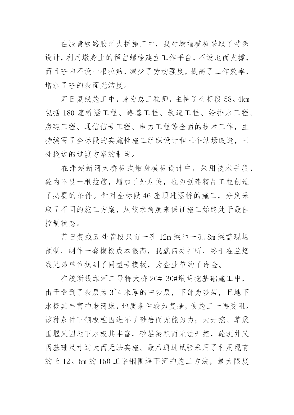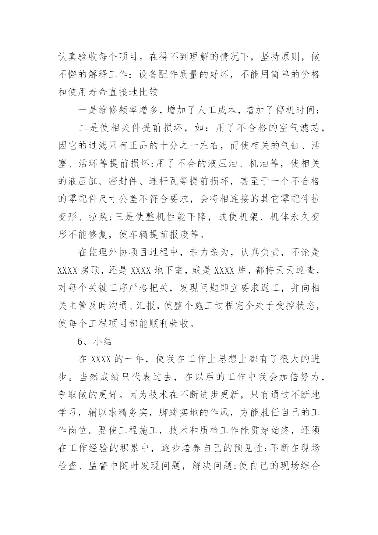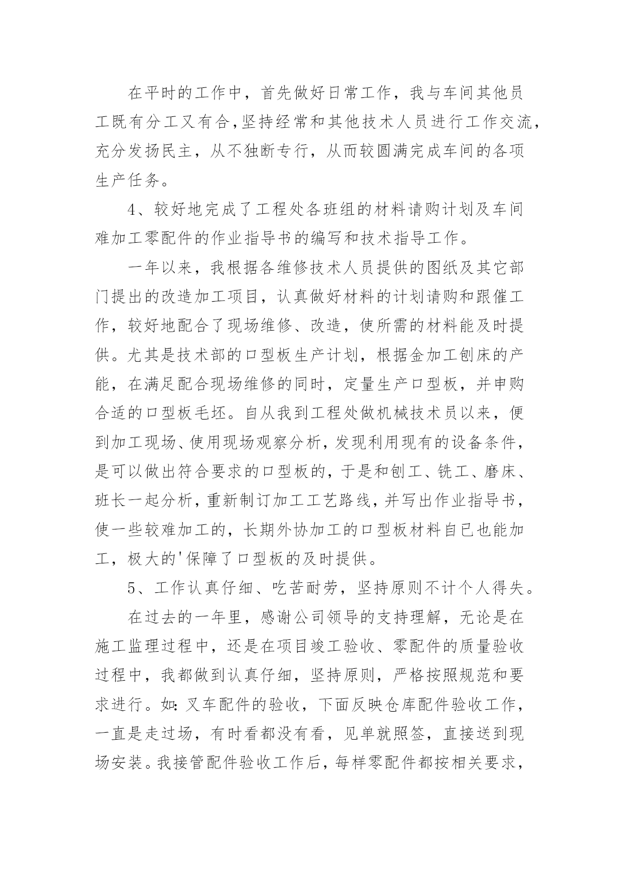 机械技术员年终工作总结机械技术员年终工作总结10篇总结是指社会团体、企业单位和个人在自身的某一时期、某一项目或某些工作告一段落或者全部完成后进行回顾检查、分析评价,从而肯定成绩,得到经验,找出差距,得出教训和一些规律性认识的一种书面材料,它是增长才干的一种好办法,为此要我们写一份总结。如何把总结做到重点突出呢?下面是小编为大家整理的机械技术员年终工作总结,欢迎大家分享。机械技术员年终工作总结1本人20__年_月至20__年_月在__工程学校机械专业学习,后于__年_月至__年_月在___工程专业学习。20__年至20__年即在__大桥工地重点负责直径1.8m的大孔径钻孔桩施工的技术工作。并直接参与了加筋土路堤施工、双导梁架梁和20m后张法预应力梁的施工。三年中,由于自已的积极工作,为大桥的顺利完工做出了应有的贡献。特别是当1.5T重的钻头因突发洪水而被塌孔埋在孔内16m深处时,没有因此而变更设计,而是采取了一套特殊的处理方法,终于将钻头打捞上来,受到了业主的高度称赞。加筋土路堤施工中,我们发现了采取不同的设计理论就会有不同的设计结果,后经与设计单位联系,结合现场实际情况,重新进行了检算,部分管段的路堤内减少了大量的拉带数量,为企业增加了效益。岷江大桥被业主评为优质工程和优秀管理奖。由于本人的积极工作,__年被破格晋升为工程师。在__二期工程中,我任九队技术主管,直接参与了铁道部科研项目16mSRC型钢梁的施工,积累了大量的资料和经验。特别是在济南东站(原北关站)站场改造中,设计要求在保证既有线通车的条件下,对既有桥墩台进行加高并撤换部分梁体,这是一项十分艰巨的工程。由于施组编制的合理,现场组织有力,即保证了安全质量,也保证了工期,创出了较好的'经济效益。在__铁路__大桥施工中,我对墩帽模板采取了特殊设计,利用墩身上的预留螺栓建立工作平台,不设地面支撑,而且砼内不设一根拉筋,减少了劳动强度,提高了工作效率,增加了砼的表面光洁度。菏日复线施工中,身为总工程师,主持了全标段58.4km包括180座桥涵工程、路基工程、轨道工程、给排水工程、房建工程、通信信号工程、电力工程等全面的技术工作,主持编写了全标段的实施性施工组织设计和三个站场改造,三处换边的过渡方案的制定。在__大桥板式墩身模板设计中,采用技术手段,砼内不设一根拉筋,增加了外观美,也为创建精品工程创造了必要的条件。针对全标段46座顶进涵桥的施工,分别采取了不同的施工方案,从技术角度来保证施工始终处于最佳控制状态。菏日复线五处管段只有一孔12m梁和一孔8m梁需现场预制,制作一套模板成本很高,我就四处打听,终于在兰烟线兄弟单位找到了同型号模板,为企业节约了资金。在__河二号特大桥26~30墩明挖基础施工中,由于遇到了表层为3~4米厚的中砂层,下部为砂岩,且地下水极其丰富的老河床,地质条件较为复杂,使施工一再受阻。该种条件下钢板桩因进不了砂岩而无能为力;大开挖、草袋围堰又因地下水极其丰富,砂层淤积而无法开挖,砼沉井又因基础尺寸过大而无法实施。最后通过试验采用了利用现有的长12.5m的I50工字钢围堰下沉的施工方法,最大限度地加快了施工进度,降低了成本,保证了工程质量。机械技术员年终工作总结2在过去的一年之中作为一名机械技术员,在公司领导的正确带领下,在同事们的关心和帮助下,通过努力工作,为企业做出了应有的贡献,但也有许多做得不足的一面。现将一年来的工作总结如下:1、XXXXXXXX年工作概况。因工程处只有我一个技术员,整个XXXXXXXX年度我负责工程处的机械技术工作。安装班现场技术指导、施工材料预算、请购、跟催及验收;非标制作、技术指导、材料预算、请购、跟催及验收;叉车维修班零配件请购、跟催及检验;工程处外协项目的监理;因没有电器技术员,还兼综合班电器维修技术指导,电源改造、现场亮度改善、空调维保等技术指导及材料请购、跟催、外协验收等工作。面对一系列繁忙的日常工作任务及繁重的外协监理、验收任务;面对一项项陌生的技术工作。我和工程处全体员工一起共同探讨,在工作中找方法,从资料中找答案,以慎重的态度,完成了一项又一项的任务。从这些工作实践当中,这些工作细节当中积累和汲取了大量的宝贵的经验。2、加强理论知识学习,将学习心得写成课件,提高了自己的技术水平和业务水平也提高了职工的理论水平和操作水平。在XXXXXXXX年度的工作中,我紧跟公司的步伐,加强理论知识方面的学习,努力做到认识上有新提高、运用上有新收获,达到理论能指导实践、促进工作、提高工作水平的目的,不断的提高自己的技术水平,来指导自己的工作。通过学习总结,结合公司实际,编写了《XXXX细则》,结合目前间车工人工作的需要,编写出课件《XXXX安全操作》。认真学习相关的管理和技术知识,加强《程序文件》和《管理手册》的学习,加强