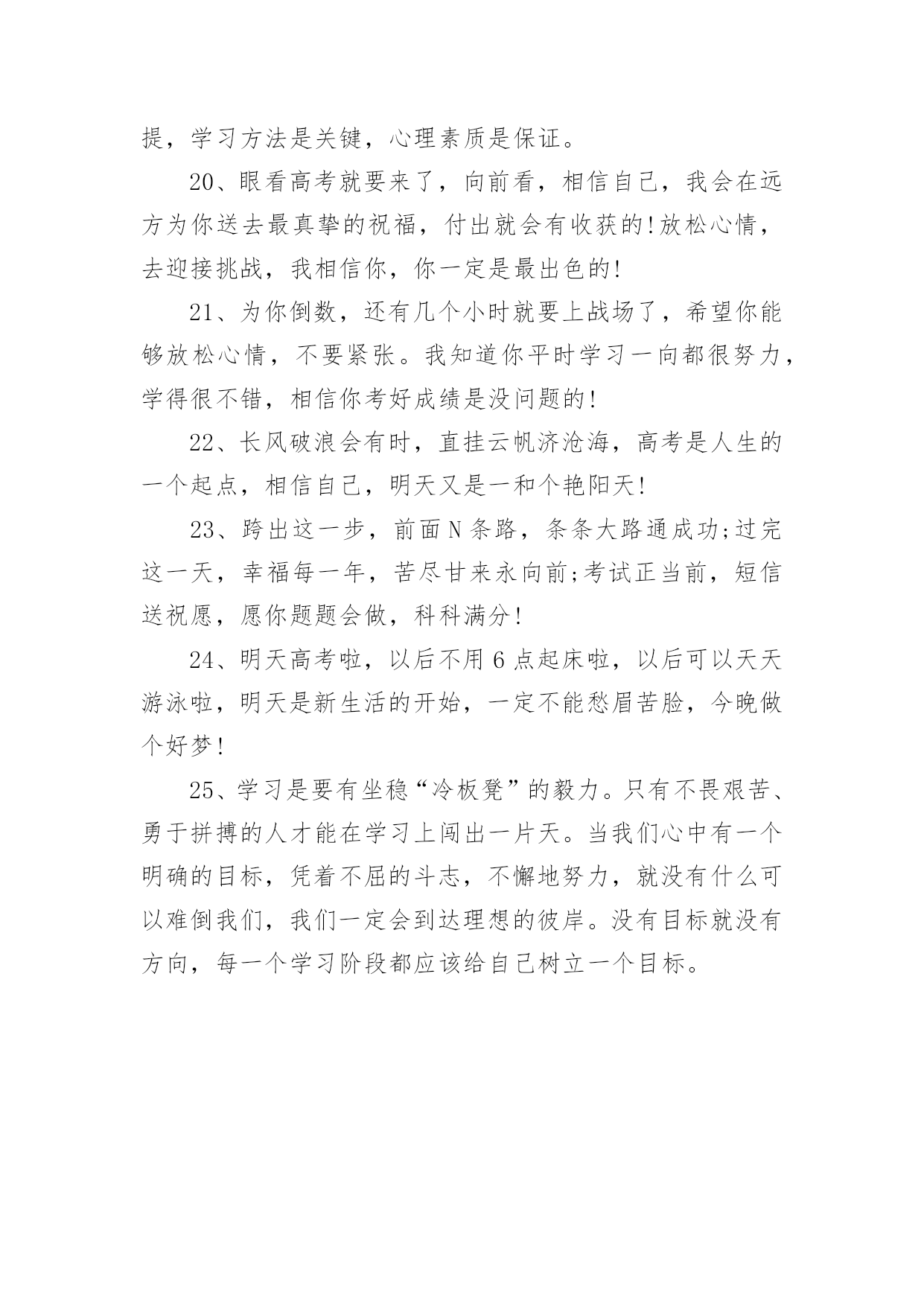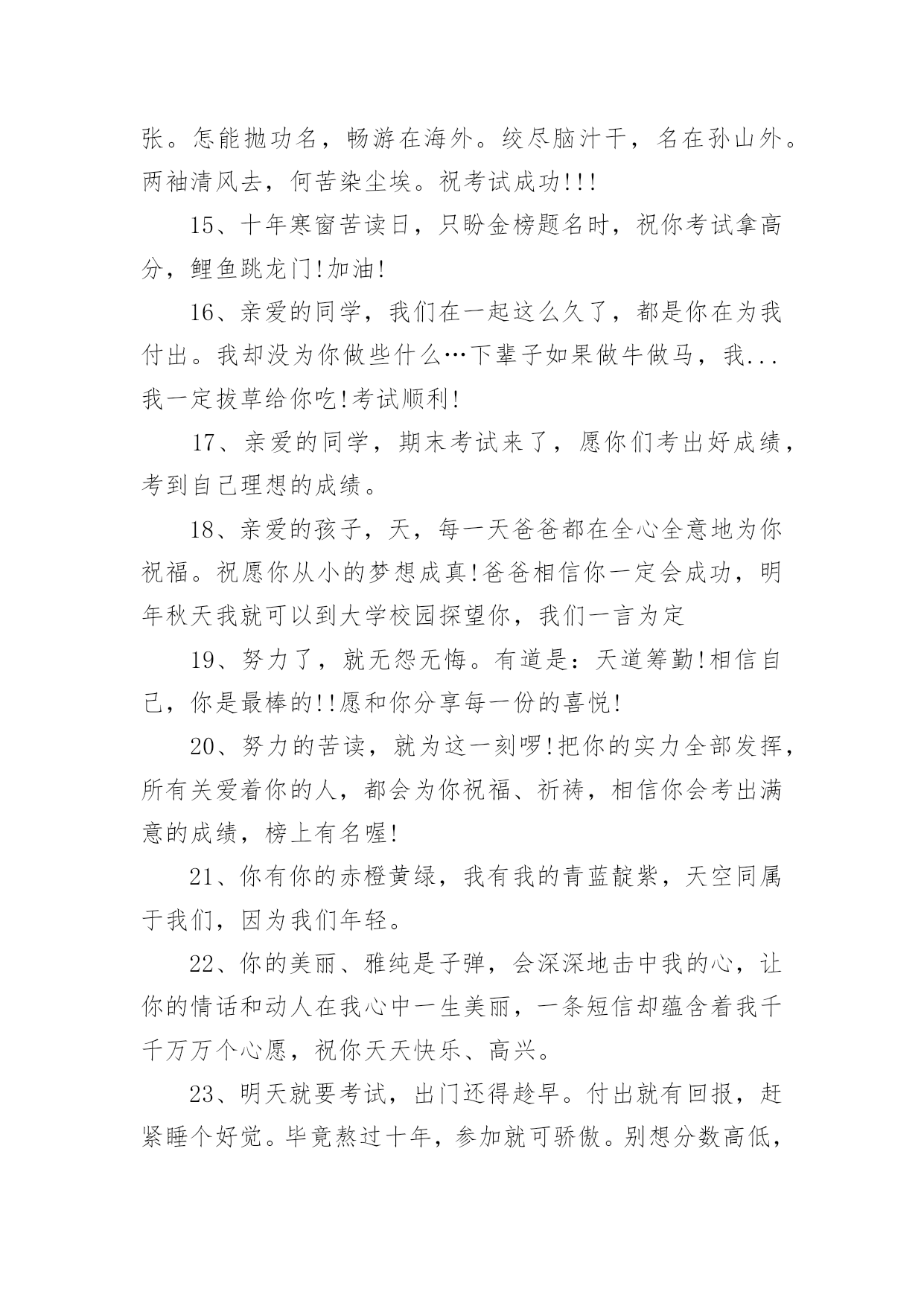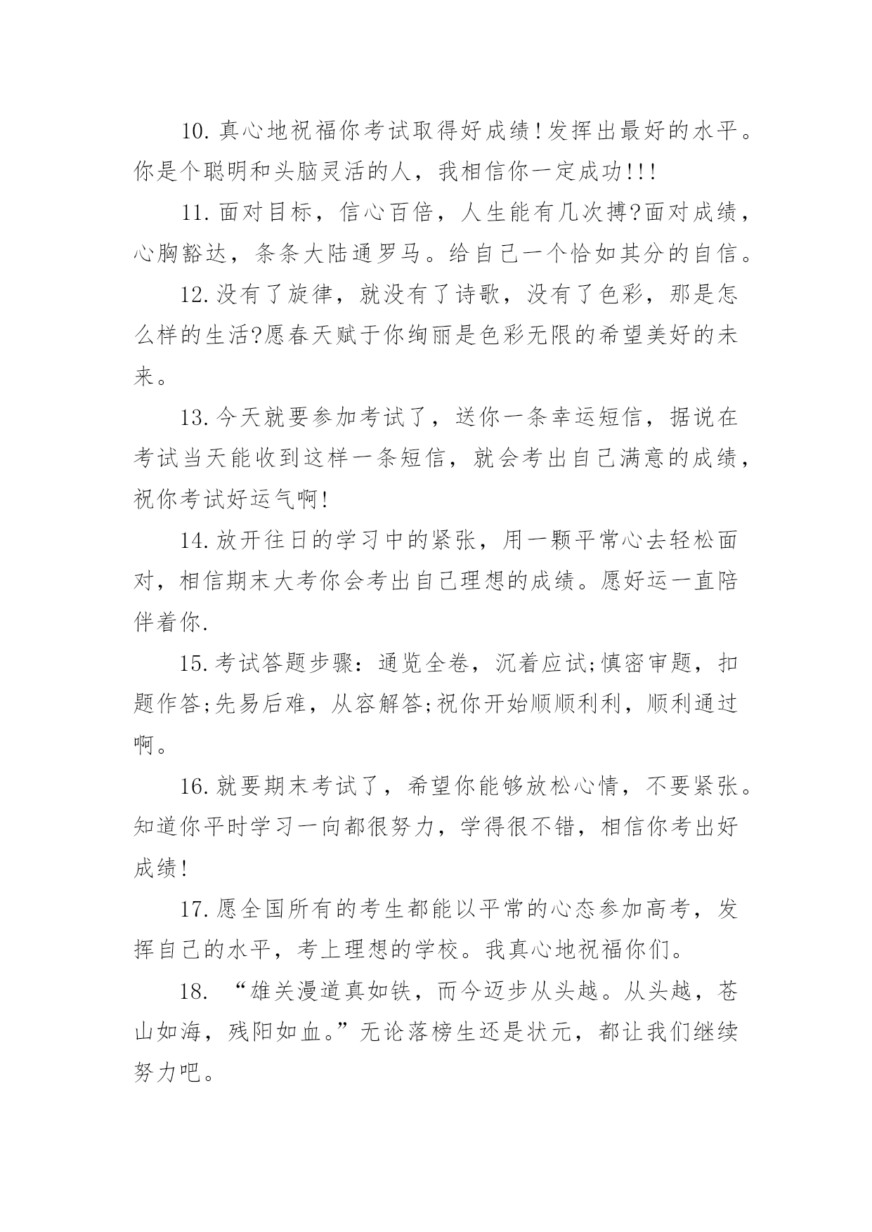 考试顺利的祝福语考试顺利的祝福语大全在平凡的学习、工作、生活中,大家对祝福语都再熟悉不过了吧,祝福语是人们表达心中祝福的话语。那么你所知道的祝福语都是什么样子的?下面是小编整理的考试顺利的祝福语大全,欢迎大家分享。考试顺利的祝福语大全11、祝福我的好朋友考研成功!虽然最近我不再陪伴你学习,但是我在心里依然惦记着你.相信你一定会成功的不管你能否看到.都希望你能感受到我真诚的祝福!2、再过几日即考试,十年寒窗为今朝。临时没法抱佛脚,上阵磨枪有绝招。考前定要休息好,用具准备要趁早,有备而战信心高。祝考试顺利!3、月寒更觉日暖,分别更恋相聚,在这毕业之时,祝愿你--万事如意,我们的生活充满了阳光和欢笑快乐地跳吧,世界属于我们!4、依依终须别,此后盼珍重,再叙情更浓。5、一次重要挑战,或许你有焦虑、有恐惧,也有激动,但我想说,请不要忘记身边所有关爱着你的人,我们是你坚强的后盾。祝你考试顺利通过,万事如愿以偿啊。6、眼看考试就要来了,向前看,相信自己,我会在远方为你送去最真挚的祝福,付出就会有收获的!放松心情,去迎接挑战,我相信你,你一定是最出色的!7、想说爱你,感觉太沉;想说喜欢,感觉太轻;一天天地眷恋,一夜夜的无眠,我只有数着相思的绿莹帘珠,托星月寄到你窗前.祝考试顺意!8、相信自己,我会在远方为你送去最真挚的祝福,付出就会有收获的!放松心情,去迎接挑战,我相信你,你一定是最出色的!祝福你考试中正常发挥,金榜题名,顺利考上自己理想的大学!加油!!!!!!9、希望你能考出好成绩啊,北京大学,对你来说,小意思了,嘿嘿!10、我们这些曾经的战友只能默默的祝福,祝福他们得到真正的成功,同时希望在看到他们时能有笑脸!!!!!!!!战友,加油~!!11、我们共同的家三年,漫长而又短暂.在这不同寻常的三年中,我们风雨兼程,肩并HAPPY好像越到知道成绩的时候,心里越是忐忑不安,远没有刚考完时那样一为考试的朋友所有参加考试的朋友不管怎样我们走过12、我坚信,我们付出了汗水,经受了考验,理想中大学殿堂的大门就一定会为我们而敞开,让我们继续艰辛却快乐的求学之路!13、为你倒数,还有几个小时就要上战场了,希望你能够放松心情,不要紧张。我知道你平时学习一向都很努力,学得很不错,相信你考好成绩是没问题的!14、试纸飘墨香,金笔待启程。忍心为功名,墨汁污纸张。怎能抛功名,畅游在海外。绞尽脑汁干,名在孙山外。两袖清风去,何苦染尘埃。祝考试成功!!!15、十年寒窗苦读日,只盼金榜题名时,祝你考试拿高分,鲤鱼跳龙门!加油!16、亲爱的同学,我们在一起这么久了,都是你在为我付出。我却没为你做些什么…下辈子如果做牛做马,我...我一定拔草给你吃!考试顺利!17、亲爱的同学,期末考试来了,愿你们考出好成绩,考到自己理想的成绩。18、亲爱的孩子,天,每一天爸爸都在全心全意地为你祝福。祝愿你从小的梦想成真!爸爸相信你一定会成功,明年秋天我就可以到大学校园探望你,我们一言为定19、努力了,就无怨无悔。有道是:天道筹勤!相信自己,你是最棒的!!愿和你分享每一份的喜悦!20、努力的苦读,就为这一刻啰!把你的实力全部发挥,所有关爱着你的人,都会为你祝福、祈祷,相信你会考出满意的成绩,榜上有名喔!21、你有你的赤橙黄绿,我有我的青蓝靛紫,天空同属于我们,因为我们年轻。22、你的美丽、雅纯是子弹,会深深地击中我的心,让你的情话和动人在我心中一生美丽,一条短信却蕴含着我千千万万个心愿,祝你天天快乐、高兴。23、明天就要考试,出门还得趁早。付出就有回报,赶紧睡个好觉。毕竟熬过十年,参加就可骄傲。别想分数高低,放松最为重要。老妈最近很累,别忘对她笑笑,老爸场场接送,给他一个拥抱。穿得漂漂亮亮,誓把监考迷倒。最后提醒一遍,检查铅笔小刀!24、快到期末大考了,希望你干自愿事,吃顺口饭,听轻松话,睡安心觉。使自己保持良好平静的心态,不要太紧张,相信你会取得好成绩!25,相信自己,一定能够鲤鱼跳龙门,门门考高分!考试顺利的祝福语大全21.师生莫等闲,协力齐心,共同铸就新辉煌。2.重要的不是发生了什么事,而是要做哪些事情来改善它!3.生命之中最快乐的是拼搏,而非成功,生命之中最痛苦的是懒散,而非失败。4.三年载卧薪尝胆欲酬壮志;一百天刻苦攻读誓闯雄关。5.要让事情改变,先改变我自己;要让事情变得更好,先让自己变得更好!6.祝愿所有的学子们:金榜题名!相信自己,你们是最棒的!7.又到年末了,马上就要迎来期末考试了,让我鼓励你,祝福你,祝你考出好的成绩。8.期末考试顺利,身体健康,一切都好!相信自己,你们一定是最棒的!9.希望考试卷上的题目都是你似曾相识的,并建立了深厚感情,让你可以迎刃而解!10.真心地祝福你考试取得好成绩!发挥出最好的水平。你是个聪明和头脑灵活的人,我相信你一定成功!!!11.面对目标