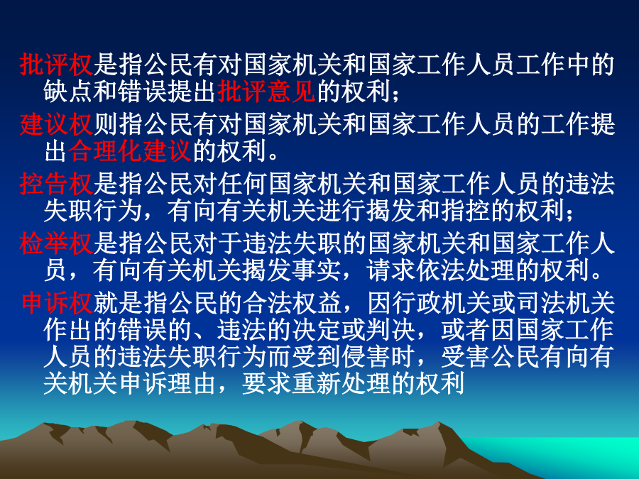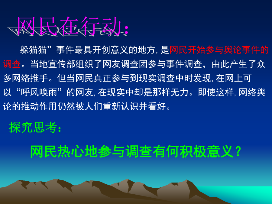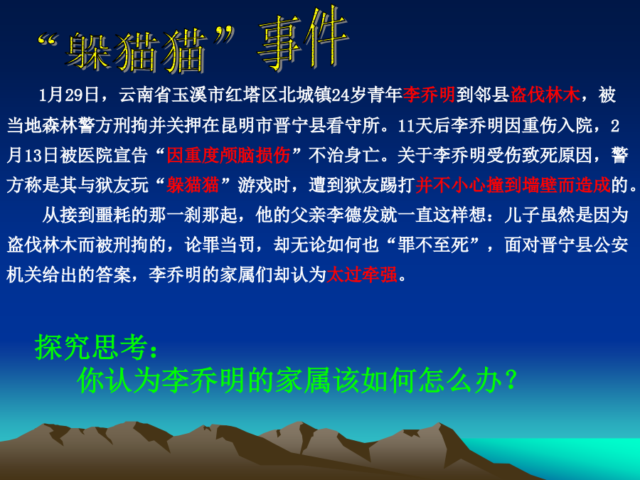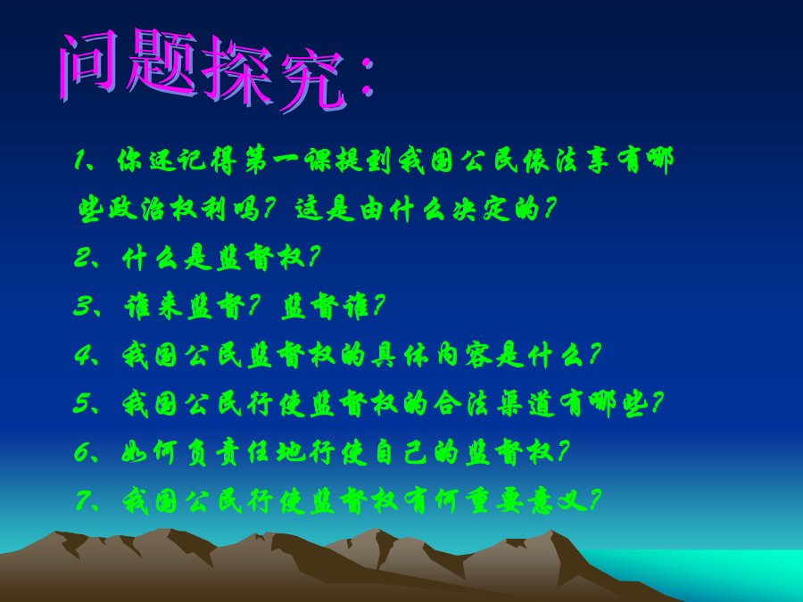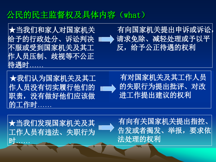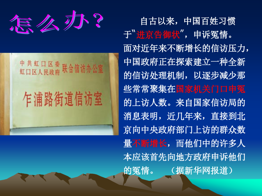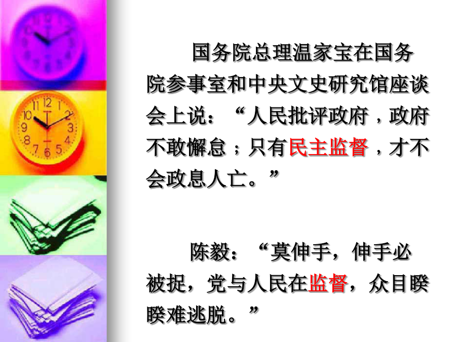 佘祥林,湖北省京山县雁门口镇何场村人,系京山县公安局马店派出所原治安巡逻队员,因涉嫌杀死妻子而被刑事拘留。曾两次被宣告“死刑”,后因证据不足逃过鬼门关。后被京山县人民法院以故意杀人罪判处有期徒刑15年,剥夺政治权利5年。但在3月28日,被佘祥林“杀害”达11年之久的妻子张在玉突然现身。民主监督:守望公共家园1、你还记得第一课提到我国公民依法享有哪些政治权利吗?这是由什么决定的?2、什么是监督权?3、谁来监督?监督谁?4、我国公民监督权的具体内容是什么?5、我国公民行使监督权的合法渠道有哪些?6、如何负责任地行使自己的监督权?7、我国公民行使监督权有何重要意义?国务院总理温家宝在国务院参事室和中央文史研究馆座谈会上说:“人民批评政府﹐政府不敢懈怠﹔只有民主监督﹐才不会政息人亡。”陈毅:“莫伸手,伸手必被捉,党与人民在监督,众目睽睽难逃脱。”批评权是指公民有对国家机关和国家工作人员工作中的缺点和错误提出批评意见的权利;建议权则指公民有对国家机关和国家工作人员的工作提出合理化建议的权利。控告权是指公民对任何国家机关和国家工作人员的违法失职行为,有向有关机关进行揭发和指控的权利;检举权是指公民对于违法失职的国家机关和国家工作人员,有向有关机关揭发事实,请求依法处理的权利。申诉权就是指公民的合法权益,因行政机关或司法机关作出的错误的、违法的决定或判决,或者因国家工作人员的违法失职行为而受到侵害时,受害公民有向有关机关申诉理由,要求重新处理的权利(1)控告人通常是直接受到不法侵害的人,而检举人则不一定与事件有直接关系;(2)控告是为了保护自己的权益而要求对违法失职行为进行处理,检举则多为出于正义感和维护公共利益的目的。公民的民主监督权及具体内容(what)“躲猫猫”事件自古以来,中国百姓习惯于“进京告御状”,申诉冤情。面对近年来不断增长的信访压力,中国政府正在探索建立一种全新的信访处理机制,以逐步减少那些常常聚集在国家机关门口申冤的上访人数。来自国家信访局的消息表明,近几年来,直接到北京向中央政府部门上访的群众数量不断增长,而他们中的许多人本应该首先向地方政府申诉他们的冤情。(据新华网报道)盘点2008网上曝光官员专家称网络促官员廉政三任总理的题词和赠言:1997年12月29日,李鹏总理视察中央电视台,他特意来到《焦点访谈》演播室,欣然挥毫题词:“焦点访谈,表扬先进,批评落后,伸张正义。”1998年10月7日,朱镕基总理专程来到中央电视台与《焦点访谈》的编辑、记者座谈,并郑重赠言:“舆论监督,群众喉舌,政府镜鉴,改革尖兵。”2003年8月26日,温家宝总理自上任以来第一次视察中央电视台,在《焦点访谈》演播室赠言:“与人民同行,与祖国同在,与世界同步,与时代同进。”民间人士将此信封称为“御赐黄马褂”。上传民主监督方式“躲猫猫”事件,由最高人民检察院派员指导、云南省人民检察院督办、昆明市人民检察院主办后,已于上周五真相初步大白,案情初步水落石出。晋宁县看守所在押人员李荞明是被牢头狱霸殴打致死的。已经公布的晋宁警方、检方有关责任人处理情况看,驻看守所检察室主任免职,县公安局长行政记大过,副局长免职、行政记大过,看守所长撤职、副所长撤职,看守所民警(一名)辞退,应当只是一种初步的处理结果。涉案的两名民警已被拘留,随着案件的进一步进展,相信还会有更为严厉的处罚措施,甚至是法律责任的追究。30多辆警车赴宴“喝喜酒”1、依据:我国是人民民主专政的社会主义国家,人民当家作主,监督权是宪法规定的公民的政治权利2、意义:对公民:有助于激发广大公民关心国家大事、为社会主义现代化建设出谋划策的主人翁精神,提高民主参与能力。对国家机关:有利于改进国家机关及其工作人员的工作。对社会:推进社会主义民主政治建设进程他以前骂我,我现在去诽谤他!2月26日发表于《中国青年报》“躲猫猫”事件中的网民露出了狰狞可怕的一面。事件发生地云南晋宁政府网站遭到黑客恶意修改和破坏,网站首页充斥着几十行“俯卧撑、打酱油、躲猫猫,武林三大绝学!”的字样,公示公告、政务信息、领导讲话、政务文件等栏目原有的内容,都被改为以上字样。更可怕的是,这种违法行为,竟在网络上赢得了无数的追捧和欢呼,黑客成了“路见不平拔刀相助”的英雄,被贴上了反抗专断的正义标签,最保守的留言也是“虽然违法,但感觉特痛快”。思考探究:上述行为有什么问题?你有什么建议?如此上访?辨析题:在信访活动中,相当一部分群众认为:只要上访有道理,我什么也不怕、什么都敢做、都能做。1、负责任地实行民主监督,要求我们在依法行使申诉、控告或检举权利时,坚持实事求是的原则,如实反映情况,不能捏造、歪曲事实,诬告、陷害他人;2、负责任地实行民主监督,还要求我们不能以举报为名制造
