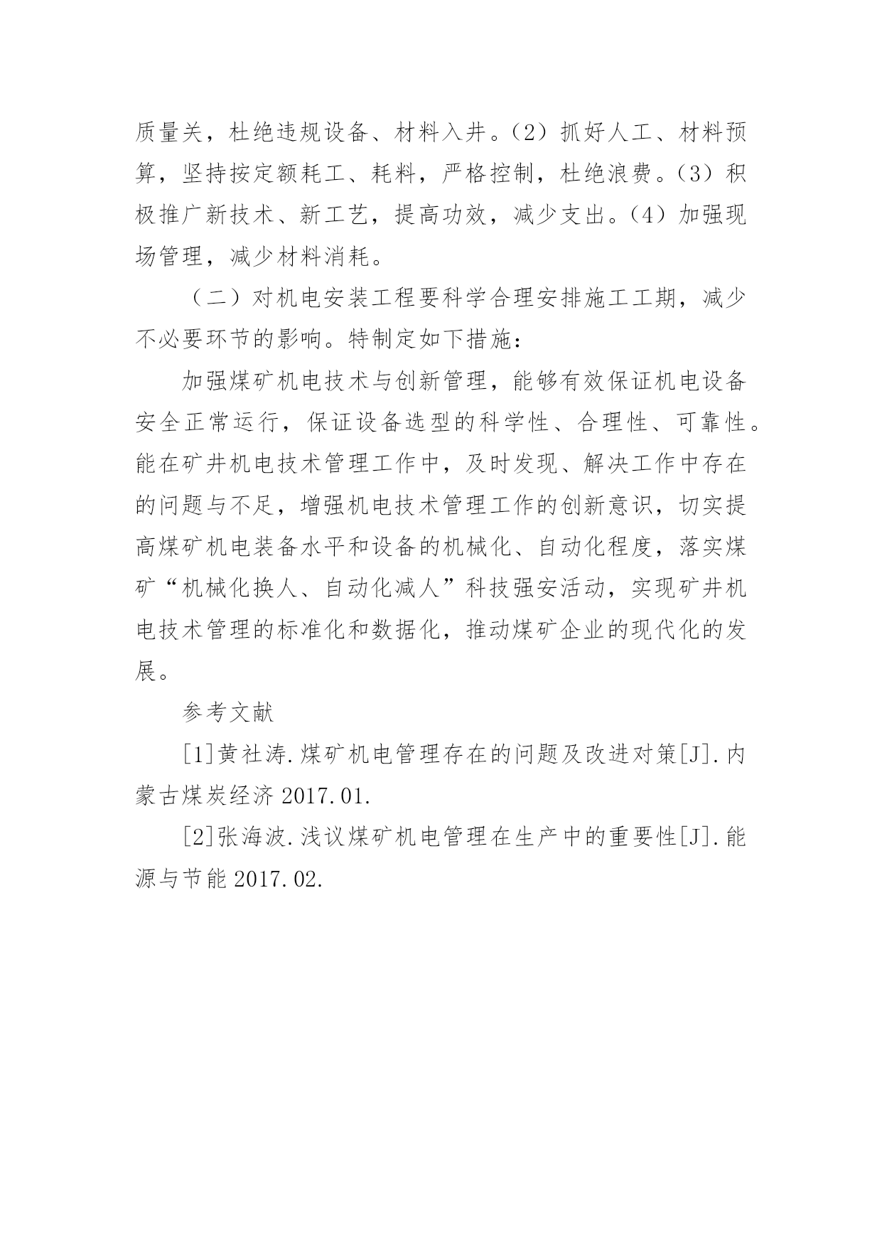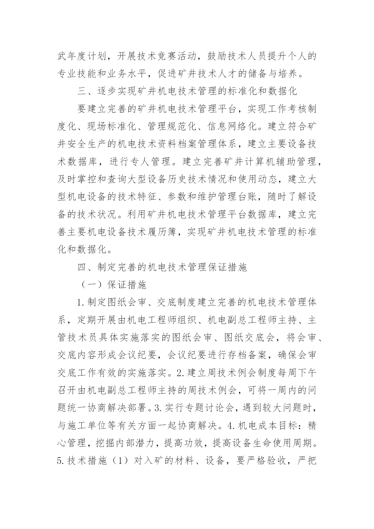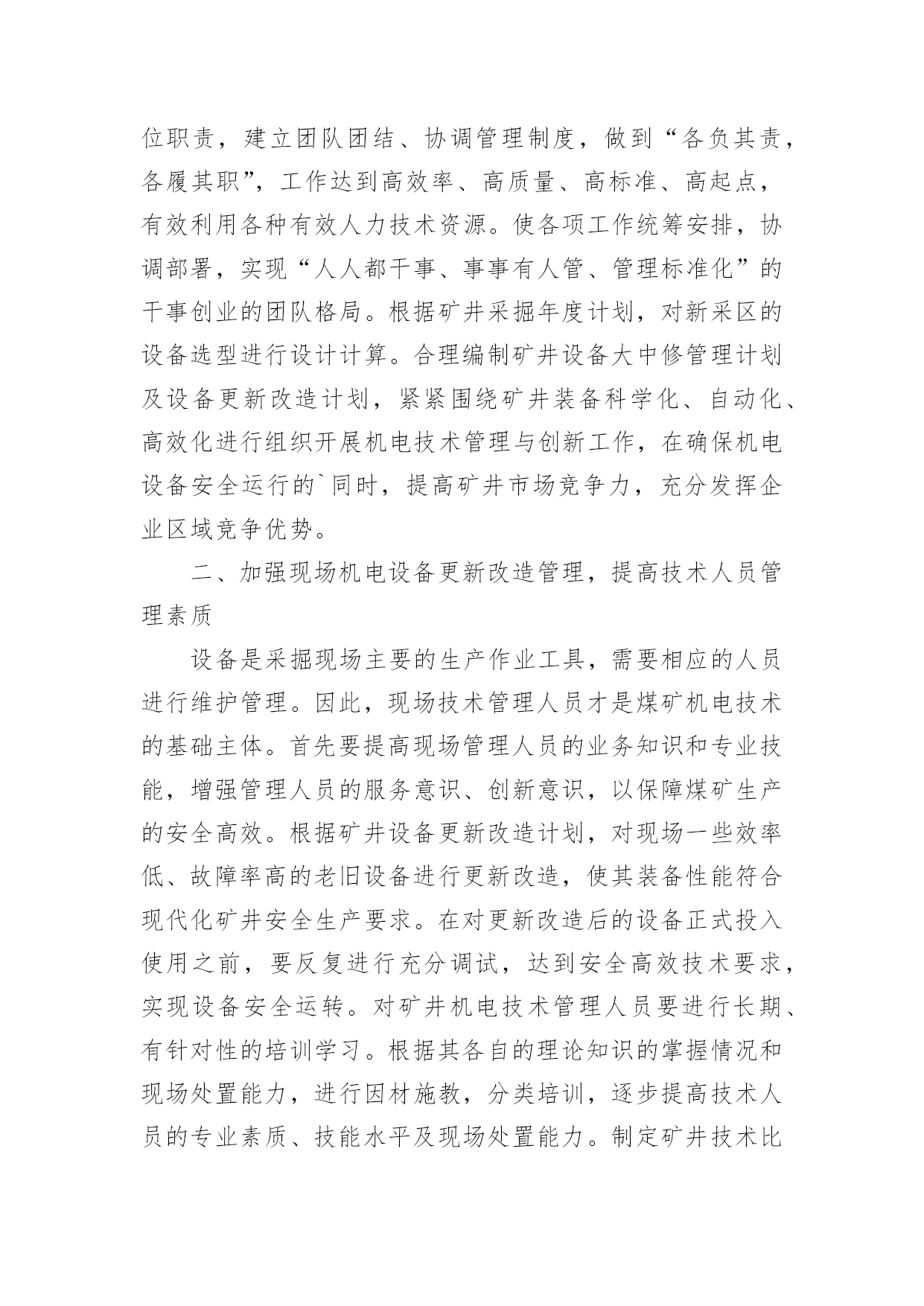 煤矿企业机电技术管理与创新论文煤矿企业机电技术管理与创新论文摘要:煤矿企业机电技术管理与创新能够解决煤矿安全生产技术管理中存在的多种技术难题,积极开展煤矿“机械化换人、自动化减人”科技强安活动,有效提高矿井技术装备水平,大大降低设备事故障率,使机电技术管理工作逐步走向过程精细化,技术标准化,管理层次责任化,人员能力素质化之路,为煤矿企业安全生产稳定开展夯实基础。关键词:煤矿企业;机电技术;管理;创新在现代化煤矿安全生产管理中,随着科学技术的发展,煤矿机电设备的机械化、自动化程度也越来越高,对煤矿机电技术精细化管理的要求越来越严格,这要求煤矿机电技术管理与创新提到更重高的水平,直接反映在企业的竞争力,对安全生产和社会效益的质量有直接的影响。一、科学合理的进行开展矿井机电技术管理与创新工作煤矿企业机电技术管理与创新能够解决煤矿安全生产技术管理中存在的多种技术难题,积极开展煤矿“机械化换人、自动化减人”科技强安活动,有效提高矿井技术装备水平,大大降低设备事故障率,使机电技术管理工作逐步走向过程精细化,技术标准化,管理层次责任化,人员能力素质化之路,为煤矿企业安全生产稳定开展夯实基础。组建科学合理的机电技术管理组织机构,明确各管理机构工作人员岗位职责,建立团队团结、协调管理制度,做到“各负其责,各履其职”,工作达到高效率、高质量、高标准、高起点,有效利用各种有效人力技术资源。使各项工作统筹安排,协调部署,实现“人人都干事、事事有人管、管理标准化”的干事创业的团队格局。根据矿井采掘年度计划,对新采区的设备选型进行设计计算。合理编制矿井设备大中修管理计划及设备更新改造计划,紧紧围绕矿井装备科学化、自动化、高效化进行组织开展机电技术管理与创新工作,在确保机电设备安全运行的`同时,提高矿井市场竞争力,充分发挥企业区域竞争优势。二、加强现场机电设备更新改造管理,提高技术人员管理素质设备是采掘现场主要的生产作业工具,需要相应的人员进行维护管理。因此,现场技术管理人员才是煤矿机电技术的基础主体。首先要提高现场管理人员的业务知识和专业技能,增强管理人员的服务意识、创新意识,以保障煤矿生产的安全高效。根据矿井设备更新改造计划,对现场一些效率低、故障率高的老旧设备进行更新改造,使其装备性能符合现代化矿井安全生产要求。在对更新改造后的设备正式投入使用之前,要反复进行充分调试,达到安全高效技术要求,实现设备安全运转。对矿井机电技术管理人员要进行长期、有针对性的培训学习。根据其各自的理论知识的掌握情况和现场处置能力,进行因材施教,分类培训,逐步提高技术人员的专业素质、技能水平及现场处置能力。制定矿井技术比武年度计划,开展技术竞赛活动,鼓励技术人员提升个人的专业技能和业务水平,促进矿井技术人才的储备与培养。三、逐步实现矿井机电技术管理的标准化和数据化要建立完善的矿井机电技术管理平台,实现工作考核制度化、现场标准化、管理规范化、信息网络化。建立符合矿井安全生产的机电技术资料档案管理体系,建立主要设备技术数据库,进行专人管理。建立完善矿井计算机辅助管理,及时掌控和查询大型设备历史技术情况和使用动态,建立大型机电设备的技术特征、参数和维护管理台账,随时了解设备的技术状况。利用矿井机电技术管理平台数据库,建立完善主要机电设备技术履历簿,实现矿井机电技术管理的标准化和数据化。四、制定完善的机电技术管理保证措施(一)保证措施1.制定图纸会审、交底制度建立完善的机电技术管理体系,定期开展由机电工程师组织、机电副总工程师主持、主管技术员具体实施落实的图纸会审、图纸交底会,将会审、交底内容形成会议纪要,会议纪要进行存档备案,确保会审交底工作有效的实施落实。2.建立周技术例会制度每周下午召开由机电副总工程师主持的周技术例会,可将一周内的问题统一协商解决部署。3.实行专题讨论会,遇到较大问题时,与施工单位等有关方面一起协商解决。4.机电成本目标:精心管理,挖掘内部潜力,提高功效,提高设备生命使用周期。5.技术措施(1)对入矿的材料、设备,要严格验收,严把质量关,杜绝违规设备、材料入井。(2)抓好人工、材料预算,坚持按定额耗工、耗料,严格控制,杜绝浪费。(3)积极推广新技术、新工艺,提高功效,减少支出。(4)加强现场管理,减少材料消耗。(二)对机电安装工程要科学合理安排施工工期,减少不必要环节的影响。特制定如下措施:加强煤矿机电技术与创新管理,能够有效保证机电设备安全正常运行,保证设备选型的科学性、合理性、可靠性。能在矿井机电技术管理工作中,及时发现、解决工作中存在的问题与不足,增强机电技术管理工作的创新意识,切实提高煤矿机电装备水平和设备的机械化、自动化程度,落实煤矿“机械化换人、自动化减人”科技强安活动,实现矿井机电技术管理的标准化和数据化,推动煤矿企业的现代化的发展。参考文献