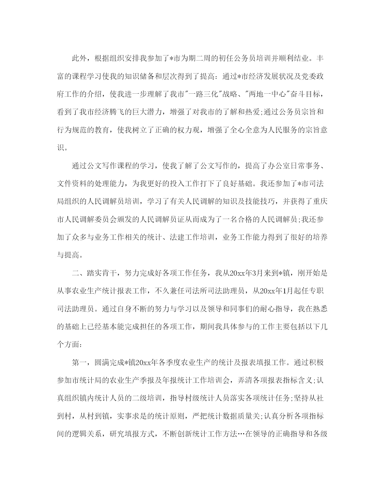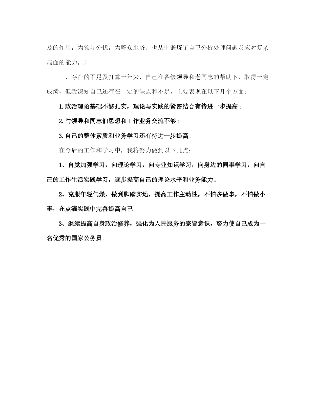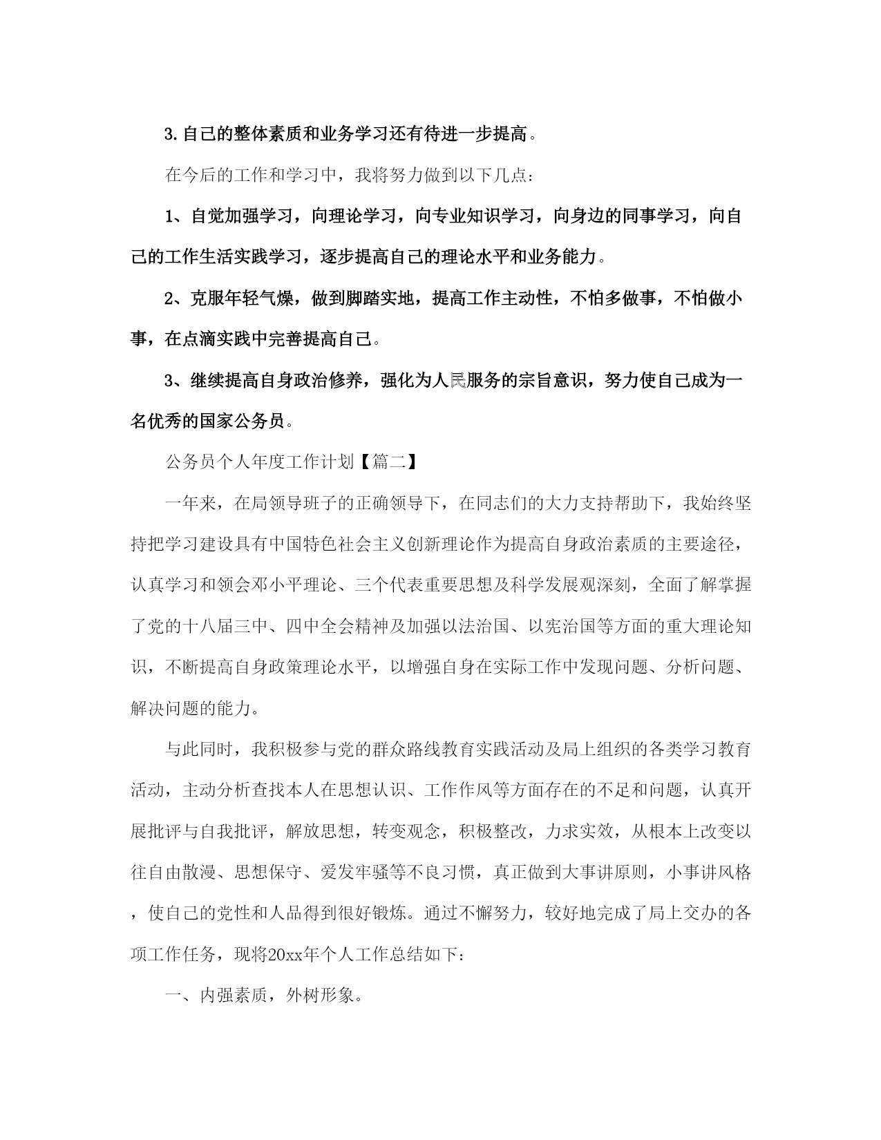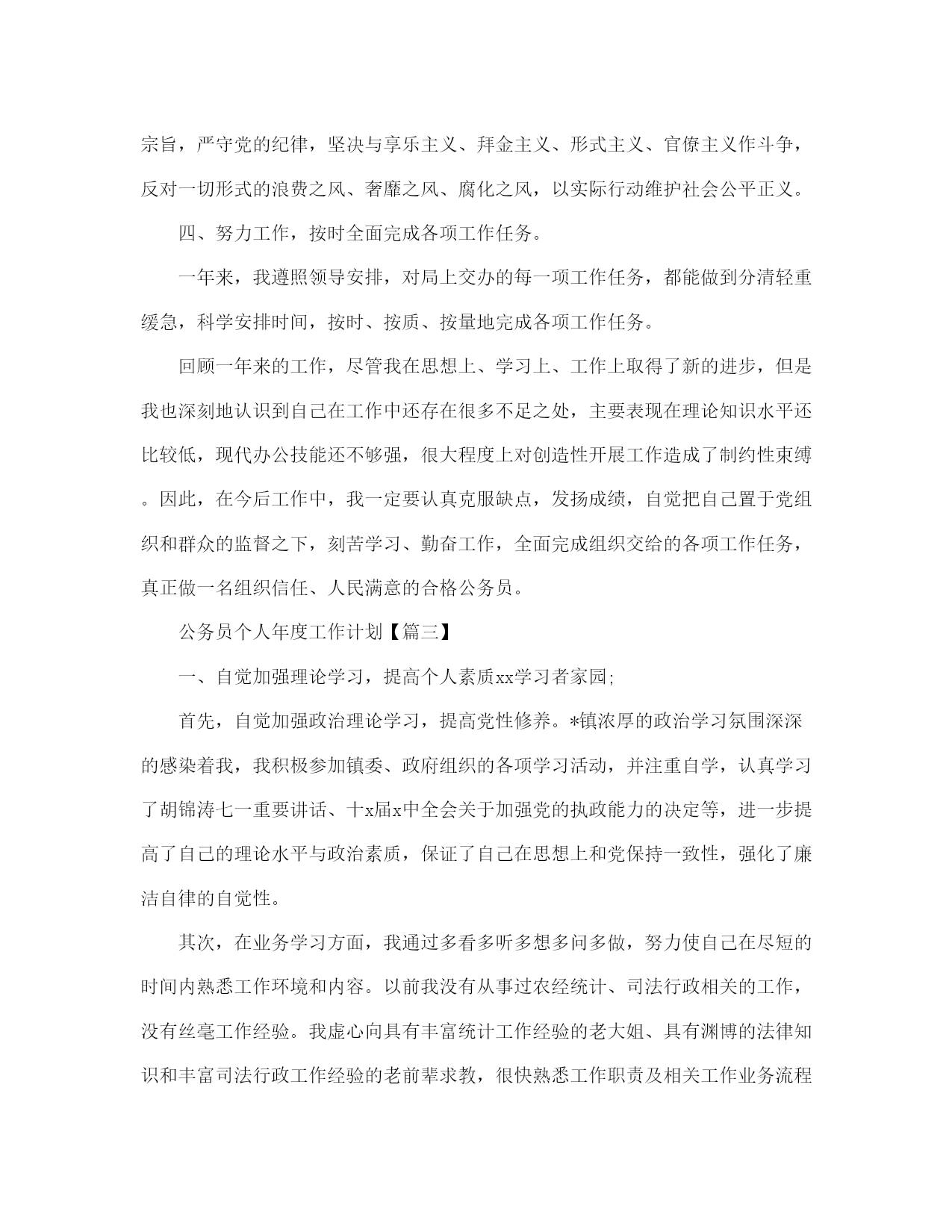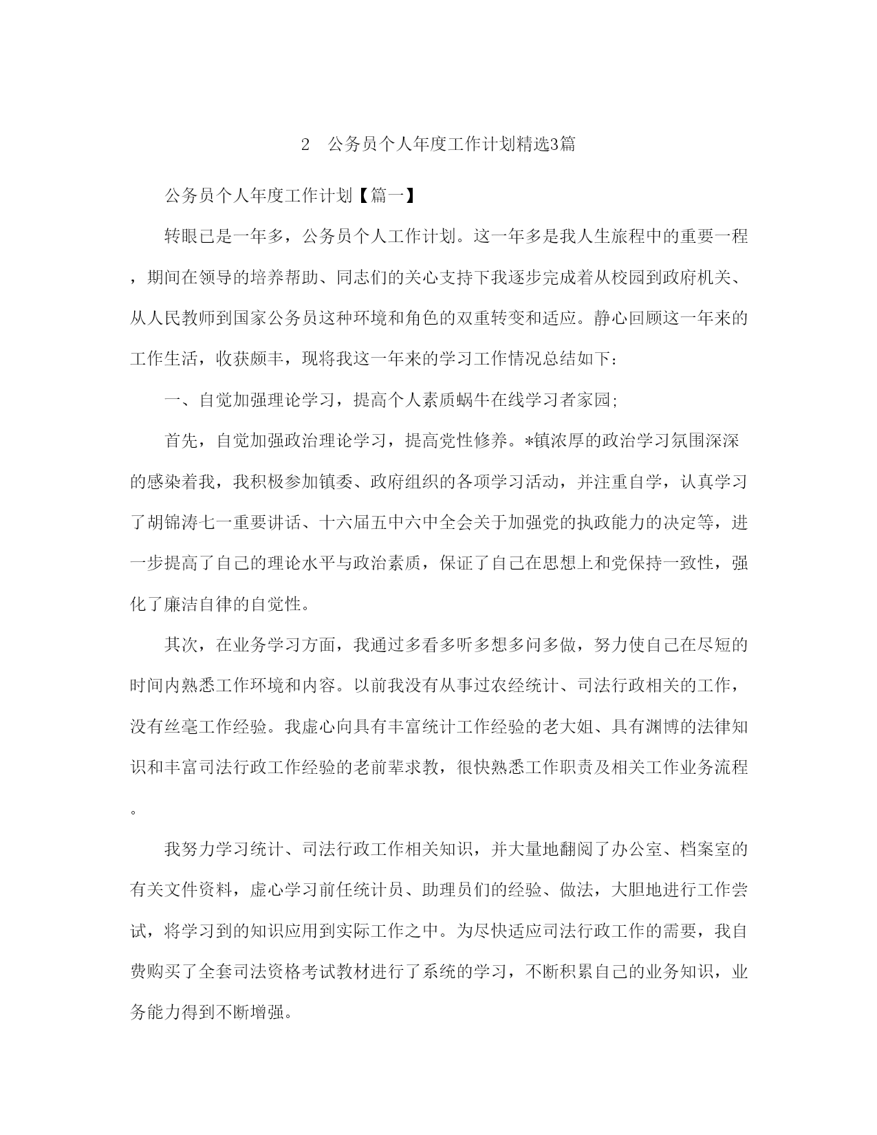 公务员个人度工作计划范文(完整版)文档资料可直接使用,可编辑,欢迎下载2公务员个人年度工作计划精选3篇公务员个人年度工作计划【篇一】转眼已是一年多,公务员个人工作计划。这一年多是我人生旅程中的重要一程,期间在领导的培养帮助、同志们的关心支持下我逐步完成着从校园到政府机关、从人民教师到国家公务员这种环境和角色的双重转变和适应。静心回顾这一年来的工作生活,收获颇丰,现将我这一年来的学习工作情况总结如下:一、自觉加强理论学习,提高个人素质蜗牛在线学习者家园;首先,自觉加强政治理论学习,提高党性修养。*镇浓厚的政治学习氛围深深的感染着我,我积极参加镇委、政府组织的各项学习活动,并注重自学,认真学习了胡锦涛七一重要讲话、十六届五中六中全会关于加强党的执政能力的决定等,进一步提高了自己的理论水平与政治素质,保证了自己在思想上和党保持一致性,强化了廉洁自律的自觉性。其次,在业务学习方面,我通过多看多听多想多问多做,努力使自己在尽短的时间内熟悉工作环境和内容。以前我没有从事过农经统计、司法行政相关的工作,没有丝毫工作经验。我虚心向具有丰富统计工作经验的老大姐、具有渊博的法律知识和丰富司法行政工作经验的老前辈求教,很快熟悉工作职责及相关工作业务流程。我努力学习统计、司法行政工作相关知识,并大量地翻阅了办公室、档案室的有关文件资料,虚心学习前任统计员、助理员们的经验、做法,大胆地进行工作尝试,将学习到的知识应用到实际工作之中。为尽快适应司法行政工作的需要,我自费购买了全套司法资格考试教材进行了系统的学习,不断积累自己的业务知识,业务能力得到不断增强。此外,根据组织安排我参加了*市为期二周的初任公务员培训并顺利结业。丰富的课程学习使我的知识储备和层次得到了提高:通过*市经济发展状况及党委政府工作的介绍,使我进一步理解了我市"一路三化"战略、"两地一中心"奋斗目标,看到了我市经济腾飞的巨大潜力,增强了对我市的了解和热爱;通过公务员宗旨和行为规范的教育,使我树立了正确的权力观,增强了全心全意为人民服务的宗旨意识。通过公文写作课程的学习,使我了解了公文写作的,提高了办公室日常事务、文件资料的处理能力,为我更好的投入工作打下了良好基础。我还参加了*市司法局组织的人民调解员培训,学习了有关人民调解的知识及技能技巧,并获得了重庆市人民调解委员会颁发的人民调解员证从而成为了一名合格的人民调解员;我还参加了众多与业务工作相关的统计、法建工作培训,业务工作能力得到了很好的培养与提高。二、踏实肯干,努力完成好各项工作任务,我从20xx年3月来到*镇,刚开始是从事农业生产统计报表工作,不久兼任司法所司法助理员,从20xx年1月起任专职司法助理员。通过自身不断的努力与学习以及领导和同事们的耐心指导,我在熟悉的基础上已经基本能完成担任的各项工作,期间我具体参与的工作主要包括以下几个方面:第一,圆满完成*镇20xx年各季度农业生产的统计及报表填报工作。通过积极参加市统计局的农业生产季报及年报统计工作培训会,弄清各项报表指标含义;认真组织镇内统计人员的二级培训,指导村级统计人员落实各项统计任务;坚持从社到村,从村到镇,实事求是的统计原则,严把统计数据质量关;认真分析各项指标间的逻辑关系,研究填报方式,不断创新统计工作方法…在领导的正确指导和各级统计人员的共同努力下,20xx年*镇统计工作圆满完成,被*市统计局评为优秀单位。第二,认真做好司法所工作,落实司法所各项职能。20xx年是"五五"普法启动之年,我仔细查看、整理了"四五"普法以来的各种资料,协助所长落实各项法制宣传任务,收集、整理、规范普法资料,广泛开展送法下乡、法制赶场等活动,为*镇被评为"四五"普法工作优秀单位及20xx年法制建设工作优秀单位尽了自己的一份力;加强了纠纷排查,协助所长调解了大量民间纠纷,为构建和谐*,维护社会稳定作出了自己应有的贡献;对两劳回归人员进行了基本情况摸排归档,下乡调查核对,了解情况,积极帮助他们解决生活工作困难,赢得了群众好评等。第三,认真完成领导交办的临时性工作任务。基层政府工作涉及面广,经常有一些临时性的工作需要突击,我服从领导安排,认真完成领导交办的各项任务。在去年"二环路征地"、"电厂三期工程征地"中,我与其它同志一起,起早摸黑,冒着漫天大雨在田地里测量面积,最终完成了领导交给的按时交地任务。在全国1%人口抽样调查中,我与另外几个统计办的同志挨家挨户调查,白天没人就晚上去,工作日没人就星期天去,宁可辛苦点也坚持既确保调查质量又确保按时完成任务;我还积极参与了其它一些临时性、突发性事件的安抚处理工作中,尽力发挥自己力所能及的作用,为领导分忧,为群众服务。也从中锻炼了自己分析处理问题及应对复杂局面的能力。)三、存在的不足及打算一年来,自己在各级领导和老同志