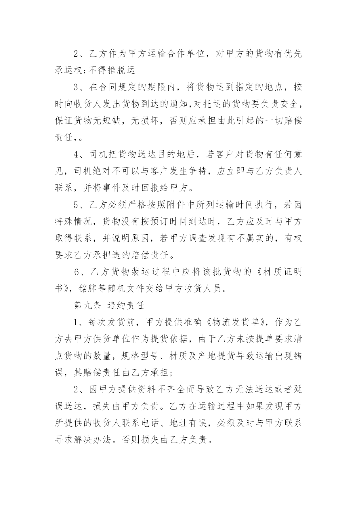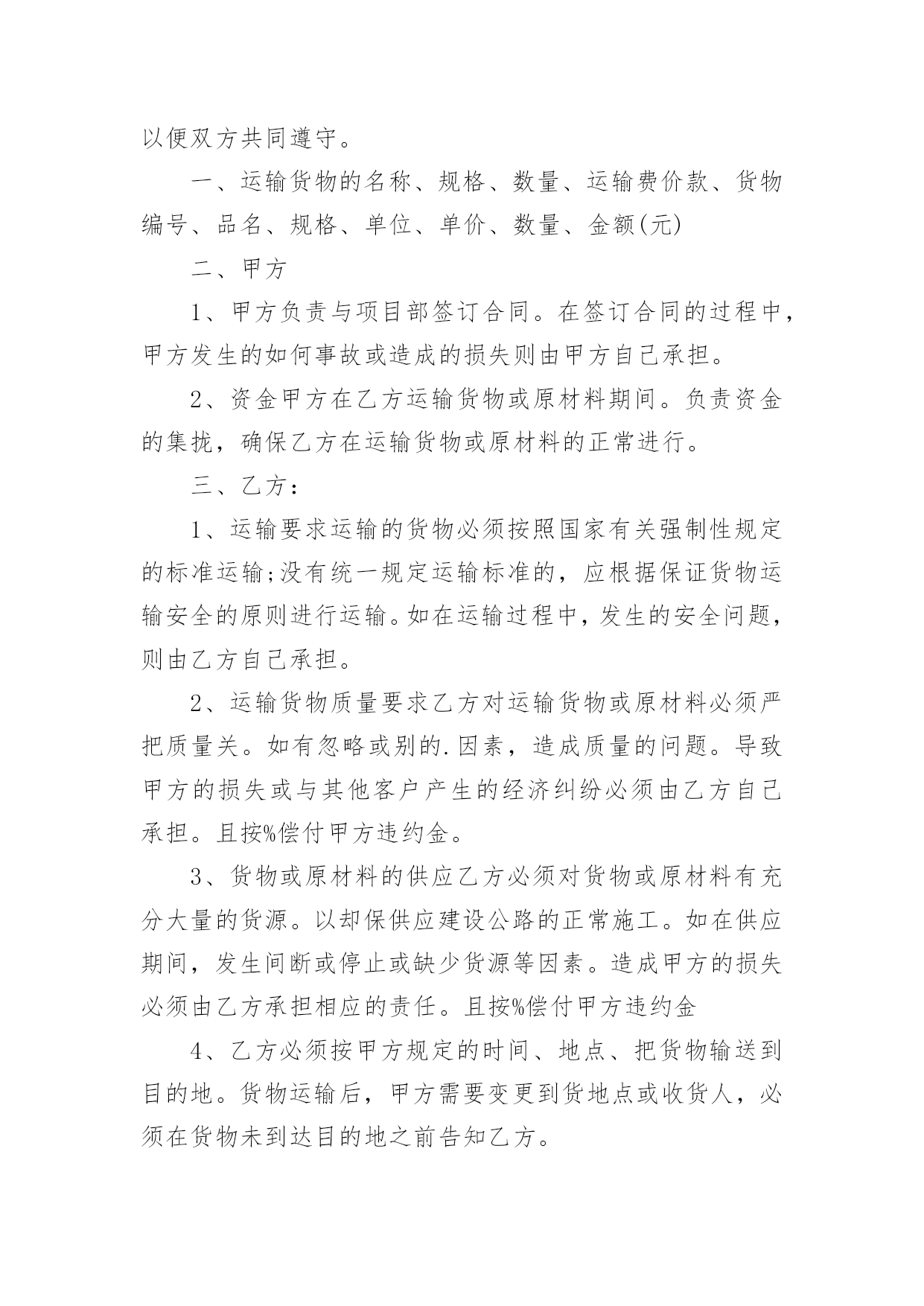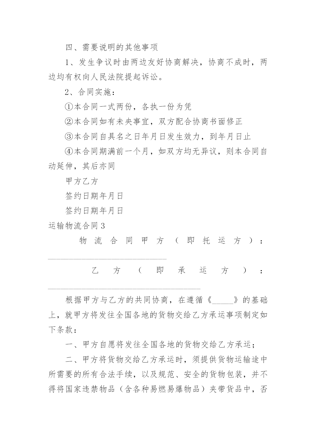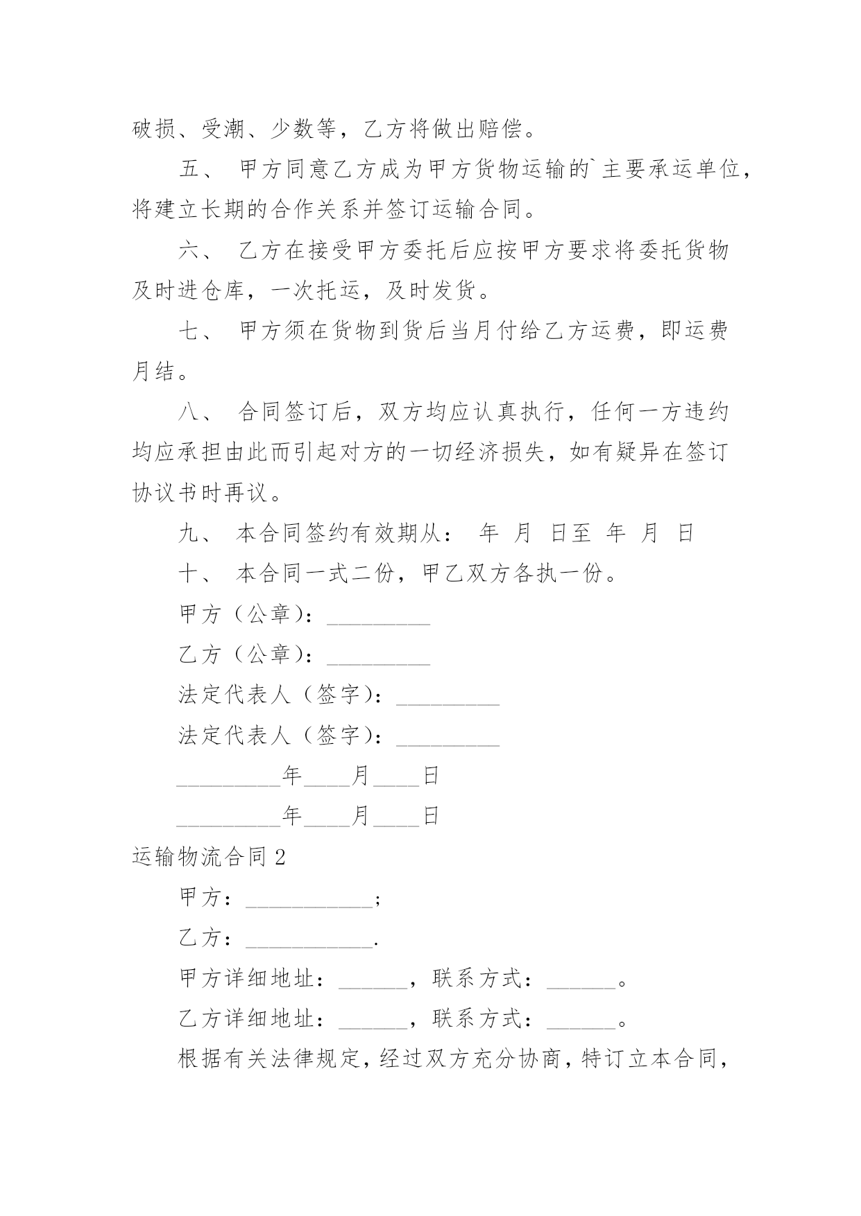 运输物流合同【推荐】运输物流合同随着时间的推移,很多场合都离不了合同,合同能够促使双方正确行使权力,严格履行义务。那么合同要怎么拟定?想必这让大家都很苦恼吧,下面是小编收集整理的运输物流合同,仅供参考,欢迎大家阅读。运输物流合同1托运方(甲方):签约时间:年月日承运方(乙方):签约时间:年月日根据国家有关运输规定,甲乙双方本着互利互惠的原则。经过双方充分协商,特订立本合同以便双方共同遵守。一、甲方每次发货时与乙方应签订货物托运协议书,写明货物名称、数量和重量、运费和保价、送货地点及到货期限。甲方负责向乙方移交甲方的送货单及相关资料。二、乙方保证能提供足够的运输能力,以保证甲方货物完整、按时正确地交给甲方所指定收货单位。三、甲方托运货物时不得夹带危险品和禁运物品,如夹带混装上车而发生的一切损失均由甲方承担。四、乙方在运输时必须保证甲方货物完整、清洁。如货物在运输途中发生意外或到达收货单位后发现污染、包装破损、受潮、少数等,乙方将做出赔偿。五、甲方同意乙方成为甲方货物运输的`主要承运单位,将建立长期的合作关系并签订运输合同。六、乙方在接受甲方委托后应按甲方要求将委托货物及时进仓库,一次托运,及时发货。七、甲方须在货物到货后当月付给乙方运费,即运费月结。八、合同签订后,双方均应认真执行,任何一方违约均应承担由此而引起对方的一切经济损失,如有疑异在签订协议书时再议。九、本合同签约有效期从:年月日至年月日十、本合同一式二份,甲乙双方各执一份。甲方(公章):_________乙方(公章):_________法定代表人(签字):_________法定代表人(签字):__________________年____月____日_________年____月____日运输物流合同2甲方:___________;乙方:___________.甲方详细地址:______,联系方式:______。乙方详细地址:______,联系方式:______。根据有关法律规定,经过双方充分协商,特订立本合同,以便双方共同遵守。一、运输货物的名称、规格、数量、运输费价款、货物编号、品名、规格、单位、单价、数量、金额(元)二、甲方1、甲方负责与项目部签订合同。在签订合同的过程中,甲方发生的如何事故或造成的损失则由甲方自己承担。2、资金甲方在乙方运输货物或原材料期间。负责资金的集拢,确保乙方在运输货物或原材料的正常进行。三、乙方:1、运输要求运输的货物必须按照国家有关强制性规定的标准运输;没有统一规定运输标准的,应根据保证货物运输安全的原则进行运输。如在运输过程中,发生的安全问题,则由乙方自己承担。2、运输货物质量要求乙方对运输货物或原材料必须严把质量关。如有忽略或别的.因素,造成质量的问题。导致甲方的损失或与其他客户产生的经济纠纷必须由乙方自己承担。且按%偿付甲方违约金。3、货物或原材料的供应乙方必须对货物或原材料有充分大量的货源。以却保供应建设公路的正常施工。如在供应期间,发生间断或停止或缺少货源等因素。造成甲方的损失必须由乙方承担相应的责任。且按%偿付甲方违约金4、乙方必须按甲方规定的时间、地点、把货物输送到目的地。货物运输后,甲方需要变更到货地点或收货人,必须在货物未到达目的地之前告知乙方。四、需要说明的其他事项1、发生争议时由两边友好协商解决,协商不成时,两边均有权向人民法院提起诉讼。2、合同实施:①本合同一式两份,各执一份为凭②本合同如有未央事宜,双方配合协商书面修正③本合同自具名之日年月日发生效力,到年月日止④本合同期满前一个月,如双方均无异议,则本合同自动延伸,其后亦同甲方乙方签约日期年月日签约日期年月日运输物流合同3物流合同甲方(即托运方):____________________________乙方(即承运方):____________________________________根据甲方与乙方的共同协商,在遵循《_____》的基础上,就甲方将发往全国各地的货物交给乙方承运事项制定如下条款:一、甲方自愿将发往全国各地的货物交给乙方承运;二、甲方将货物交给乙方承运时,须提供货物运输途中所需要的所有合法手续,以及规范、安全的货物包装,并不得将国家违禁物品(含各种易燃易爆物品)夹带货品中,否则由此造成所有损失由甲方承担;三、甲方将货物交给乙方承运时,须按货物实际价值自行购买_____,或由乙方代为办理购买_____,否则由此产生货损、货丢,乙方不承担全部责任;四、如果货物在运输过程中出现包装损坏、货品损失等情况必须经收货人、送货司机(或者到达货站经手人)共同签字出具书面证明,必要时由收货人扣押送货_____或扣除到货应收运费等;如未有签字证明,则乙方可拒绝赔偿;五、如果出现货物安全及时到达甲方指定地点而未能收取运费等应_____用,乙方可视情形扣押货