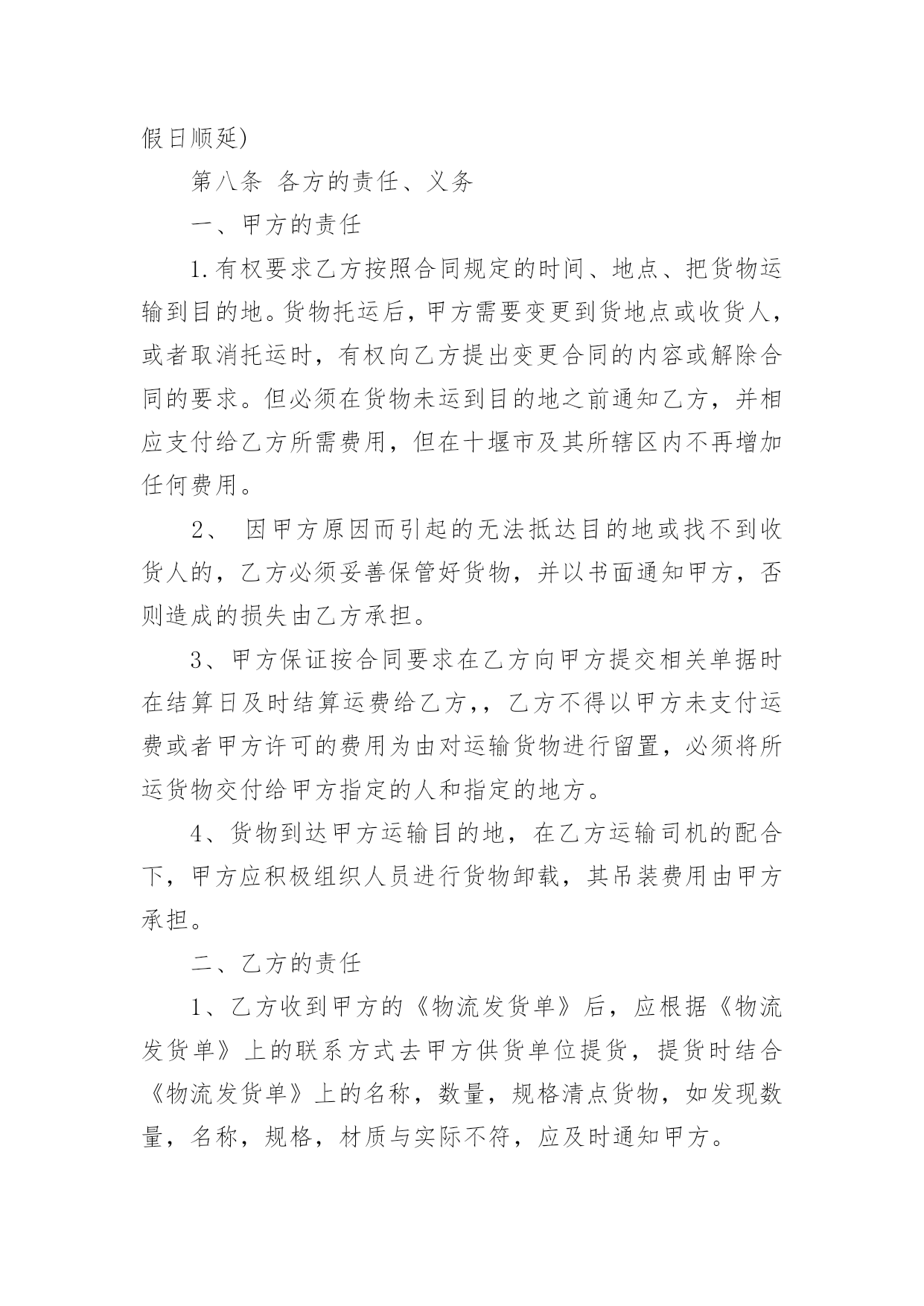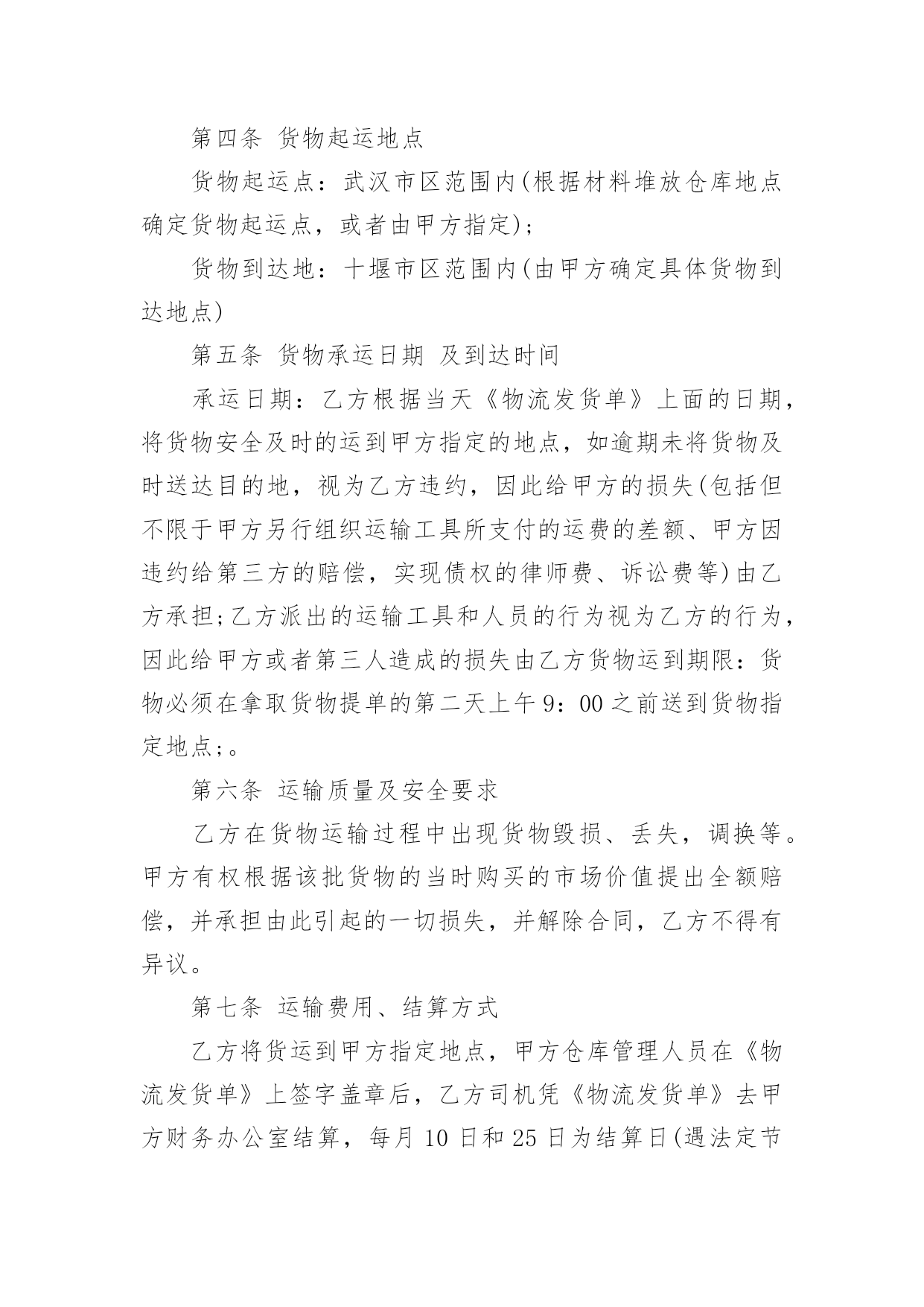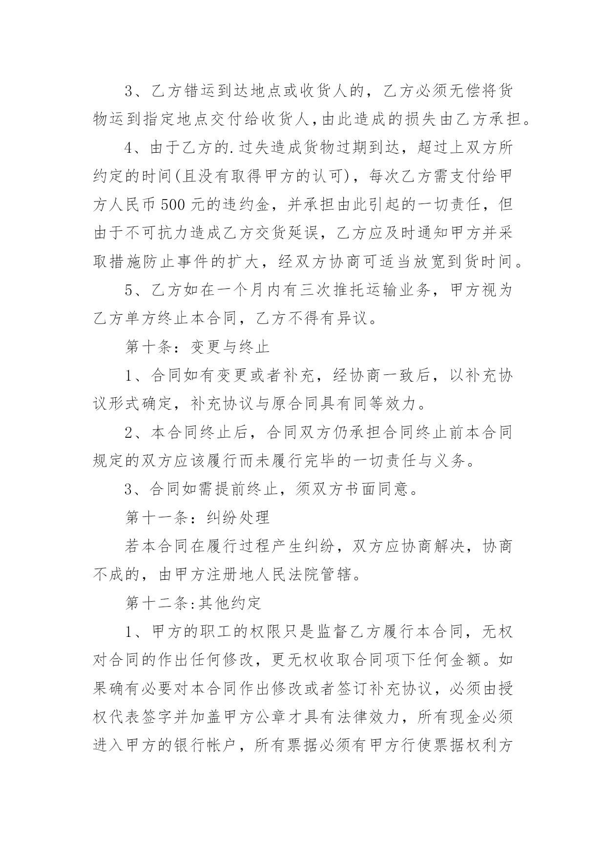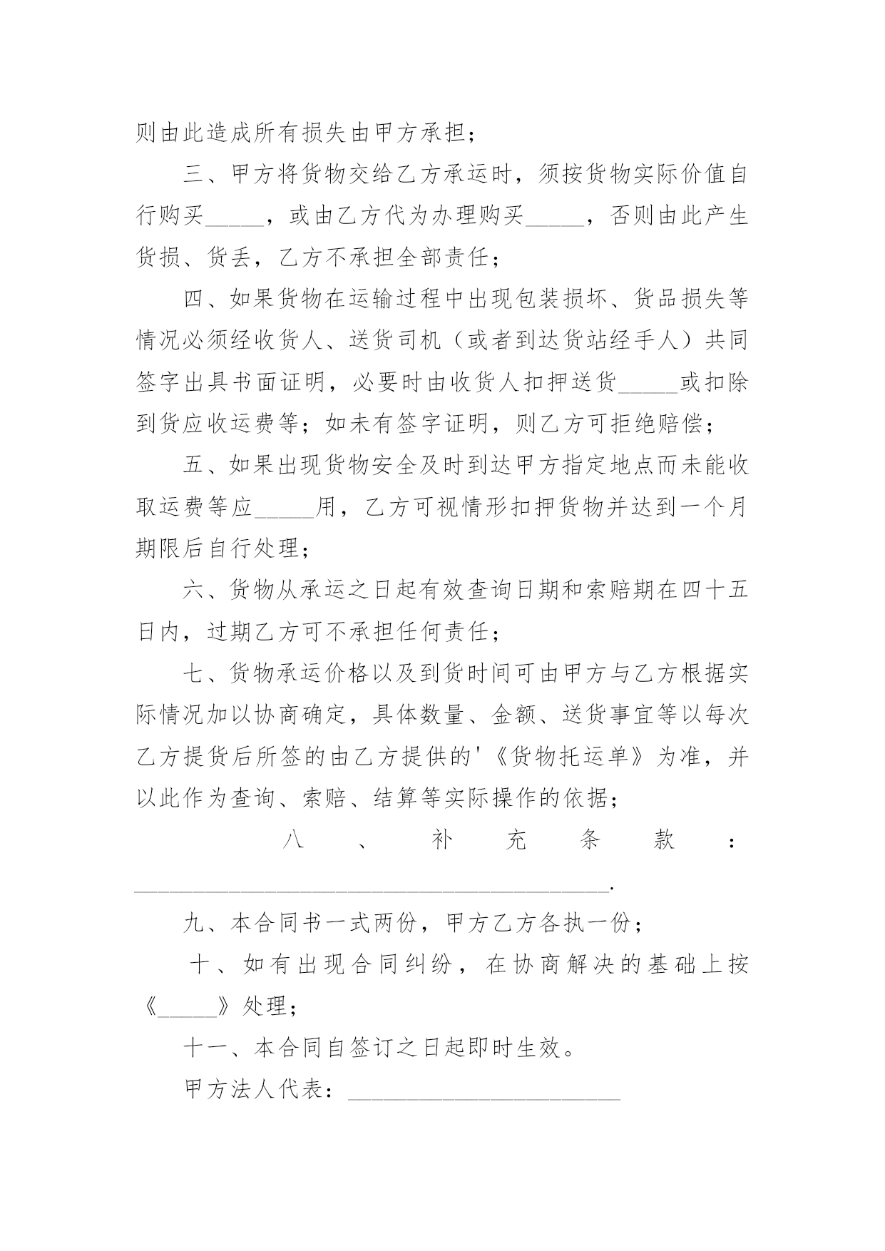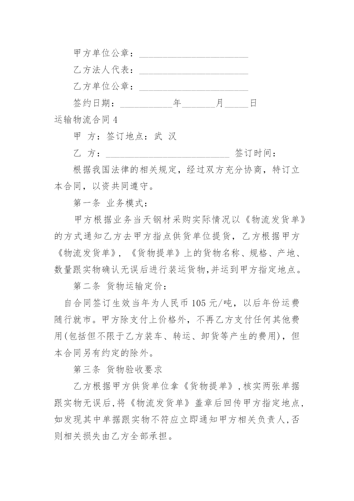 运输物流合同【推荐】运输物流合同随着时间的推移,很多场合都离不了合同,合同能够促使双方正确行使权力,严格履行义务。那么合同要怎么拟定?想必这让大家都很苦恼吧,下面是小编收集整理的运输物流合同,仅供参考,欢迎大家阅读。运输物流合同1托运方(甲方):签约时间:年月日承运方(乙方):签约时间:年月日根据国家有关运输规定,甲乙双方本着互利互惠的原则。经过双方充分协商,特订立本合同以便双方共同遵守。一、甲方每次发货时与乙方应签订货物托运协议书,写明货物名称、数量和重量、运费和保价、送货地点及到货期限。甲方负责向乙方移交甲方的送货单及相关资料。二、乙方保证能提供足够的运输能力,以保证甲方货物完整、按时正确地交给甲方所指定收货单位。三、甲方托运货物时不得夹带危险品和禁运物品,如夹带混装上车而发生的一切损失均由甲方承担。四、乙方在运输时必须保证甲方货物完整、清洁。如货物在运输途中发生意外或到达收货单位后发现污染、包装破损、受潮、少数等,乙方将做出赔偿。五、甲方同意乙方成为甲方货物运输的`主要承运单位,将建立长期的合作关系并签订运输合同。六、乙方在接受甲方委托后应按甲方要求将委托货物及时进仓库,一次托运,及时发货。七、甲方须在货物到货后当月付给乙方运费,即运费月结。八、合同签订后,双方均应认真执行,任何一方违约均应承担由此而引起对方的一切经济损失,如有疑异在签订协议书时再议。九、本合同签约有效期从:年月日至年月日十、本合同一式二份,甲乙双方各执一份。甲方(公章):_________乙方(公章):_________法定代表人(签字):_________法定代表人(签字):__________________年____月____日_________年____月____日运输物流合同2甲方:___________;乙方:___________.甲方详细地址:______,联系方式:______。乙方详细地址:______,联系方式:______。根据有关法律规定,经过双方充分协商,特订立本合同,以便双方共同遵守。一、运输货物的名称、规格、数量、运输费价款、货物编号、品名、规格、单位、单价、数量、金额(元)二、甲方1、甲方负责与项目部签订合同。在签订合同的过程中,甲方发生的如何事故或造成的损失则由甲方自己承担。2、资金甲方在乙方运输货物或原材料期间。负责资金的集拢,确保乙方在运输货物或原材料的正常进行。三、乙方:1、运输要求运输的货物必须按照国家有关强制性规定的标准运输;没有统一规定运输标准的,应根据保证货物运输安全的原则进行运输。如在运输过程中,发生的安全问题,则由乙方自己承担。2、运输货物质量要求乙方对运输货物或原材料必须严把质量关。如有忽略或别的.因素,造成质量的问题。导致甲方的损失或与其他客户产生的经济纠纷必须由乙方自己承担。且按%偿付甲方违约金。3、货物或原材料的供应乙方必须对货物或原材料有充分大量的货源。以却保供应建设公路的正常施工。如在供应期间,发生间断或停止或缺少货源等因素。造成甲方的损失必须由乙方承担相应的责任。且按%偿付甲方违约金4、乙方必须按甲方规定的时间、地点、把货物输送到目的地。货物运输后,甲方需要变更到货地点或收货人,必须在货物未到达目的地之前告知乙方。四、需要说明的其他事项1、发生争议时由两边友好协商解决,协商不成时,两边均有权向人民法院提起诉讼。2、合同实施:①本合同一式两份,各执一份为凭②本合同如有未央事宜,双方配合协商书面修正③本合同自具名之日年月日发生效力,到年月日止④本合同期满前一个月,如双方均无异议,则本合同自动延伸,其后亦同甲方乙方签约日期年月日签约日期年月日运输物流合同3物流合同甲方(即托运方):____________________________乙方(即承运方):____________________________________根据甲方与乙方的共同协商,在遵循《_____》的基础上,就甲方将发往全国各地的货物交给乙方承运事项制定如下条款:一、甲方自愿将发往全国各地的货物交给乙方承运;二、甲方将货物交给乙方承运时,须提供货物运输途中所需要的所有合法手续,以及规范、安全的货物包装,并不得将国家违禁物品(含各种易燃易爆物品)夹带货品中,否则由此造成所有损失由甲方承担;三、甲方将货物交给乙方承运时,须按货物实际价值自行购买_____,或由乙方代为办理购买_____,否则由此产生货损、货丢,乙方不承担全部责任;四、如果货物在运输过程中出现包装损坏、货品损失等情况必须经收货人、送货司机(或者到达货站经手人)共同签字出具书面证明,必要时由收货人扣押送货_____或扣除到货应收运费等;如未有签字证明,则乙方可拒绝赔偿;五、如果出现货物安全及时到达甲方指定地点而未能收取运费等应_____用,乙方可视情形扣押货