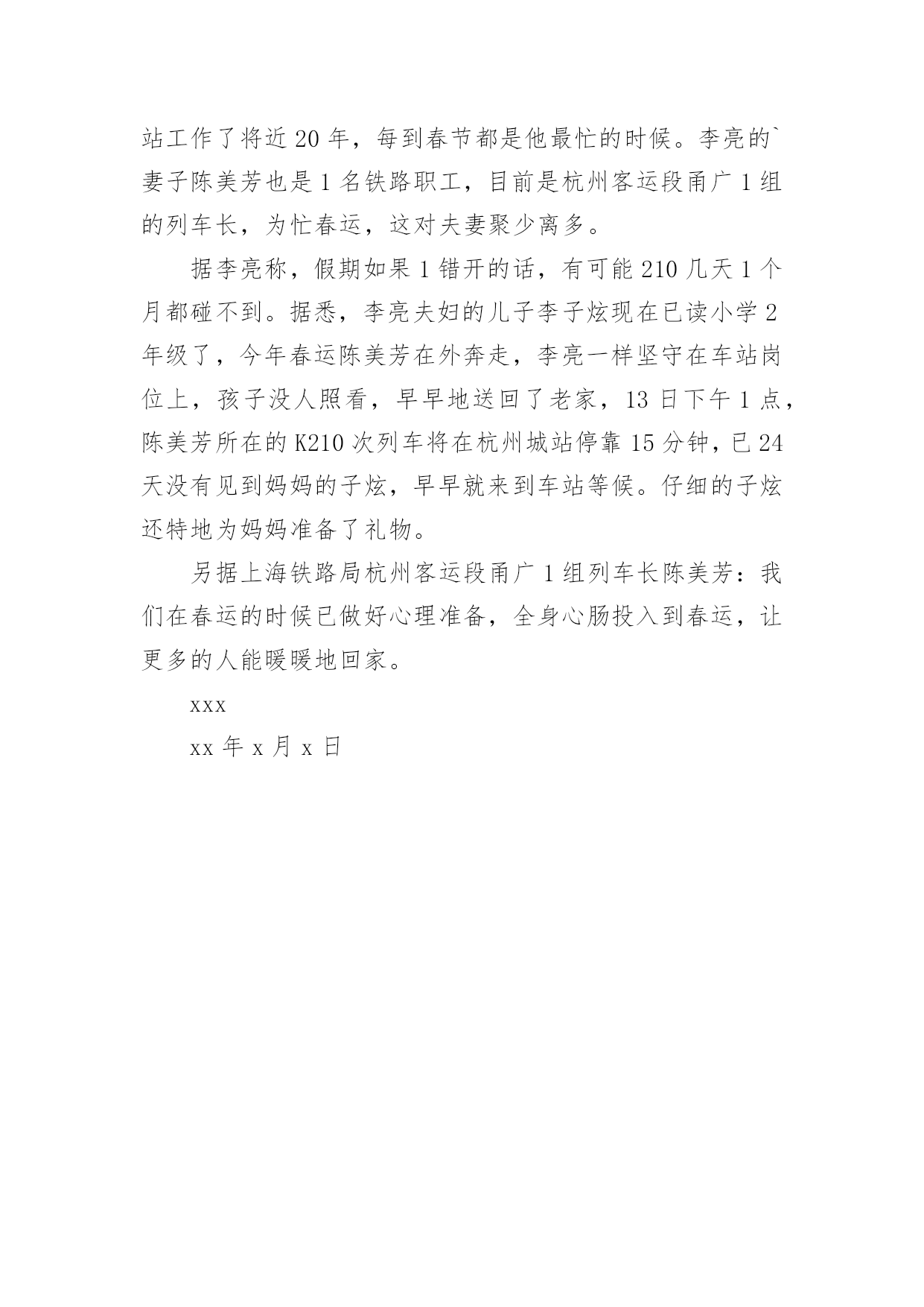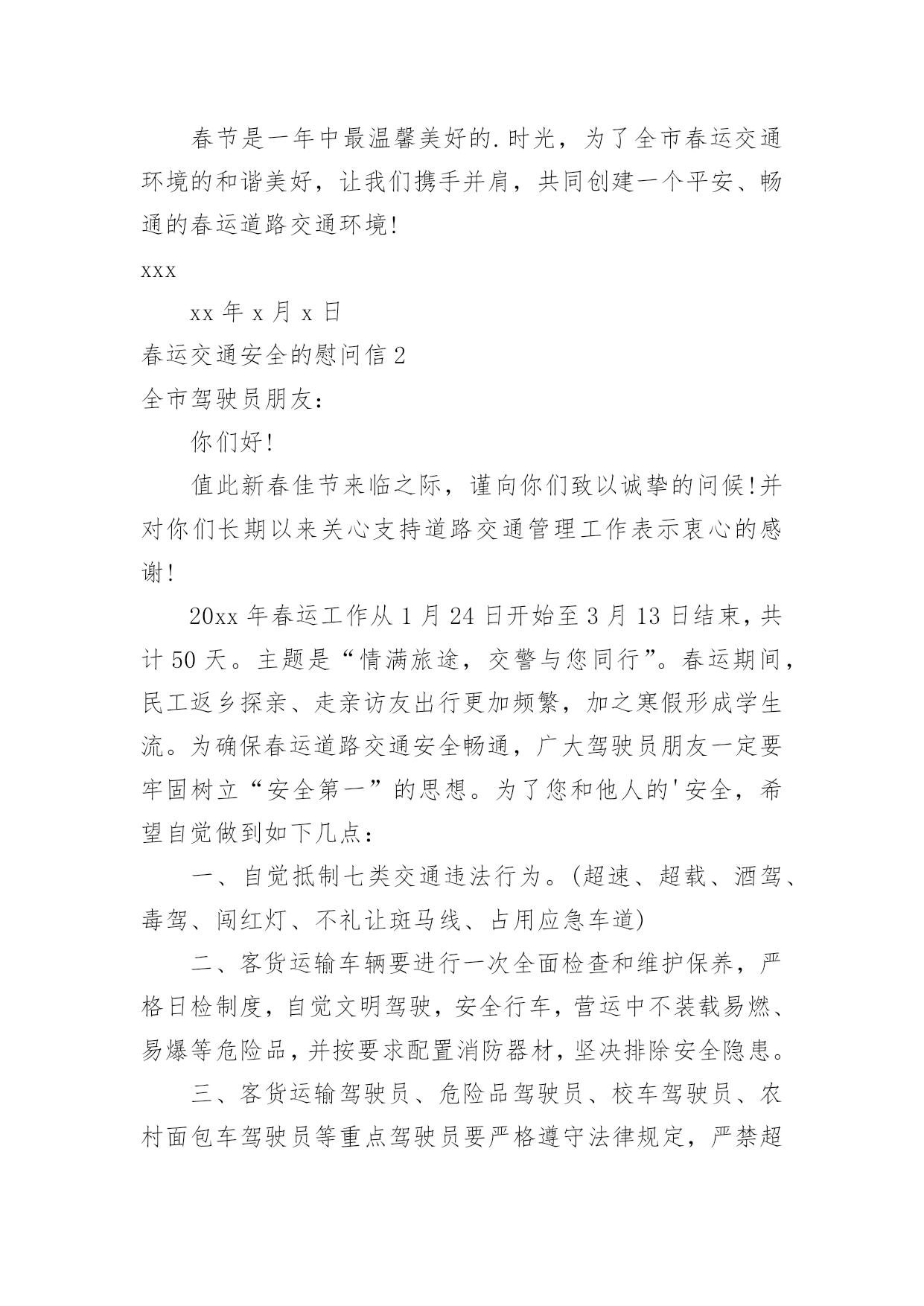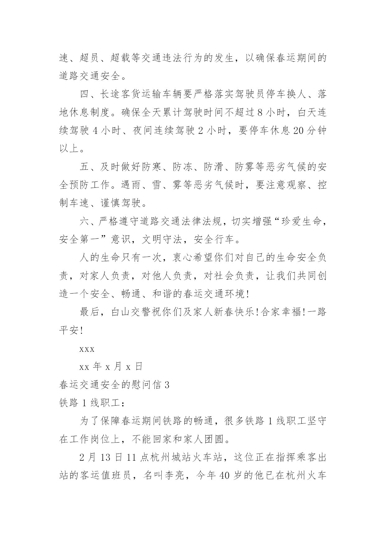 春运交通安全的慰问信春运交通安全的慰问信在发展不断提速的社会中,慰问信在我们的视野里出现的频率越来越高,如果向那些有特殊贡献或遇到意外不幸的人表示慰问,可以写一封慰问信。如何写一份恰当的慰问信呢?下面是小编精心整理的春运交通安全的慰问信,欢迎大家分享。春运交通安全的慰问信1广大市民及驾驶员朋友:你们好!春节将至,包头市公安局交通管理支队全体民警向您和您的家人致以节日的问候,对您长期以来对公安交通管理工作的关心、理解和支持表示衷心地感谢!春运安全事关千家万户的幸福与社会的和谐,我市各级交管部门在春运期间将采取积极有效的措施,全面排查道路交通安全隐患,强化春运交通安全源头监管,从严查处各类交通违法行为,全力保障广大市民出行平安。市民朋友们,春运交通安全管理离不开大家的理解、支持和配合。客运驾驶人朋友要注意控制车速,坚决抵制酒后驾驶、超速行驶、疲劳驾驶、闯红灯、强行超车、超员等危险驾驶行为。出门探亲访友的朋友们不要乘坐无牌、无证或超员客车,如发现乘坐的车辆有超员、超速等交通违法行为,可以通过电话、短信等方式向公安交管部门举报。春节是一年中最温馨美好的.时光,为了全市春运交通环境的和谐美好,让我们携手并肩,共同创建一个平安、畅通的春运道路交通环境!xxxxx年x月x日春运交通安全的慰问信2全市驾驶员朋友:你们好!值此新春佳节来临之际,谨向你们致以诚挚的问候!并对你们长期以来关心支持道路交通管理工作表示衷心的感谢!20xx年春运工作从1月24日开始至3月13日结束,共计50天。主题是“情满旅途,交警与您同行”。春运期间,民工返乡探亲、走亲访友出行更加频繁,加之寒假形成学生流。为确保春运道路交通安全畅通,广大驾驶员朋友一定要牢固树立“安全第一”的思想。为了您和他人的'安全,希望自觉做到如下几点:一、自觉抵制七类交通违法行为。(超速、超载、酒驾、毒驾、闯红灯、不礼让斑马线、占用应急车道)二、客货运输车辆要进行一次全面检查和维护保养,严格日检制度,自觉文明驾驶,安全行车,营运中不装载易燃、易爆等危险品,并按要求配置消防器材,坚决排除安全隐患。三、客货运输驾驶员、危险品驾驶员、校车驾驶员、农村面包车驾驶员等重点驾驶员要严格遵守法律规定,严禁超速、超员、超载等交通违法行为的发生,以确保春运期间的道路交通安全。四、长途客货运输车辆要严格落实驾驶员停车换人、落地休息制度。确保全天累计驾驶时间不超过8小时,白天连续驾驶4小时、夜间连续驾驶2小时,要停车休息20分钟以上。五、及时做好防寒、防冻、防滑、防雾等恶劣气候的安全预防工作。遇雨、雪、雾等恶劣气候时,要注意观察、控制车速、谨慎驾驶。六、严格遵守道路交通法律法规,切实增强“珍爱生命,安全第一”意识,文明守法,安全行车。人的生命只有一次,衷心希望你们对自己的生命安全负责,对家人负责,对他人负责,对社会负责,让我们共同创造一个安全、畅通、和谐的春运交通环境!最后,白山交警祝你们及家人新春快乐!合家幸福!一路平安!xxxxx年x月x日春运交通安全的慰问信3铁路1线职工:为了保障春运期间铁路的畅通,很多铁路1线职工坚守在工作岗位上,不能回家和家人团圆。2月13日11点杭州城站火车站,这位正在指挥乘客出站的客运值班员,名叫李亮,今年40岁的他已在杭州火车站工作了将近20年,每到春节都是他最忙的时候。李亮的`妻子陈美芳也是1名铁路职工,目前是杭州客运段甬广1组的列车长,为忙春运,这对夫妻聚少离多。据李亮称,假期如果1错开的话,有可能210几天1个月都碰不到。据悉,李亮夫妇的儿子李子炫现在已读小学2年级了,今年春运陈美芳在外奔走,李亮一样坚守在车站岗位上,孩子没人照看,早早地送回了老家,13日下午1点,陈美芳所在的K210次列车将在杭州城站停靠15分钟,已24天没有见到妈妈的子炫,早早就来到车站等候。仔细的子炫还特地为妈妈准备了礼物。另据上海铁路局杭州客运段甬广1组列车长陈美芳:我们在春运的时候已做好心理准备,全身心肠投入到春运,让更多的人能暖暖地回家。xxxxx年x月x日