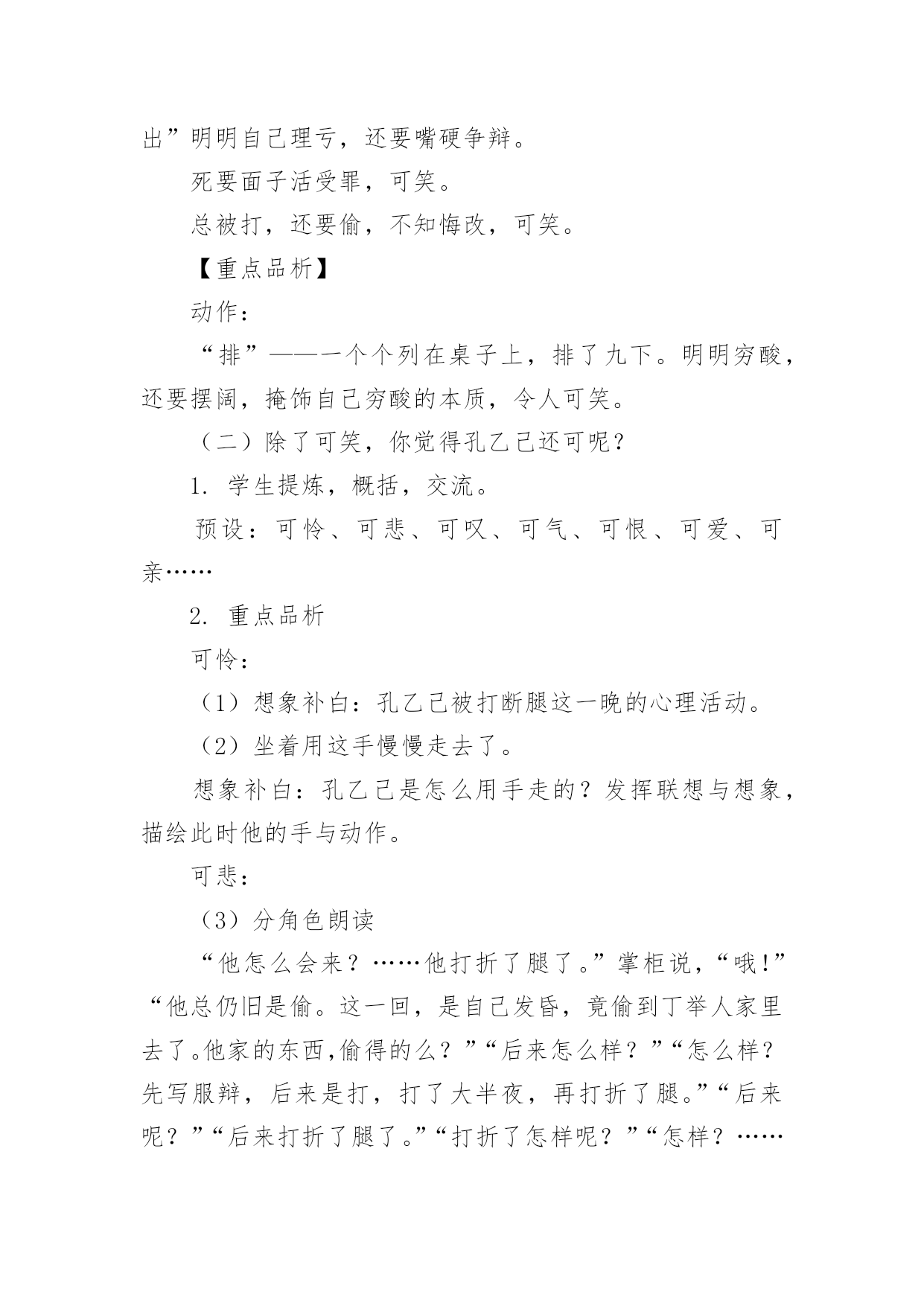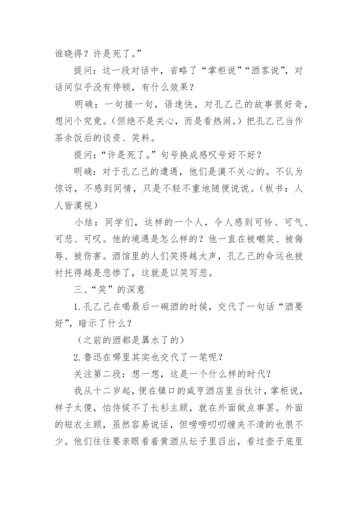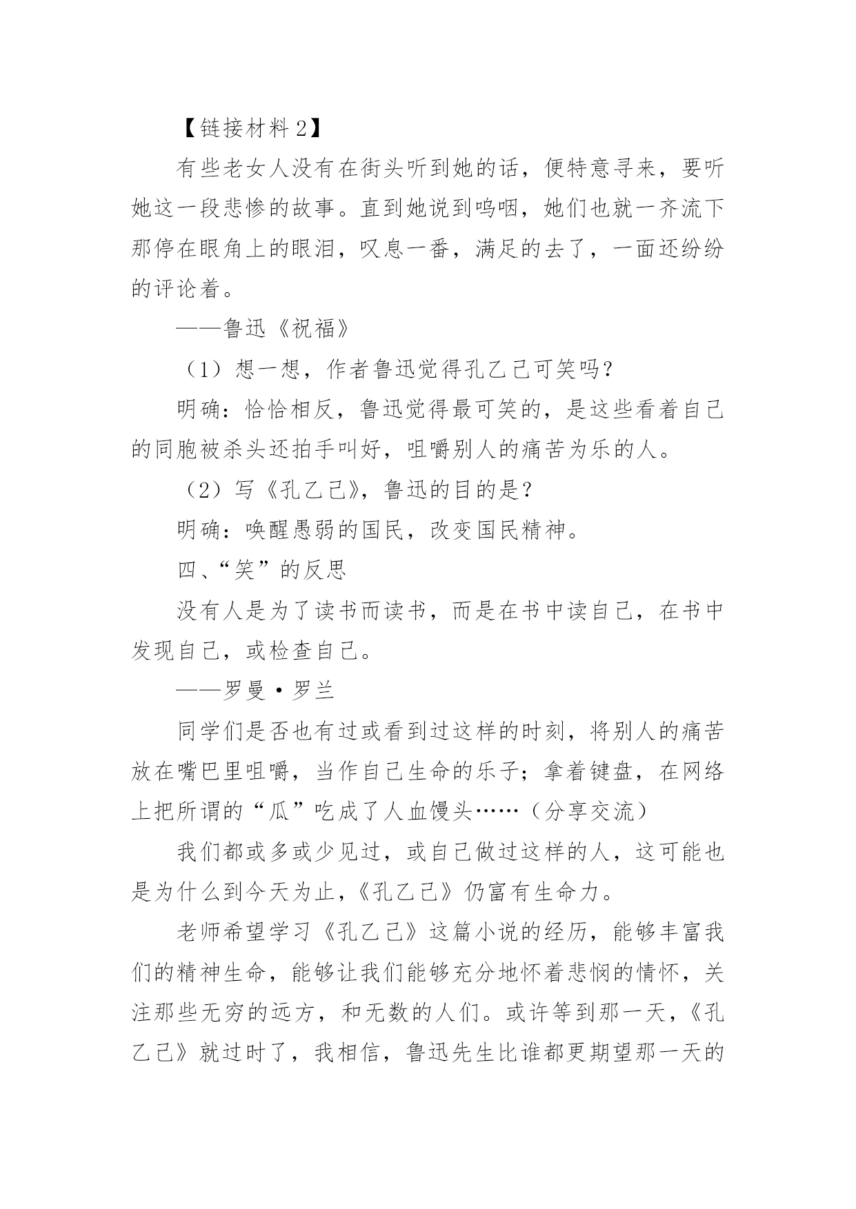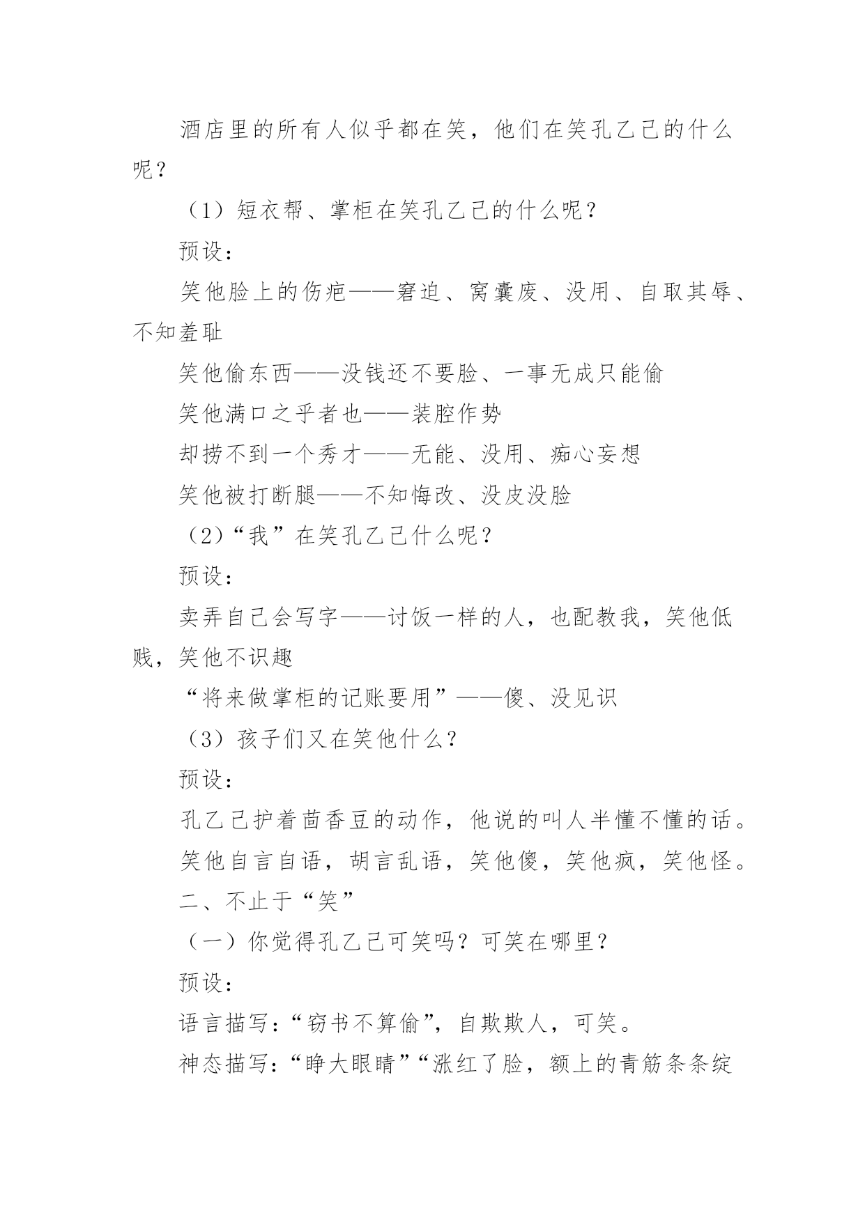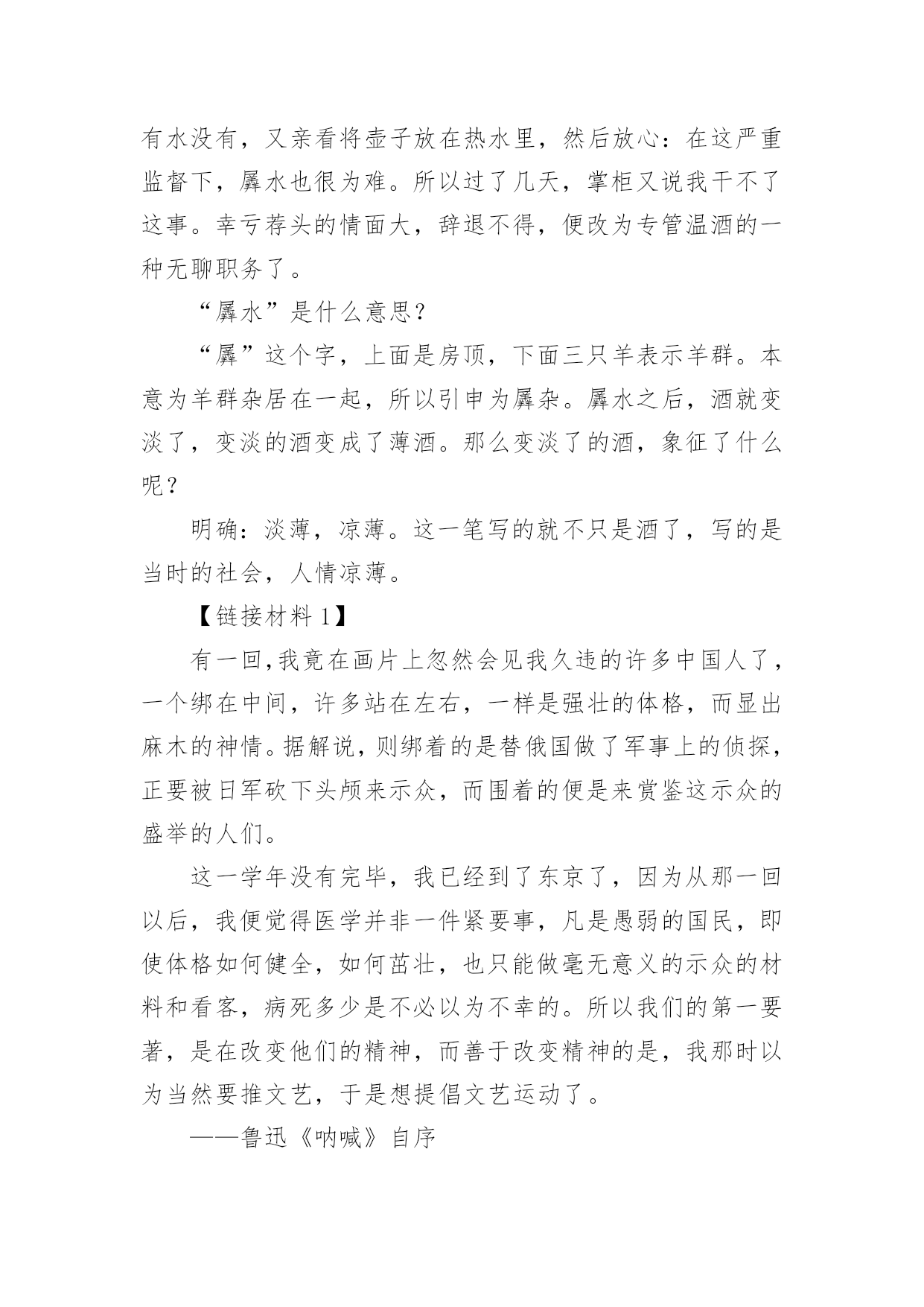 《孔乙己》教学设计作为一名老师,时常需要用到教学设计,教学设计是一个系统化规划教学系统的过程。我们该怎么去写教学设计呢?下面是小编整理的《孔乙己》教学设计,希望能够帮助到大家。【目标】1、以“笑”为线索,梳理相关事件。2、关注文中的人物描写,理解孔乙己形象的复杂性和丰富性。3、了解以笑写悲的写法,提会作者的深意,探究小说主旨。【教学过程】一、孔乙己与“笑”课后思考探究第二题:小说多次写到人们的“笑”,找一找,文中出现了几次“笑”字?14次。这些“笑”包括了哪四个场景?分别用一句话概括。1.孔乙己平日里被短衣帮笑2.孔乙己教“我”写字被笑3.孔乙己分豆给孩子们被笑4.孔乙己最后一次喝酒被笑这些笑声来自短衣帮、掌柜、“我”和孩子们。酒店里的所有人似乎都在笑,他们在笑孔乙己的什么呢?(1)短衣帮、掌柜在笑孔乙己的什么呢?预设:笑他脸上的伤疤——窘迫、窝囊废、没用、自取其辱、不知羞耻笑他偷东西——没钱还不要脸、一事无成只能偷笑他满口之乎者也——装腔作势却捞不到一个秀才——无能、没用、痴心妄想笑他被打断腿——不知悔改、没皮没脸(2)“我”在笑孔乙己什么呢?预设:卖弄自己会写字——讨饭一样的人,也配教我,笑他低贱,笑他不识趣“将来做掌柜的记账要用”——傻、没见识(3)孩子们又在笑他什么?预设:孔乙己护着茴香豆的动作,他说的叫人半懂不懂的话。笑他自言自语,胡言乱语,笑他傻,笑他疯,笑他怪。二、不止于“笑”(一)你觉得孔乙己可笑吗?可笑在哪里?预设:语言描写:“窃书不算偷”,自欺欺人,可笑。神态描写:“睁大眼睛”“涨红了脸,额上的青筋条条绽出”明明自己理亏,还要嘴硬争辩。死要面子活受罪,可笑。总被打,还要偷,不知悔改,可笑。【重点品析】动作:“排”——一个个列在桌子上,排了九下。明明穷酸,还要摆阔,掩饰自己穷酸的本质,令人可笑。(二)除了可笑,你觉得孔乙己还可呢?1.学生提炼,概括,交流。预设:可怜、可悲、可叹、可气、可恨、可爱、可亲……2.重点品析可怜:(1)想象补白:孔乙己被打断腿这一晚的心理活动。(2)坐着用这手慢慢走去了。想象补白:孔乙己是怎么用手走的?发挥联想与想象,描绘此时他的手与动作。可悲:(3)分角色朗读“他怎么会来?……他打折了腿了。”掌柜说,“哦!”“他总仍旧是偷。这一回,是自己发昏,竟偷到丁举人家里去了。他家的东西,偷得的么?”“后来怎么样?”“怎么样?先写服辩,后来是打,打了大半夜,再打折了腿。”“后来呢?”“后来打折了腿了。”“打折了怎样呢?”“怎样?……谁晓得?许是死了。”提问:这一段对话中,省略了“掌柜说”“酒客说”,对话间似乎没有停顿,有什么效果?明确:一句接一句,语速快,对孔乙己的故事很好奇,想问个究竟。(但绝不是关心,而是看热闹。)把孔乙己当作茶余饭后的谈资、笑料。提问:“许是死了。”句号换成感叹号好不好?明确:对于孔乙己的遭遇,他们是漠不关心的。不认为惊讶,不感到同情,只是不轻不重地随便说说。(板书:人人皆漠视)小结:同学们,这样的一个人,令人感到可怜、可气、可悲、可叹。他的境遇是怎么样的?他一直在被嘲笑、被侮辱、被伤害。酒馆里的人们笑得越大声,孔乙己的命运也被衬托得越是悲惨了,这就是以笑写悲。三、“笑”的深意1.孔乙己在喝最后一碗酒的时候,交代了一句话“酒要好”,暗示了什么?(之前的酒都是羼水了的)2.鲁迅在哪里其实也交代了一笔呢?关注第二段:想一想,这是一个什么样的时代?我从十二岁起,便在镇口的咸亨酒店里当伙计,掌柜说,样子太傻,怕侍候不了长衫主顾,就在外面做点事罢。外面的短衣主顾,虽然容易说话,但唠唠叨叨缠夹不清的也很不少。他们往往要亲眼看着黄酒从坛子里舀出,看过壶子底里有水没有,又亲看将壶子放在热水里,然后放心:在这严重监督下,羼水也很为难。所以过了几天,掌柜又说我干不了这事。幸亏荐头的情面大,辞退不得,便改为专管温酒的一种无聊职务了。“羼水”是什么意思?“羼”这个字,上面是房顶,下面三只羊表示羊群。本意为羊群杂居在一起,所以引申为羼杂。羼水之后,酒就变淡了,变淡的酒变成了薄酒。那么变淡了的酒,象征了什么呢?明确:淡薄,凉薄。这一笔写的就不只是酒了,写的是当时的社会,人情凉薄。【链接材料1】有一回,我竟在画片上忽然会见我久违的许多中国人了,一个绑在中间,许多站在左右,一样是强壮的体格,而显出麻木的神情。据解说,则绑着的是替俄国做了军事上的侦探,正要被日军砍下头颅来示众,而围着的便是来赏鉴这示众的盛举的人们。这一学年没有完毕,我已经到了东京了,因为从那一回以后,我便觉得医学并非一件紧要事,凡是愚弱的国民,即使体格如何健全,如何茁壮,也只能做毫无意义的示众的材料和看客,病死多少是不必以为不幸的。所以我们的第一要著,是在改变他们的精神,而善于改变精神的是,我那时以为当然要推文艺,于是想提倡文艺运动了
