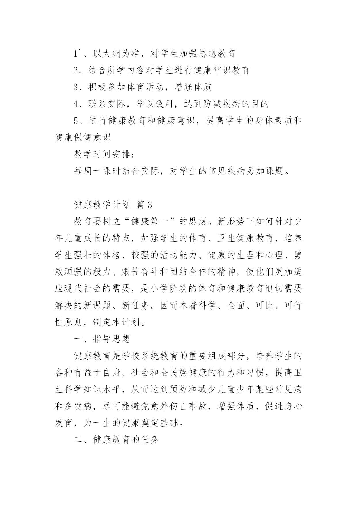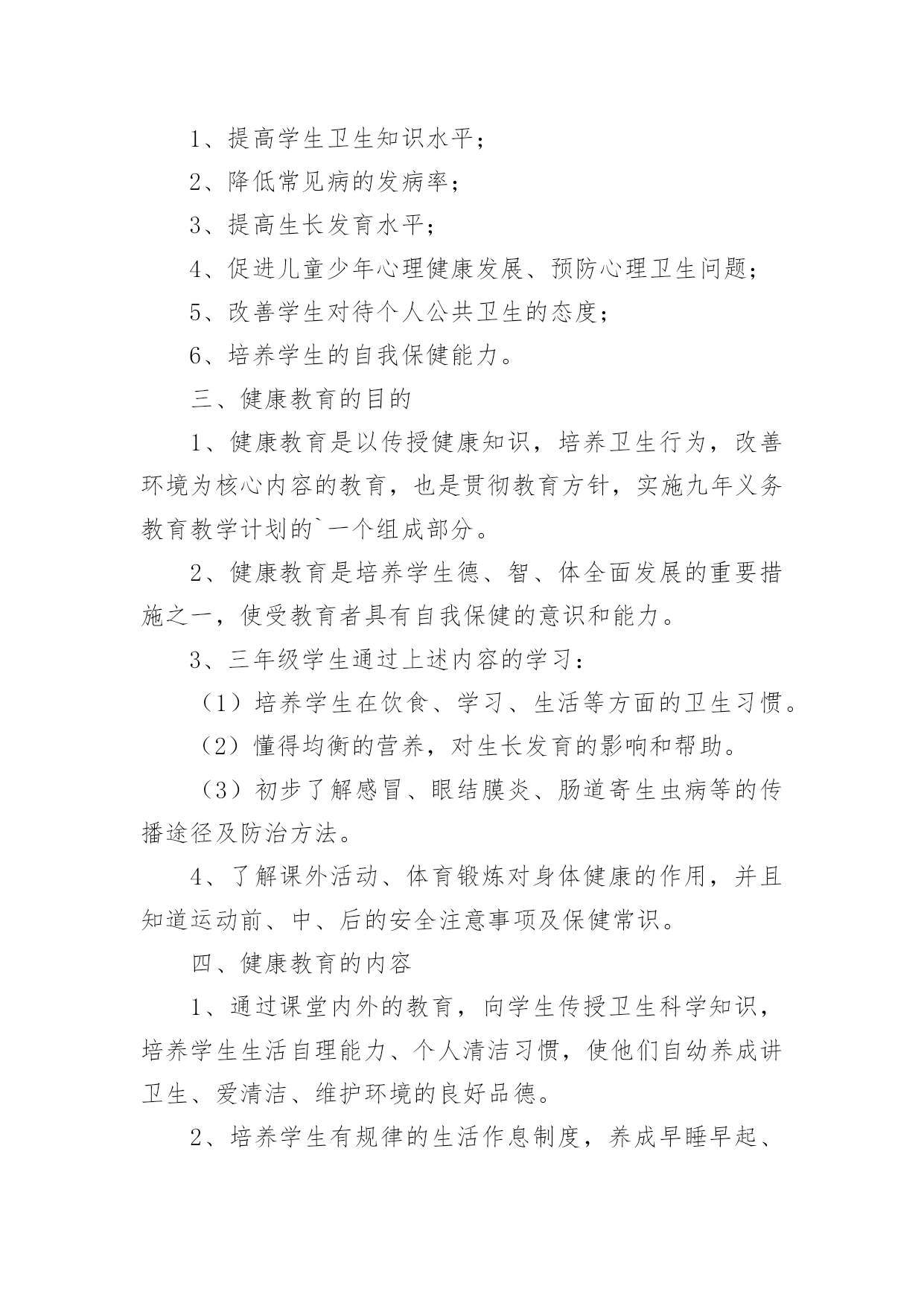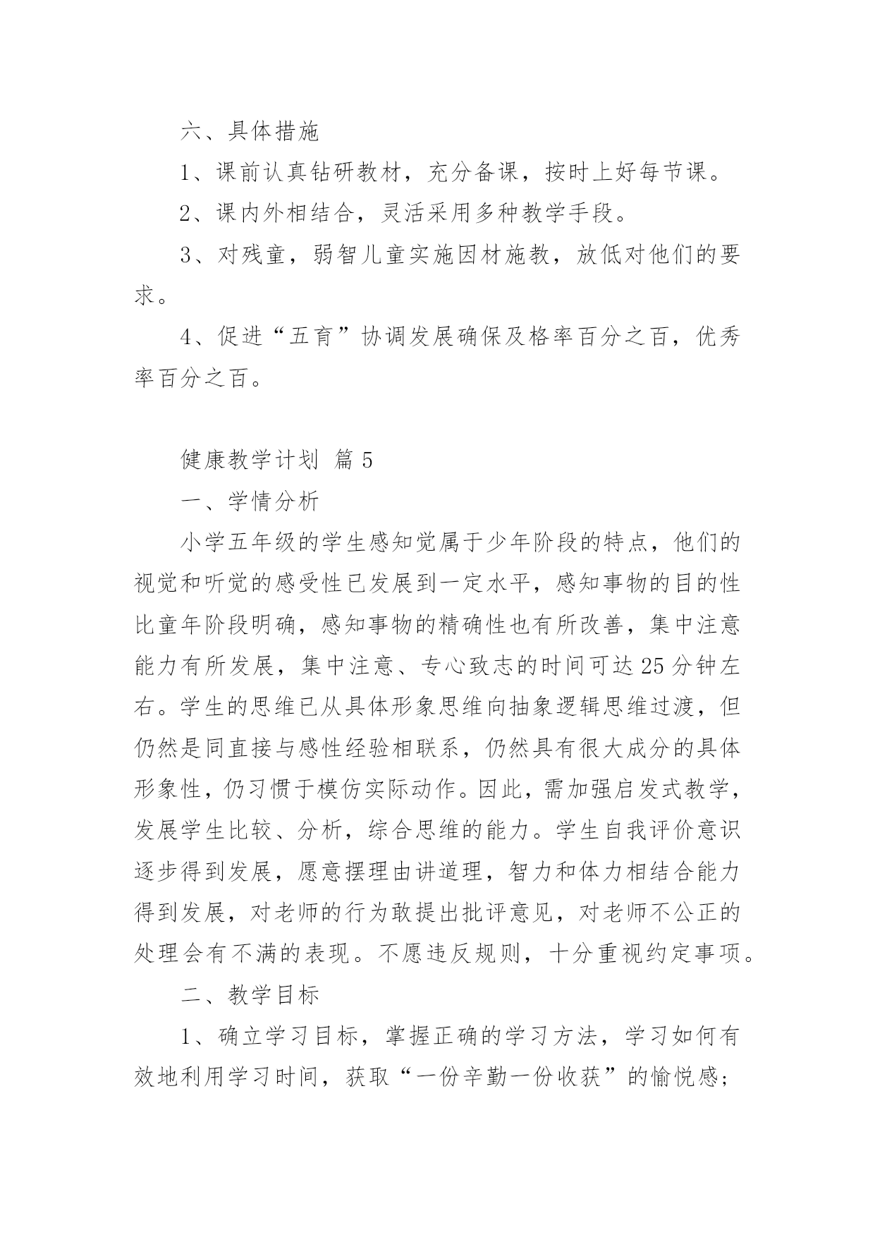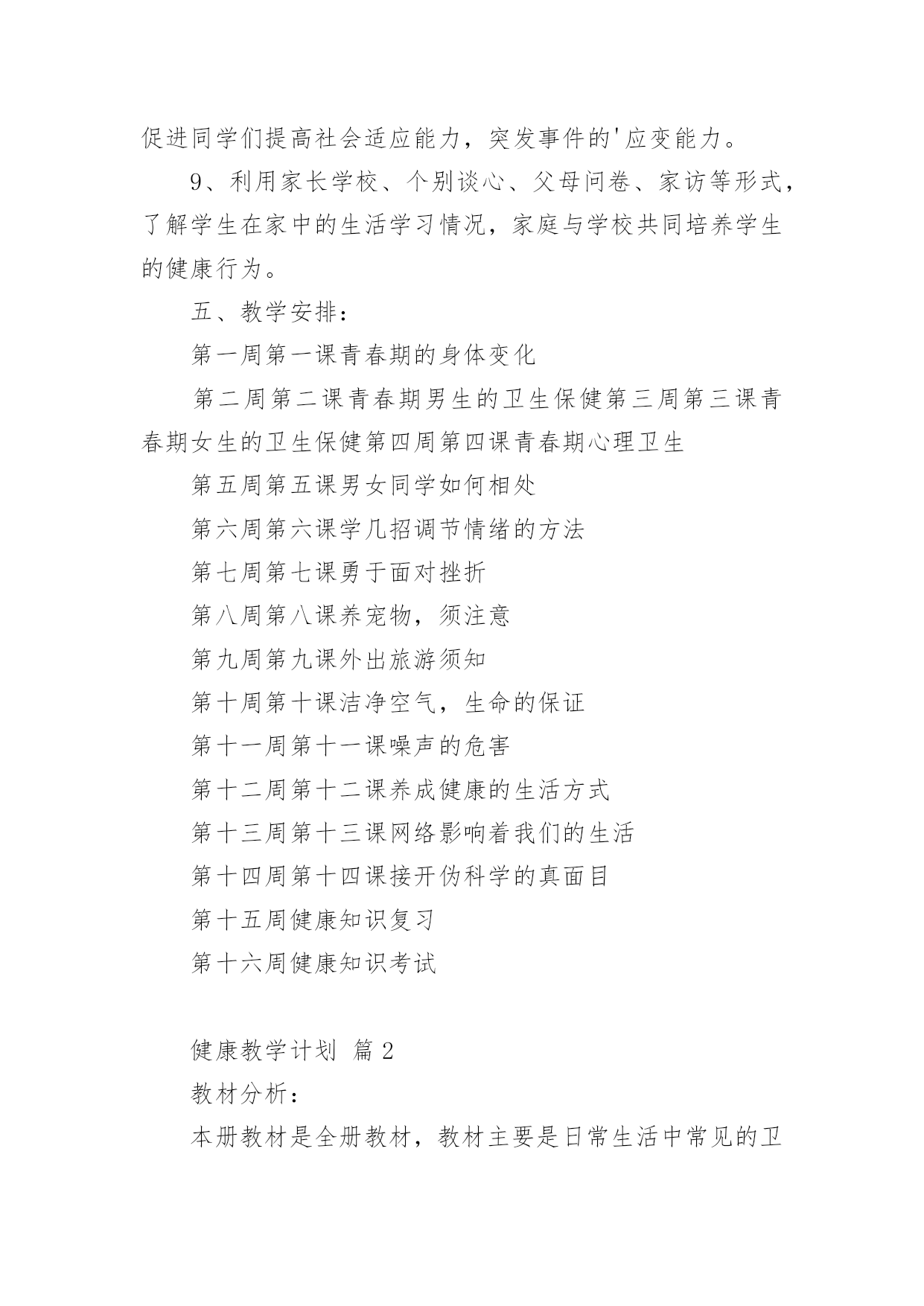 健康教学计划时间过得真快,总在不经意间流逝,又将迎来新的工作,新的挑战,来为今后的学习制定一份计划。想学习拟定计划却不知道该请教谁?下面是小编整理的健康教学计划,仅供参考,希望能够帮助到大家。健康教学计划篇1一、指导思想:健康教育是学校系统教育的重要组成部分,培养学生的各种有益于自身、社会和全民族健康的行为和习惯,提高卫生科学知识水平,从而达到预防和减少儿童少年某些常见病和多发病,尽可能避免意外伤亡事故,增强体质,促进身心发育,为一生的健康奠定基础,二、教学目标:1、提高学生卫生知识水平;2、降低学校常见病的发病率;3、提高生长发育水平;4、促进儿童少年心理健康发展、预防心理卫生问题;5、改善学生对待个人公共卫生的态度;三、教学重难点:1、促进学生身心健康发展,保证学生们具有旺盛的精力、愉快的心情投入学习,养成良好的卫生习惯。积极参加体育锻炼,增强体质。2、培养学生正确的饮食和卫生习惯。注意饮食卫生,吃好早餐,一日三餐,定时定量,不偏食,让学生知道暴饮暴食的危害。四、教学内容:1、使学生理解健康的概念,培养健康的意识行为,懂得预防食物中毒的方法;2、让学生了解适时、适体的穿着有益健康,引导学生培养朴素、大方、适时的穿着风格;3、使学生认识吸毒的危害,教育青少年千万不要因好奇去尝试吸毒。4、让学生了解心理健康的概念和心理健康的标准使自己逐步具备良好的社会适应能力。正确看待自己身上的生理和心理变化,培养独立思考能力,善于听取别人的意见,控制自己的情绪,多参与集体活动,培养良好的兴趣,并懂得如何自我保护;5、了解市容环境卫生不仅影响天津市的形象,而且影响全市人民的健康,懂得爱护环境卫生从我做起。6、教学中运用多种教学手段,因材施教,如录像、投影、挂图、表演等激发学生的学习兴趣,指导学生进行实际操作训练,巩固教学效果,促进能力的培养。7、通过各种形式进行健康知识、卫生常识的宣传,为学生创造一个优美健康的生活环境。利用各种检查、竞赛促使学生行为习惯的形成。8、联系实际结合课本内容对学生进行心理健康教育,促进同学们提高社会适应能力,突发事件的'应变能力。9、利用家长学校、个别谈心、父母问卷、家访等形式,了解学生在家中的生活学习情况,家庭与学校共同培养学生的健康行为。五、教学安排:第一周第一课青春期的身体变化第二周第二课青春期男生的卫生保健第三周第三课青春期女生的卫生保健第四周第四课青春期心理卫生第五周第五课男女同学如何相处第六周第六课学几招调节情绪的方法第七周第七课勇于面对挫折第八周第八课养宠物,须注意第九周第九课外出旅游须知第十周第十课洁净空气,生命的保证第十一周第十一课噪声的危害第十二周第十二课养成健康的生活方式第十三周第十三课网络影响着我们的生活第十四周第十四课接开伪科学的真面目第十五周健康知识复习第十六周健康知识考试健康教学计划篇2教材分析:本册教材是全册教材,教材主要是日常生活中常见的卫生知识,教育学生注重卫生,增强学生自身保健的知识,保证学生的身心健康,增强学生的体质,防止和减少疾病的发生。学情分析:基本情况:(1)学生合计108人,其中男56人女53人。(2)、学生基本了解了些自我保健的常识和一些常见疾病的预防,学习和一些极性较高能做到自身保健加强自身的'身心健康。教学目标:1,学习日常生活中的常见的卫生常识,保证学习的身心健康。2,指导学生正确的做好自身健康的活动,增强学生自身健康的意识。3,教育学生作一些力所能及的活动,增强自身的体质。4,教育学生注意饮食卫生、防止消化系统的疾病发生5,教育学生养好正确的坐姿习惯,防止近视眼的发生6,培养学生良好的卫生习惯,增强学生的自身保健意识本学期教学重点:1,学习常见的卫生常识,保证学生的身心健康。2,学习健康知识,加强学生自身身心健康的目的3,教育学生注意个人卫生,养好良好的卫生习惯,防治疾病的发生4,对学生进行健康教育,增强健康意识,提高学生自身和身体素质和保健意识教学措施:1`、以大纲为准,对学生加强思想教育2、结合所学内容对学生进行健康常识教育3、积极参加体育活动,增强体质4、联系实际,学以致用,达到防减疾病的目的5、进行健康教育和健康意识,提高学生的身体素质和健康保健意识教学时间安排:每周一课时结合实际,对学生的常见疾病另加课题。健康教学计划篇3教育要树立“健康第一”的思想。新形势下如何针对少年儿童成长的特点,加强学生的体育、卫生健康教育,培养学生强壮的体格、较强的活动能力、健康的生理和心理、勇敢顽强的毅力、艰苦奋斗和团结合作的精神,使他们更加适应现代社会的需要,是小学阶段的体育和健康教育迫切需要解决的新课题、新任务。因而本着科学、全面、可比、可行性原则,制定本计划。一、指导思想健康教育是学校系统教育的重要组成部分,培养学生的各种有益于自身、社会和全民族健康的行为和习