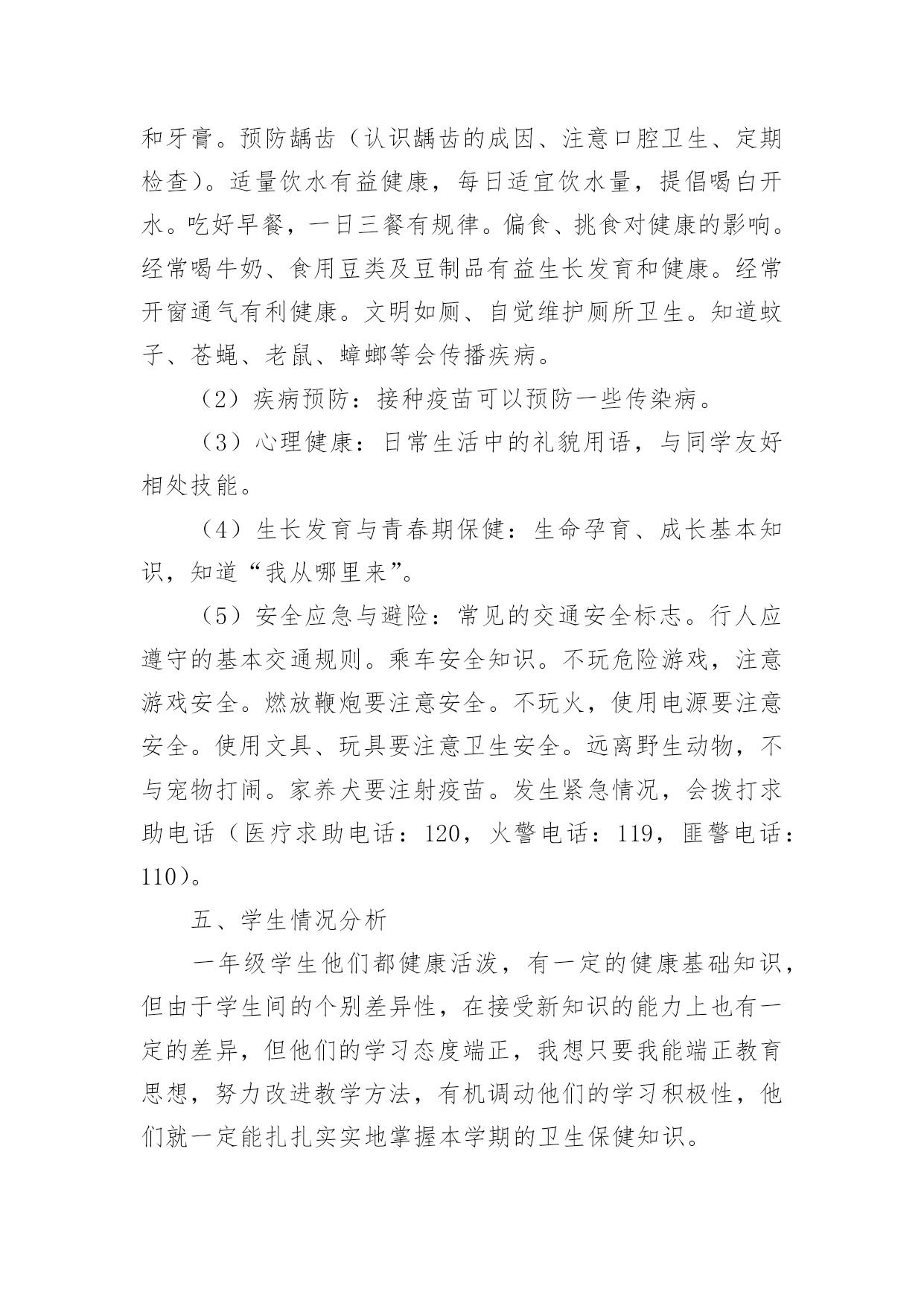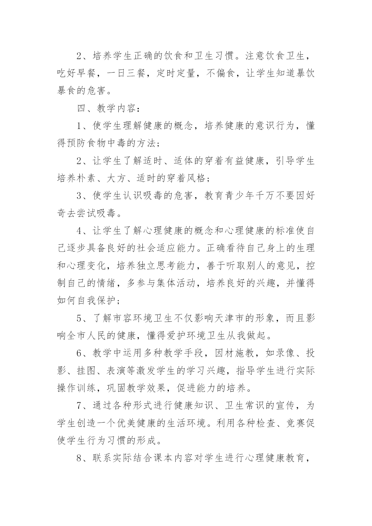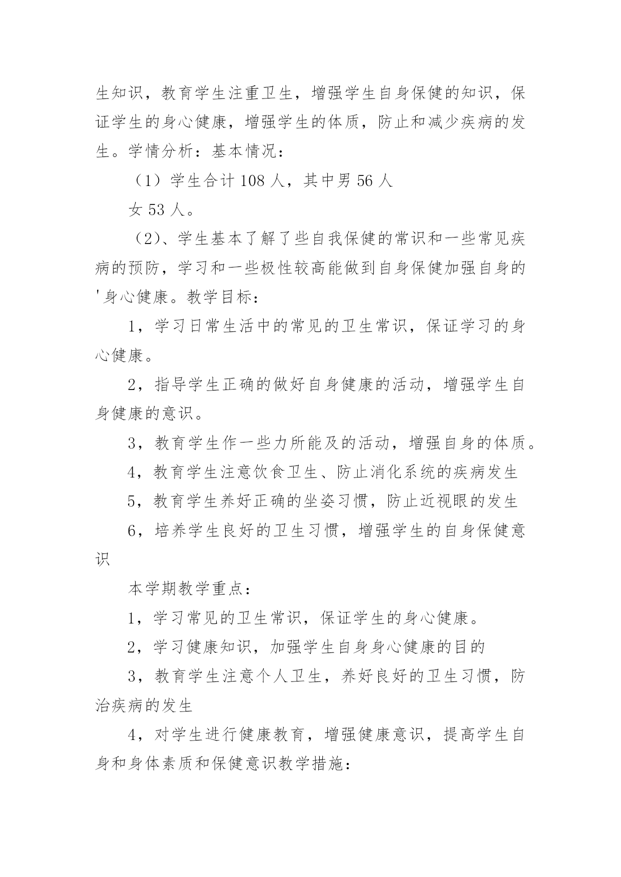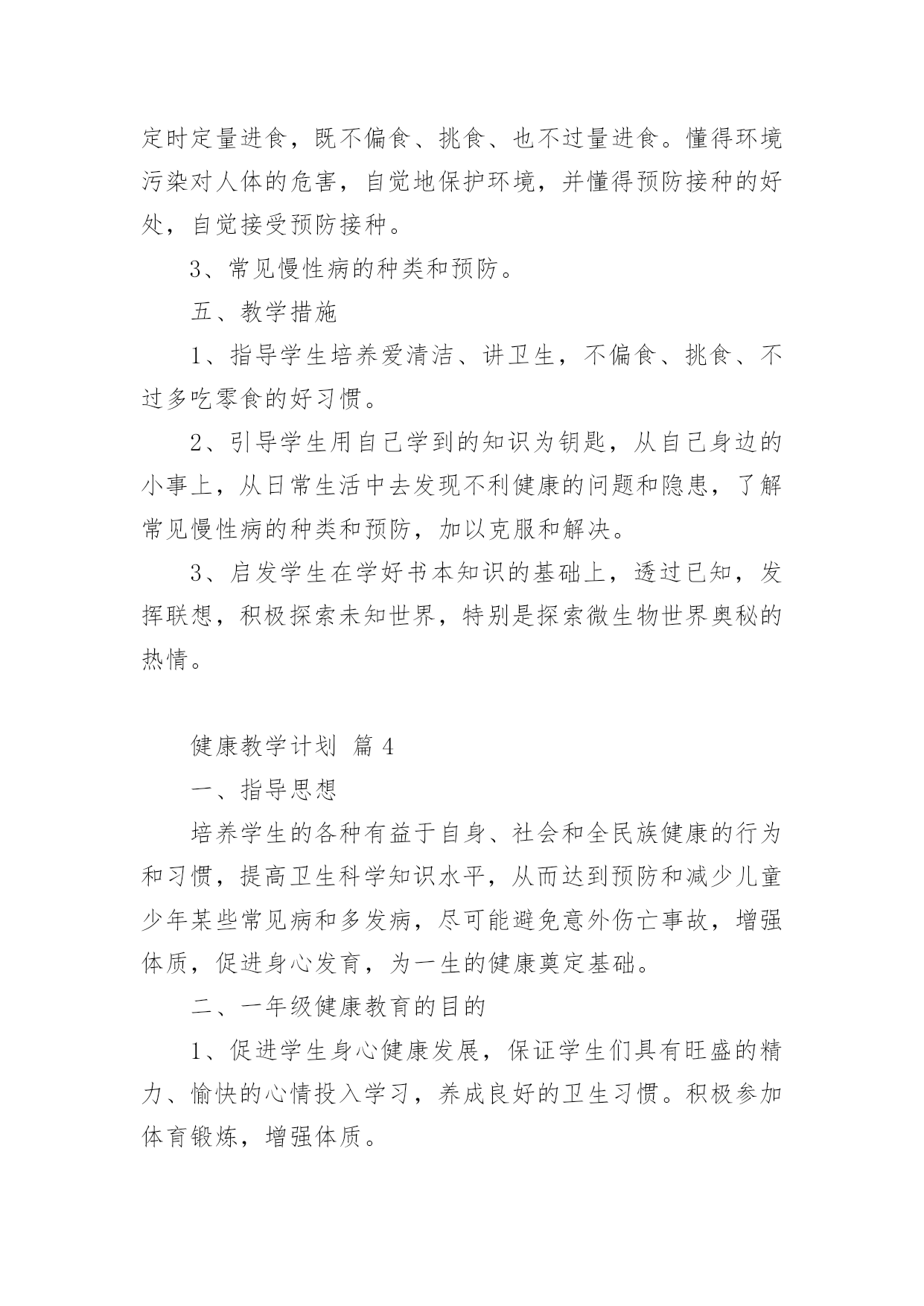 健康教学计划时间过得真快,总在不经意间流逝,又将迎来新的工作,新的挑战,来为今后的学习制定一份计划。想学习拟定计划却不知道该请教谁?下面是小编整理的健康教学计划,仅供参考,希望能够帮助到大家。健康教学计划篇1一、指导思想:健康教育是学校系统教育的重要组成部分,培养学生的各种有益于自身、社会和全民族健康的行为和习惯,提高卫生科学知识水平,从而达到预防和减少儿童少年某些常见病和多发病,尽可能避免意外伤亡事故,增强体质,促进身心发育,为一生的健康奠定基础,二、教学目标:1、提高学生卫生知识水平;2、降低学校常见病的发病率;3、提高生长发育水平;4、促进儿童少年心理健康发展、预防心理卫生问题;5、改善学生对待个人公共卫生的态度;三、教学重难点:1、促进学生身心健康发展,保证学生们具有旺盛的精力、愉快的心情投入学习,养成良好的卫生习惯。积极参加体育锻炼,增强体质。2、培养学生正确的饮食和卫生习惯。注意饮食卫生,吃好早餐,一日三餐,定时定量,不偏食,让学生知道暴饮暴食的危害。四、教学内容:1、使学生理解健康的概念,培养健康的意识行为,懂得预防食物中毒的方法;2、让学生了解适时、适体的穿着有益健康,引导学生培养朴素、大方、适时的穿着风格;3、使学生认识吸毒的危害,教育青少年千万不要因好奇去尝试吸毒。4、让学生了解心理健康的概念和心理健康的标准使自己逐步具备良好的社会适应能力。正确看待自己身上的生理和心理变化,培养独立思考能力,善于听取别人的意见,控制自己的情绪,多参与集体活动,培养良好的兴趣,并懂得如何自我保护;5、了解市容环境卫生不仅影响天津市的形象,而且影响全市人民的健康,懂得爱护环境卫生从我做起。6、教学中运用多种教学手段,因材施教,如录像、投影、挂图、表演等激发学生的学习兴趣,指导学生进行实际操作训练,巩固教学效果,促进能力的培养。7、通过各种形式进行健康知识、卫生常识的宣传,为学生创造一个优美健康的生活环境。利用各种检查、竞赛促使学生行为习惯的形成。8、联系实际结合课本内容对学生进行心理健康教育,促进同学们提高社会适应能力,突发事件的'应变能力。9、利用家长学校、个别谈心、父母问卷、家访等形式,了解学生在家中的生活学习情况,家庭与学校共同培养学生的健康行为。五、教学安排:第一周第一课青春期的身体变化第二周第二课青春期男生的卫生保健第三周第三课青春期女生的卫生保健第四周第四课青春期心理卫生第五周第五课男女同学如何相处第六周第六课学几招调节情绪的方法第七周第七课勇于面对挫折第八周第八课养宠物,须注意第九周第九课外出旅游须知第十周第十课洁净空气,生命的保证第十一周第十一课噪声的危害第十二周第十二课养成健康的生活方式第十三周第十三课网络影响着我们的生活第十四周第十四课接开伪科学的真面目第十五周健康知识复习第十六周健康知识考试健康教学计划篇2教材分析:本册教材是全册教材,教材主要是日常生活中常见的卫生知识,教育学生注重卫生,增强学生自身保健的知识,保证学生的身心健康,增强学生的体质,防止和减少疾病的发生。学情分析:基本情况:(1)学生合计108人,其中男56人女53人。(2)、学生基本了解了些自我保健的常识和一些常见疾病的预防,学习和一些极性较高能做到自身保健加强自身的'身心健康。教学目标:1,学习日常生活中的常见的卫生常识,保证学习的身心健康。2,指导学生正确的做好自身健康的活动,增强学生自身健康的意识。3,教育学生作一些力所能及的活动,增强自身的体质。4,教育学生注意饮食卫生、防止消化系统的疾病发生5,教育学生养好正确的坐姿习惯,防止近视眼的发生6,培养学生良好的卫生习惯,增强学生的自身保健意识本学期教学重点:1,学习常见的卫生常识,保证学生的身心健康。2,学习健康知识,加强学生自身身心健康的目的3,教育学生注意个人卫生,养好良好的卫生习惯,防治疾病的发生4,对学生进行健康教育,增强健康意识,提高学生自身和身体素质和保健意识教学措施:1`、以大纲为准,对学生加强思想教育2、结合所学内容对学生进行健康常识教育3、积极参加体育活动,增强体质4、联系实际,学以致用,达到防减疾病的目的5、进行健康教育和健康意识,提高学生的身体素质和健康保健意识教学时间安排:每周一课时结合实际,对学生的常见疾病另加课题。健康教学计划篇3教育要树立“健康第一”的思想。新形势下如何针对少年儿童成长的特点,加强学生的体育、卫生健康教育,培养学生强壮的体格、较强的活动能力、健康的生理和心理、勇敢顽强的毅力、艰苦奋斗和团结合作的精神,使他们更加适应现代社会的需要,是小学阶段的体育和健康教育迫切需要解决的新课题、新任务。因而本着科学、全面、可比、可行性原则,制定本计划。一、指导思想健康教育是学校系统教育的重要组成部分,培养学生的各种有益于自身、社会和全民族健康的行为和习
