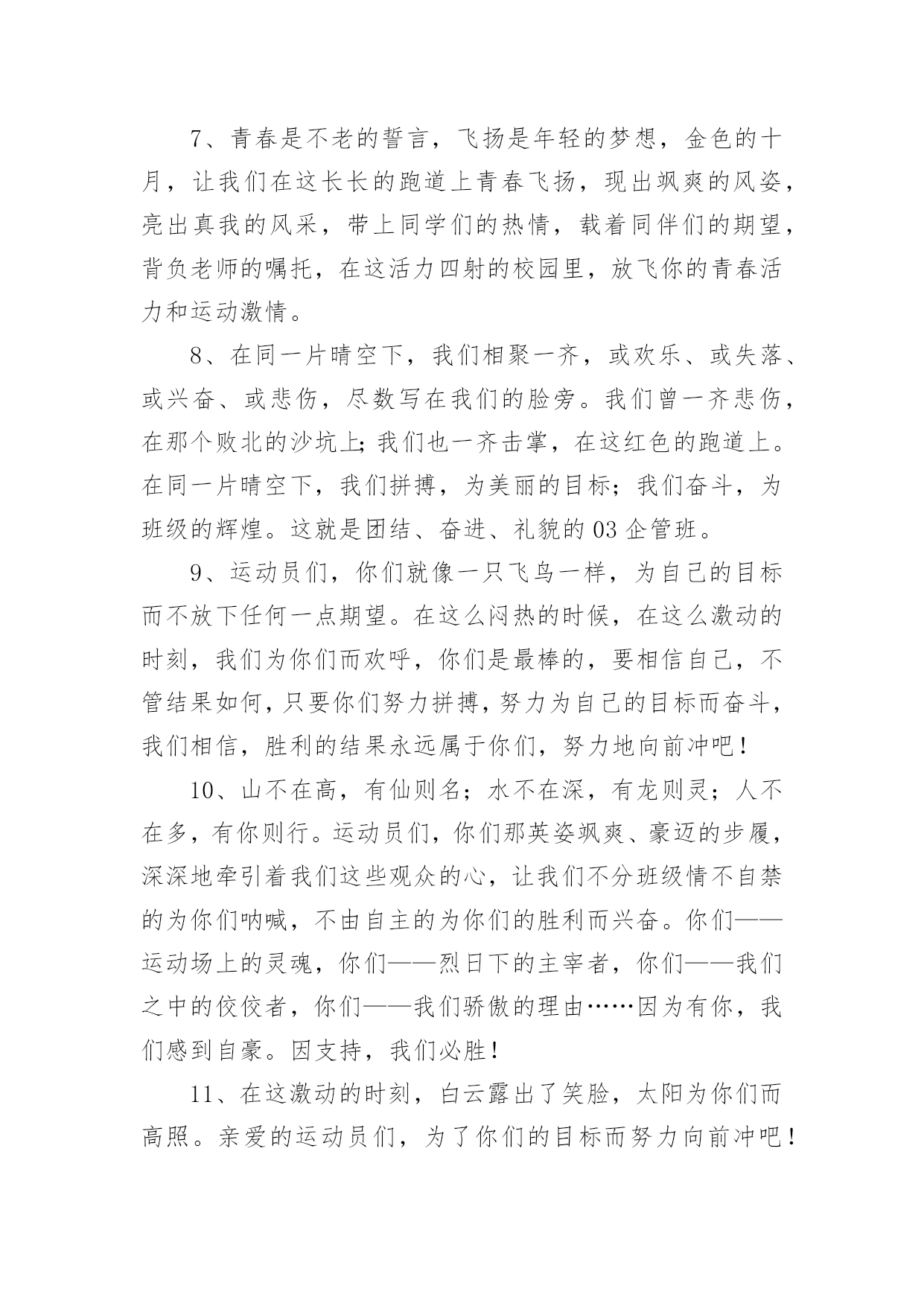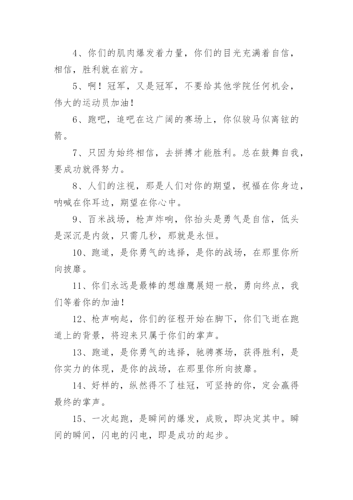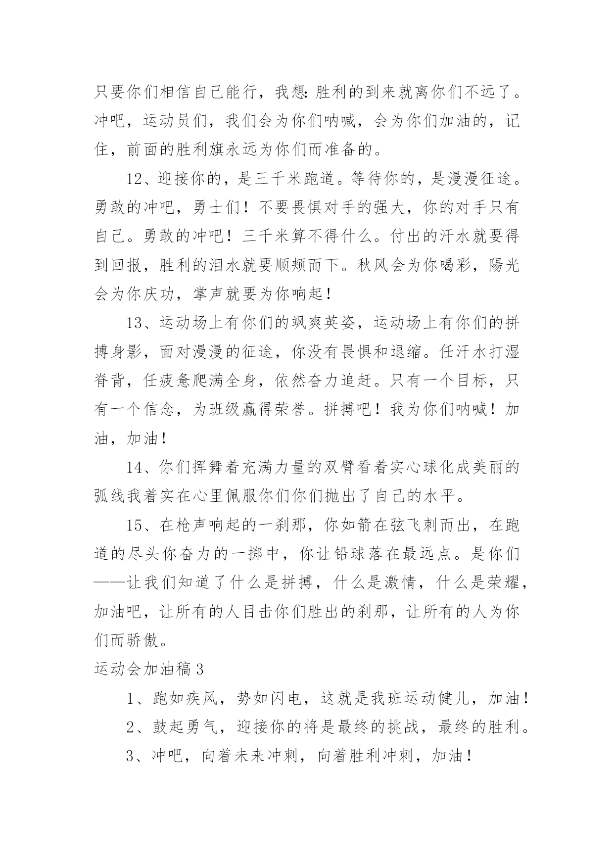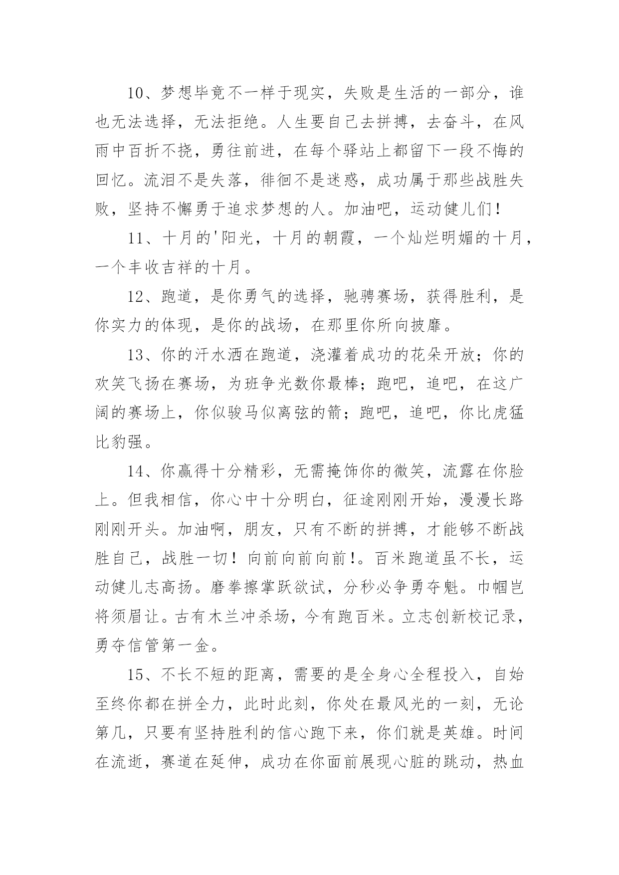 运动会加油稿运动会加油稿15篇[经典]在发展不断提速的社会中,越来越多人会去使用加油稿,加油稿有着正向的鼓动作用。相信许多人会觉得加油稿很难写吧,下面是小编为大家收集的运动会加油稿,希望对大家有所帮助。运动会加油稿1汗水,泪水;笑声,歌声;我们尽情挥洒。开幕式上,运动场上,我们尽情展现,多少艰辛,多少困苦,我们勇敢承担。因为年轻,因为张扬,因为我们知道:用今天的汗水换来明天的微笑。运动会加油稿21、一根小小的木棒,连接的是团结和友爱一根小小的木棒,传递的是勇气和力量一根小小的木棒,演绎的是奋斗和拼搏加油吧!让这激动人心的时刻,一直回荡在我们心中!2、踏上跑道,是一种选择。离开起点,是一种勇气。驰骋赛场,是一种胜利。3、温暖的阳光洒在赛场上,男子乙组标枪的比赛即将开始。赛场上,一道道优美的弧线将轻盈地划过天空。健儿们用手中的标枪向距离的权限发起一轮又一轮的挑战。标枪在空中轻盈的姿态,是健儿们强健的力量和熟练的技巧的结合。谁能在这场激烈的竞争中获胜?让我们拭目以待,让我们为他们呐喊、助威吧!只有将力量与技巧合二为一的人,才能获得胜利的'桂冠!4、你的汗水洒在跑道,浇灌着成功的花朵开放。你的欢笑飞扬在赛场,为班争光数你最棒。跑吧,追吧!在这广阔的赛场上,你似骏马似离铉的箭。跑吧,追吧!你比虎猛比豹强。5、“沙场秋点兵”的壮阔,想必给了我们难以言喻的激情。于是,我放下手中的笔,去感受脉搏与心跳的激烈。在期盼中,在意料中,是悲是喜,是欢是狂,都未可知,但可知的是我们拥有这样一场运动盛会。6、奥林匹克精神佳,运动健将拼搏强。在运动场上的运动健儿们,发挥你们的特长,展示你们的风采,让你们的身影在运动场上留下优美的风景线,让你们的雄心壮志在运动场上发挥的淋漓尽致。7、青春是不老的誓言,飞扬是年轻的梦想,金色的十月,让我们在这长长的跑道上青春飞扬,现出飒爽的风姿,亮出真我的风采,带上同学们的热情,载着同伴们的期望,背负老师的嘱托,在这活力四射的校园里,放飞你的青春活力和运动激情。8、在同一片晴空下,我们相聚一齐,或欢乐、或失落、或兴奋、或悲伤,尽数写在我们的脸旁。我们曾一齐悲伤,在那个败北的沙坑上;我们也一齐击掌,在这红色的跑道上。在同一片晴空下,我们拼搏,为美丽的目标;我们奋斗,为班级的辉煌。这就是团结、奋进、礼貌的03企管班。9、运动员们,你们就像一只飞鸟一样,为自己的目标而不放下任何一点期望。在这么闷热的时候,在这么激动的时刻,我们为你们而欢呼,你们是最棒的,要相信自己,不管结果如何,只要你们努力拼搏,努力为自己的目标而奋斗,我们相信,胜利的结果永远属于你们,努力地向前冲吧!10、山不在高,有仙则名;水不在深,有龙则灵;人不在多,有你则行。运动员们,你们那英姿飒爽、豪迈的步履,深深地牵引着我们这些观众的心,让我们不分班级情不自禁的为你们呐喊,不由自主的为你们的胜利而兴奋。你们——运动场上的灵魂,你们——烈日下的主宰者,你们——我们之中的佼佼者,你们——我们骄傲的理由……因为有你,我们感到自豪。因支持,我们必胜!11、在这激动的时刻,白云露出了笑脸,太阳为你们而高照。亲爱的运动员们,为了你们的目标而努力向前冲吧!只要你们相信自己能行,我想:胜利的到来就离你们不远了。冲吧,运动员们,我们会为你们呐喊,会为你们加油的,记住,前面的胜利旗永远为你们而准备的。12、迎接你的,是三千米跑道。等待你的,是漫漫征途。勇敢的冲吧,勇士们!不要畏惧对手的强大,你的对手只有自己。勇敢的冲吧!三千米算不得什么。付出的汗水就要得到回报,胜利的泪水就要顺颊而下。秋风会为你喝彩,陽光会为你庆功,掌声就要为你响起!13、运动场上有你们的飒爽英姿,运动场上有你们的拼搏身影,面对漫漫的征途,你没有畏惧和退缩。任汗水打湿脊背,任疲惫爬满全身,依然奋力追赶。只有一个目标,只有一个信念,为班级赢得荣誉。拼搏吧!我为你们呐喊!加油,加油!14、你们挥舞着充满力量的双臂看着实心球化成美丽的弧线我着实在心里佩服你们你们抛出了自己的水平。15、在枪声响起的一刹那,你如箭在弦飞刺而出,在跑道的尽头你奋力的一掷中,你让铅球落在最远点。是你们——让我们知道了什么是拼搏,什么是激情,什么是荣耀,加油吧,让所有的人目击你们胜出的刹那,让所有的人为你们而骄傲。运动会加油稿31、跑如疾风,势如闪电,这就是我班运动健儿,加油!2、鼓起勇气,迎接你的将是最终的挑战,最终的胜利。3、冲吧,向着未来冲刺,向着胜利冲刺,加油!4、你们的肌肉爆发着力量,你们的目光充满着自信,相信,胜利就在前方。5、啊!冠军,又是冠军,不要给其他学院任何机会,伟大的运动员加油!6、跑吧,追吧在这广阔的赛场上,你似骏马似离铉的箭。7、只因为始终相信,去拼搏才能胜利。总在鼓舞自我,要成功就得努力。8、人们的注视,那是人们对你的期望