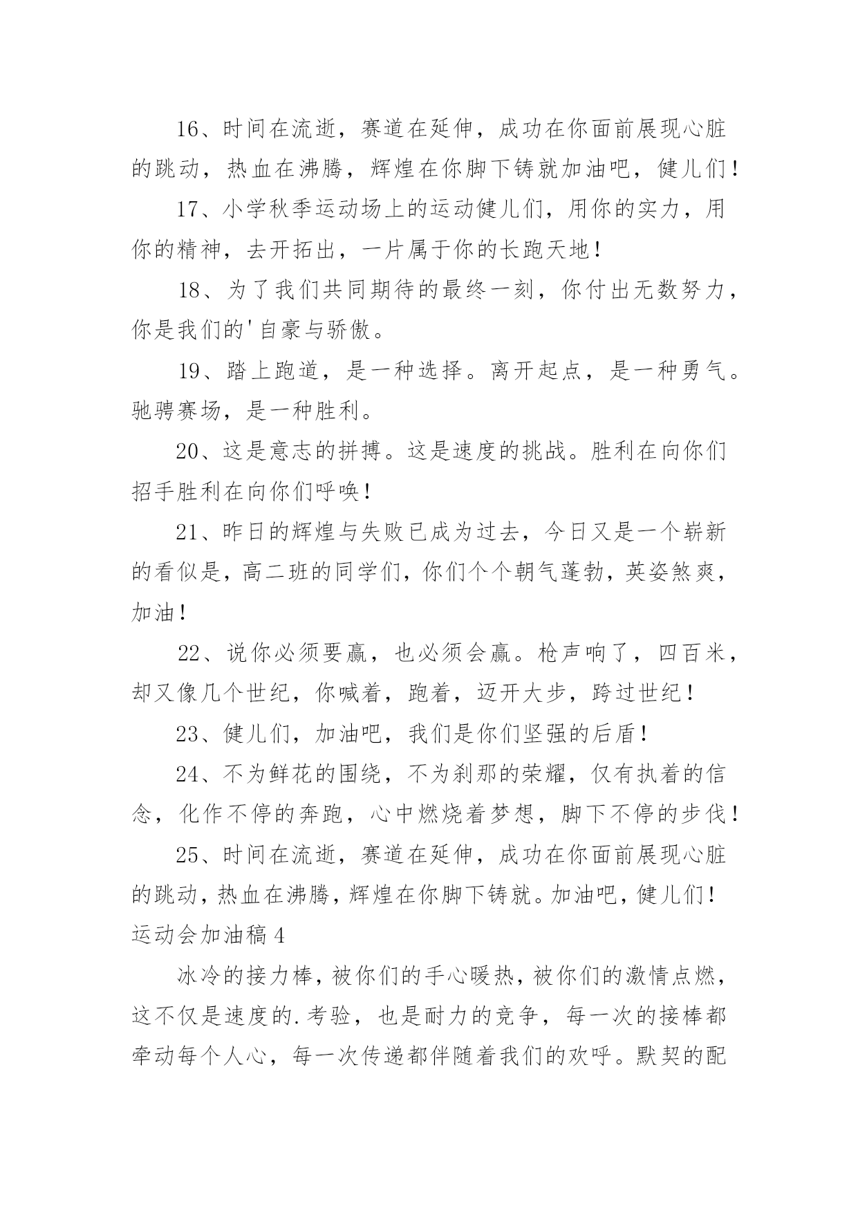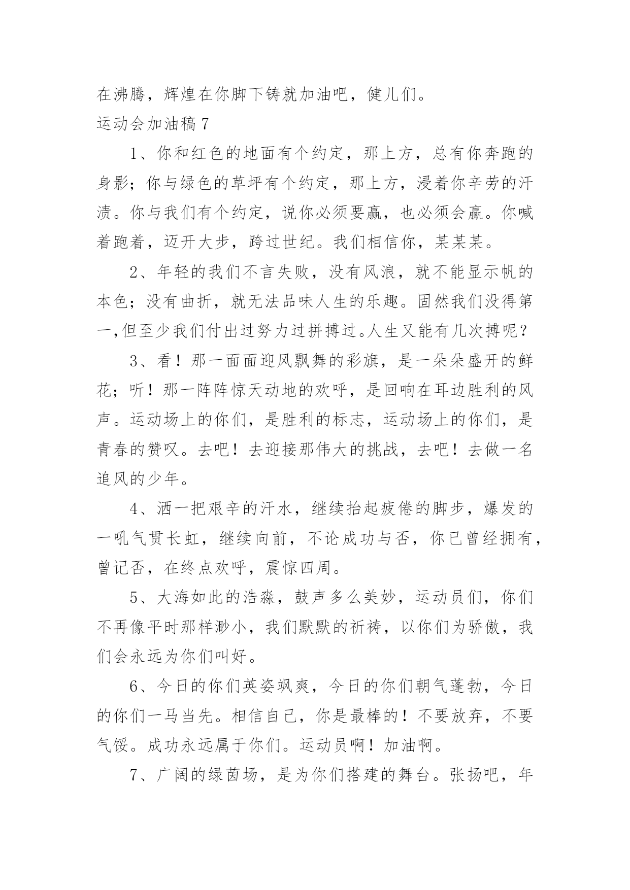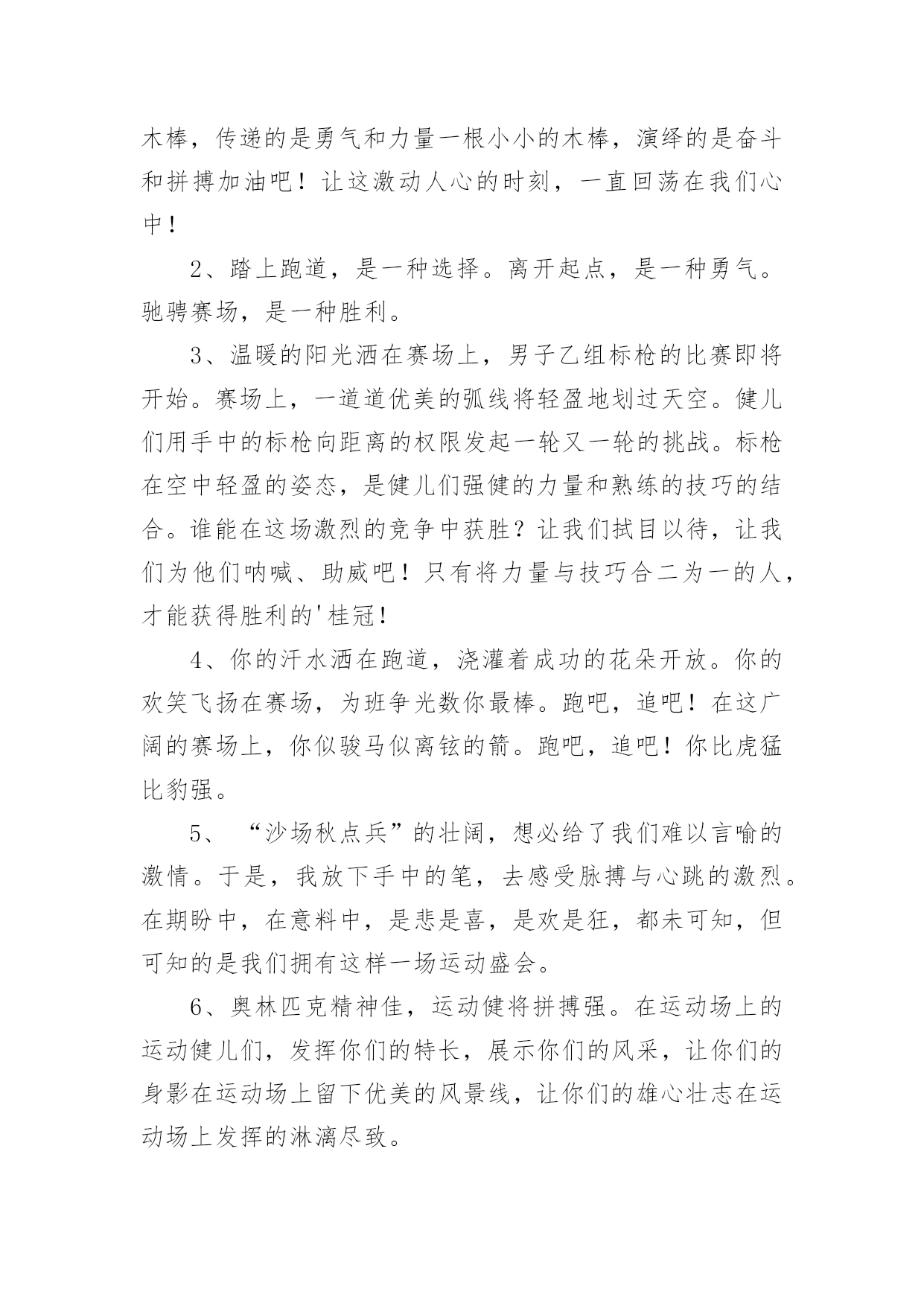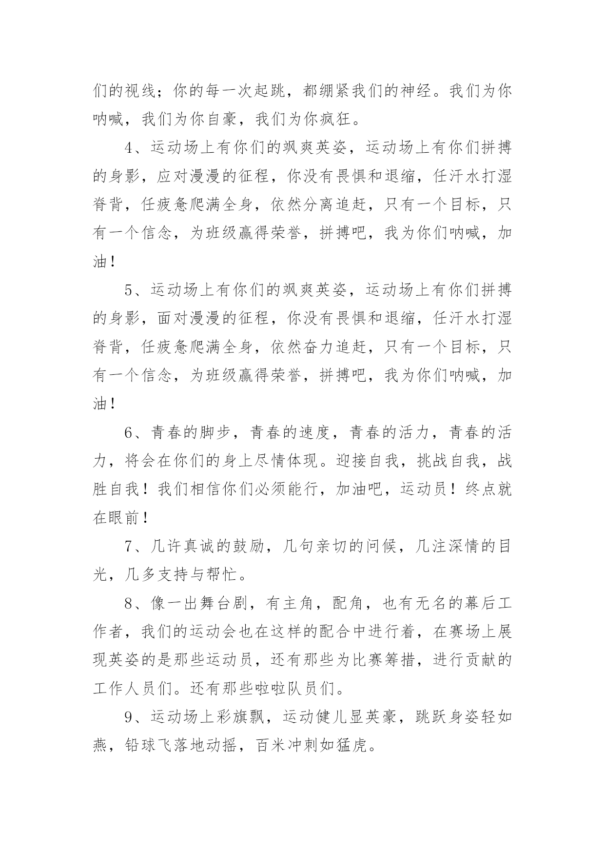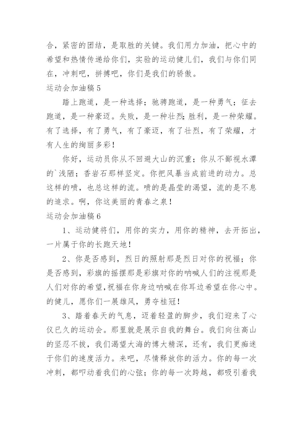 运动会加油稿运动会加油稿15篇[经典]在发展不断提速的社会中,越来越多人会去使用加油稿,加油稿有着正向的鼓动作用。相信许多人会觉得加油稿很难写吧,下面是小编为大家收集的运动会加油稿,希望对大家有所帮助。运动会加油稿1汗水,泪水;笑声,歌声;我们尽情挥洒。开幕式上,运动场上,我们尽情展现,多少艰辛,多少困苦,我们勇敢承担。因为年轻,因为张扬,因为我们知道:用今天的汗水换来明天的微笑。运动会加油稿21、一根小小的木棒,连接的是团结和友爱一根小小的木棒,传递的是勇气和力量一根小小的木棒,演绎的是奋斗和拼搏加油吧!让这激动人心的时刻,一直回荡在我们心中!2、踏上跑道,是一种选择。离开起点,是一种勇气。驰骋赛场,是一种胜利。3、温暖的阳光洒在赛场上,男子乙组标枪的比赛即将开始。赛场上,一道道优美的弧线将轻盈地划过天空。健儿们用手中的标枪向距离的权限发起一轮又一轮的挑战。标枪在空中轻盈的姿态,是健儿们强健的力量和熟练的技巧的结合。谁能在这场激烈的竞争中获胜?让我们拭目以待,让我们为他们呐喊、助威吧!只有将力量与技巧合二为一的人,才能获得胜利的'桂冠!4、你的汗水洒在跑道,浇灌着成功的花朵开放。你的欢笑飞扬在赛场,为班争光数你最棒。跑吧,追吧!在这广阔的赛场上,你似骏马似离铉的箭。跑吧,追吧!你比虎猛比豹强。5、“沙场秋点兵”的壮阔,想必给了我们难以言喻的激情。于是,我放下手中的笔,去感受脉搏与心跳的激烈。在期盼中,在意料中,是悲是喜,是欢是狂,都未可知,但可知的是我们拥有这样一场运动盛会。6、奥林匹克精神佳,运动健将拼搏强。在运动场上的运动健儿们,发挥你们的特长,展示你们的风采,让你们的身影在运动场上留下优美的风景线,让你们的雄心壮志在运动场上发挥的淋漓尽致。7、青春是不老的誓言,飞扬是年轻的梦想,金色的十月,让我们在这长长的跑道上青春飞扬,现出飒爽的风姿,亮出真我的风采,带上同学们的热情,载着同伴们的期望,背负老师的嘱托,在这活力四射的校园里,放飞你的青春活力和运动激情。8、在同一片晴空下,我们相聚一齐,或欢乐、或失落、或兴奋、或悲伤,尽数写在我们的脸旁。我们曾一齐悲伤,在那个败北的沙坑上;我们也一齐击掌,在这红色的跑道上。在同一片晴空下,我们拼搏,为美丽的目标;我们奋斗,为班级的辉煌。这就是团结、奋进、礼貌的03企管班。9、运动员们,你们就像一只飞鸟一样,为自己的目标而不放下任何一点期望。在这么闷热的时候,在这么激动的时刻,我们为你们而欢呼,你们是最棒的,要相信自己,不管结果如何,只要你们努力拼搏,努力为自己的目标而奋斗,我们相信,胜利的结果永远属于你们,努力地向前冲吧!10、山不在高,有仙则名;水不在深,有龙则灵;人不在多,有你则行。运动员们,你们那英姿飒爽、豪迈的步履,深深地牵引着我们这些观众的心,让我们不分班级情不自禁的为你们呐喊,不由自主的为你们的胜利而兴奋。你们——运动场上的灵魂,你们——烈日下的主宰者,你们——我们之中的佼佼者,你们——我们骄傲的理由……因为有你,我们感到自豪。因支持,我们必胜!11、在这激动的时刻,白云露出了笑脸,太阳为你们而高照。亲爱的运动员们,为了你们的目标而努力向前冲吧!只要你们相信自己能行,我想:胜利的到来就离你们不远了。冲吧,运动员们,我们会为你们呐喊,会为你们加油的,记住,前面的胜利旗永远为你们而准备的。12、迎接你的,是三千米跑道。等待你的,是漫漫征途。勇敢的冲吧,勇士们!不要畏惧对手的强大,你的对手只有自己。勇敢的冲吧!三千米算不得什么。付出的汗水就要得到回报,胜利的泪水就要顺颊而下。秋风会为你喝彩,陽光会为你庆功,掌声就要为你响起!13、运动场上有你们的飒爽英姿,运动场上有你们的拼搏身影,面对漫漫的征途,你没有畏惧和退缩。任汗水打湿脊背,任疲惫爬满全身,依然奋力追赶。只有一个目标,只有一个信念,为班级赢得荣誉。拼搏吧!我为你们呐喊!加油,加油!14、你们挥舞着充满力量的双臂看着实心球化成美丽的弧线我着实在心里佩服你们你们抛出了自己的水平。15、在枪声响起的一刹那,你如箭在弦飞刺而出,在跑道的尽头你奋力的一掷中,你让铅球落在最远点。是你们——让我们知道了什么是拼搏,什么是激情,什么是荣耀,加油吧,让所有的人目击你们胜出的刹那,让所有的人为你们而骄傲。运动会加油稿31、跑如疾风,势如闪电,这就是我班运动健儿,加油!2、鼓起勇气,迎接你的将是最终的挑战,最终的胜利。3、冲吧,向着未来冲刺,向着胜利冲刺,加油!4、你们的肌肉爆发着力量,你们的目光充满着自信,相信,胜利就在前方。5、啊!冠军,又是冠军,不要给其他学院任何机会,伟大的运动员加油!6、跑吧,追吧在这广阔的赛场上,你似骏马似离铉的箭。7、只因为始终相信,去拼搏才能胜利。总在鼓舞自我,要成功就得努力。8、人们的注视,那是人们对你的期望