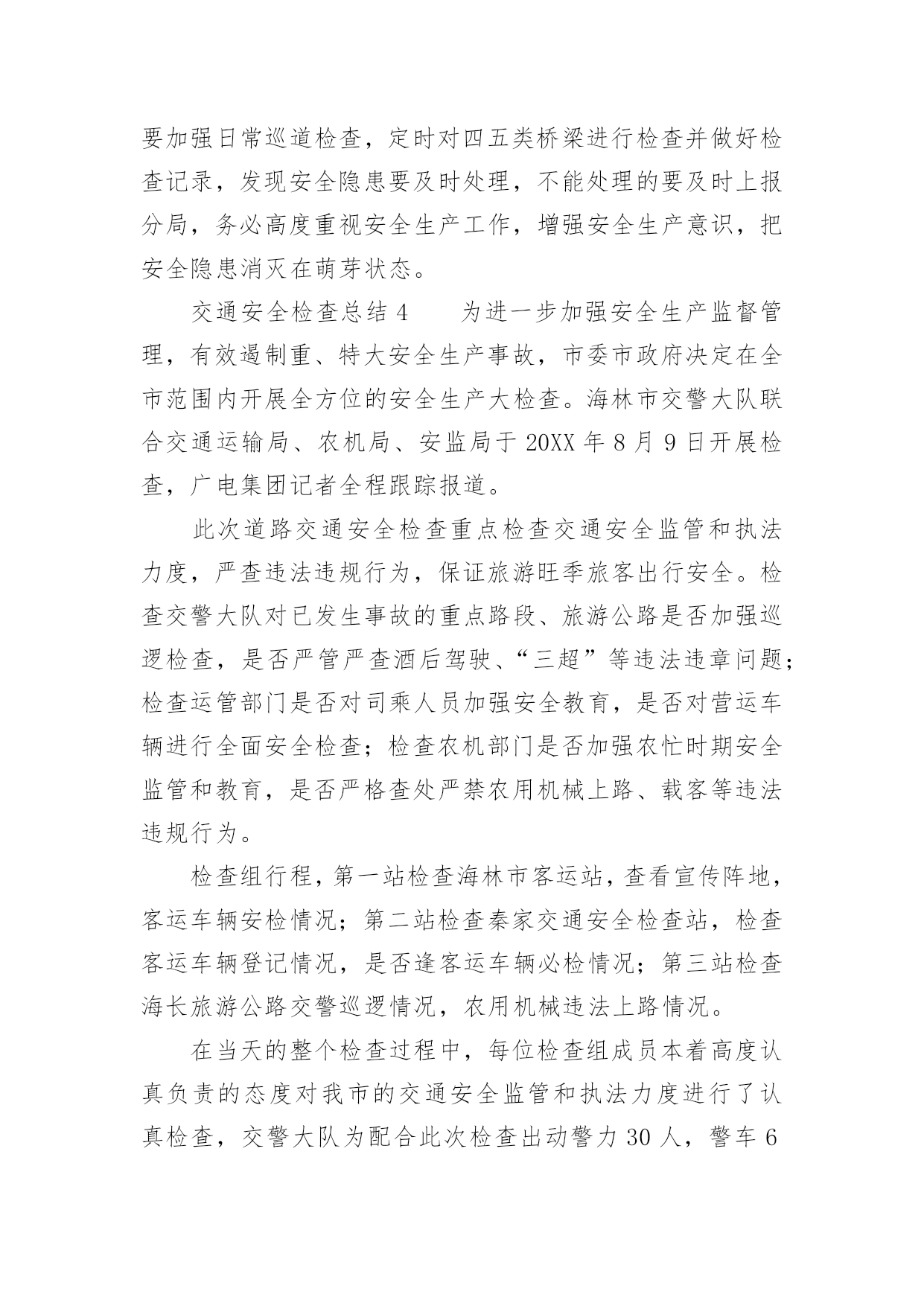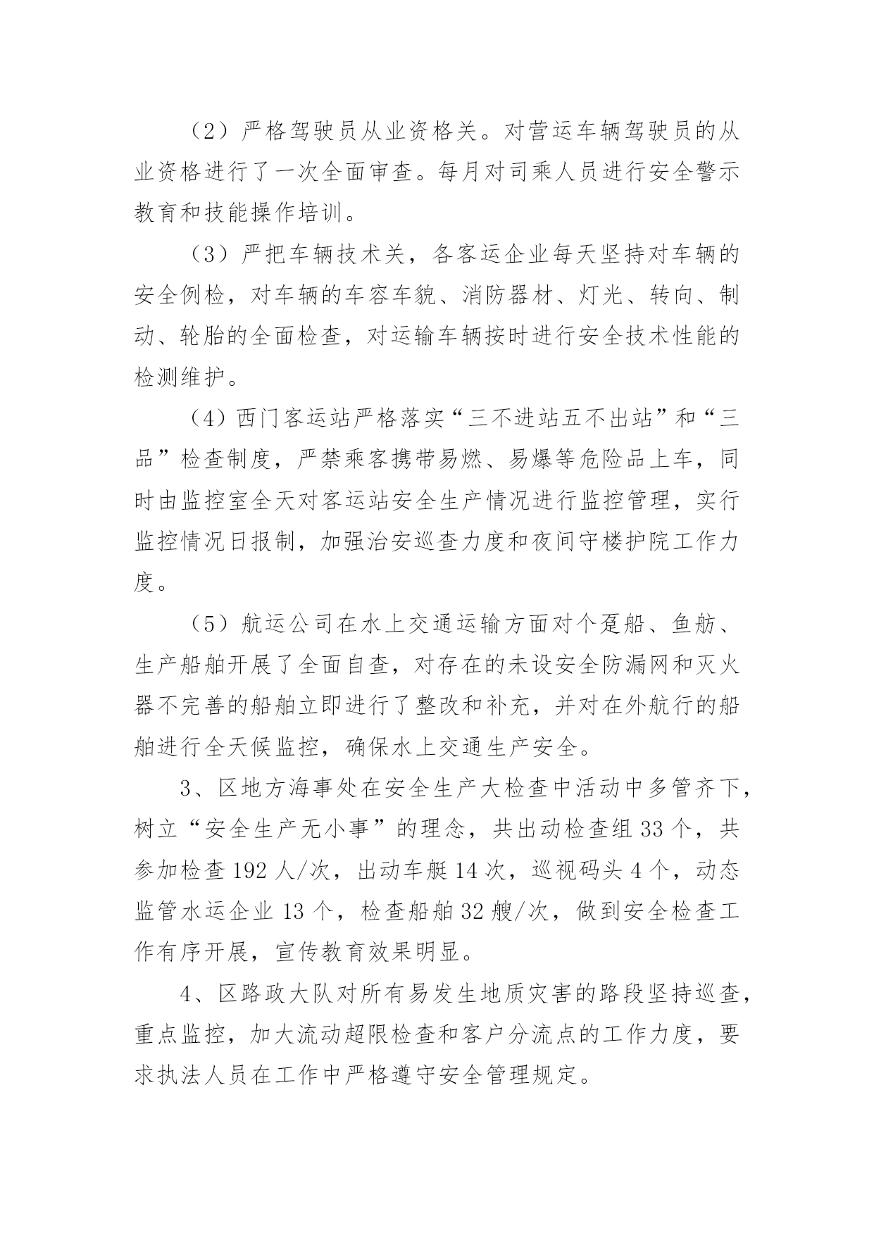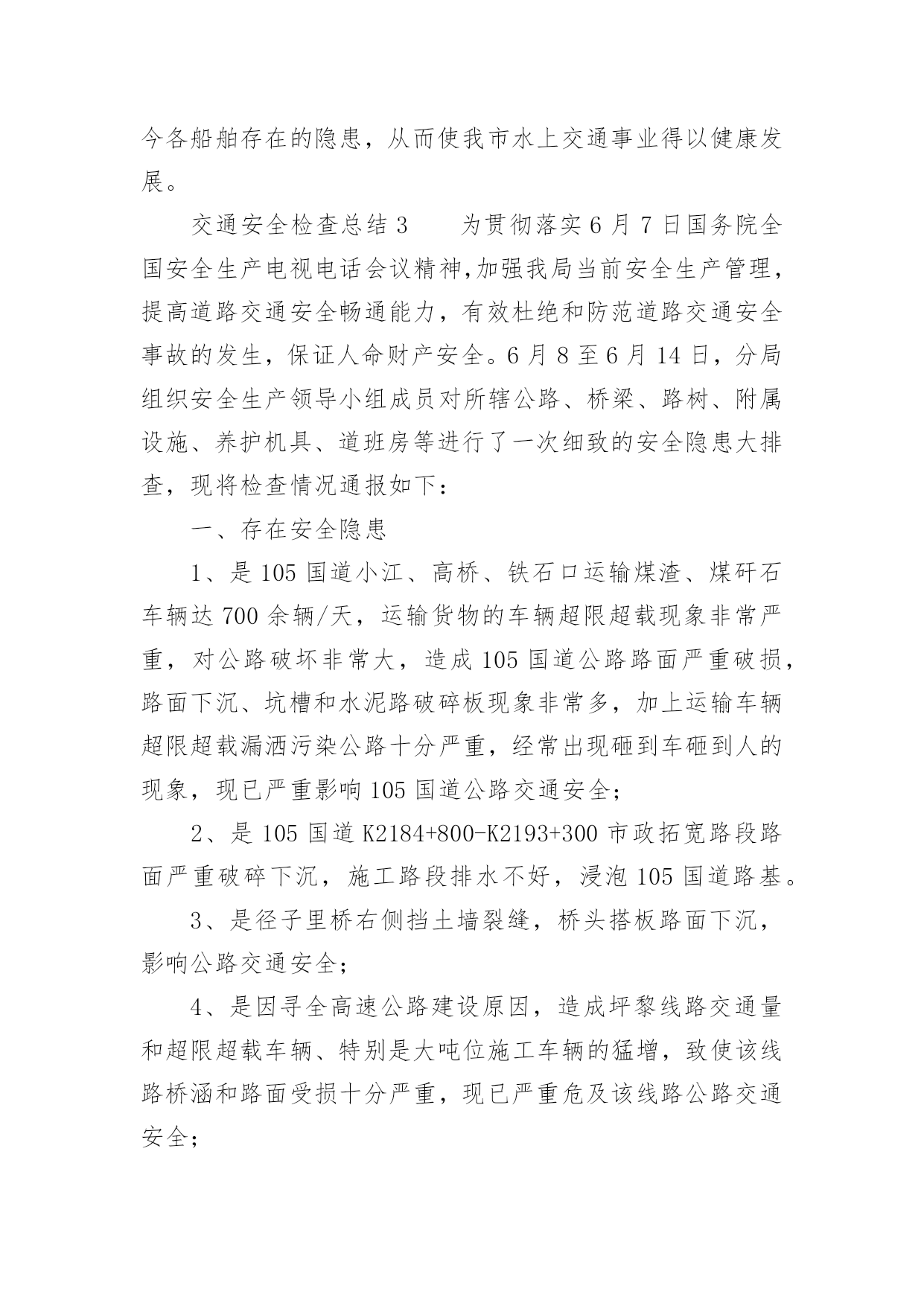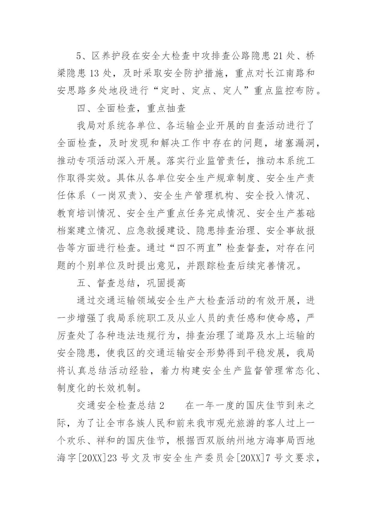 交通安全检查总结交通安全检查总结一、交通安全注意事项1、观察清楚,对路面情况,要及时全面仔细的观察清楚。2、正确迅速的判断,对看到的路面情况要主动认真的思考判断。3、一路预防,预防是一道有力的安全程序,开车时预防措施不到位,安全指数就显露很薄弱。4、遵守交通规则。5、车速要能确保安全。二、交通安全检查总结(精选34篇)总结是在某一特定时间段对学习和工作生活或其完成情况,包括取得的成绩、存在的问题及得到的经验和教训加以回顾和分析的书面材料,它可以促使我们思考,让我们好好写一份总结吧。总结怎么写才能发挥它的作用呢?下面是小编为大家整理的交通安全检查总结(精选34篇),欢迎大家分享。交通安全检查总结1一、组织有力高度重视大检查工作的开展为认真开展安全大检查,我局领导高度重视,及时贯彻落实上级有关安全工作的指示精神。天津事故后,按照市、区两级政府要求,区交通局专门召开了全系统安全工作紧急会,传达贯彻了级指示精神作,要求各单位清醒认识交通安全生产和汛期工作的重要性,认真分析、部署,做好单位生产安全自查工作。做到制定完善、责任到人、措施到位。二、部署安排搞好宣传动员工作为将检查工作深入企业基层,我局先后下发文件3次,局机关、局属各单位、各生产经营企业召开安全生产会议12次,对交通运输系统的安全生产工作进行了安排部署,制定了方案,明确了职责、任务、方法步骤和要求,并悬挂宣传横幅10条,张贴标语100条,散发宣传材料500份,同时在人流密集地的电子屏幕上对道路交通运输大检查大整治专项活动进行了广泛宣传。三、措施有力认真开展安全生产检查工作检查组采用“四不两直”方式,以不发通知、不打招呼、不听汇报、不用陪同接待,直奔基层、直插现场的方式进行检查。全面检查局属10个运输企业、4个事业单位,1个道路施工企业全面开展了自查自纠工作,及时排查和治理纠正违法违规行为。具体情况如下:1、10个运输企业:(1)严把运输市场准入关,强化企业的管理,切实履行安全生产主体责任,建立健全安全生产生产责任制和安全生产各项制度。各客运企业普遍建立了安全领导机构和管理机构,健全了各项安全制度,配齐了车内的各种安全设施,与各车主或司乘人员签定了安全责任目标书。(2)严格驾驶员从业资格关。对营运车辆驾驶员的从业资格进行了一次全面审查。每月对司乘人员进行安全警示教育和技能操作培训。(3)严把车辆技术关,各客运企业每天坚持对车辆的安全例检,对车辆的车容车貌、消防器材、灯光、转向、制动、轮胎的全面检查,对运输车辆按时进行安全技术性能的检测维护。(4)西门客运站严格落实“三不进站五不出站”和“三品”检查制度,严禁乘客携带易燃、易爆等危险品上车,同时由监控室全天对客运站安全生产情况进行监控管理,实行监控情况日报制,加强治安巡查力度和夜间守楼护院工作力度。(5)航运公司在水上交通运输方面对个趸船、鱼舫、生产船舶开展了全面自查,对存在的未设安全防漏网和灭火器不完善的船舶立即进行了整改和补充,并对在外航行的船舶进行全天候监控,确保水上交通生产安全。3、区地方海事处在安全生产大检查中活动中多管齐下,树立“安全生产无小事”的理念,共出动检查组33个,共参加检查192人/次,出动车艇14次,巡视码头4个,动态监管水运企业13个,检查船舶32艘/次,做到安全检查工作有序开展,宣传教育效果明显。4、区路政大队对所有易发生地质灾害的路段坚持巡查,重点监控,加大流动超限检查和客户分流点的工作力度,要求执法人员在工作中严格遵守安全管理规定。5、区养护段在安全大检查中攻排查公路隐患21处、桥梁隐患13处,及时采取安全防护措施,重点对长江南路和安思路多处地段进行“定时、定点、定人”重点监控布防。四、全面检查,重点抽查我局对系统各单位、各运输企业开展的自查活动进行了全面检查,及时发现和解决工作中存在的问题,堵塞漏洞,推动专项活动深入开展。落实行业监管责任,推动本系统工作取得实效。具体从各单位安全生产规章制度、安全生产责任体系(一岗双责)、安全生产管理机构、安全投入情况、教育培训情况、安全生产重点任务完成情况、安全生产基础档案建立情况、应急救援建设、隐患排查治理、安全事故报告等方面进行检查。通过“四不两直”检查督查,对存在问题的个别单位及时提出意见,并跟踪检查后续完善情况。五、督查总结,巩固提高通过交通运输领域安全生产大检查活动的有效开展,进一步增强了我局系统职工及从业人员的责任感和使命感,严厉查处了各种违法违规行为,排查治理了道路及水上运输的安全隐患,使我区的交通运输安全形势得到平稳发展,我局将认真总结活动经验,着力构建安全生产监督管理常态化、制度化的长效机制。交通安全检查总结2在一年一度的国庆佳节到来之际,为了让全市各族人民和前来我市观光旅游的客人过上一个欢乐、祥和的国庆佳节,根据西双版纳州地方海事局西地海