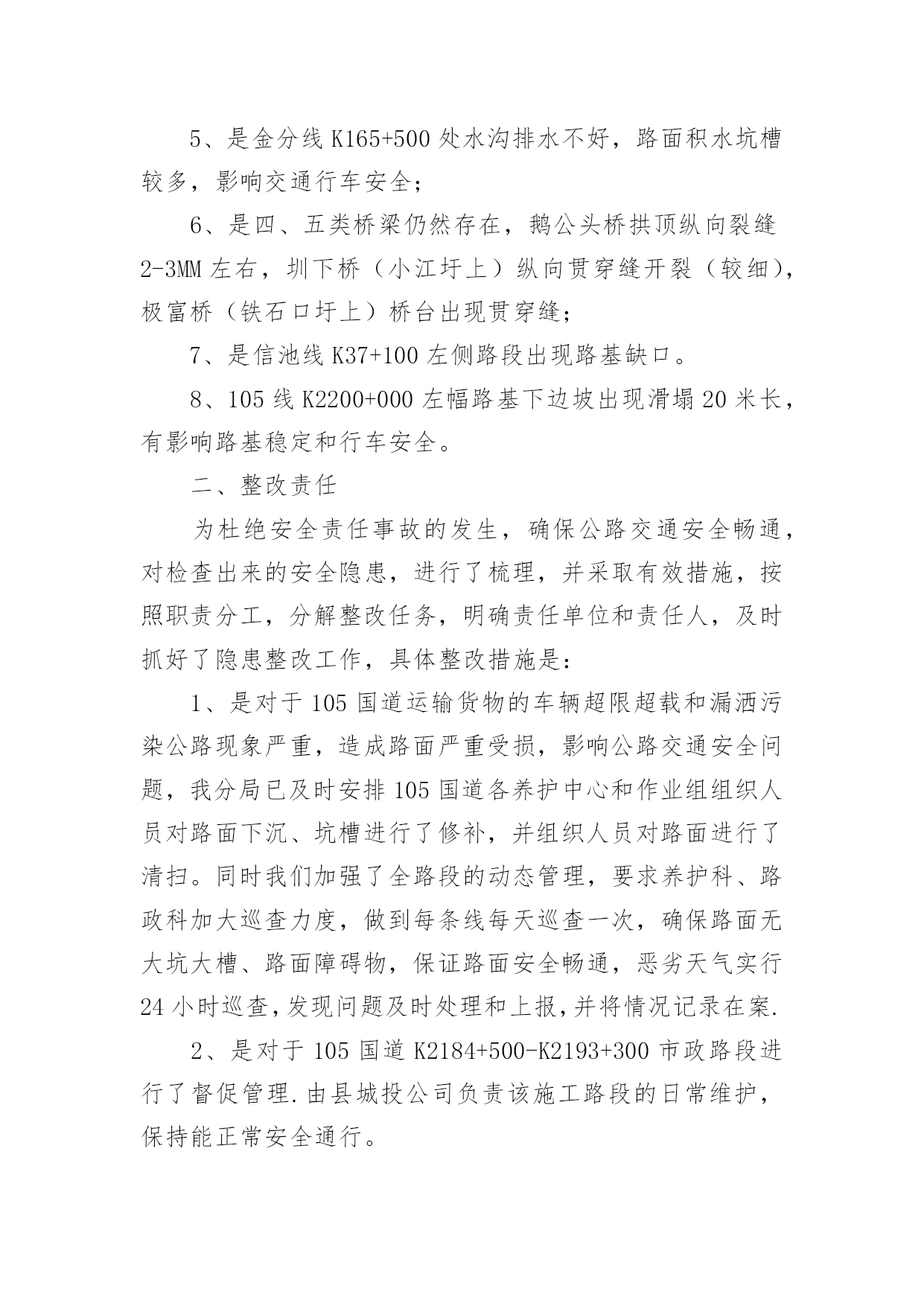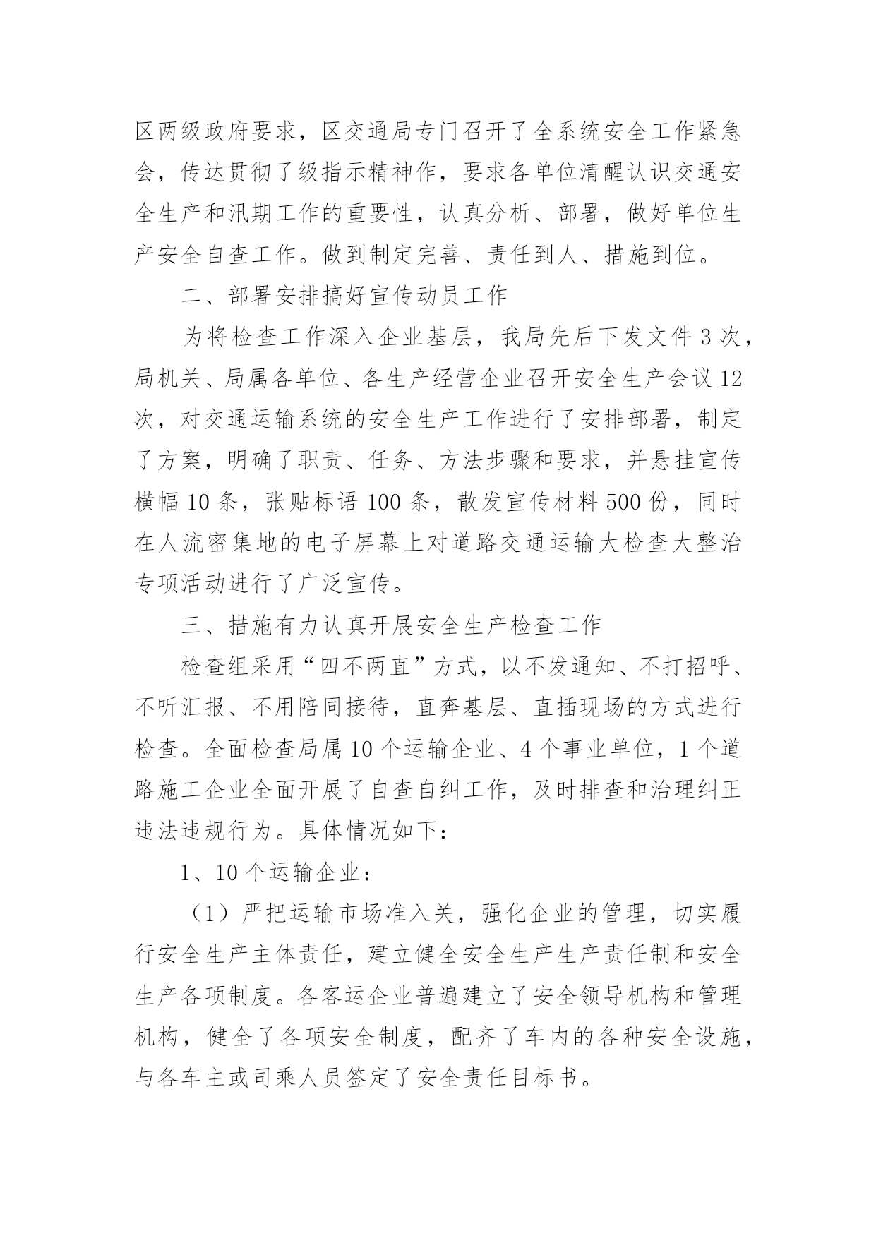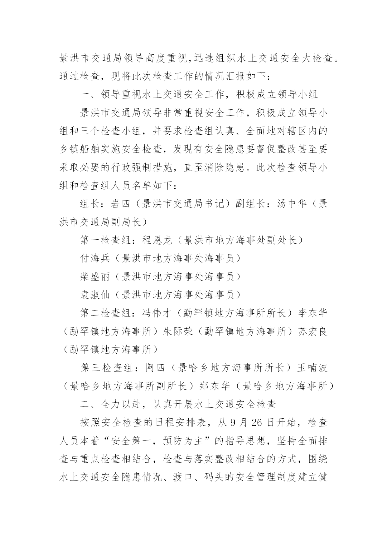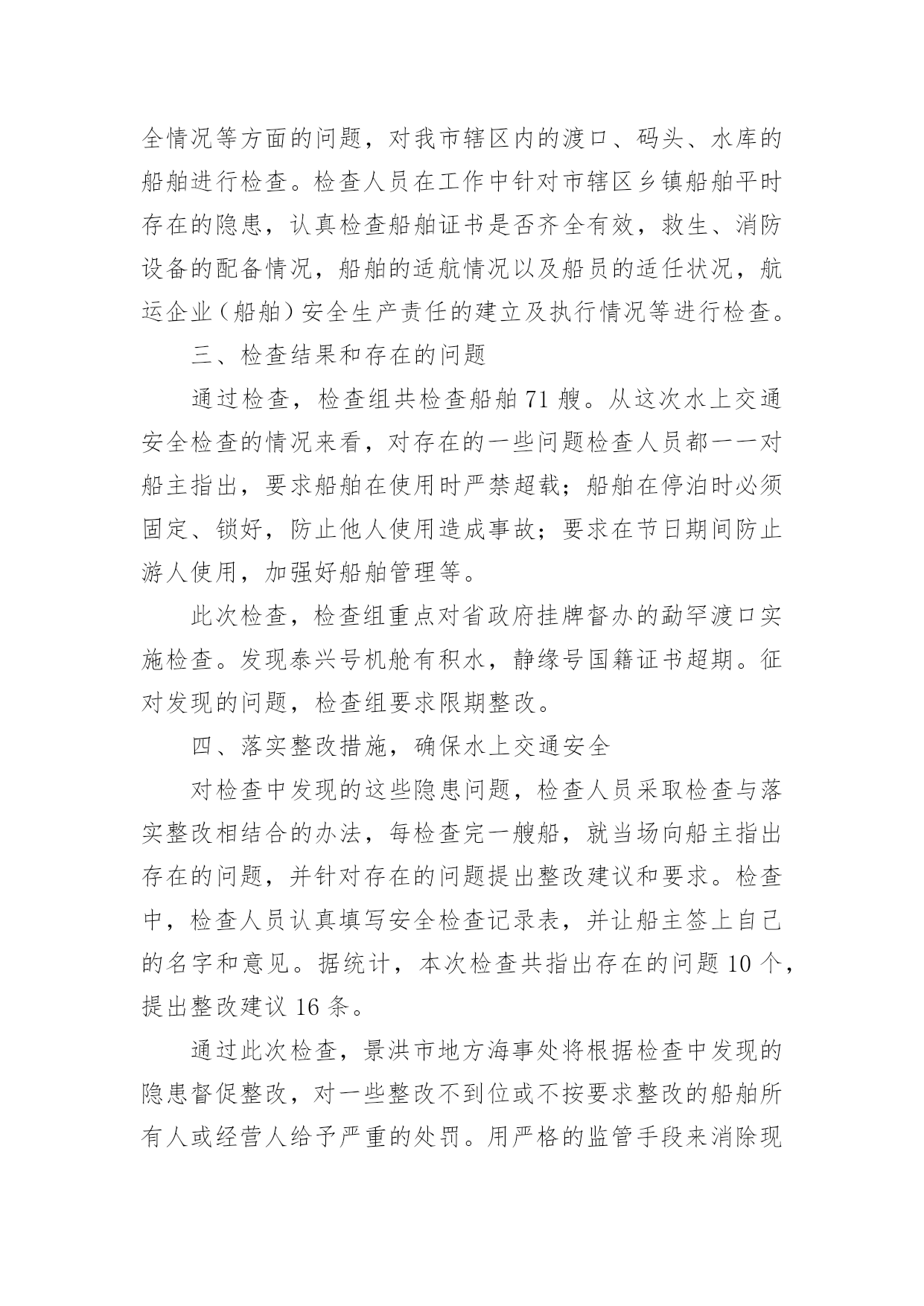 交通安全检查总结交通安全检查总结一、交通安全注意事项1、观察清楚,对路面情况,要及时全面仔细的观察清楚。2、正确迅速的判断,对看到的路面情况要主动认真的思考判断。3、一路预防,预防是一道有力的安全程序,开车时预防措施不到位,安全指数就显露很薄弱。4、遵守交通规则。5、车速要能确保安全。二、交通安全检查总结(精选34篇)总结是在某一特定时间段对学习和工作生活或其完成情况,包括取得的成绩、存在的问题及得到的经验和教训加以回顾和分析的书面材料,它可以促使我们思考,让我们好好写一份总结吧。总结怎么写才能发挥它的作用呢?下面是小编为大家整理的交通安全检查总结(精选34篇),欢迎大家分享。交通安全检查总结1一、组织有力高度重视大检查工作的开展为认真开展安全大检查,我局领导高度重视,及时贯彻落实上级有关安全工作的指示精神。天津事故后,按照市、区两级政府要求,区交通局专门召开了全系统安全工作紧急会,传达贯彻了级指示精神作,要求各单位清醒认识交通安全生产和汛期工作的重要性,认真分析、部署,做好单位生产安全自查工作。做到制定完善、责任到人、措施到位。二、部署安排搞好宣传动员工作为将检查工作深入企业基层,我局先后下发文件3次,局机关、局属各单位、各生产经营企业召开安全生产会议12次,对交通运输系统的安全生产工作进行了安排部署,制定了方案,明确了职责、任务、方法步骤和要求,并悬挂宣传横幅10条,张贴标语100条,散发宣传材料500份,同时在人流密集地的电子屏幕上对道路交通运输大检查大整治专项活动进行了广泛宣传。三、措施有力认真开展安全生产检查工作检查组采用“四不两直”方式,以不发通知、不打招呼、不听汇报、不用陪同接待,直奔基层、直插现场的方式进行检查。全面检查局属10个运输企业、4个事业单位,1个道路施工企业全面开展了自查自纠工作,及时排查和治理纠正违法违规行为。具体情况如下:1、10个运输企业:(1)严把运输市场准入关,强化企业的管理,切实履行安全生产主体责任,建立健全安全生产生产责任制和安全生产各项制度。各客运企业普遍建立了安全领导机构和管理机构,健全了各项安全制度,配齐了车内的各种安全设施,与各车主或司乘人员签定了安全责任目标书。(2)严格驾驶员从业资格关。对营运车辆驾驶员的从业资格进行了一次全面审查。每月对司乘人员进行安全警示教育和技能操作培训。(3)严把车辆技术关,各客运企业每天坚持对车辆的安全例检,对车辆的车容车貌、消防器材、灯光、转向、制动、轮胎的全面检查,对运输车辆按时进行安全技术性能的检测维护。(4)西门客运站严格落实“三不进站五不出站”和“三品”检查制度,严禁乘客携带易燃、易爆等危险品上车,同时由监控室全天对客运站安全生产情况进行监控管理,实行监控情况日报制,加强治安巡查力度和夜间守楼护院工作力度。(5)航运公司在水上交通运输方面对个趸船、鱼舫、生产船舶开展了全面自查,对存在的未设安全防漏网和灭火器不完善的船舶立即进行了整改和补充,并对在外航行的船舶进行全天候监控,确保水上交通生产安全。3、区地方海事处在安全生产大检查中活动中多管齐下,树立“安全生产无小事”的理念,共出动检查组33个,共参加检查192人/次,出动车艇14次,巡视码头4个,动态监管水运企业13个,检查船舶32艘/次,做到安全检查工作有序开展,宣传教育效果明显。4、区路政大队对所有易发生地质灾害的路段坚持巡查,重点监控,加大流动超限检查和客户分流点的工作力度,要求执法人员在工作中严格遵守安全管理规定。5、区养护段在安全大检查中攻排查公路隐患21处、桥梁隐患13处,及时采取安全防护措施,重点对长江南路和安思路多处地段进行“定时、定点、定人”重点监控布防。四、全面检查,重点抽查我局对系统各单位、各运输企业开展的自查活动进行了全面检查,及时发现和解决工作中存在的问题,堵塞漏洞,推动专项活动深入开展。落实行业监管责任,推动本系统工作取得实效。具体从各单位安全生产规章制度、安全生产责任体系(一岗双责)、安全生产管理机构、安全投入情况、教育培训情况、安全生产重点任务完成情况、安全生产基础档案建立情况、应急救援建设、隐患排查治理、安全事故报告等方面进行检查。通过“四不两直”检查督查,对存在问题的个别单位及时提出意见,并跟踪检查后续完善情况。五、督查总结,巩固提高通过交通运输领域安全生产大检查活动的有效开展,进一步增强了我局系统职工及从业人员的责任感和使命感,严厉查处了各种违法违规行为,排查治理了道路及水上运输的安全隐患,使我区的交通运输安全形势得到平稳发展,我局将认真总结活动经验,着力构建安全生产监督管理常态化、制度化的长效机制。交通安全检查总结2在一年一度的国庆佳节到来之际,为了让全市各族人民和前来我市观光旅游的客人过上一个欢乐、祥和的国庆佳节,根据西双版纳州地方海事局西地海