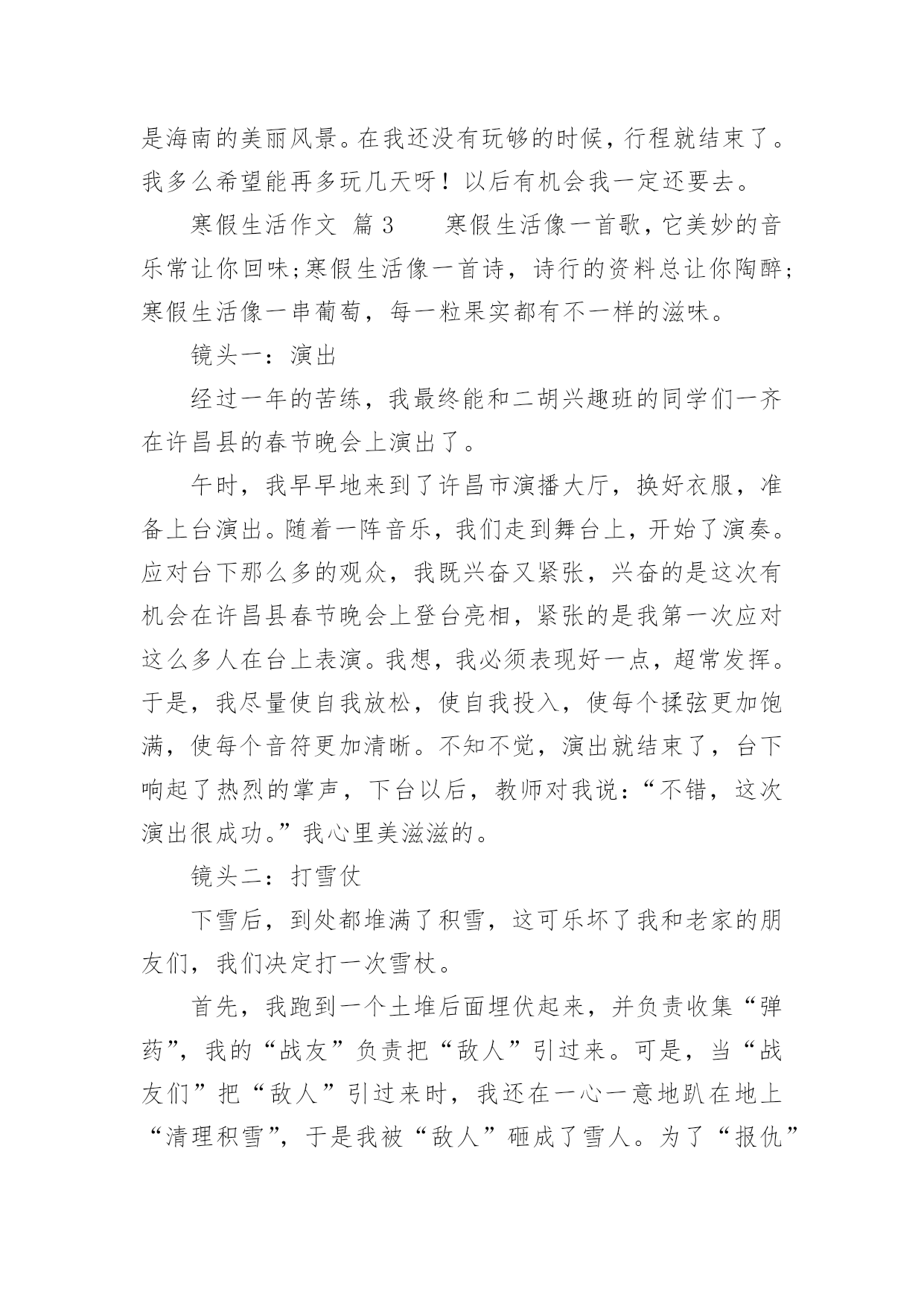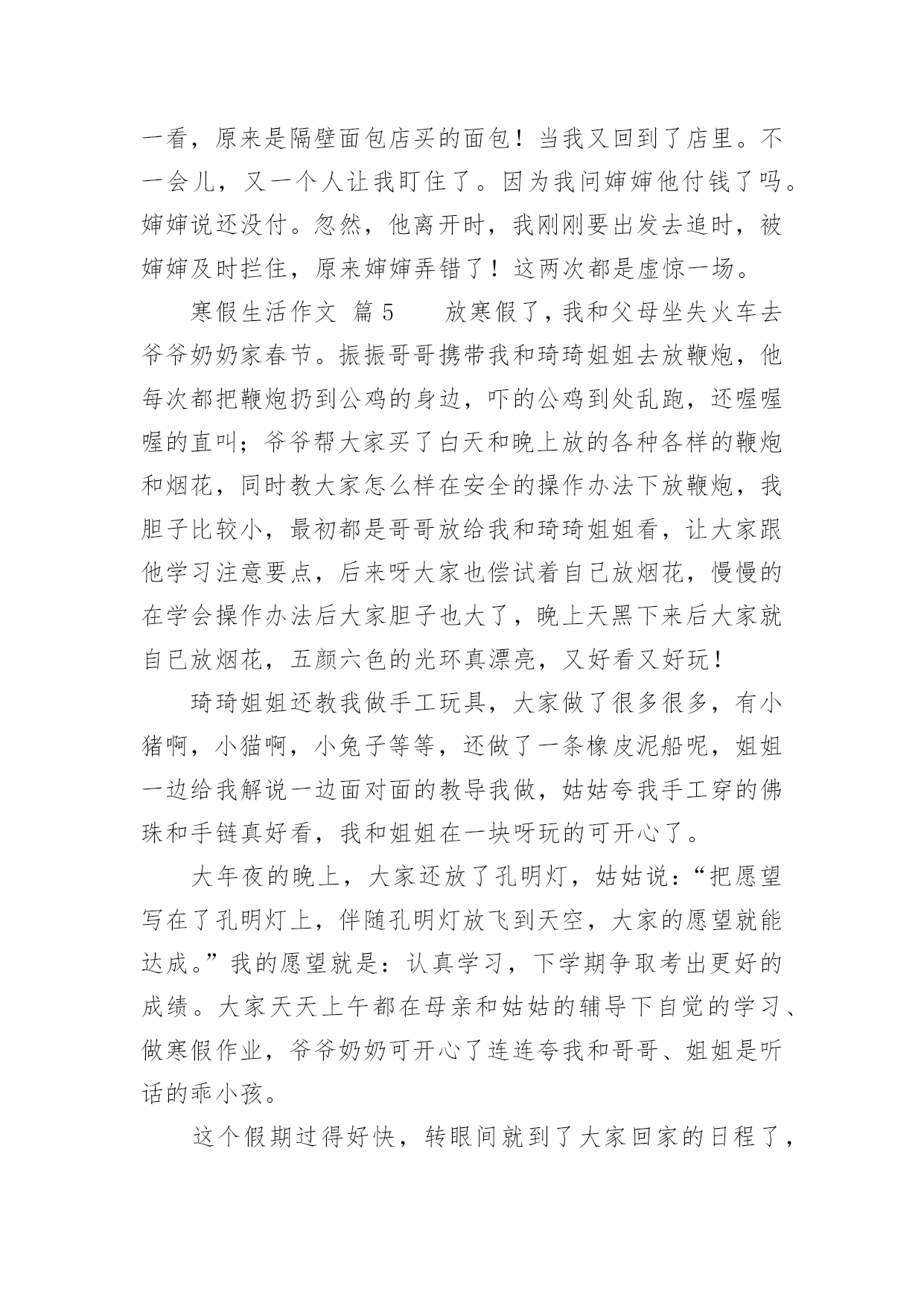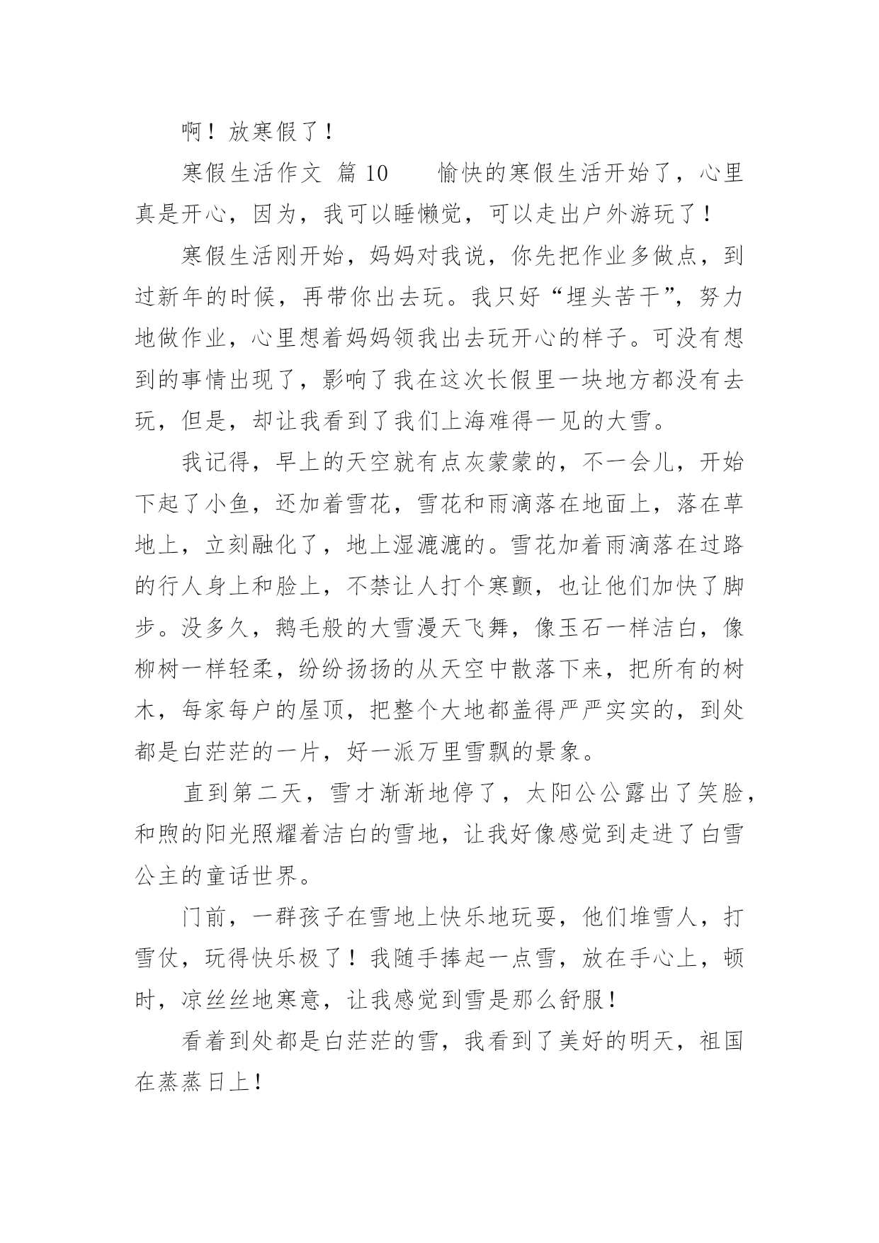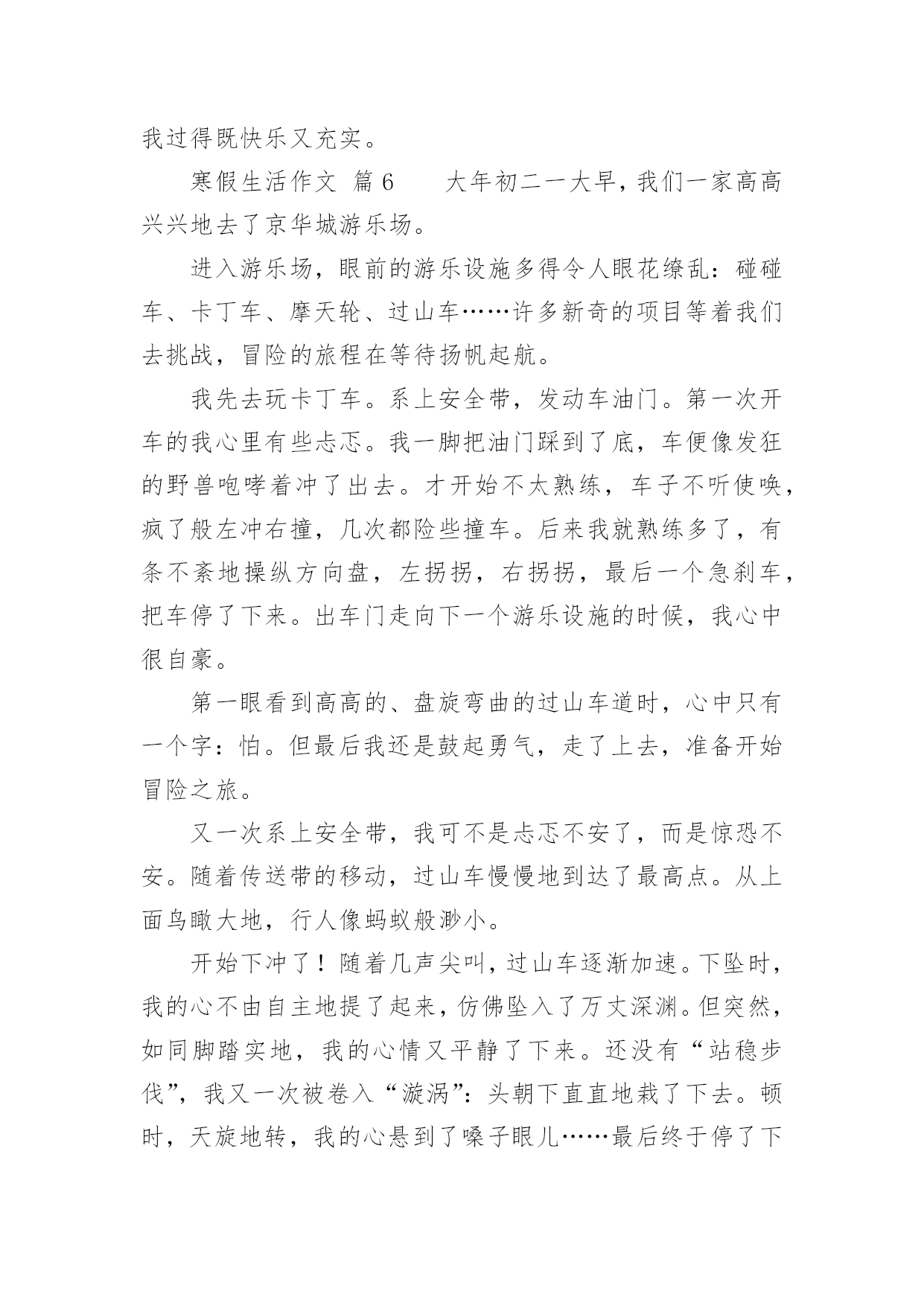 寒假生活作文【精】寒假生活作文(通用42篇)在日常学习、工作和生活中,大家对作文都不陌生吧,写作文可以锻炼我们的独处习惯,让自己的心静下来,思考自己未来的方向。那么你知道一篇好的作文该怎么写吗?下面是小编整理的寒假生活作文,欢迎大家借鉴与参考,希望对大家有所帮助。寒假生活作文篇1我就读于阳光小学,目前六年级,虽然学校是没有指定寒假作业,我记得以前有寒暑假作业时,其实也没有很多,但各处室的作业都很有趣。现在,老师常用寒假自主学习单来让我们自己安排,等于是自己出作业给自己完成。在班级上有很多人都善用3C产品,利用PPT来呈现自己的寒假生活,有少数几人会和我一样利用书面报告,把参观展览的票根、表演的节目册、劳作作品等等都放进资料夹,纪录着整个寒假的历程,也写下心得纪录。不管如何呈现,寒假作业都是代表成长的纪录,也有同学认为假期中原本就会安排各种自己喜欢的学习活动或是想做的事,寒假作业只是一种要刻意呈现给别人看的记录,像纪璇同学就表示:“我认为学习是自己的事,学了什么,学到哪里,有时未必需要让别人知道,所以学校若是能安排寒假学习经验交流的活动,让大家可以用不同的方式去呈现自己的学习成果。”因此老师会用课余的时间来让大家轮流报告,也给同学评分表,并要写出从同学的报告中学习到的东西,虽然有些人上台会结巴,但可以知道大家有趣的寒假生活,班上如果有27人,就会有27份收获呢!同学们都很满意自己的寒假生活,既可有充足的睡眠,也能自己安排学习或休闲活动,还能轻鬆地和家人出去玩,每个人都过得十分充实,因为认真用心的小孩最美丽。寒假生活作文篇2今年期未考试我考出了一个好成绩,三科全部满分全家人非常高兴。姥姥和姥爷答应我去海南玩,我听了高兴极了。早早我就开始准备东西了,听大人说海南很远。在中国的最南边,是一个小岛。需要乘飞机去,我还没有坐过飞机呢,这回我可以坐到飞机了,真是太好了。这一天终于到了,我和姥姥、姥爷来到机场,停机坪上停着很多飞机,我们过了安检登上了飞机,不一会飞机就起飞了。飞机飞的非常快,我们在蓝天、白云中穿行。一会儿就到了海南。我们走下飞机,海南好热、好美呀!到处都是椰树、到处都有海风。我们在宾馆住了一天,第二天就开始了行程,我们去了万泉河、玉带滩、分界洲岛、天涯海角、博鳌论谈会址、南湾猴岛。玉带滩像一个长长的带子,他的一边是海、一边是河大自然真是太神奇了。南湾猴岛的小猴子真是可爱,只要你带着吃的他就到你的身边,围着你要。我还看到了老猴子给小猴子抓跳蚤可好玩了。听说海南岛是由火山暴发形成的,毛主席的水晶棺就是采制海南岛。海南岛四面环海,蓝天、白云、阳光、椰树、沙滩、海风这些都是海南的美丽风景。在我还没有玩够的时候,行程就结束了。我多么希望能再多玩几天呀!以后有机会我一定还要去。寒假生活作文篇3寒假生活像一首歌,它美妙的音乐常让你回味;寒假生活像一首诗,诗行的资料总让你陶醉;寒假生活像一串葡萄,每一粒果实都有不一样的滋味。镜头一:演出经过一年的苦练,我最终能和二胡兴趣班的同学们一齐在许昌县的春节晚会上演出了。午时,我早早地来到了许昌市演播大厅,换好衣服,准备上台演出。随着一阵音乐,我们走到舞台上,开始了演奏。应对台下那么多的观众,我既兴奋又紧张,兴奋的是这次有机会在许昌县春节晚会上登台亮相,紧张的是我第一次应对这么多人在台上表演。我想,我必须表现好一点,超常发挥。于是,我尽量使自我放松,使自我投入,使每个揉弦更加饱满,使每个音符更加清晰。不知不觉,演出就结束了,台下响起了热烈的掌声,下台以后,教师对我说:“不错,这次演出很成功。”我心里美滋滋的。镜头二:打雪仗下雪后,到处都堆满了积雪,这可乐坏了我和老家的朋友们,我们决定打一次雪杖。首先,我跑到一个土堆后面埋伏起来,并负责收集“弹药”,我的“战友”负责把“敌人”引过来。可是,当“战友们”把“敌人”引过来时,我还在一心一意地趴在地上“清理积雪”,于是我被“敌人”砸成了雪人。为了“报仇”我冲入“敌人”的“军营”将敌人打了个措手不及。啊,多彩的寒假生活,你将成为我最完美的一段回忆。寒假生活作文篇4我的寒假生活是丰富多彩的;我的寒假生活是快乐的;我的寒假生活是一段美妙的回忆…观田野,啊!终于从那每天生活在噪音与废气之中的城市回到乡村来品味这里清鲜的空气;终于逃离了受拘束的套房回到了这让人回味无穷的乡村山野。我一放寒假,立马回老家。在老家,我喜欢清晨一起床,就与太阳公公打招呼。我骑上山地车,悠闲地朝田野骑去,为了看那一幅大自然先生画出的田园风景画。一到那里,映入眼帘的是那一片片黄澄澄的油菜花。靠近它时,会闻见一阵阵芬芳扑鼻的香味。唉!怎么会时不时地发出“嗡嗡”的叫声?哦,是勤劳的蜜蜂们正在采蜜呢!不一会儿,太阳已经开始把金光撒满了田野,整个田野一片金灿灿,美丽极了。看店,这天,太阳难得露出了笑脸,