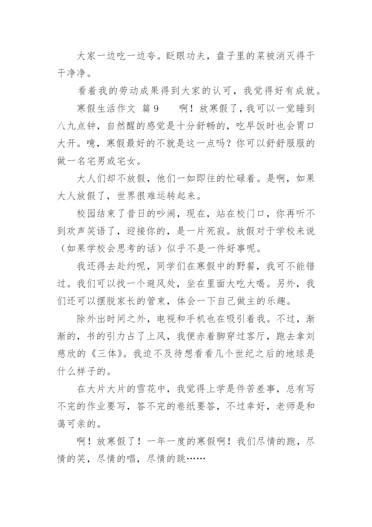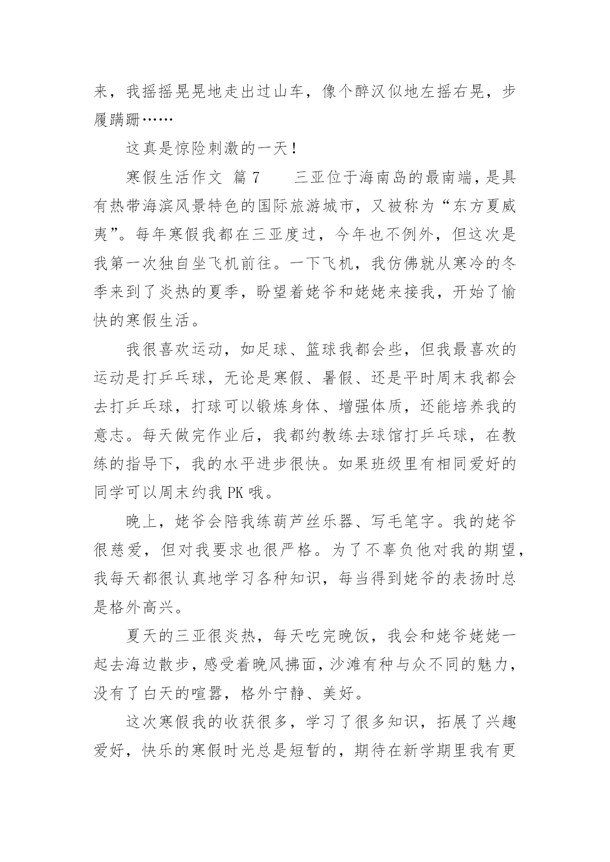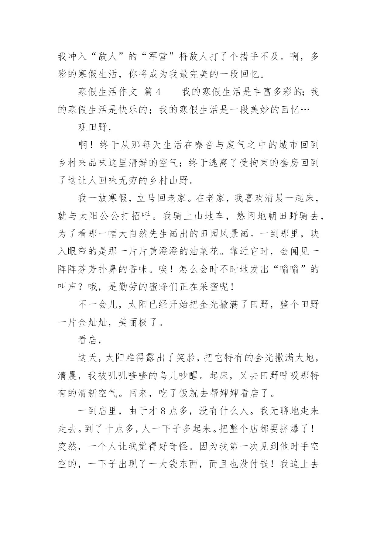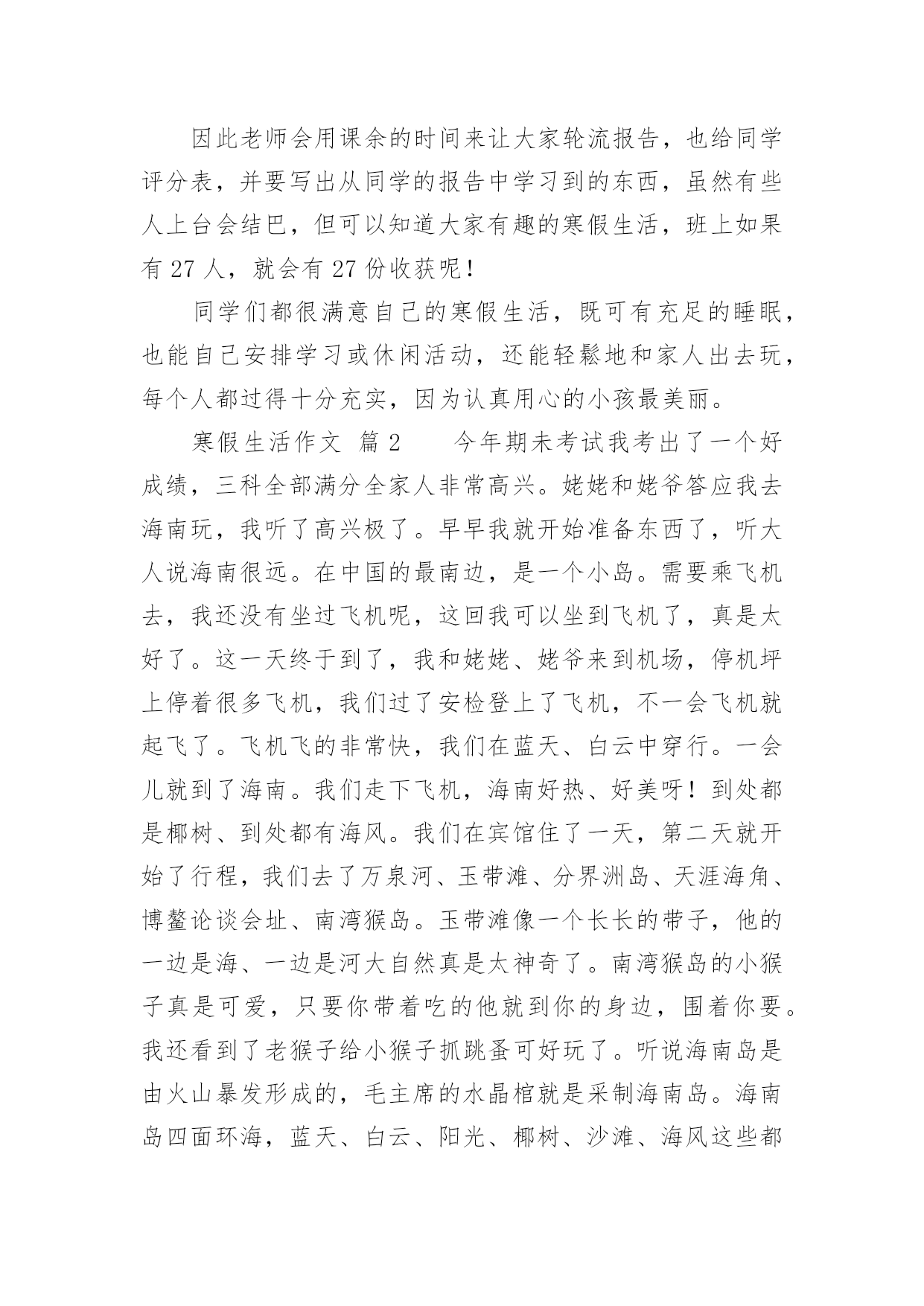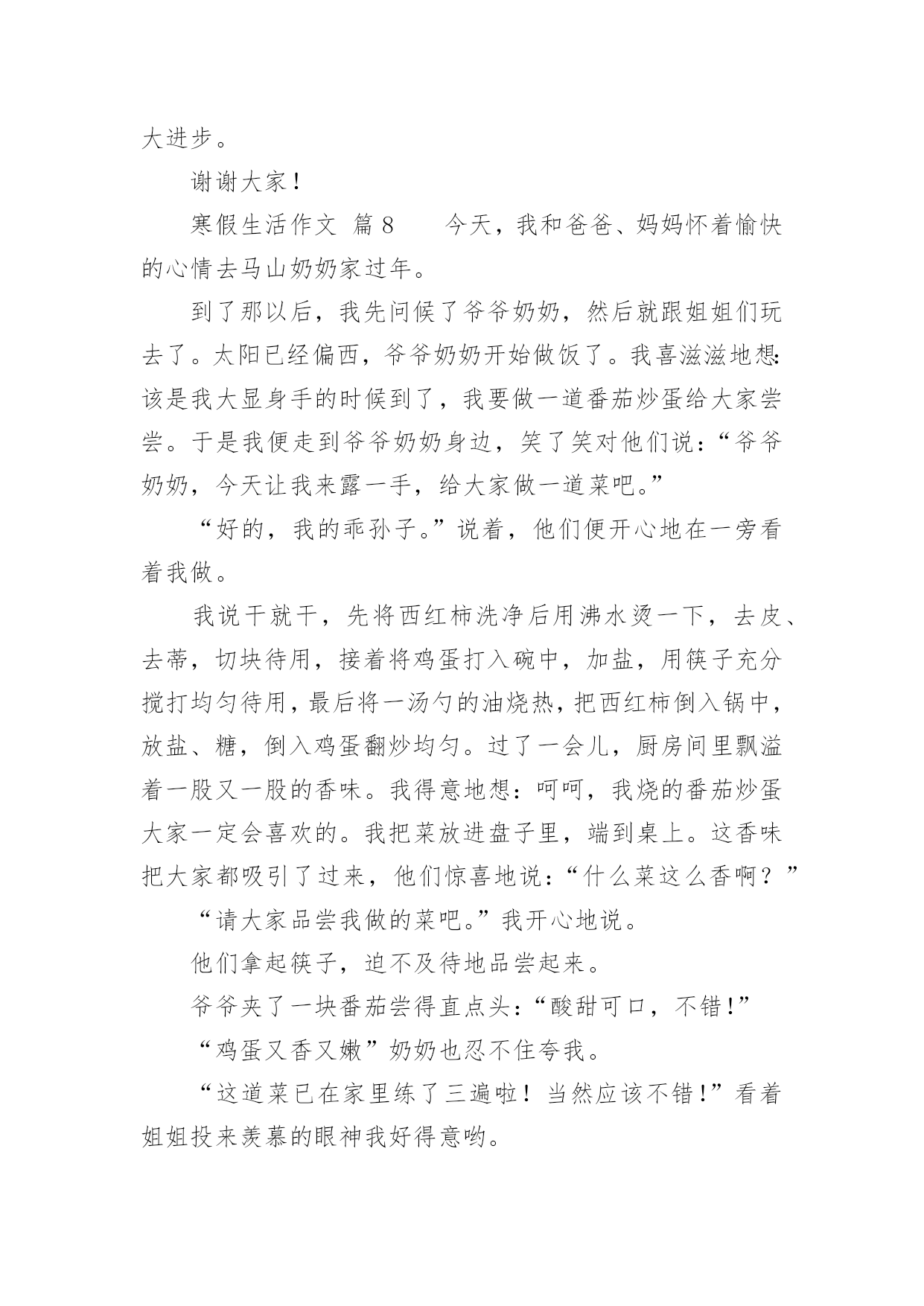 寒假生活作文【精】寒假生活作文(通用42篇)在日常学习、工作和生活中,大家对作文都不陌生吧,写作文可以锻炼我们的独处习惯,让自己的心静下来,思考自己未来的方向。那么你知道一篇好的作文该怎么写吗?下面是小编整理的寒假生活作文,欢迎大家借鉴与参考,希望对大家有所帮助。寒假生活作文篇1我就读于阳光小学,目前六年级,虽然学校是没有指定寒假作业,我记得以前有寒暑假作业时,其实也没有很多,但各处室的作业都很有趣。现在,老师常用寒假自主学习单来让我们自己安排,等于是自己出作业给自己完成。在班级上有很多人都善用3C产品,利用PPT来呈现自己的寒假生活,有少数几人会和我一样利用书面报告,把参观展览的票根、表演的节目册、劳作作品等等都放进资料夹,纪录着整个寒假的历程,也写下心得纪录。不管如何呈现,寒假作业都是代表成长的纪录,也有同学认为假期中原本就会安排各种自己喜欢的学习活动或是想做的事,寒假作业只是一种要刻意呈现给别人看的记录,像纪璇同学就表示:“我认为学习是自己的事,学了什么,学到哪里,有时未必需要让别人知道,所以学校若是能安排寒假学习经验交流的活动,让大家可以用不同的方式去呈现自己的学习成果。”因此老师会用课余的时间来让大家轮流报告,也给同学评分表,并要写出从同学的报告中学习到的东西,虽然有些人上台会结巴,但可以知道大家有趣的寒假生活,班上如果有27人,就会有27份收获呢!同学们都很满意自己的寒假生活,既可有充足的睡眠,也能自己安排学习或休闲活动,还能轻鬆地和家人出去玩,每个人都过得十分充实,因为认真用心的小孩最美丽。寒假生活作文篇2今年期未考试我考出了一个好成绩,三科全部满分全家人非常高兴。姥姥和姥爷答应我去海南玩,我听了高兴极了。早早我就开始准备东西了,听大人说海南很远。在中国的最南边,是一个小岛。需要乘飞机去,我还没有坐过飞机呢,这回我可以坐到飞机了,真是太好了。这一天终于到了,我和姥姥、姥爷来到机场,停机坪上停着很多飞机,我们过了安检登上了飞机,不一会飞机就起飞了。飞机飞的非常快,我们在蓝天、白云中穿行。一会儿就到了海南。我们走下飞机,海南好热、好美呀!到处都是椰树、到处都有海风。我们在宾馆住了一天,第二天就开始了行程,我们去了万泉河、玉带滩、分界洲岛、天涯海角、博鳌论谈会址、南湾猴岛。玉带滩像一个长长的带子,他的一边是海、一边是河大自然真是太神奇了。南湾猴岛的小猴子真是可爱,只要你带着吃的他就到你的身边,围着你要。我还看到了老猴子给小猴子抓跳蚤可好玩了。听说海南岛是由火山暴发形成的,毛主席的水晶棺就是采制海南岛。海南岛四面环海,蓝天、白云、阳光、椰树、沙滩、海风这些都是海南的美丽风景。在我还没有玩够的时候,行程就结束了。我多么希望能再多玩几天呀!以后有机会我一定还要去。寒假生活作文篇3寒假生活像一首歌,它美妙的音乐常让你回味;寒假生活像一首诗,诗行的资料总让你陶醉;寒假生活像一串葡萄,每一粒果实都有不一样的滋味。镜头一:演出经过一年的苦练,我最终能和二胡兴趣班的同学们一齐在许昌县的春节晚会上演出了。午时,我早早地来到了许昌市演播大厅,换好衣服,准备上台演出。随着一阵音乐,我们走到舞台上,开始了演奏。应对台下那么多的观众,我既兴奋又紧张,兴奋的是这次有机会在许昌县春节晚会上登台亮相,紧张的是我第一次应对这么多人在台上表演。我想,我必须表现好一点,超常发挥。于是,我尽量使自我放松,使自我投入,使每个揉弦更加饱满,使每个音符更加清晰。不知不觉,演出就结束了,台下响起了热烈的掌声,下台以后,教师对我说:“不错,这次演出很成功。”我心里美滋滋的。镜头二:打雪仗下雪后,到处都堆满了积雪,这可乐坏了我和老家的朋友们,我们决定打一次雪杖。首先,我跑到一个土堆后面埋伏起来,并负责收集“弹药”,我的“战友”负责把“敌人”引过来。可是,当“战友们”把“敌人”引过来时,我还在一心一意地趴在地上“清理积雪”,于是我被“敌人”砸成了雪人。为了“报仇”我冲入“敌人”的“军营”将敌人打了个措手不及。啊,多彩的寒假生活,你将成为我最完美的一段回忆。寒假生活作文篇4我的寒假生活是丰富多彩的;我的寒假生活是快乐的;我的寒假生活是一段美妙的回忆…观田野,啊!终于从那每天生活在噪音与废气之中的城市回到乡村来品味这里清鲜的空气;终于逃离了受拘束的套房回到了这让人回味无穷的乡村山野。我一放寒假,立马回老家。在老家,我喜欢清晨一起床,就与太阳公公打招呼。我骑上山地车,悠闲地朝田野骑去,为了看那一幅大自然先生画出的田园风景画。一到那里,映入眼帘的是那一片片黄澄澄的油菜花。靠近它时,会闻见一阵阵芬芳扑鼻的香味。唉!怎么会时不时地发出“嗡嗡”的叫声?哦,是勤劳的蜜蜂们正在采蜜呢!不一会儿,太阳已经开始把金光撒满了田野,整个田野一片金灿灿,美丽极了。看店,这天,太阳难得露出了笑脸,