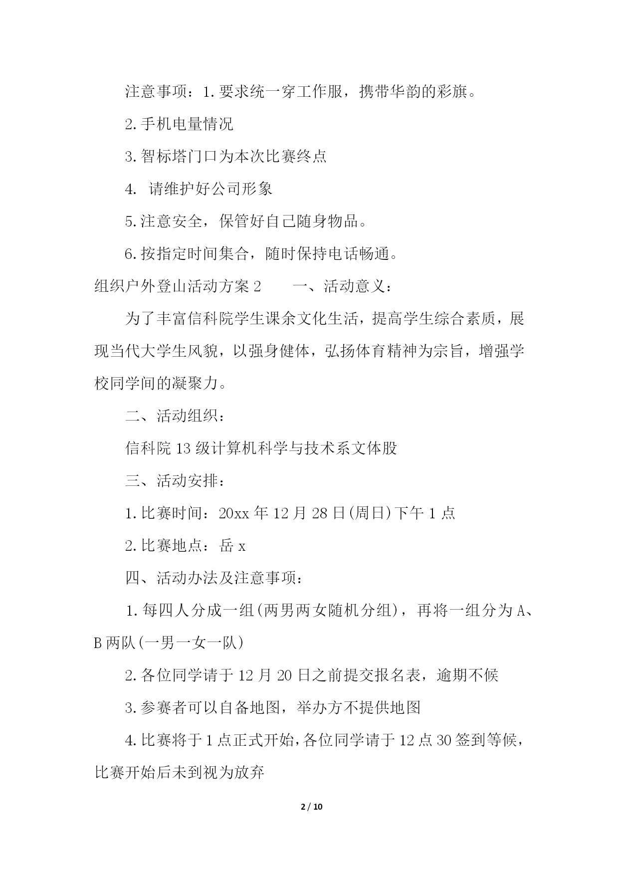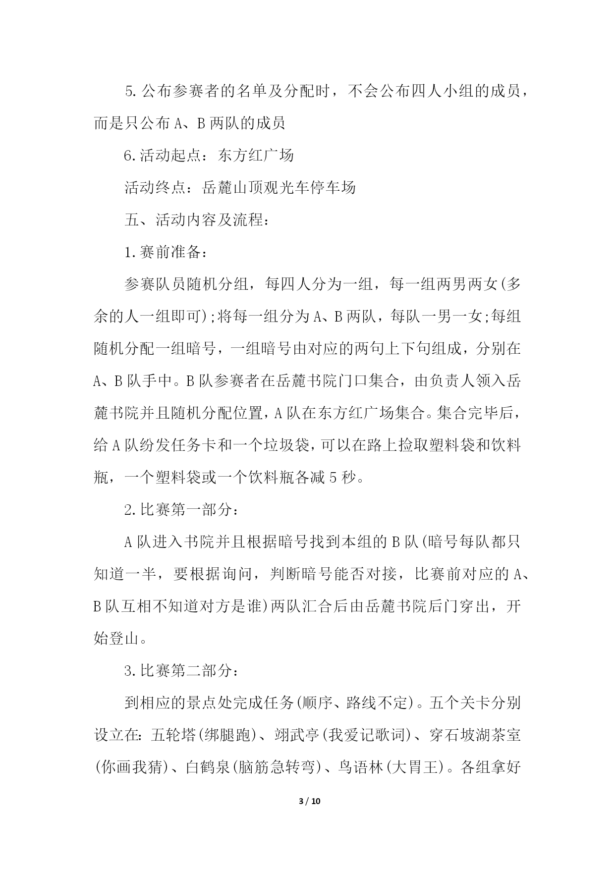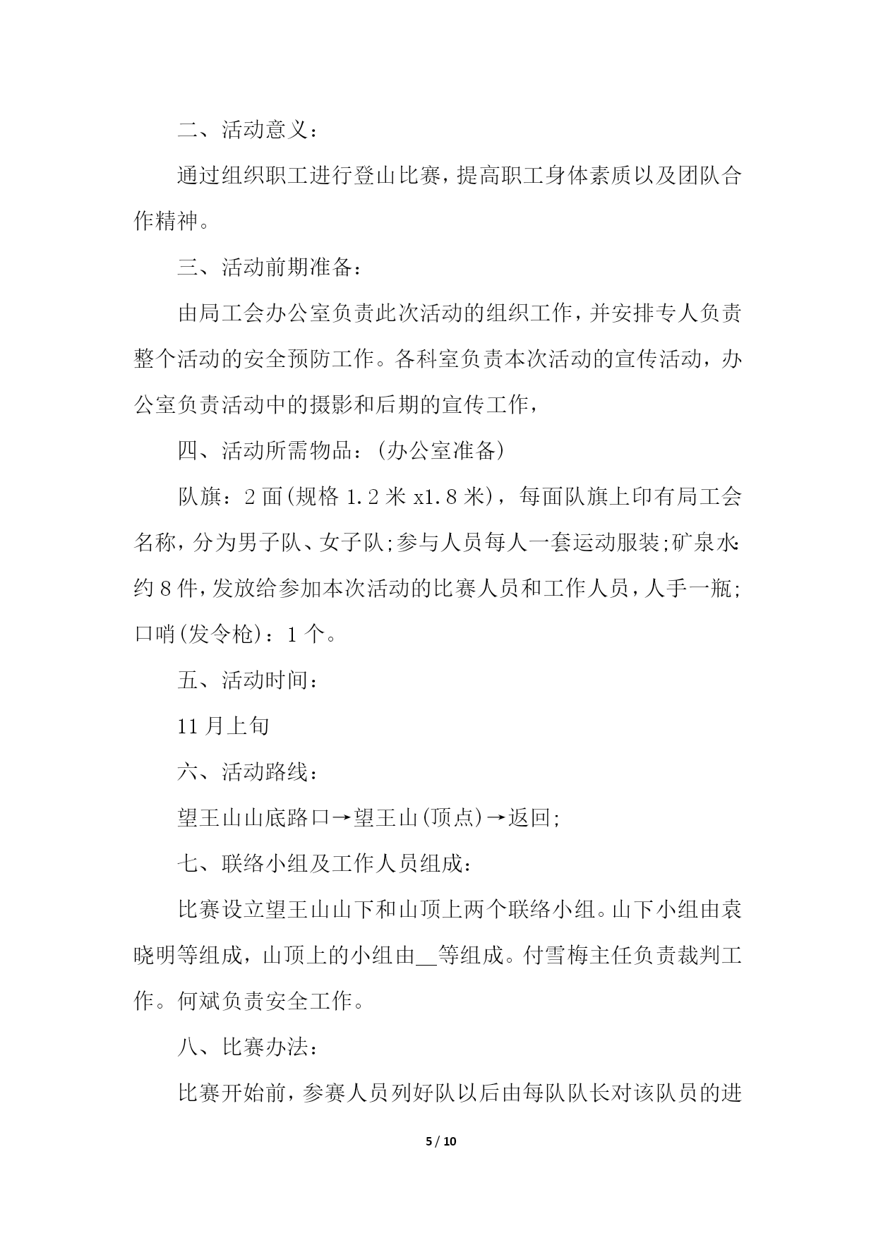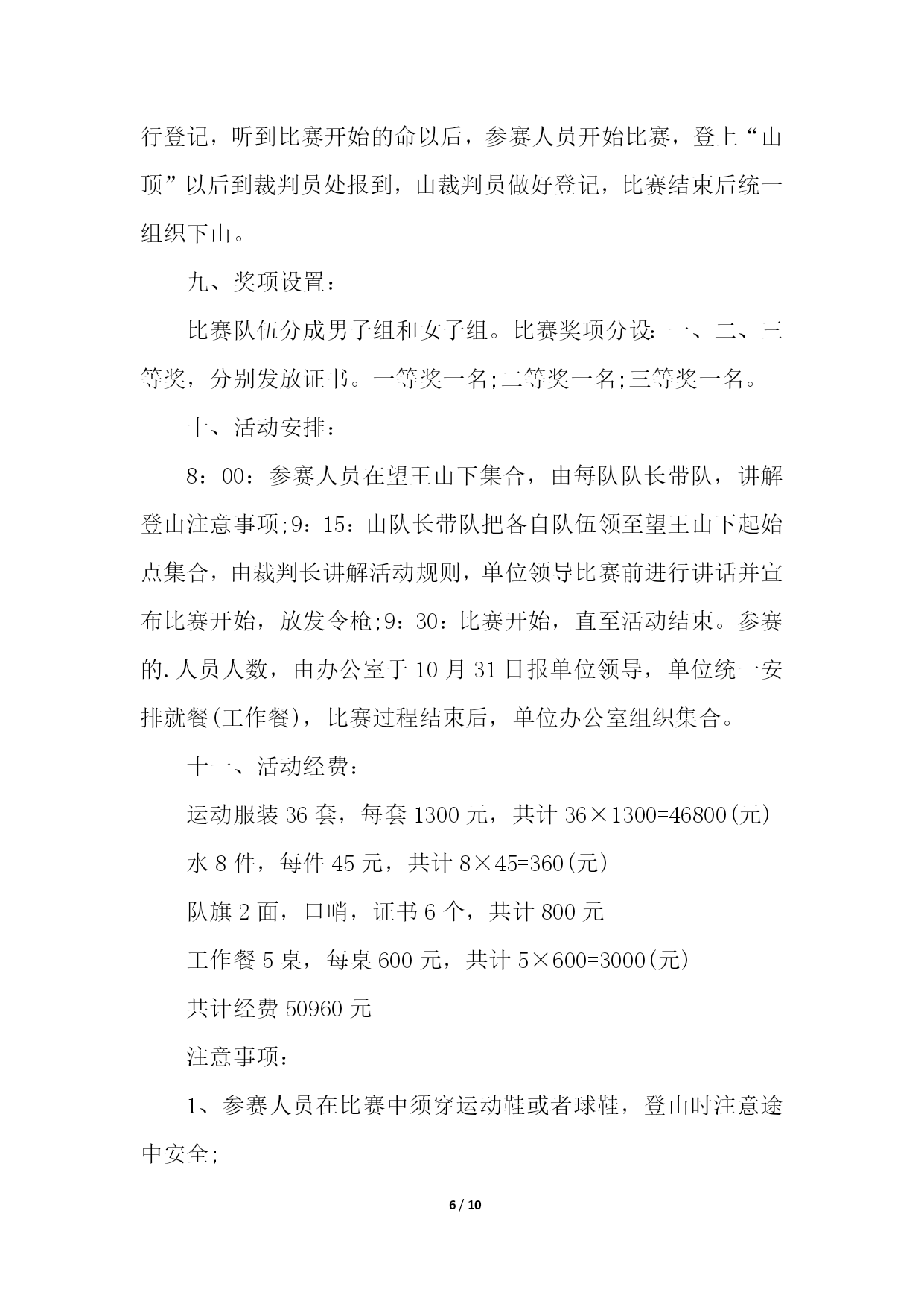 PAGE10/NUMPAGES10组织户外登山活动方案组织户外登山活动方案1活动目的:为了锻炼员工身体,提高员工的身体锻炼意识,丰富员工的业余生活,适当舒缓压力,同时也为促进员工竞争意识,培养思考和沟通交流能力。活动时间:待定活动地点:海宁东山参与人员:王建林、平明红、徐丽华、朱礼忠、王欧琼、王华、徐华成、吴燕、潘佳锋具体方案:1.爬山活动需到达提前给定的多个景点,手机自拍参照物予以确认,按到达准确个数给分2.到达几个预定景点后可登顶,按先后顺序给分.3.附加分,爬山过程中和游客合照给予附加奖励分数。照片标准?计分标准如下图:预定景点到达分共5处,每处10分登顶名次记分按先后顺序第一50分,第二45分依次递减游客合影加分每一张认为有效照片得2分,最多五张得11分。具体的行程安排如下:13:00行政楼集合出发(王总,潘佳锋的车)13:40到达东山,宣布规则,以及注意事项。14:0014:30预定地点熟悉15:00比赛开始16:00山顶集合休整17:00公司聚餐、颁奖活动以及导演评分注意事项:1.要求统一穿工作服,携带华韵的彩旗。2.手机电量情况3.智标塔门口为本次比赛终点4.请维护好公司形象5.注意安全,保管好自己随身物品。6.按指定时间集合,随时保持电话畅通。组织户外登山活动方案2一、活动意义:为了丰富信科院学生课余文化生活,提高学生综合素质,展现当代大学生风貌,以强身健体,弘扬体育精神为宗旨,增强学校同学间的凝聚力。二、活动组织:信科院13级计算机科学与技术系文体股三、活动安排:1.比赛时间:20xx年12月28日(周日)下午1点2.比赛地点:岳x四、活动办法及注意事项:1.每四人分成一组(两男两女随机分组),再将一组分为A、B两队(一男一女一队)2.各位同学请于12月20日之前提交报名表,逾期不候3.参赛者可以自备地图,举办方不提供地图4.比赛将于1点正式开始,各位同学请于12点30签到等候,比赛开始后未到视为放弃5.公布参赛者的名单及分配时,不会公布四人小组的成员,而是只公布A、B两队的成员6.活动起点:东方红广场活动终点:岳麓山顶观光车停车场五、活动内容及流程:1.赛前准备:参赛队员随机分组,每四人分为一组,每一组两男两女(多余的人一组即可);将每一组分为A、B两队,每队一男一女;每组随机分配一组暗号,一组暗号由对应的两句上下句组成,分别在A、B队手中。B队参赛者在岳麓书院门口集合,由负责人领入岳麓书院并且随机分配位置,A队在东方红广场集合。集合完毕后,给A队纷发任务卡和一个垃圾袋,可以在路上捡取塑料袋和饮料瓶,一个塑料袋或一个饮料瓶各减5秒。2.比赛第一部分:A队进入书院并且根据暗号找到本组的B队(暗号每队都只知道一半,要根据询问,判断暗号能否对接,比赛前对应的A、B队互相不知道对方是谁)两队汇合后由岳麓书院后门穿出,开始登山。3.比赛第二部分:到相应的景点处完成任务(顺序、路线不定)。五个关卡分别设立在:五轮塔(绑腿跑)、翊武亭(我爱记歌词)、穿石坡湖茶室(你画我猜)、白鹤泉(脑筋急转弯)、鸟语林(大胃王)。各组拿好任务卡,每通过一个关卡编写一个盖章,集满五个章才能跑向终点。4.比赛第三部部分:登山途中各个景点牌周围有事先放好的信封,里面可能装有珍贵的“pass卡”(帮助大家在紧急时候过一关),也可能装有“空卡”。队员在登山途中可选择寻找这些信封以渡过难关。5.关卡具体内容:脑筋急转弯选择答题:连续答题直到答对2道方可过关。选择放弃:拥有pass卡可以无条件放弃本关;无pass卡则要接受惩罚。女生坐在男生的背上,男生做15个俯卧撑。如若犯规,加罚10个。完成惩罚方可过关。你画我猜选择答题:连续答题知道答对5道题方可过关。可以提示字数,但只能通过手势表达不许说话。选择放弃:拥有pass卡可以无条件放弃本关;无pass卡则要接受惩罚。女生坐在男生的背上,男生做10个俯卧撑。如若犯规,加罚10个。完成惩罚方可过关。注:当五个关卡全部完成后,方可拿着任务卡去终点处报道。组织户外登山活动方案3一、活动题目:《工会单位职工第一届健身登山比赛》二、活动意义:通过组织职工进行登山比赛,提高职工身体素质以及团队合作精神。三、活动前期准备:由局工会办公室负责此次活动的组织工作,并安排专人负责整个活动的安全预防工作。各科室负责本次活动的宣传活动,办公室负责活动中的摄影和后期的宣传工作,四、活动所需物品:(办公室准备)队旗:2面(规格1.2米x1.8米),每面队旗上印有局工会名称,分为男子队、女子队;参与人员每人一套运动服装;矿泉水:约8件,发放给参加本次活动的比赛人员和工作人员,人手一瓶;口哨(发令枪):1个。五、活动时间:11月上旬六、活动路线:望王山山底路口→望王山(顶点)→返回;七、联络小组及工作人员组成:比赛