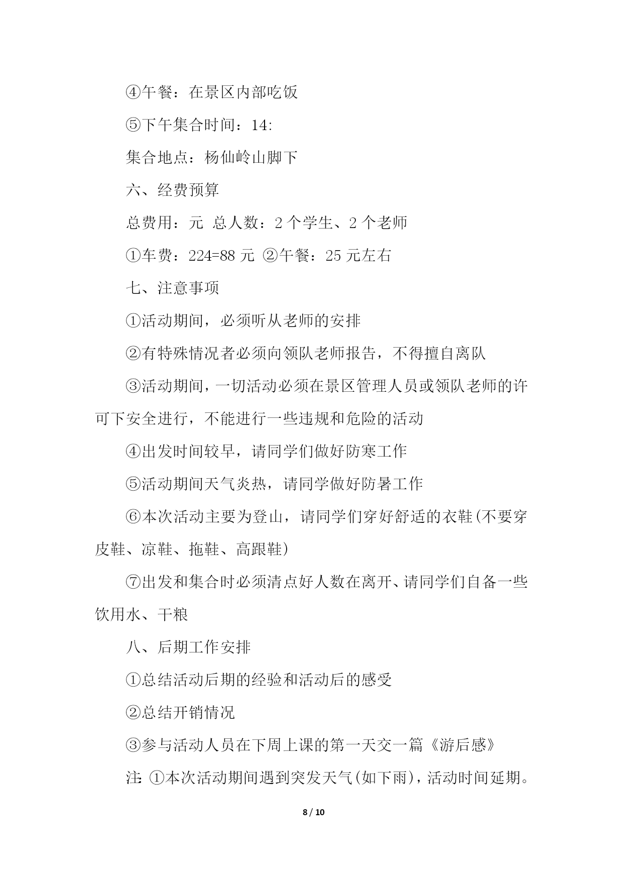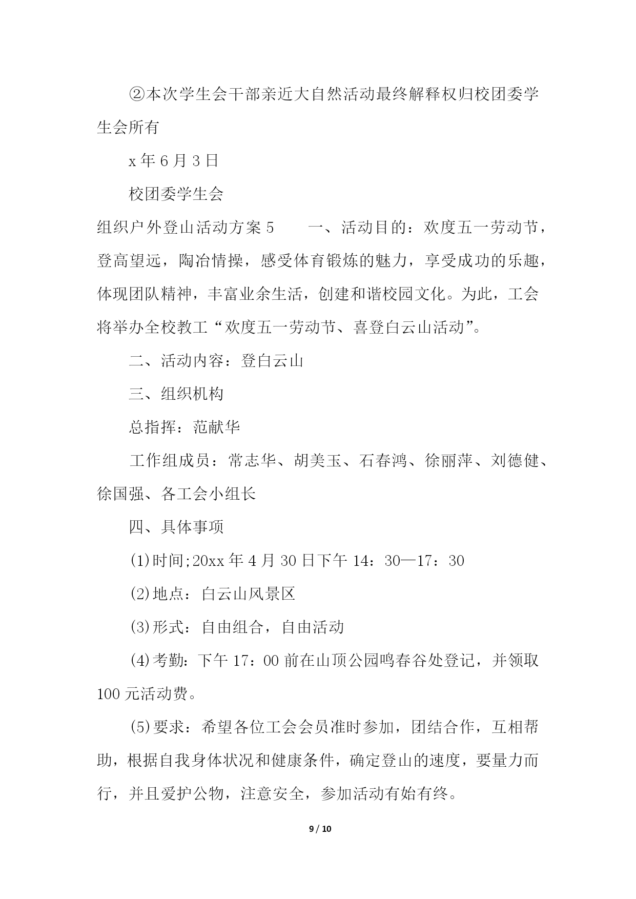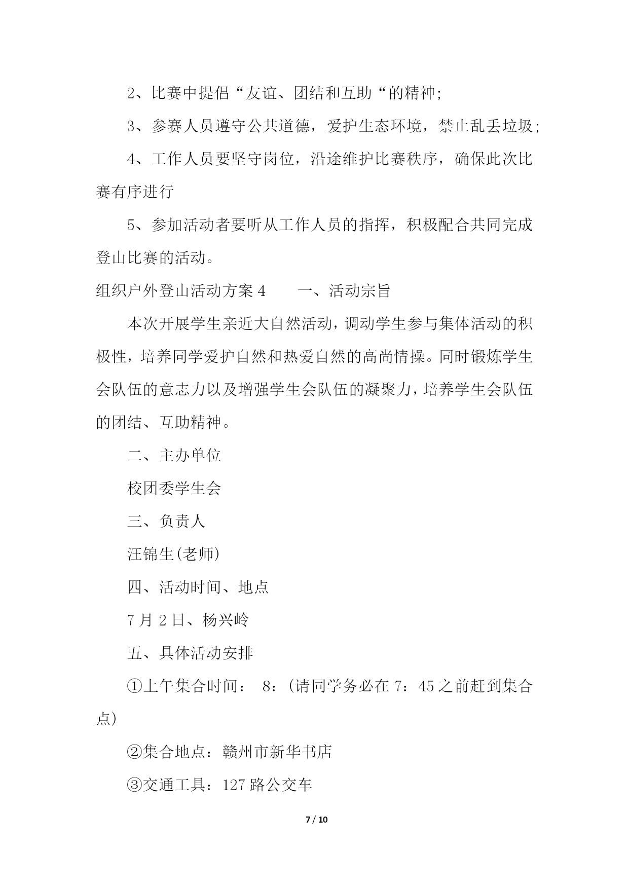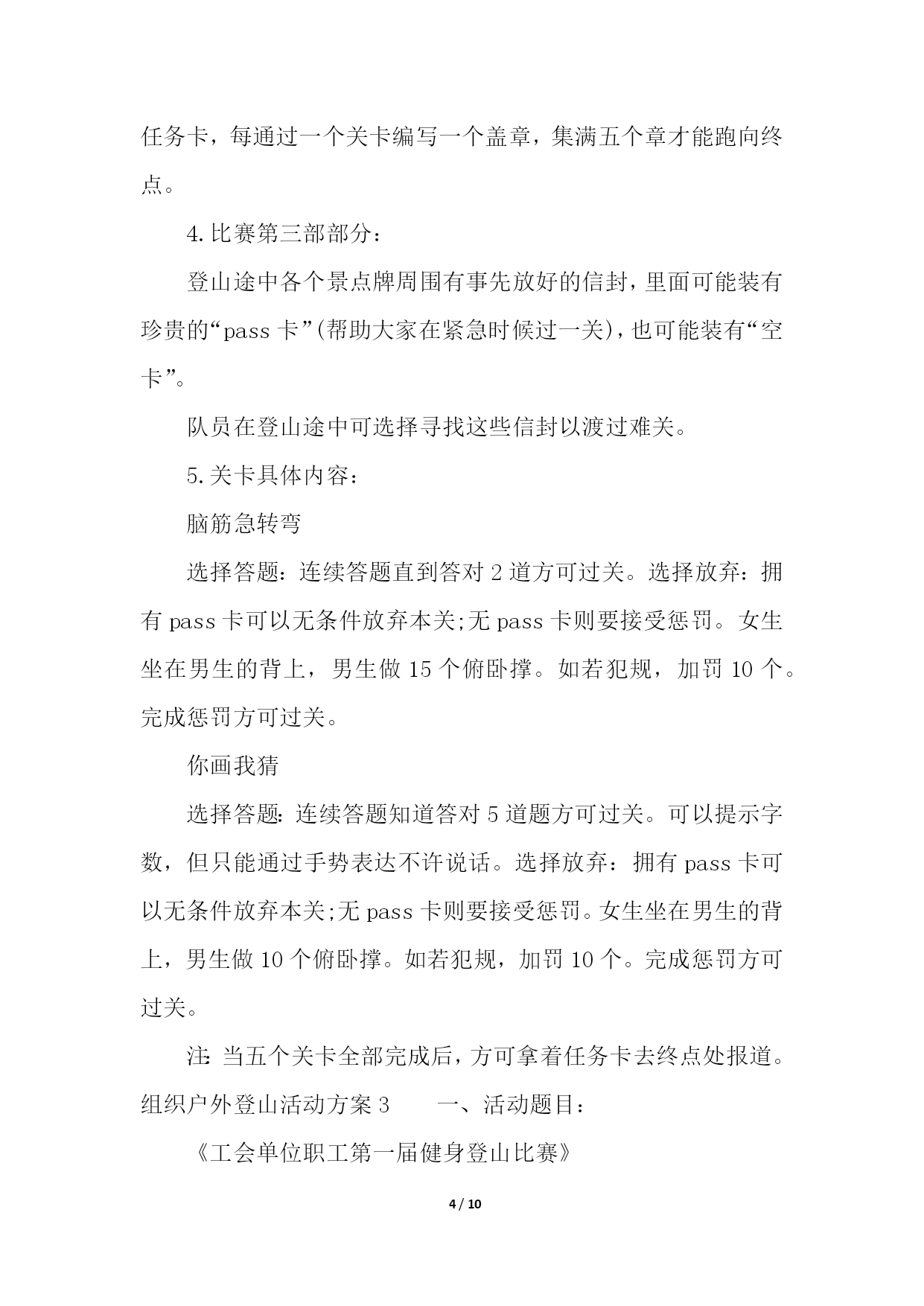 PAGE10/NUMPAGES10组织户外登山活动方案组织户外登山活动方案1活动目的:为了锻炼员工身体,提高员工的身体锻炼意识,丰富员工的业余生活,适当舒缓压力,同时也为促进员工竞争意识,培养思考和沟通交流能力。活动时间:待定活动地点:海宁东山参与人员:王建林、平明红、徐丽华、朱礼忠、王欧琼、王华、徐华成、吴燕、潘佳锋具体方案:1.爬山活动需到达提前给定的多个景点,手机自拍参照物予以确认,按到达准确个数给分2.到达几个预定景点后可登顶,按先后顺序给分.3.附加分,爬山过程中和游客合照给予附加奖励分数。照片标准?计分标准如下图:预定景点到达分共5处,每处10分登顶名次记分按先后顺序第一50分,第二45分依次递减游客合影加分每一张认为有效照片得2分,最多五张得11分。具体的行程安排如下:13:00行政楼集合出发(王总,潘佳锋的车)13:40到达东山,宣布规则,以及注意事项。14:0014:30预定地点熟悉15:00比赛开始16:00山顶集合休整17:00公司聚餐、颁奖活动以及导演评分注意事项:1.要求统一穿工作服,携带华韵的彩旗。2.手机电量情况3.智标塔门口为本次比赛终点4.请维护好公司形象5.注意安全,保管好自己随身物品。6.按指定时间集合,随时保持电话畅通。组织户外登山活动方案2一、活动意义:为了丰富信科院学生课余文化生活,提高学生综合素质,展现当代大学生风貌,以强身健体,弘扬体育精神为宗旨,增强学校同学间的凝聚力。二、活动组织:信科院13级计算机科学与技术系文体股三、活动安排:1.比赛时间:20xx年12月28日(周日)下午1点2.比赛地点:岳x四、活动办法及注意事项:1.每四人分成一组(两男两女随机分组),再将一组分为A、B两队(一男一女一队)2.各位同学请于12月20日之前提交报名表,逾期不候3.参赛者可以自备地图,举办方不提供地图4.比赛将于1点正式开始,各位同学请于12点30签到等候,比赛开始后未到视为放弃5.公布参赛者的名单及分配时,不会公布四人小组的成员,而是只公布A、B两队的成员6.活动起点:东方红广场活动终点:岳麓山顶观光车停车场五、活动内容及流程:1.赛前准备:参赛队员随机分组,每四人分为一组,每一组两男两女(多余的人一组即可);将每一组分为A、B两队,每队一男一女;每组随机分配一组暗号,一组暗号由对应的两句上下句组成,分别在A、B队手中。B队参赛者在岳麓书院门口集合,由负责人领入岳麓书院并且随机分配位置,A队在东方红广场集合。集合完毕后,给A队纷发任务卡和一个垃圾袋,可以在路上捡取塑料袋和饮料瓶,一个塑料袋或一个饮料瓶各减5秒。2.比赛第一部分:A队进入书院并且根据暗号找到本组的B队(暗号每队都只知道一半,要根据询问,判断暗号能否对接,比赛前对应的A、B队互相不知道对方是谁)两队汇合后由岳麓书院后门穿出,开始登山。3.比赛第二部分:到相应的景点处完成任务(顺序、路线不定)。五个关卡分别设立在:五轮塔(绑腿跑)、翊武亭(我爱记歌词)、穿石坡湖茶室(你画我猜)、白鹤泉(脑筋急转弯)、鸟语林(大胃王)。各组拿好任务卡,每通过一个关卡编写一个盖章,集满五个章才能跑向终点。4.比赛第三部部分:登山途中各个景点牌周围有事先放好的信封,里面可能装有珍贵的“pass卡”(帮助大家在紧急时候过一关),也可能装有“空卡”。队员在登山途中可选择寻找这些信封以渡过难关。5.关卡具体内容:脑筋急转弯选择答题:连续答题直到答对2道方可过关。选择放弃:拥有pass卡可以无条件放弃本关;无pass卡则要接受惩罚。女生坐在男生的背上,男生做15个俯卧撑。如若犯规,加罚10个。完成惩罚方可过关。你画我猜选择答题:连续答题知道答对5道题方可过关。可以提示字数,但只能通过手势表达不许说话。选择放弃:拥有pass卡可以无条件放弃本关;无pass卡则要接受惩罚。女生坐在男生的背上,男生做10个俯卧撑。如若犯规,加罚10个。完成惩罚方可过关。注:当五个关卡全部完成后,方可拿着任务卡去终点处报道。组织户外登山活动方案3一、活动题目:《工会单位职工第一届健身登山比赛》二、活动意义:通过组织职工进行登山比赛,提高职工身体素质以及团队合作精神。三、活动前期准备:由局工会办公室负责此次活动的组织工作,并安排专人负责整个活动的安全预防工作。各科室负责本次活动的宣传活动,办公室负责活动中的摄影和后期的宣传工作,四、活动所需物品:(办公室准备)队旗:2面(规格1.2米x1.8米),每面队旗上印有局工会名称,分为男子队、女子队;参与人员每人一套运动服装;矿泉水:约8件,发放给参加本次活动的比赛人员和工作人员,人手一瓶;口哨(发令枪):1个。五、活动时间:11月上旬六、活动路线:望王山山底路口→望王山(顶点)→返回;七、联络小组及工作人员组成:比赛