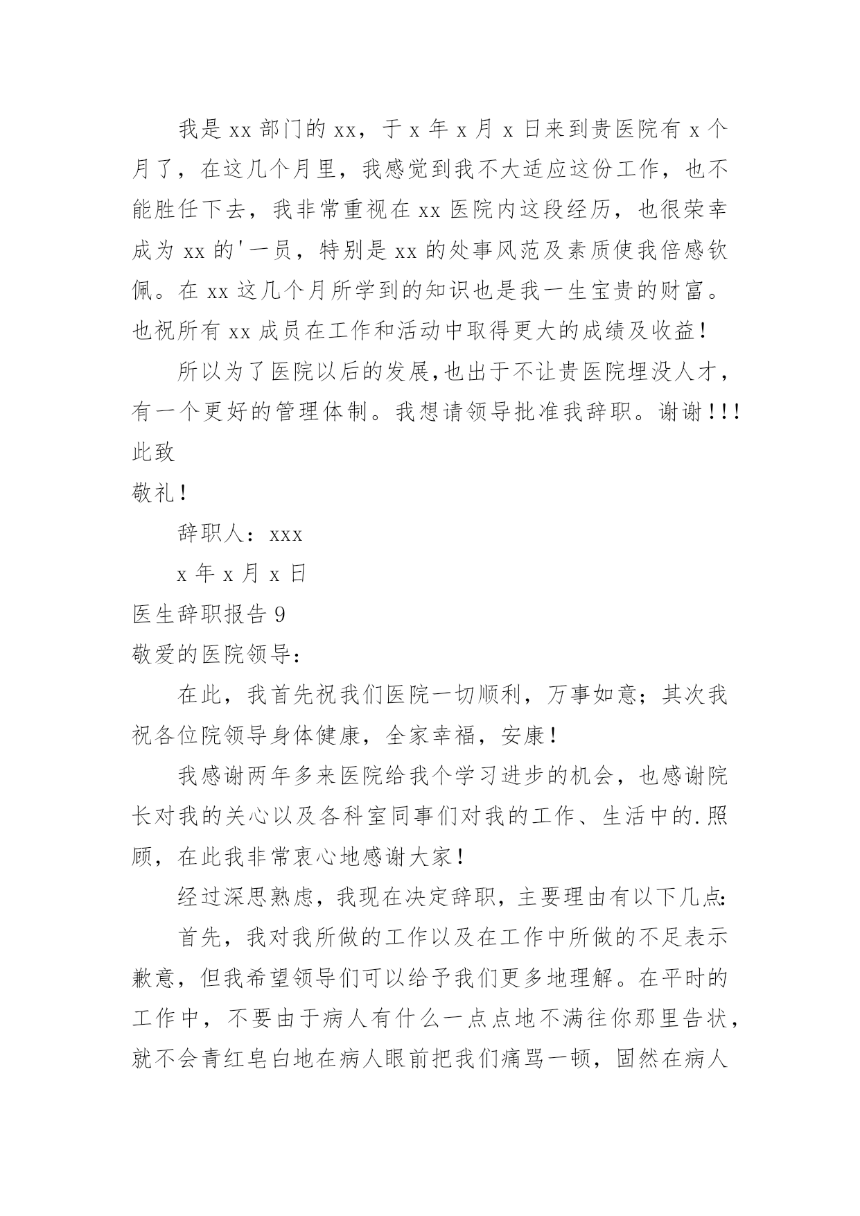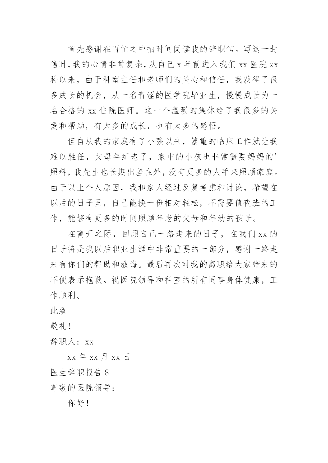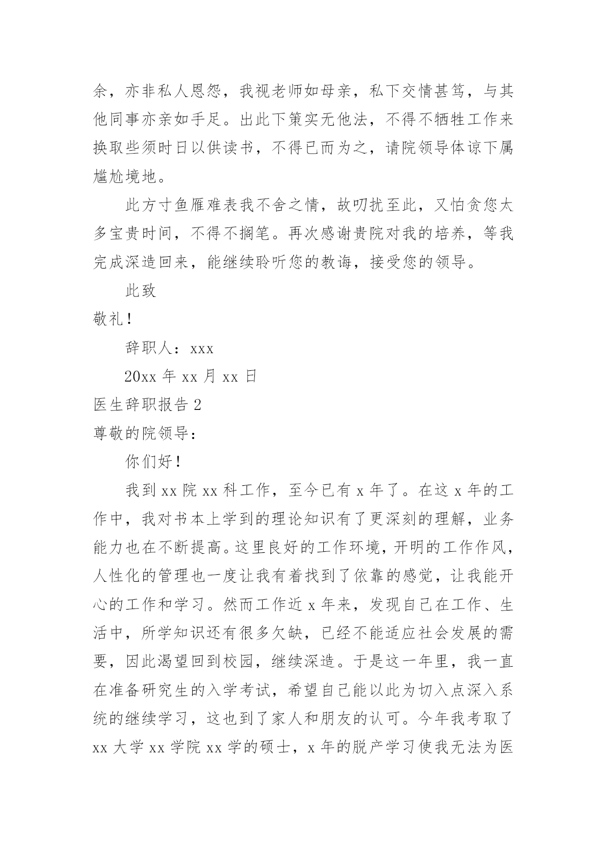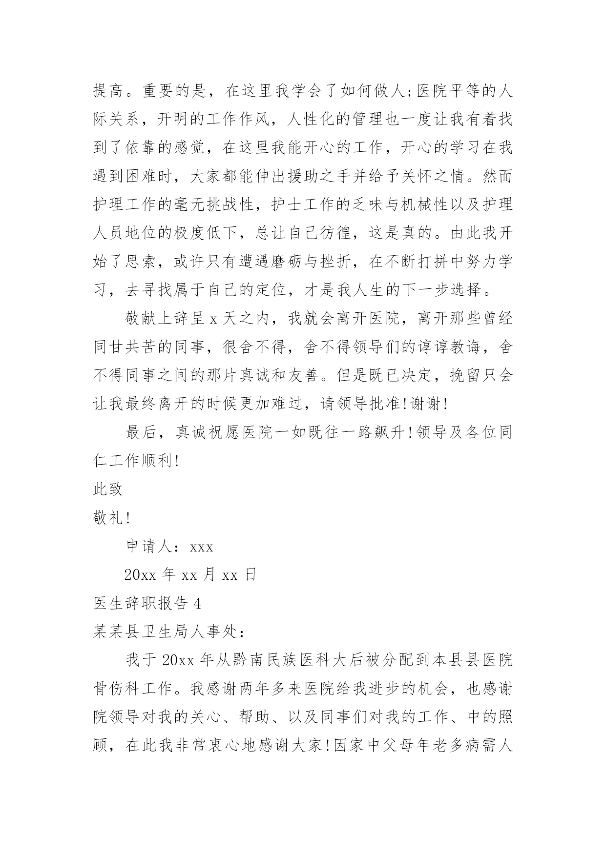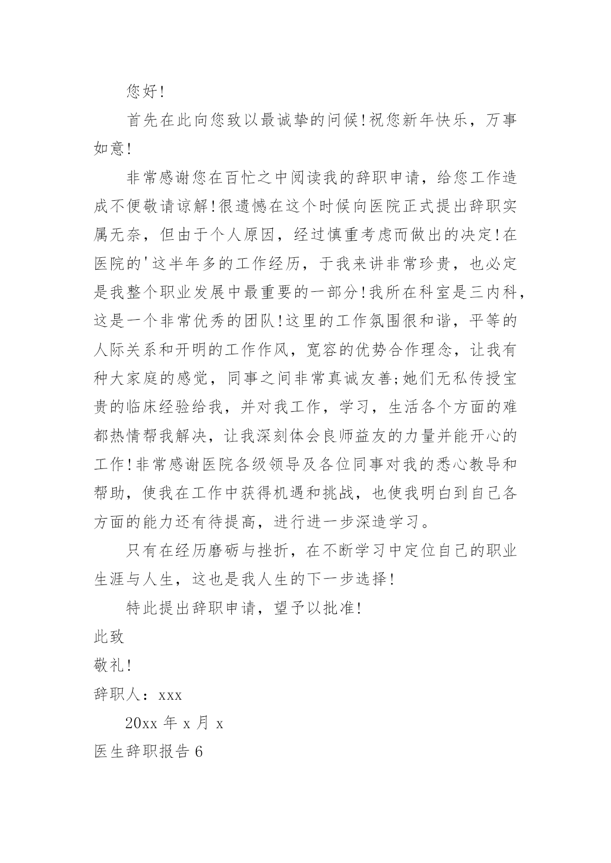 医生辞职报告医生辞职报告15篇在不断进步的时代,报告不再是罕见的东西,报告中涉及到专业性术语要解释清楚。你所见过的报告是什么样的呢?下面是小编收集整理的医生辞职报告,欢迎大家分享。医生辞职报告1尊敬的xx医院领导:您好!我非常感谢您能在百忙之中查阅这封信函。我是本院口腔科的一名大夫,自20xx年x月x日在我院工作至今,同志们之间相互关心相互帮助的氛围让我深深感动,工作中更有韩老师无私相授宝贵临床经验,并对我的工作、学习和生活个方面的谆谆教诲,如春风拂面,让我受益匪浅,不禁暗自庆幸当初选择了我院作为我工作生涯的第一站。窃喜之余,随着工作中接触的各种病症,逐渐彰显出我的知识的匮乏,逼迫我产生了进入高等学府再次深造的想法,于是我的人生规划与目前的全职工作发生了冲突,我之前也曾经尝试过其他的.规避矛盾的措施,结果都无法缓和工作时间和学习时间相冲突的矛盾,考虑再三,痛下决心,遂不得已提出辞职的请求。此次离职并非经济原因,薪水虽不高,对我已然绰绰有余,亦非私人恩怨,我视老师如母亲,私下交情甚笃,与其他同事亦亲如手足。出此下策实无他法,不得不牺牲工作来换取些须时日以供读书,不得已而为之,请院领导体谅下属尴尬境地。此方寸鱼雁难表我不舍之情,故叨扰至此,又怕贪您太多宝贵时间,不得不搁笔。再次感谢贵院对我的培养,等我完成深造回来,能继续聆听您的教诲,接受您的领导。此致敬礼!辞职人:xxx20xx年xx月xx日医生辞职报告2尊敬的院领导:你们好!我到xx院xx科工作,至今已有x年了。在这x年的工作中,我对书本上学到的理论知识有了更深刻的理解,业务能力也在不断提高。这里良好的工作环境,开明的工作作风,人性化的管理也一度让我有着找到了依靠的感觉,让我能开心的工作和学习。然而工作近x年来,发现自己在工作、生活中,所学知识还有很多欠缺,已经不能适应社会发展的需要,因此渴望回到校园,继续深造。于是这一年里,我一直在准备研究生的入学考试,希望自己能以此为切入点深入系统的继续学习,这也到了家人和朋友的认可。今年我考取了xx大学xx学院xx学的硕士,x年的脱产学习使我无法为医院继续工作,经过深刻冷静的思考后,我决定辞去在医院的工作,专心完成好我的学业。希望医院能够体恤我的'个人实际,对我的申请予以考虑并批准,在正式离开之前我将认真继续做好目前的每一项工作。非常感谢医院领导在这段时间里对我的教导和照顾。在医院的这段经历于我而言非常珍贵。将来无论什么时候,我都会为自己曾经是医院的一员而感到荣幸。我确信在医院的这段工作经历将是我整个职业生涯发展中相当重要的一部分。祝医院领导和所有同事身体健康、工作顺利,并祝愿医院的发展蒸蒸日上,宏图大展。此致敬礼!辞职人:xx20xx年xx月xx日医生辞职报告3尊敬的领导:您好!你们好!很遗憾在这个时候向医院正式提出辞职,我是怀着极其复杂的心情写下这份辞职申请的,请相信我,这并非一时冲动,而是我经过慎重考虑所做出的决定。来到医院已经x年多了,正是在这里我开始踏上了社会,完成了自己从一个学生到社会人的转变。可以说,我人生中最美好的时光是在这里度过的,x年的.学习,使我对以前书本上学到的理论知识有了更深刻的理解,业务能力也在不断提高。重要的是,在这里我学会了如何做人;医院平等的人际关系,开明的工作作风,人性化的管理也一度让我有着找到了依靠的感觉,在这里我能开心的工作,开心的学习在我遇到困难时,大家都能伸出援助之手并给予关怀之情。然而护理工作的毫无挑战性,护士工作的乏味与机械性以及护理人员地位的极度低下,总让自己彷徨,这是真的。由此我开始了思索,或许只有遭遇磨砺与挫折,在不断打拼中努力学习,去寻找属于自己的定位,才是我人生的下一步选择。敬献上辞呈x天之内,我就会离开医院,离开那些曾经同甘共苦的同事,很舍不得,舍不得领导们的谆谆教诲,舍不得同事之间的那片真诚和友善。但是既已决定,挽留只会让我最终离开的时候更加难过,请领导批准!谢谢!最后,真诚祝愿医院一如既往一路飙升!领导及各位同仁工作顺利!此致敬礼!申请人:xxx20xx年xx月xx日医生辞职报告4某某县卫生局人事处:我于20xx年从黔南民族医科大后被分配到本县县医院骨伤科工作。我感谢两年多来医院给我进步的机会,也感谢院领导对我的关心、帮助、以及同事们对我的工作、中的照顾,在此我非常衷心地感谢大家!因家中父母年老多病需人照料,又因我与爱人长期两地等实际困难,现向领导提出辞去现职,返回家乡工作的'请求。我的家乡在某某省某某县某某乡。父亲现年75岁,因长年辛劳,腰椎疼痛,衣食不能自理;母亲现年70岁,除了耕田种地外,还要照料我父亲和打理整个家屋,再加上她也已是年过半百的人了,身体不太好且行动不便。我于20xx年结婚,爱人在家务农,现又怀有身孕,由于我在外地工作,家中照顾两位老人和其它轻重家务劳