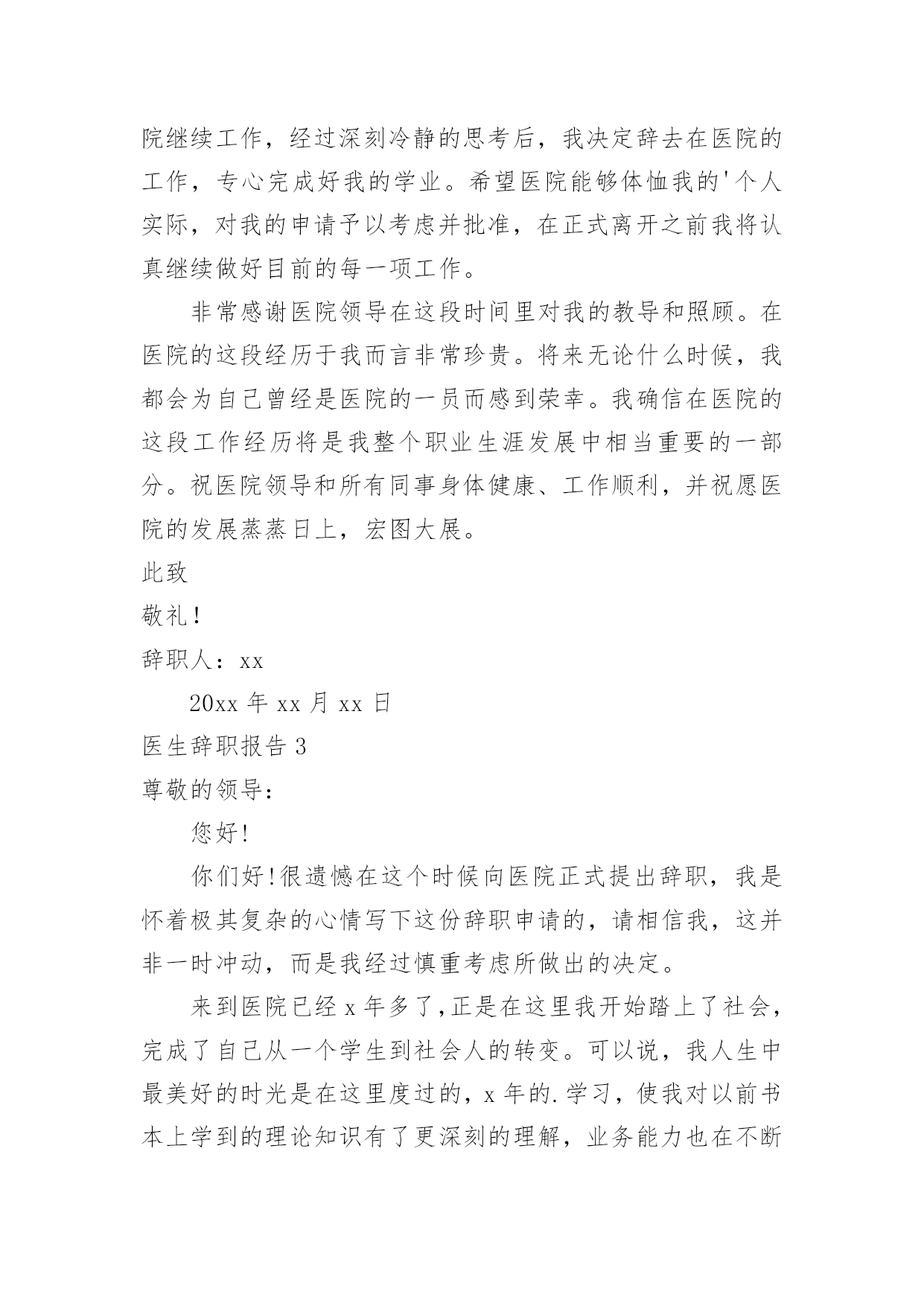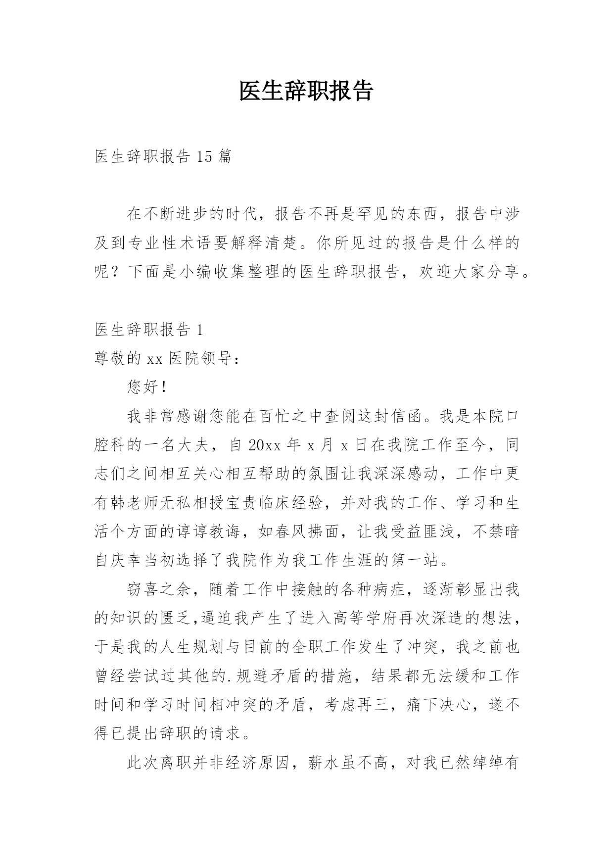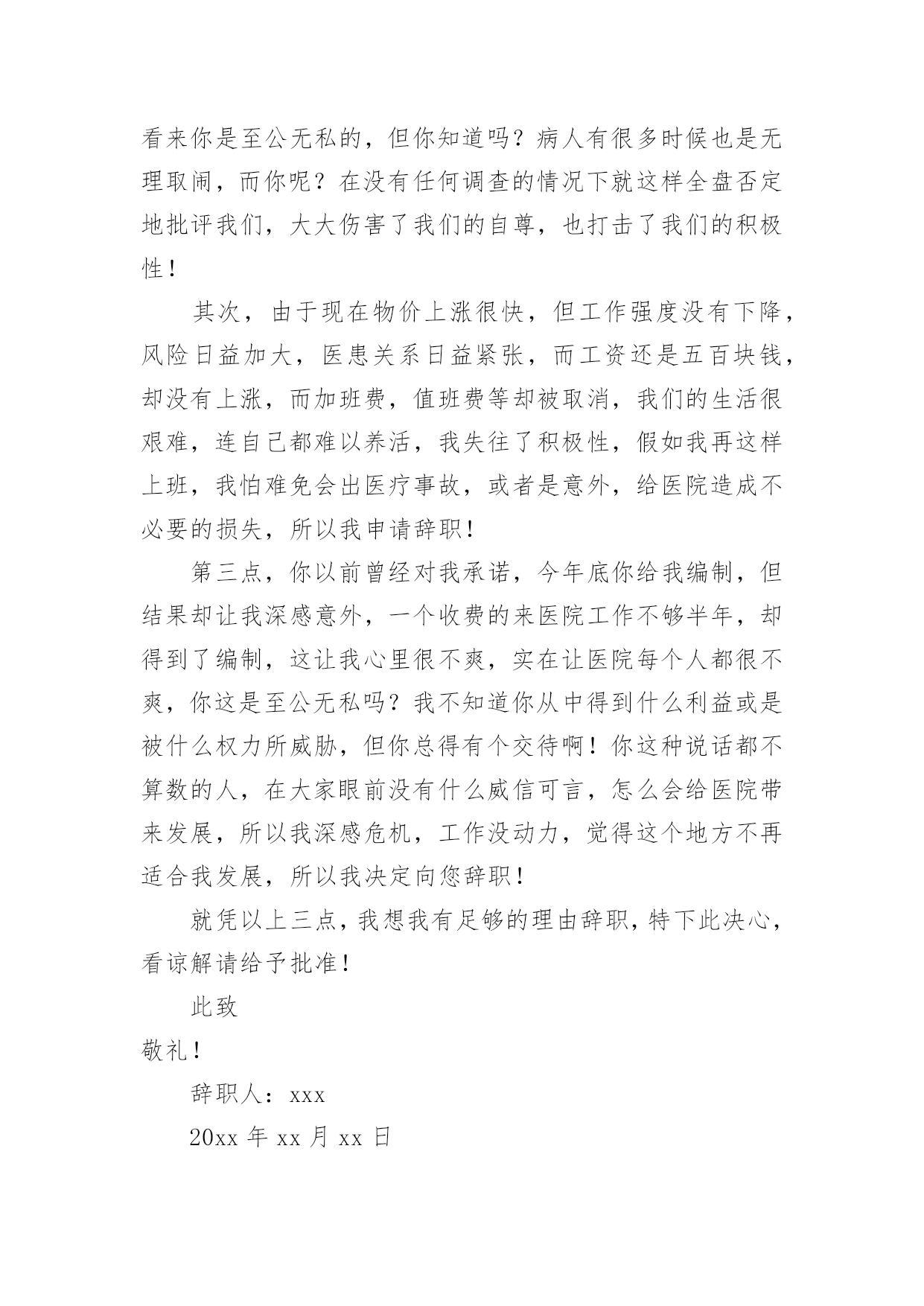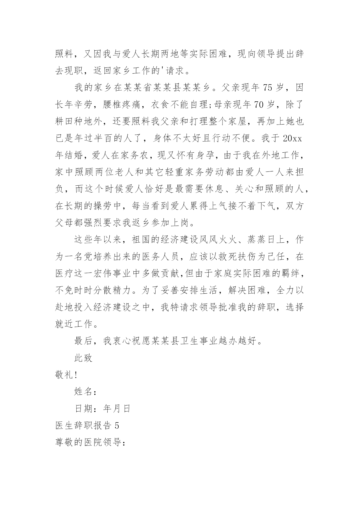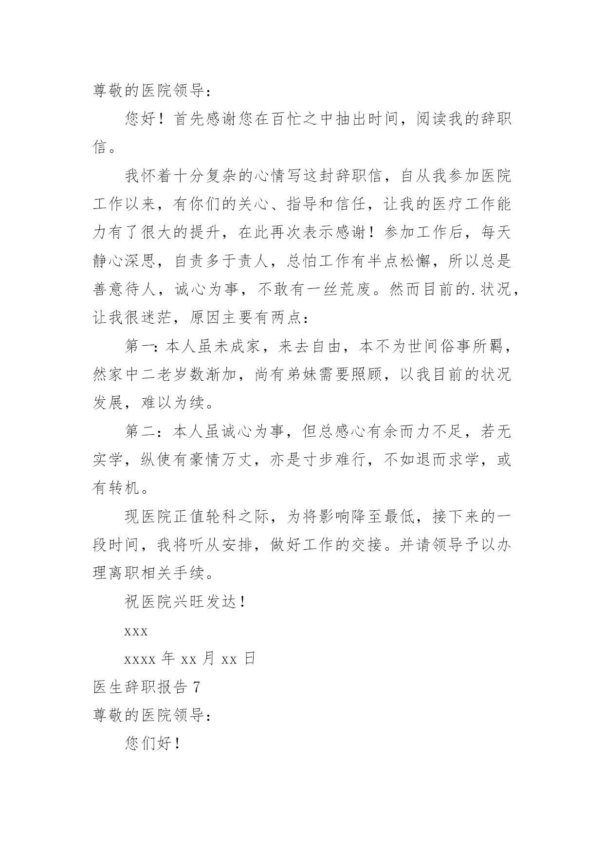 医生辞职报告医生辞职报告15篇在不断进步的时代,报告不再是罕见的东西,报告中涉及到专业性术语要解释清楚。你所见过的报告是什么样的呢?下面是小编收集整理的医生辞职报告,欢迎大家分享。医生辞职报告1尊敬的xx医院领导:您好!我非常感谢您能在百忙之中查阅这封信函。我是本院口腔科的一名大夫,自20xx年x月x日在我院工作至今,同志们之间相互关心相互帮助的氛围让我深深感动,工作中更有韩老师无私相授宝贵临床经验,并对我的工作、学习和生活个方面的谆谆教诲,如春风拂面,让我受益匪浅,不禁暗自庆幸当初选择了我院作为我工作生涯的第一站。窃喜之余,随着工作中接触的各种病症,逐渐彰显出我的知识的匮乏,逼迫我产生了进入高等学府再次深造的想法,于是我的人生规划与目前的全职工作发生了冲突,我之前也曾经尝试过其他的.规避矛盾的措施,结果都无法缓和工作时间和学习时间相冲突的矛盾,考虑再三,痛下决心,遂不得已提出辞职的请求。此次离职并非经济原因,薪水虽不高,对我已然绰绰有余,亦非私人恩怨,我视老师如母亲,私下交情甚笃,与其他同事亦亲如手足。出此下策实无他法,不得不牺牲工作来换取些须时日以供读书,不得已而为之,请院领导体谅下属尴尬境地。此方寸鱼雁难表我不舍之情,故叨扰至此,又怕贪您太多宝贵时间,不得不搁笔。再次感谢贵院对我的培养,等我完成深造回来,能继续聆听您的教诲,接受您的领导。此致敬礼!辞职人:xxx20xx年xx月xx日医生辞职报告2尊敬的院领导:你们好!我到xx院xx科工作,至今已有x年了。在这x年的工作中,我对书本上学到的理论知识有了更深刻的理解,业务能力也在不断提高。这里良好的工作环境,开明的工作作风,人性化的管理也一度让我有着找到了依靠的感觉,让我能开心的工作和学习。然而工作近x年来,发现自己在工作、生活中,所学知识还有很多欠缺,已经不能适应社会发展的需要,因此渴望回到校园,继续深造。于是这一年里,我一直在准备研究生的入学考试,希望自己能以此为切入点深入系统的继续学习,这也到了家人和朋友的认可。今年我考取了xx大学xx学院xx学的硕士,x年的脱产学习使我无法为医院继续工作,经过深刻冷静的思考后,我决定辞去在医院的工作,专心完成好我的学业。希望医院能够体恤我的'个人实际,对我的申请予以考虑并批准,在正式离开之前我将认真继续做好目前的每一项工作。非常感谢医院领导在这段时间里对我的教导和照顾。在医院的这段经历于我而言非常珍贵。将来无论什么时候,我都会为自己曾经是医院的一员而感到荣幸。我确信在医院的这段工作经历将是我整个职业生涯发展中相当重要的一部分。祝医院领导和所有同事身体健康、工作顺利,并祝愿医院的发展蒸蒸日上,宏图大展。此致敬礼!辞职人:xx20xx年xx月xx日医生辞职报告3尊敬的领导:您好!你们好!很遗憾在这个时候向医院正式提出辞职,我是怀着极其复杂的心情写下这份辞职申请的,请相信我,这并非一时冲动,而是我经过慎重考虑所做出的决定。来到医院已经x年多了,正是在这里我开始踏上了社会,完成了自己从一个学生到社会人的转变。可以说,我人生中最美好的时光是在这里度过的,x年的.学习,使我对以前书本上学到的理论知识有了更深刻的理解,业务能力也在不断提高。重要的是,在这里我学会了如何做人;医院平等的人际关系,开明的工作作风,人性化的管理也一度让我有着找到了依靠的感觉,在这里我能开心的工作,开心的学习在我遇到困难时,大家都能伸出援助之手并给予关怀之情。然而护理工作的毫无挑战性,护士工作的乏味与机械性以及护理人员地位的极度低下,总让自己彷徨,这是真的。由此我开始了思索,或许只有遭遇磨砺与挫折,在不断打拼中努力学习,去寻找属于自己的定位,才是我人生的下一步选择。敬献上辞呈x天之内,我就会离开医院,离开那些曾经同甘共苦的同事,很舍不得,舍不得领导们的谆谆教诲,舍不得同事之间的那片真诚和友善。但是既已决定,挽留只会让我最终离开的时候更加难过,请领导批准!谢谢!最后,真诚祝愿医院一如既往一路飙升!领导及各位同仁工作顺利!此致敬礼!申请人:xxx20xx年xx月xx日医生辞职报告4某某县卫生局人事处:我于20xx年从黔南民族医科大后被分配到本县县医院骨伤科工作。我感谢两年多来医院给我进步的机会,也感谢院领导对我的关心、帮助、以及同事们对我的工作、中的照顾,在此我非常衷心地感谢大家!因家中父母年老多病需人照料,又因我与爱人长期两地等实际困难,现向领导提出辞去现职,返回家乡工作的'请求。我的家乡在某某省某某县某某乡。父亲现年75岁,因长年辛劳,腰椎疼痛,衣食不能自理;母亲现年70岁,除了耕田种地外,还要照料我父亲和打理整个家屋,再加上她也已是年过半百的人了,身体不太好且行动不便。我于20xx年结婚,爱人在家务农,现又怀有身孕,由于我在外地工作,家中照顾两位老人和其它轻重家务劳