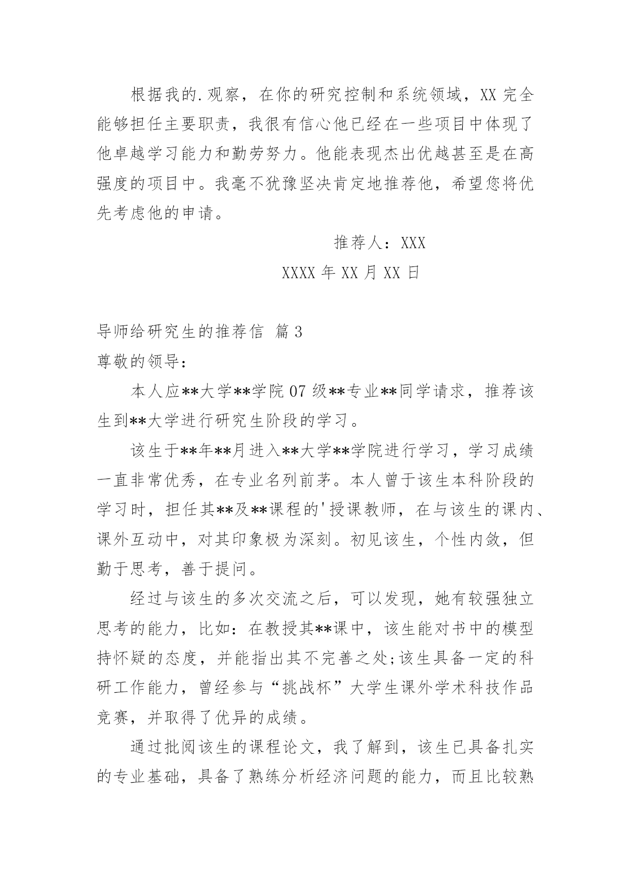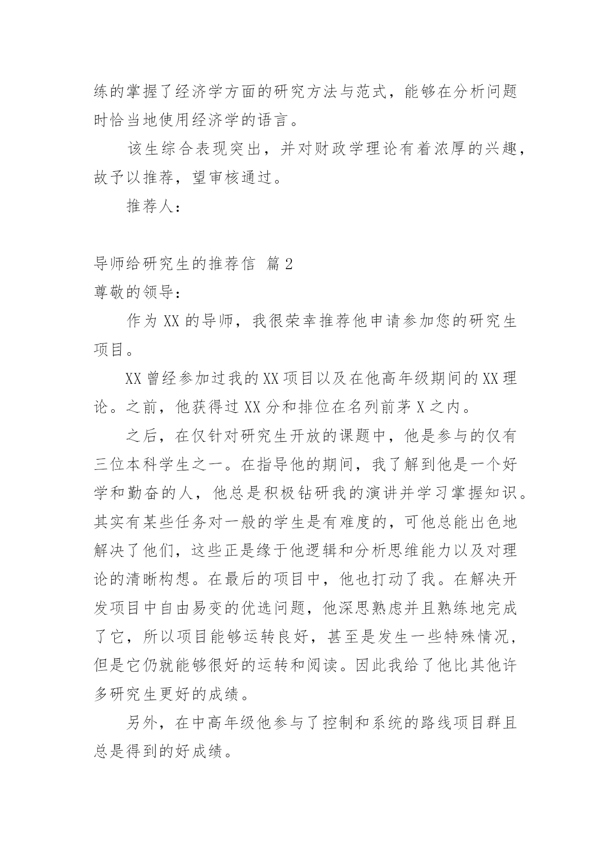 导师给研究生的推荐信精选导师给研究生的推荐信三篇在现实生活中,推荐信对我们的作用越来越大,不同种类的推荐信具有不同的用途。推荐信的注意事项有许多,你确定会写吗?以下是小编精心整理的导师给研究生的推荐信4篇,欢迎阅读与收藏。导师给研究生的推荐信篇1推荐信本人应**大学**学院07级**专业**同学请求,推荐该生到**大学进行研究生阶段的学习。该生于**年**月进入**大学**学院进行学习,学习成绩一直非常优秀,在专业名列前茅。本人曾于该生本科阶段的学习时,担任其**及**课程的授课教师,在与该生的`课内、课外互动中,对其印象极为深刻。初见该生,个性内敛,但勤于思考,善于提问。经过与该生的多次交流之后,可以发现,她有较强独立思考的能力,比如:在教授其**课中,该生能对书中的模型持怀疑的态度,并能指出其不完善之处;该生具备一定的科研工作能力,曾经参与“挑战杯”大学生课外学术科技作品竞赛,并取得了优异的成绩。通过批阅该生的课程论文,我了解到,该生已具备扎实的专业基础,具备了熟练分析经济问题的能力,而且比较熟练的掌握了经济学方面的研究方法与范式,能够在分析问题时恰当地使用经济学的语言。该生综合表现突出,并对财政学理论有着浓厚的兴趣,故予以推荐,望审核通过。推荐人:导师给研究生的推荐信篇2尊敬的领导:作为XX的导师,我很荣幸推荐他申请参加您的研究生项目。XX曾经参加过我的XX项目以及在他高年级期间的XX理论。之前,他获得过XX分和排位在名列前茅X之内。之后,在仅针对研究生开放的课题中,他是参与的仅有三位本科学生之一。在指导他的期间,我了解到他是一个好学和勤奋的人,他总是积极钻研我的演讲并学习掌握知识。其实有某些任务对一般的学生是有难度的,可他总能出色地解决了他们,这些正是缘于他逻辑和分析思维能力以及对理论的清晰构想。在最后的项目中,他也打动了我。在解决开发项目中自由易变的优选问题,他深思熟虑并且熟练地完成了它,所以项目能够运转良好,甚至是发生一些特殊情况,但是它仍就能够很好的运转和阅读。因此我给了他比其他许多研究生更好的成绩。另外,在中高年级他参与了控制和系统的路线项目群且总是得到的好成绩。根据我的.观察,在你的研究控制和系统领域,XX完全能够担任主要职责,我很有信心他已经在一些项目中体现了他卓越学习能力和勤劳努力。他能表现杰出优越甚至是在高强度的项目中。我毫不犹豫坚决肯定地推荐他,希望您将优先考虑他的申请。推荐人:XXXXXXX年XX月XX日导师给研究生的推荐信篇3尊敬的领导:本人应**大学**学院07级**专业**同学请求,推荐该生到**大学进行研究生阶段的学习。该生于**年**月进入**大学**学院进行学习,学习成绩一直非常优秀,在专业名列前茅。本人曾于该生本科阶段的学习时,担任其**及**课程的'授课教师,在与该生的课内、课外互动中,对其印象极为深刻。初见该生,个性内敛,但勤于思考,善于提问。经过与该生的多次交流之后,可以发现,她有较强独立思考的能力,比如:在教授其**课中,该生能对书中的模型持怀疑的态度,并能指出其不完善之处;该生具备一定的科研工作能力,曾经参与“挑战杯”大学生课外学术科技作品竞赛,并取得了优异的成绩。通过批阅该生的课程论文,我了解到,该生已具备扎实的专业基础,具备了熟练分析经济问题的能力,而且比较熟练的掌握了经济学方面的研究方法与范式,能够在分析问题时恰当地使用经济学的语言。该生综合表现突出,并对财政学理论有着浓厚的兴趣,故予以推荐,望审核通过。推荐人:XXXXXXX年XX月XX日