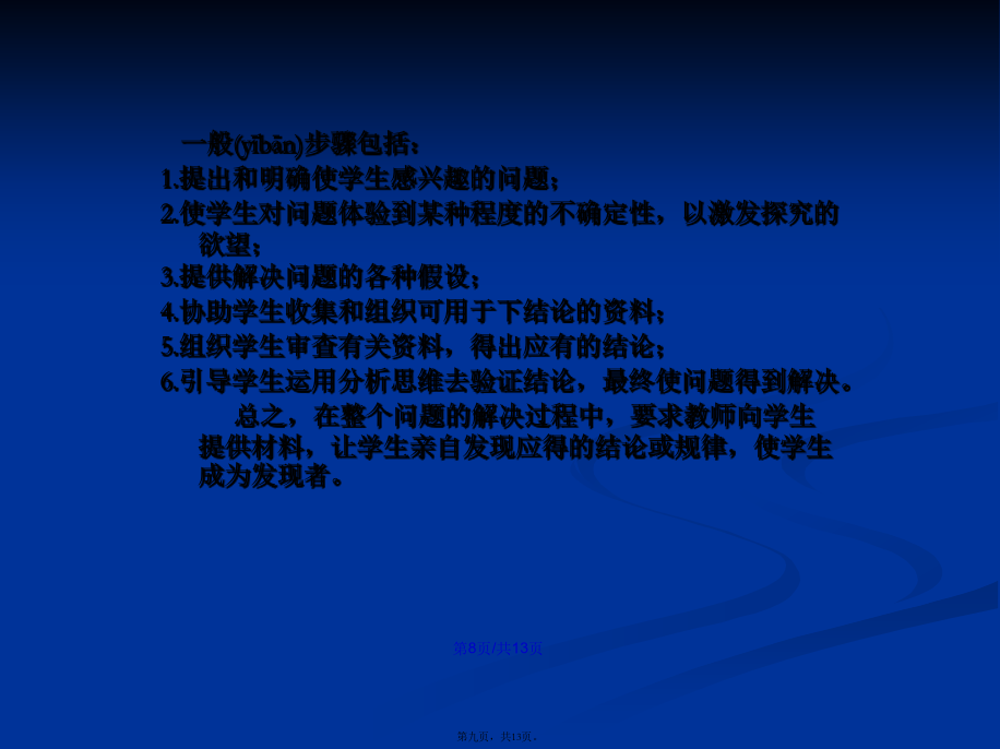 会计学布鲁纳的认知结构学习(xuéxí)理论一、认知(rènzhī)表征理论(2)映像性表征:形象性表征(又称肖像式再现表象)。儿童开始形成图像或表象,去表现他们的世界中所发生的事件。(3)符号性表征:符号性表征(又称象征性再现表象)这时儿童能够通过(tōngguò)符号再现他们的世界,这些符号中最重要的是语言。二、布鲁纳的认知(rènzhī)—发现说(一)学习的实质是主动地形成认知结构布鲁纳认为,学习者不是被动地接受知识,而是主动地获取知识,并通过把新获得的知识和已有的认知结构联系起来,积极地建构其知识体系。由此,布鲁纳十分强调认知结构在学习过程中的作用(zuòyòng),认为认知结构可以给经验中的规律性以意义和组织,并形成一个模式,所谓认知结构。(二)学习包括获得(huòdé)、转化和评价三个过程布鲁纳通过研究学生学习活动的具体过程后认为,学习一门学科包含着三个几乎同时发生的过程:1.新知识的获得(huòdé)(学习活动首先是新知识的获得(huòdé))2.知识的转化(获得(huòdé)了新知识以后,还要对它进行转化,我们可以超越给定的信息,运用各种方法将它们变成另外的形式,以适合新任务,并获得(huòdé)更多的知识。)3评价(评价是对知识转化的一种检查,通过评价可以核对我们处理知识的方法是否适合新的任务,或者运用得是否正确。)三、发现(fāxiàn)学习法一般(yībān)步骤包括:1.提出和明确使学生感兴趣的问题;2.使学生对问题体验到某种程度的不确定性,以激发探究的欲望;3.提供解决问题的各种假设;4.协助学生收集和组织可用于下结论的资料;5.组织学生审查有关资料,得出应有的结论;6.引导学生运用分析思维去验证结论,最终使问题得到解决。总之,在整个问题的解决过程中,要求教师向学生提供材料,让学生亲自发现应得的结论或规律,使学生成为发现者。由于布鲁纳认为学生是教学过程中的一个积极的探究者,因此教师的作用就在于帮助学生形成一种能够独立探究的情境,而不是提供现成的知识。教师的主要作用在于:1、鼓励学生有发现的自信心;2、激发学生的好奇心和求知欲;3、帮助学生寻找新问题与已知知识的联系;4、训练学生运用(yùnyòng)知识解决问题的能力;5、协助学生进行自我评价;6、启发学生进行对比。研究表明,发现学习对于学生的好处:1、有利于激发学生的好奇心及探索未知事物的兴趣2、有利于调动学生的内部动机和学习的积极性,最大限度地为学生提供自由(zìyóu)回旋的余地3、有利于学生批判性、创造性思维的发展。但是,布鲁纳倡导的发现学习思想也存在着一系列的局限性。1、他无视学生学习的特点,歪曲了接受学习的本意2、对发现学习的界定也缺乏科学性和严密性。3、发现学习比较浪费时间,不能保证学习的水平。因此,发现学习不能成为学生学习的主要方法。发现学习应根据教材性质和学生的特点来灵活安排,扬长避短,才可达到良好的教学效果。如果忽略这些,一味地、无限制(xiànzhì)地推广发现学习,反而会弄巧成拙。