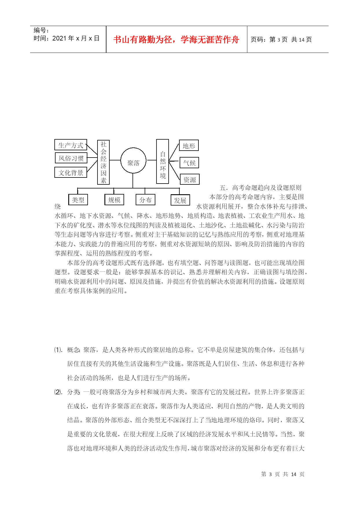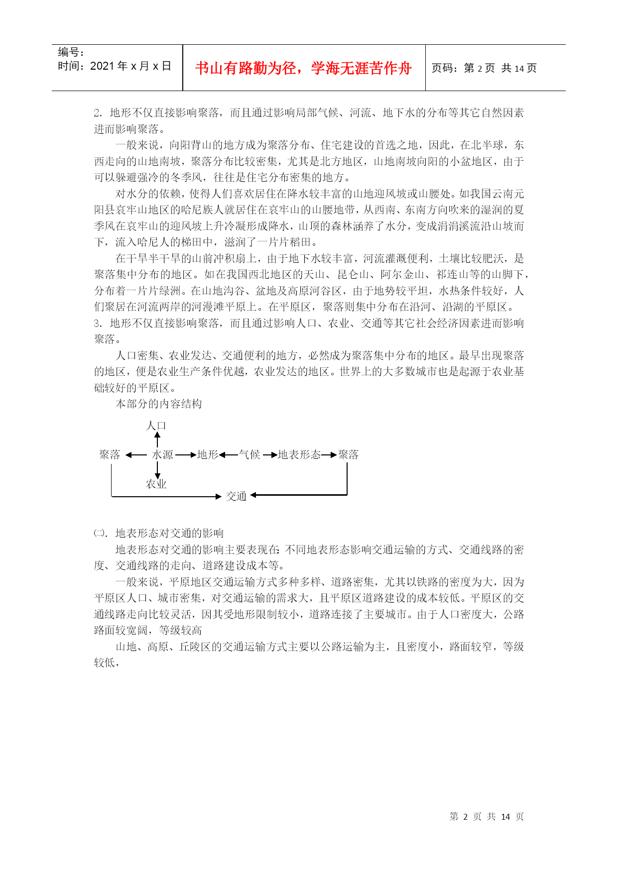 编号:时间:2021年x月x日书山有路勤为径,学海无涯苦作舟页码:第PAGE14页共NUMPAGES14页第PAGE\*MERGEFORMAT14页共NUMPAGES\*MERGEFORMAT14页的高考复习策略与备考经验交流、高考的命题趋向及设题原则、高考的解题技巧等。地形课标、考纲要求举例说明地表形态对聚落及交通线路分布的影响(重在应用)与其它知识点及能力要求相联系的内容地形、地势、地貌的概念、类型等聚落:聚落的概念、类型、发展变化、分布、影响交通运输方式、交通运输线路的分布,交通运输线路布局的影响因素重难点指导:㈠.地表形态对聚落分布的影响1.不同的地表形态聚落的类型、规模、分布密度、空间形态、聚落内建筑物的外部形态及内部结构、聚落发展变化等产生不同的影响⑴.地形条件对聚落的影响①.对聚落类型的影响城市聚落多分布于平原、盆地等地形区,而乡村聚落在平原、盆地、高原、山地、丘陵地形区均有分布。从小区域来看,聚落多分布于沟谷、河谷、山间小盆地、山间台地等地形平坦的区域。②.对聚落规模、密度的影响平原、盆地等地形区聚落规模大、密度大;高原、山地、丘陵等地形区聚落规模一般较小,密度也较小。如内蒙古草原上的牧民聚落呈零星的点状分布或集中分布在水井、河流等水源地。在丘陵、山地地形区,山间盆地则是聚落的最佳区位。如四川盆地水热充足,人口密集,物产丰富,被称为“天府之国”。又如在云贵高原的低山丘陵的小盆地就是聚落密集之处,被当地人称为“坝子”。③.对聚落空间形态的影响平原、盆地等地形开阔区域,聚落易于向多个方向扩展,形成集中式、团块状的聚落形态,如成都市、北京市;在山地、丘陵区的山谷、沟谷区,由于受地形限制,使得聚落沿山谷方向延伸,呈现典型的带状聚落形态,如我国的兰州市、宜宾市等。高原区的牧民,由于逐水草而居及其每个牧民家庭为了占有足够面积的草场,聚落呈稀疏的散点状分布。在山地、丘陵等地区的聚落,由于地形等阻隔,使得聚落被分割成片状,形成组团式的聚落形态。④.对聚落内部建筑物的外部形态及内部结构的影响依山势而建的聚落,高低错落有致,体建筑视野开阔,个体建筑间相互联系而又相对独立。如重庆市的城市建筑依山就势,沿山坡布局一大片聚落,形成一道独特的山地城市景观。再如,黄土高原区的居民沿山坡平整出阶梯状,再沿黄土壁凿洞成窑,由山脚到半山坡层层排列,蔚为壮观。在山西省的平陆县,由于地势平坦,而修建窑洞需要借助黄土崖壁,因此当地居民就掘地为坑,又在坑壁上凿壁成窑,形成了独特的地窖式窑洞院落。再如我国南方山地区的吊脚楼,这种木楼不是建在平地上,而是依山就势,用木桩搭起一个平台,再在平台上建房。这样即充分利用了地形,有利于木楼通风散湿,利于排水,而且也可充分利用木楼底部的空间储物、饲养牲畜等。⑤.对聚落发展变化的影响平原区由于聚落密度大,人口稠密,经济较发达,交通较为便利,聚落的发展变化迅速。山地区由于地形阻隔,交通不便,保存了许多具有地方特色的民居建筑区。2.地形不仅直接影响聚落,而且通过影响局部气候、河流、地下水的分布等其它自然因素进而影响聚落。一般来说,向阳背山的地方成为聚落分布、住宅建设的首选之地,因此,在北半球,东西走向的山地南坡,聚落分布比较密集,尤其是北方地区,山地南坡向阳的小盆地区,由于可以躲避强冷的冬季风,往往是住宅分布密集的地方。对水分的依赖,使得人们喜欢居住在降水较丰富的山地迎风坡或山腰处。如我国云南元阳县哀牢山地区的哈尼族人就居住在哀牢山的山腰地带,从西南、东南方向吹来的湿润的夏季风在哀牢山的迎风坡上升冷凝形成降水,山顶的森林涵养了水分,变成涓涓溪流沿山坡而下,流入哈尼人的梯田中,滋润了一片片稻田。在干旱半干旱的山前冲积扇上,由于地下水较丰富,河流灌溉便利,土壤比较肥沃,是聚落集中分布的地区。如在我国西北地区的天山、昆仑山、阿尔金山、祁连山等的山脚下,分布着一片片绿洲。在山地沟谷、盆地及高原河谷区,由于地势较平坦,水热条件较好,人们聚居在河流两岸的河漫滩平原上。在平原区,聚落则集中分布在沿河、沿湖的平原区。3.地形不仅直接影响聚落,而且通过影响人口、农业、交通等其它社会经济因素进而影响聚落。人口密集、农业发达、交通便利的地方,必然成为聚落集中分布的地区。最早出现聚落的地区,便是农业生产条件优越,农业发达的地区。世界上的大多数城市也是起源于农业基础较好的平原区。本部分的内容结构聚落人口水源农业地形气候地表形态聚落交通㈡.地表形态对交通的影响地表形态对交通的影响主要表现在:不同地表形态影响交通运输的方式、交通线路的密度、交通线路的走向、道路建设成本等。一般来说,平原地区交通运输方式多种多样、道路密集,尤其以
