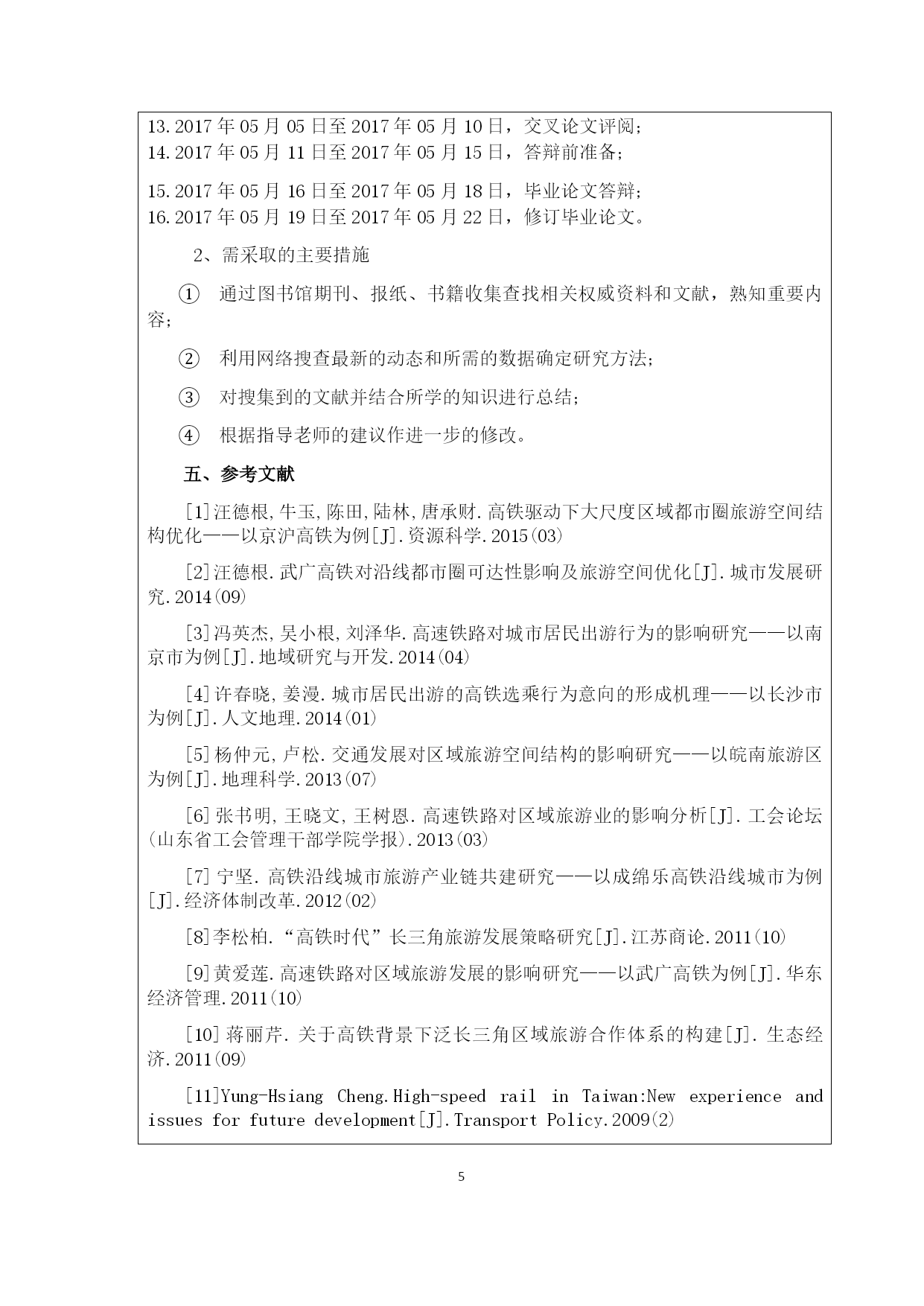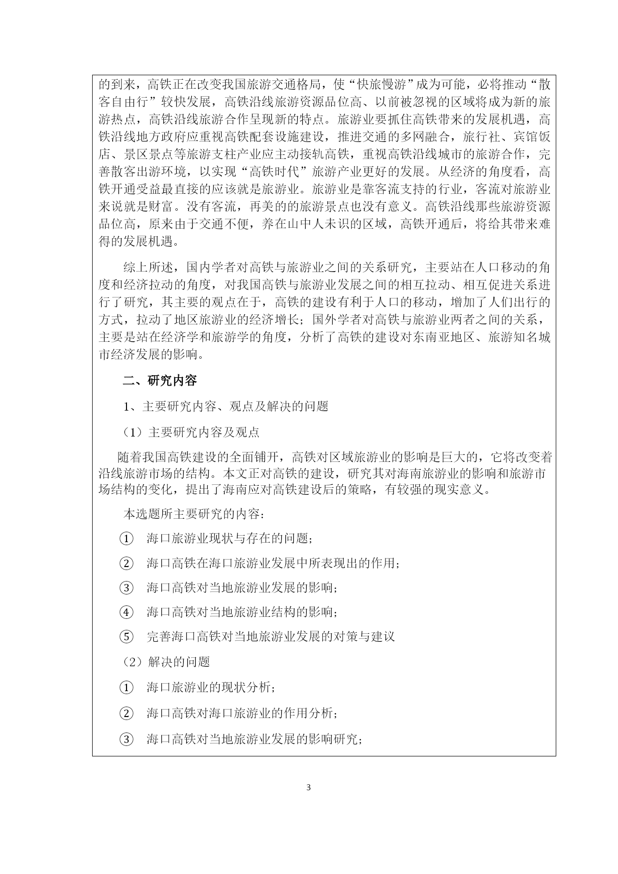 PAGE\*MERGEFORMAT7海口经济学院本科生毕业论文(设计)开题报告书姓名王茹学号201213330220所在学院经济贸易学院专业经济学指导教师钱耀军职称副教授论文题目海口高铁对旅游产业的影响分析开题报告正文(按以下“开题报告的要求”分项填写)(可另加附页)一、选题的根据1、选题的目的和意义(1)选题的目的随着高铁网络的日趋完善,人们出游将变得更加便捷,散客自助游将迎来大发展。根据世界旅游发展规律,随着人们出游经历的增加和出游条件的改善,散客自助游因其灵活、自由、可选择性强等特点,将逐渐成为旅游市场的主体。欧美各主要旅游接待国的散客市场份额已达到70%~80%,有的甚至高达90%,经营接待散客旅游的能力已成为衡量一个国家和地区旅游业成熟的重要标志。(2)选题的意义高铁新时速使景区的时空距离不再遥远,而景区的时空区域不断延伸拓展;产业转型、土地财政及旅游房地产的商业利益合流,推升了旅游开发的新浪潮,使其突破传统的旅游开发模式,与区域发展和城镇化全面结合,走向了区域综合开发模式。由于海南岛东南西北景致各不相同,海口是许多岛外旅客抵达后的第一站,亦是岛内市县居民的消费中心,因此海口旅游首先迎来的是直接消费动力。从东环高铁开通的五年看,海口第三产业年均增长超过了10%。其中,2015年旅游直接收入142亿元,增长16.7%。可想而知,在旅游硬件的不断完善下,高铁运营后,加上购物、房产、文娱等消费,对海口的经济拉动不可小觑。2、国内外研究现状(1)国内研究现状汪德根等学者(2015)研究表示,旅游具有明显的地理特征,在空间上表现为旅游者从旅游客源地到旅游目的地之间的迁移,在这一过程中为旅游移动提供交通运输服务的各个部门、设施与服务,形成了旅游交通产业。旅游业的发展与旅游交通的进步密不可分。自古以来,交通状况深刻影响了人们的迁移活动,旅游交通的发展成为旅游业发展的重要推动力量,历史上,旅游交通的每一次突破都带来旅游业的跨越式发展。冯英杰等学者(2014)研究表示,“高铁速度”也给只依靠景区发展的旅游目的地提出了挑战。单纯依靠门票收入的旅游目的地将极有可能成为高铁旅游经济的中转站,游客停留“片刻”即离开,以至于无法分享高铁速度下城市客源的增加所带来的更大效益,从而成为单纯的“人气城市”。这也促使高铁沿线的旅游目的地如果想在高铁时代获得更多的经济效益和社会效益,就要加快旅游产业的优化升级,丰富旅游产品结构,加快实施一大批的接待服务类旅游项目,大力发展旅游购物、餐饮住宿、文化娱乐等行业,提高旅游产业综合效益。借助高铁的便利条件,有条件的旅游目的地还可以发展分时度假、产权酒店等新型度假形式,打造高铁休闲圈中的“第二居所地”。许春晓,姜漫在《城市居民出游的高铁选乘行为意向的形成机理——以长沙市为例》中表示,高铁推动了区域旅游资源的整合,实现区域旅游一体化,增强旅游的吸引力。高铁使得城市之间的空间感知距离缩短,也同时意味着旅游资源吸引力范围的扩张,增加了城市休闲旅游资源的需求基础。高铁的开通必将促使沿线景区转变传统的独自发展的理念。通过高铁串珠,区域旅游资源能得到有效整合,并可优势互补,大大增强本地区的旅游吸引力。杨仲元,卢松在《交通发展对区域旅游空间结构的影响研究——以皖南旅游区为例》中表示,高铁促进区域旅游合作的同时也加剧了竞争,区域城市间有近似的旅游资源、旅游环境和发展模式,这一定程度上促使了景点间的替代性。高铁开通后,拉近了各景区之间的空间距离,使得游客“用脚投票”的趋势更加明显。市场竞争的结果是那些资源禀赋好、项目吸引人的景区会越做越强,而档次较低的景区会面临被淘汰的挑战,增加了它们的生存压力。(2)国外研究现状Yung-HsiangCheng(2009)研究表示,高铁的建设大大减少了游客出游的时间成本,使远距离的旅游实现的可能性增大,从而影响游客的出游行为。河北省拥有广阔的客源市场,拥有毗邻京津、环绕渤海、面向东北亚的区位优势。俄罗斯、日韩、东南亚、港澳台等是河北重点的客源市场。高铁的建成大大方便了这些客源地游客的出行。BrucePrideaux(2014)研究表示,旅游与交通的关系密切。随着“高铁时代”的到来,高铁正在改变我国旅游交通格局,使“快旅慢游”成为可能,必将推动“散客自由行”较快发展,高铁沿线旅游资源品位高、以前被忽视的区域将成为新的旅游热点,高铁沿线旅游合作呈现新的特点。旅游业要抓住高铁带来的发展机遇,高铁沿线地方政府应重视高铁配套设施建设,推进交通的多网融合,旅行社、宾馆饭店、景区景点等旅游支柱产业应主动接轨高铁,重视高铁沿线城市的旅游合作,完善散客出游环境,以实现“高铁时代”旅游产业更好的发展。从经济的角度看,高铁开通受益最直接的应该就是旅游业。旅游业是靠客流