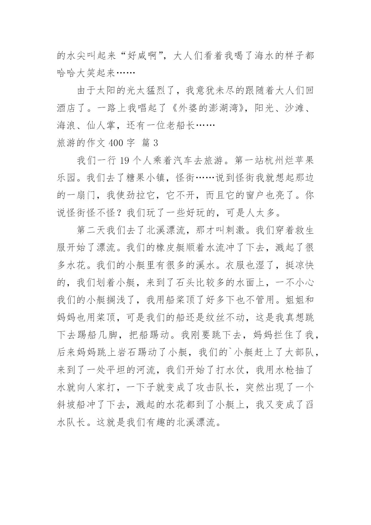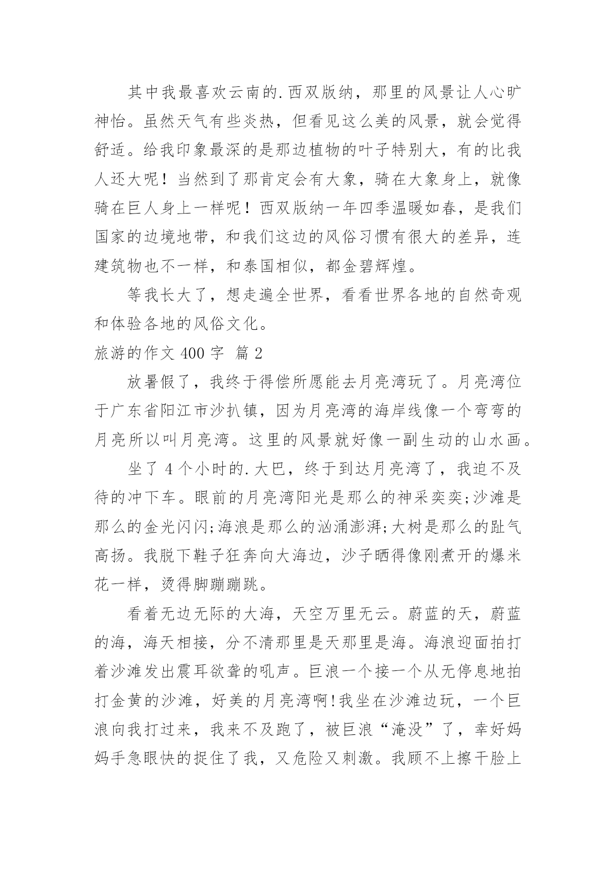 旅游的作文400字【热门】旅游的作文400字三篇在平凡的学习、工作、生活中,大家都不可避免地会接触到作文吧,写作文可以锻炼我们的独处习惯,让自己的心静下来,思考自己未来的方向。怎么写作文才能避免踩雷呢?以下是小编为大家整理的旅游的作文400字4篇,欢迎阅读与收藏。旅游的作文400字篇1我和许多小朋友一样喜欢玩耍,但不是玩游戏,是旅游。我觉得旅游可以带给我快乐,而且旅游可以让我增长知识,有句话是这么说的“读万卷书,行万里路”。像西安的秦始皇陵兵马俑,埃及金字塔的奥秘,我都很想去探索一下,丰富我的知识。旅游也会带给我好的心情,因为一路美景伴随着我们。像日本的富士山,来自欧洲的阿尔卑斯山脉,可以看见美丽的雪景,所以我觉得旅游可以带给我快乐。当然,我最想去的是内蒙古大草原,我想看看那里的牧民,那里的家畜,体验当地的生活。我也最想在内蒙古大草原上骑马,从早上骑到晚上,那策马奔腾的感觉一定很棒!到现在我也去过很多地方,有祖国首都北京,风景如画的杭州西湖,辽阔的新疆,热带雨林气候的云南,还有香港、珠海、澳门等其他城市。当然我也去过港珠澳大桥,还有东北的哈尔滨和吉林的长白山,越南芽庄……其中我最喜欢云南的.西双版纳,那里的风景让人心旷神怡。虽然天气有些炎热,但看见这么美的风景,就会觉得舒适。给我印象最深的是那边植物的叶子特别大,有的比我人还大呢!当然到了那肯定会有大象,骑在大象身上,就像骑在巨人身上一样呢!西双版纳一年四季温暖如春,是我们国家的边境地带,和我们这边的风俗习惯有很大的差异,连建筑物也不一样,和泰国相似,都金碧辉煌。等我长大了,想走遍全世界,看看世界各地的自然奇观和体验各地的风俗文化。旅游的作文400字篇2放暑假了,我终于得偿所愿能去月亮湾玩了。月亮湾位于广东省阳江市沙扒镇,因为月亮湾的海岸线像一个弯弯的月亮所以叫月亮湾。这里的风景就好像一副生动的山水画。坐了4个小时的.大巴,终于到达月亮湾了,我迫不及待的冲下车。眼前的月亮湾阳光是那么的神采奕奕;沙滩是那么的金光闪闪;海浪是那么的汹涌澎湃;大树是那么的趾气高扬。我脱下鞋子狂奔向大海边,沙子晒得像刚煮开的爆米花一样,烫得脚蹦蹦跳。看着无边无际的大海,天空万里无云。蔚蓝的天,蔚蓝的海,海天相接,分不清那里是天那里是海。海浪迎面拍打着沙滩发出震耳欲聋的吼声。巨浪一个接一个从无停息地拍打金黄的沙滩,好美的月亮湾啊!我坐在沙滩边玩,一个巨浪向我打过来,我来不及跑了,被巨浪“淹没”了,幸好妈妈手急眼快的捉住了我,又危险又刺激。我顾不上擦干脸上的水尖叫起来“好咸啊”,大人们看着我喝了海水的样子都哈哈大笑起来……由于太阳的光太猛烈了,我意犹未尽的跟随着大人们回酒店了。一路上我唱起了《外婆的澎湖湾》,阳光、沙滩、海浪、仙人掌,还有一位老船长……旅游的作文400字篇3我们一行19个人乘着汽车去旅游。第一站杭州烂苹果乐园。我们去了糖果小镇,怪街……说到怪街我就想起那边的一扇门,我使劲拉它,它不开,而且它的窗户也亮了。你说怪街怪不怪?我们玩了一些好玩的,可是人太多。第二天我们去了北溪漂流,那才叫刺激。我们穿着救生服开始了漂流。我们的橡皮艇顺着水流冲了下去,溅起了很多水花。我们的小艇里有很多的溪水。衣服也湿了,挺凉快的,我们划着小艇,来到了石头比较多的水面上,一不小心我们的小艇搁浅了,我用船桨顶了好多下也不管用。姐姐和妈妈也用桨顶,可是我们的船还是纹丝不动,这是我真想跳下去踢船几脚,把船踢动。我刚要跳下去,妈妈拦住了我,后来妈妈跳上岩石踢动了小艇,我们的`小艇赶上了大部队,来到了一处平坦的河流,我们开始了打水仗,我用水枪抽了水就向人家打,一下子就变成了攻击队长,突然出现了一个斜坡船冲了下去,溅起的水花都到了小艇上,我又变成了舀水队长。这就是我们有趣的北溪漂流。
