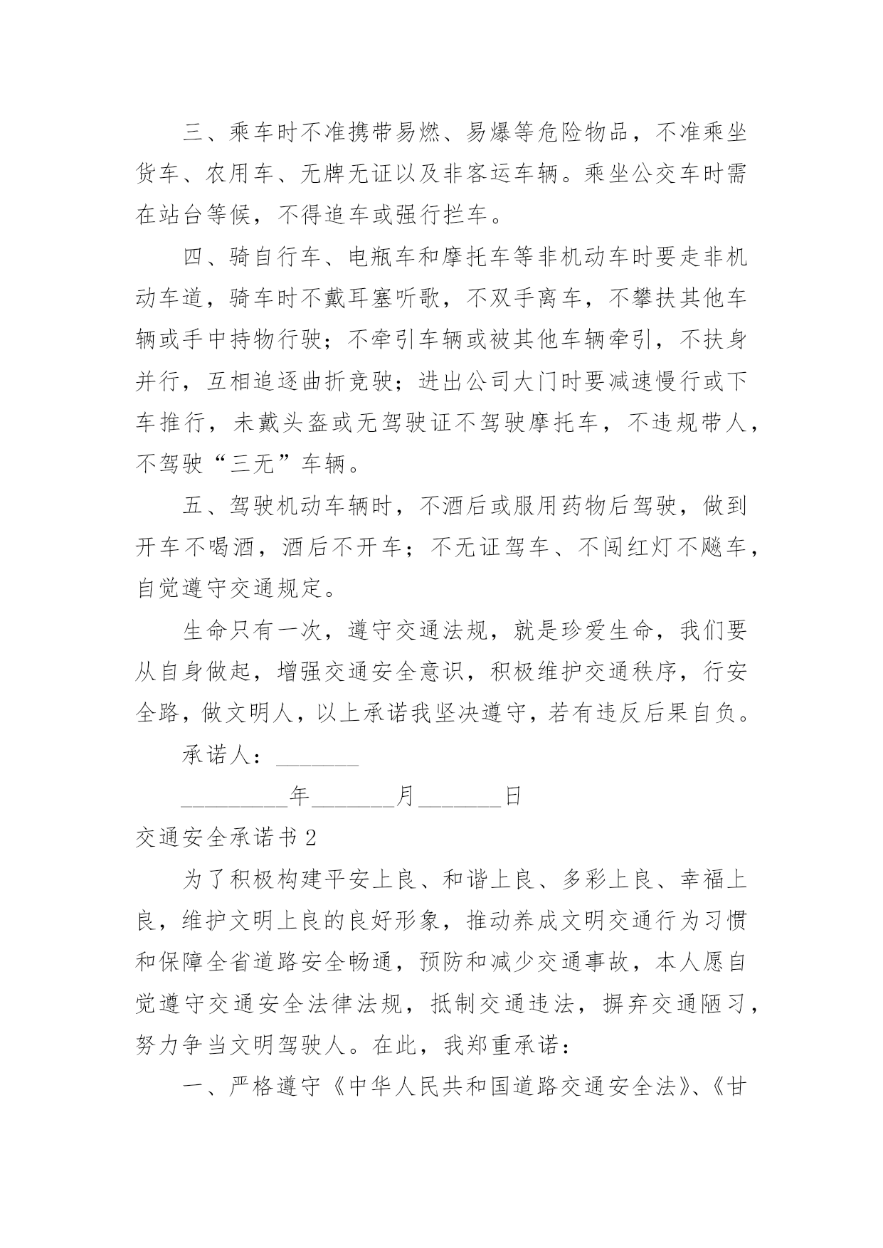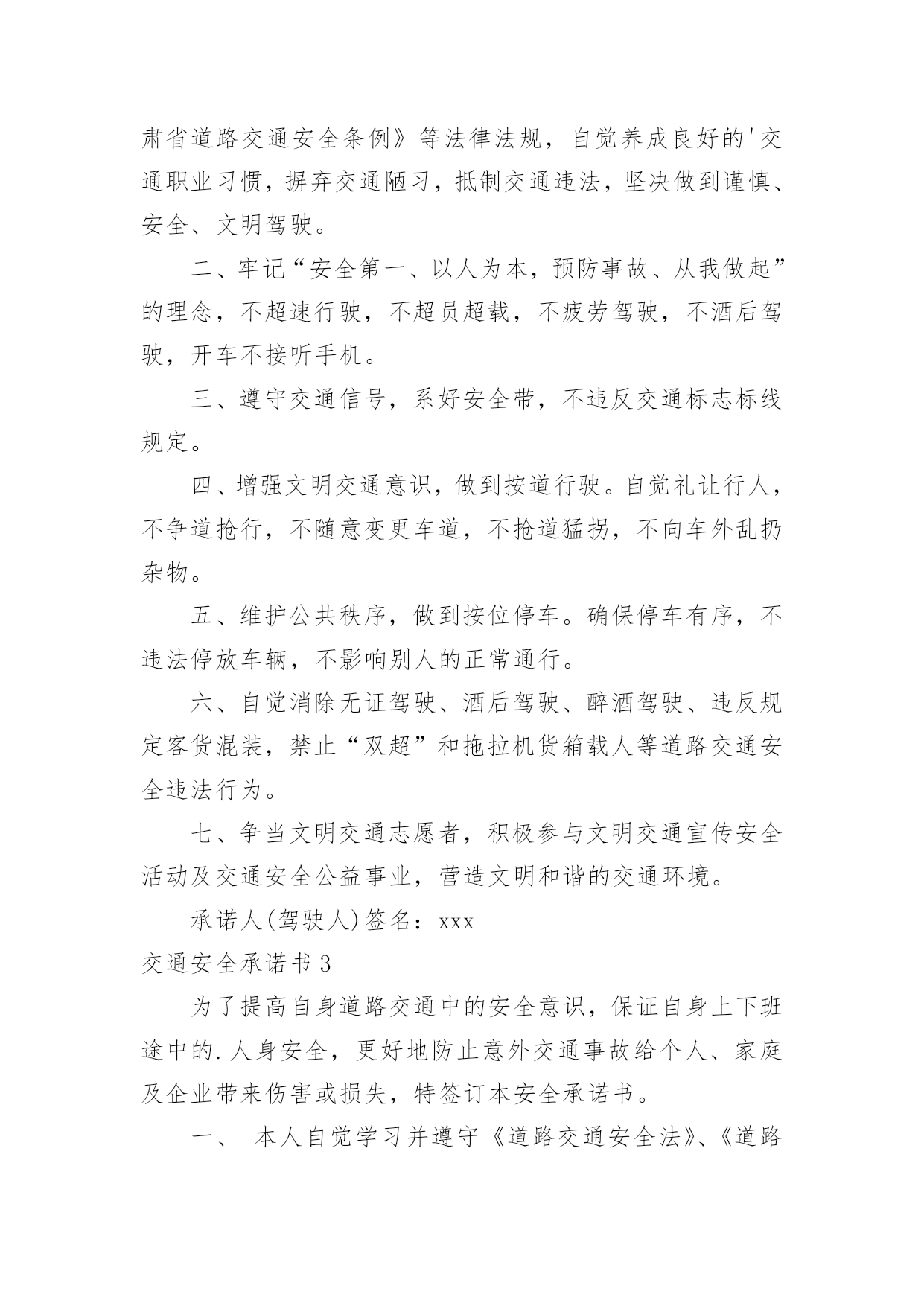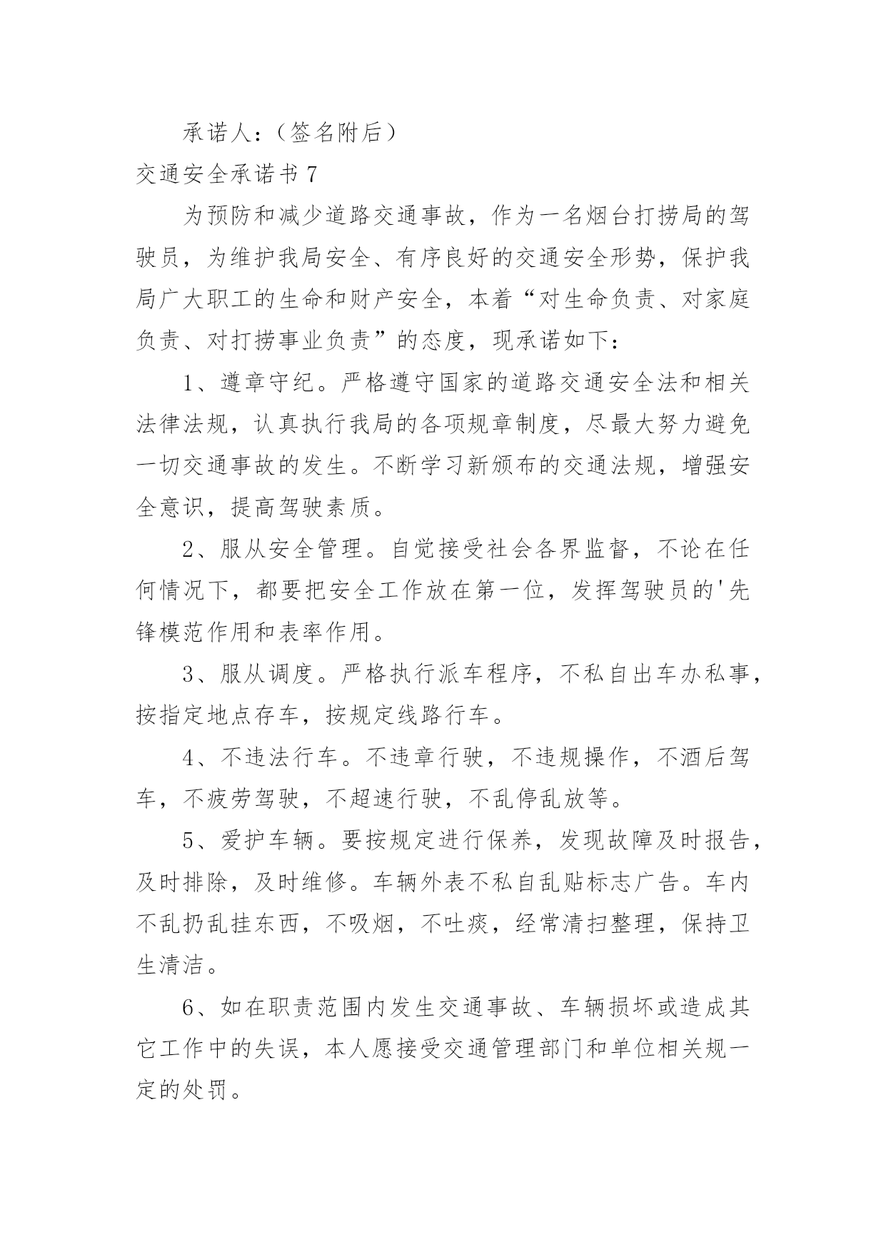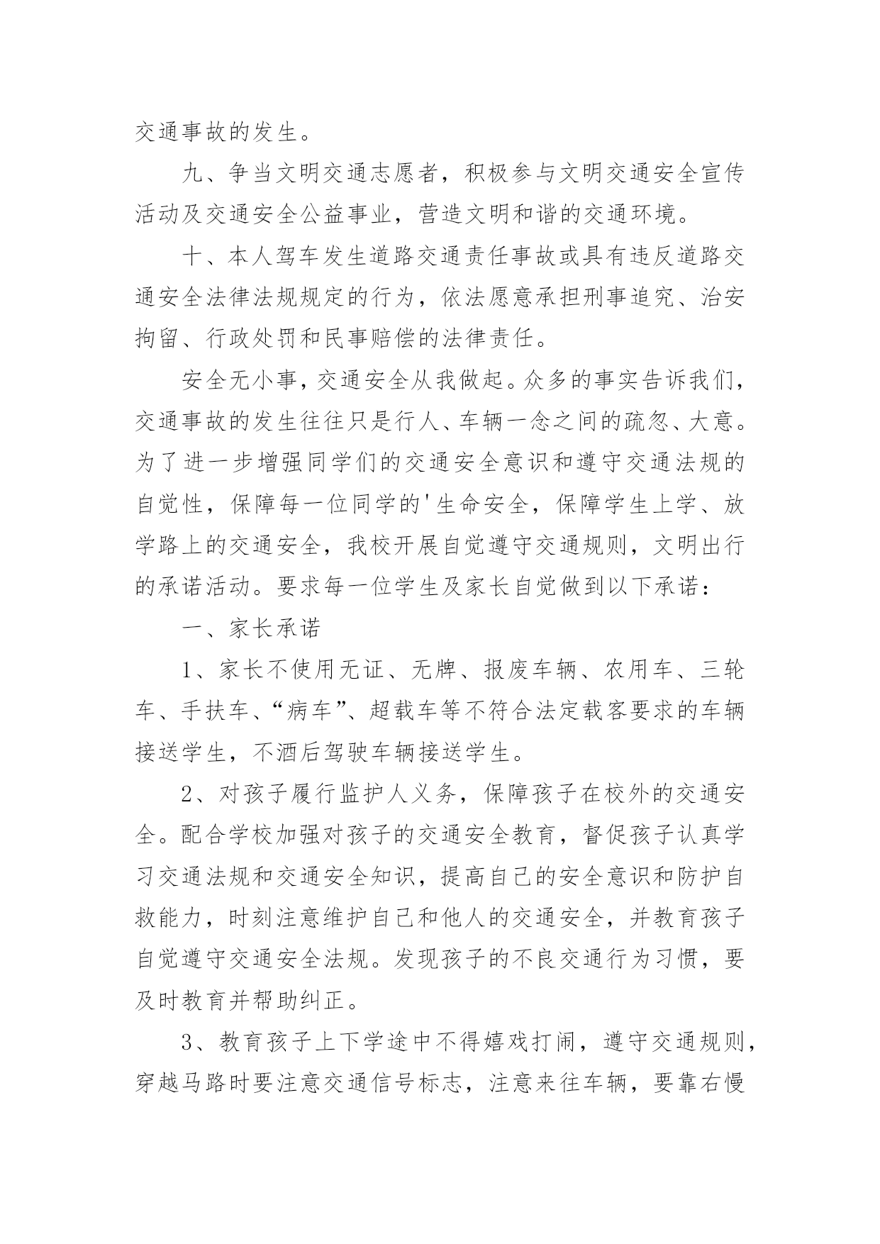 交通安全承诺书交通安全承诺书集合15篇在不断进步的时代,承诺书的使用越来越广泛,承诺书是承诺人对要约人的要约完全同意的意思,表示以书面形式。你知道承诺书怎样才能写的好吗?下面是小编整理的交通安全承诺书,欢迎阅读与收藏。交通安全承诺书1我们生活在一个喧嚣繁华的城镇里,我们每天都要在行人、车辆拥挤的街道上行走,公司门口正在分半扩建维修,拥挤的车辆在我们眼前来来往往。因为上班赶时间不遵守交通法规或存有麻痹和侥幸心理,我们看到了血的事实,经受了血的教训。多少惨痛的教训和血的代价让我们深深地体悟到维护交通安全的重要性,遵守交通法规是我们应尽的责任和义务,只有遵守交通法规,平安才会伴我们一生,只有文明交通,事故才会与我们无缘。为了珍惜和关爱自己和他人的生命,做一名自觉遵守交通法规的模范,我们承诺如下:一、认真学习交通法规知识,自觉遵守交通法规规定,文明交通,各行其道,养成良好的`交通习惯。二、行路走人行道,没有人行道的,须靠右边行走;过马路走斑马线,不准穿越、倚坐人行道、车行道和铁路道口的护栏。三、乘车时不准携带易燃、易爆等危险物品,不准乘坐货车、农用车、无牌无证以及非客运车辆。乘坐公交车时需在站台等候,不得追车或强行拦车。四、骑自行车、电瓶车和摩托车等非机动车时要走非机动车道,骑车时不戴耳塞听歌,不双手离车,不攀扶其他车辆或手中持物行驶;不牵引车辆或被其他车辆牵引,不扶身并行,互相追逐曲折竞驶;进出公司大门时要减速慢行或下车推行,未戴头盔或无驾驶证不驾驶摩托车,不违规带人,不驾驶“三无”车辆。五、驾驶机动车辆时,不酒后或服用药物后驾驶,做到开车不喝酒,酒后不开车;不无证驾车、不闯红灯不飚车,自觉遵守交通规定。生命只有一次,遵守交通法规,就是珍爱生命,我们要从自身做起,增强交通安全意识,积极维护交通秩序,行安全路,做文明人,以上承诺我坚决遵守,若有违反后果自负。承诺人:________________年_______月_______日交通安全承诺书2为了积极构建平安上良、和谐上良、多彩上良、幸福上良,维护文明上良的良好形象,推动养成文明交通行为习惯和保障全省道路安全畅通,预防和减少交通事故,本人愿自觉遵守交通安全法律法规,抵制交通违法,摒弃交通陋习,努力争当文明驾驶人。在此,我郑重承诺:一、严格遵守《中华人民共和国道路交通安全法》、《甘肃省道路交通安全条例》等法律法规,自觉养成良好的'交通职业习惯,摒弃交通陋习,抵制交通违法,坚决做到谨慎、安全、文明驾驶。二、牢记“安全第一、以人为本,预防事故、从我做起”的理念,不超速行驶,不超员超载,不疲劳驾驶,不酒后驾驶,开车不接听手机。三、遵守交通信号,系好安全带,不违反交通标志标线规定。四、增强文明交通意识,做到按道行驶。自觉礼让行人,不争道抢行,不随意变更车道,不抢道猛拐,不向车外乱扔杂物。五、维护公共秩序,做到按位停车。确保停车有序,不违法停放车辆,不影响别人的正常通行。六、自觉消除无证驾驶、酒后驾驶、醉酒驾驶、违反规定客货混装,禁止“双超”和拖拉机货箱载人等道路交通安全违法行为。七、争当文明交通志愿者,积极参与文明交通宣传安全活动及交通安全公益事业,营造文明和谐的交通环境。承诺人(驾驶人)签名:xxx交通安全承诺书3为了提高自身道路交通中的安全意识,保证自身上下班途中的.人身安全,更好地防止意外交通事故给个人、家庭及企业带来伤害或损失,特签订本安全承诺书。一、本人自觉学习并遵守《道路交通安全法》、《道路交通安全法实施条例》等法律、法规;二、讲究交通公德和职业道德,文明驾驶,礼貌行车,严格遵守交通法规,服从指挥;三、根据道路交通法规,靠道路右边行驶、按车道行驶,不闯红灯,不逆向行驶;四、驾驶车辆精力集中,不超速行驶,不强行超车,驾车不接打电话,不酒后驾车,不疲劳驾车,不飙车;五、个人和非机动车(包括电动车)左转、横穿马路要下车,要走斑马线,按规定通过路口;六、机动车有牌照,证件齐全有效,驾车有安全带的必须系安全带,牌照、证件不全或不在有效期内的机动车不上路和进入厂区;七、严格遵守单位交通安全管理规定,服从管理;八、雨雾雪天气谨慎缓行,出现特殊原因不能按时到岗,应及时与自己的直接领导或部门负责人的电话沟通,绝不赶时违规行驶。本人严格遵守以上内容做一个遵纪守法的好员工,时时刻刻把安全放在心中,体现在行动中,每天高高兴兴上班来、平平安安回家去!员工签字:时间:20xx月4月11日交通安全承诺书4为了积极构建平安xx、和谐xx、幸福xx,维护文明xx的良好形象,推动养成文明交通行为习惯和保障全省道路安全畅通,预防和减少交通事故,本人愿自觉遵守交通安全法律法规,抵制交通违法,摒弃交通陋习,争当“xx好司机”、“陇原最美驾驶人”。在此,我郑重承诺:一、严格遵守《中华人民共和国安全生产法》、《中华人民共