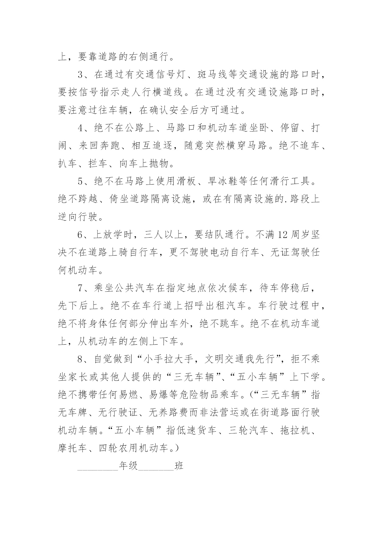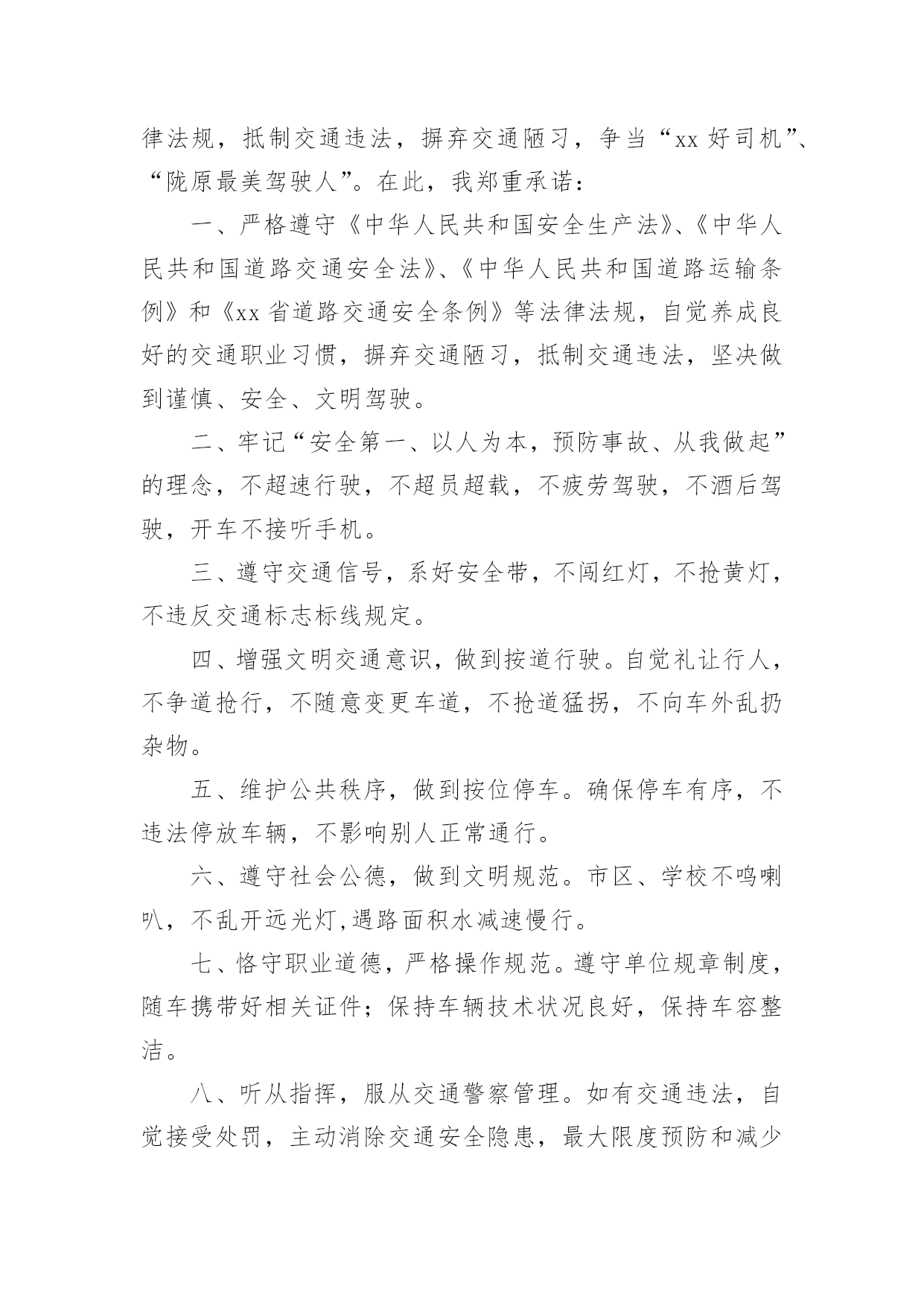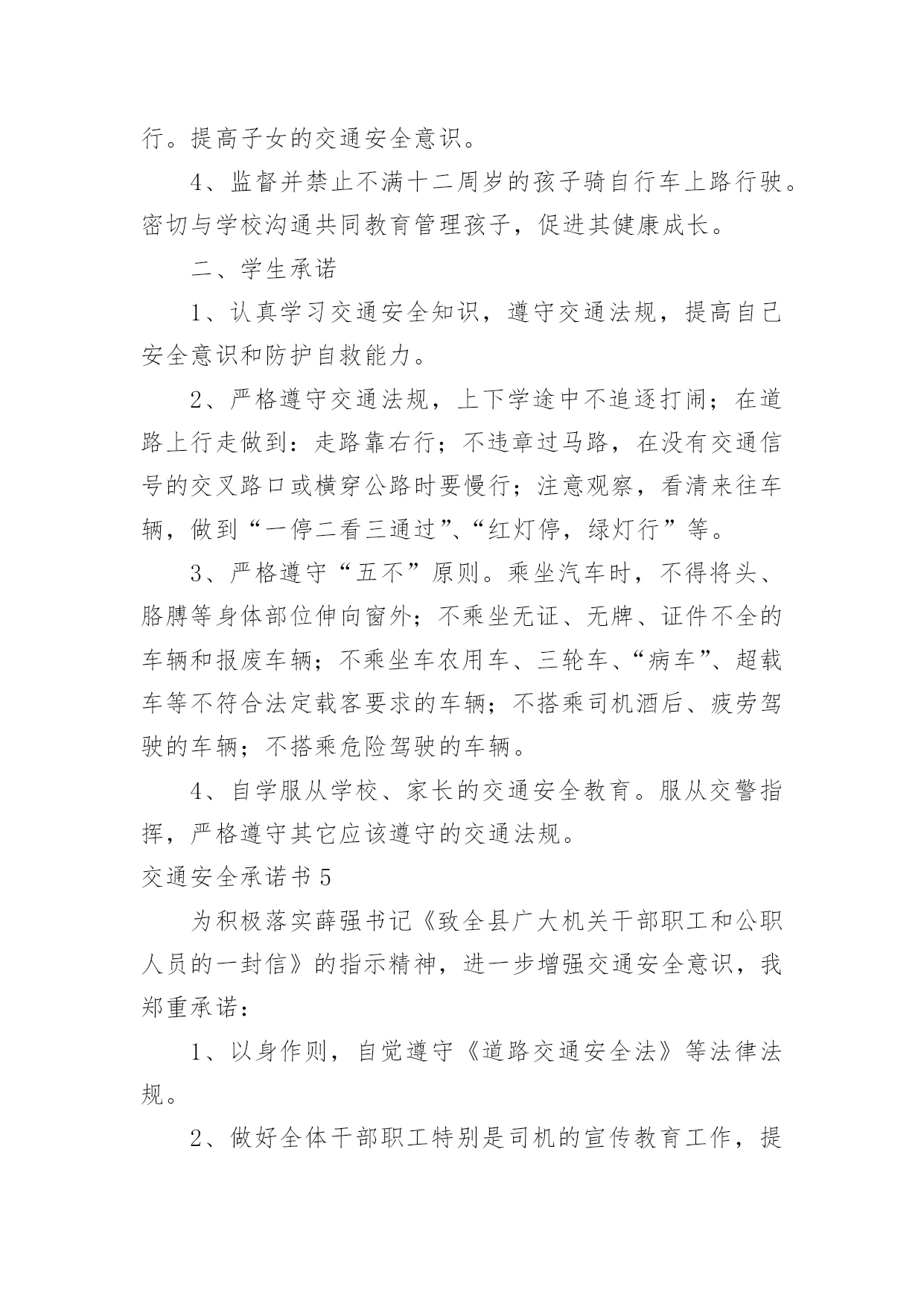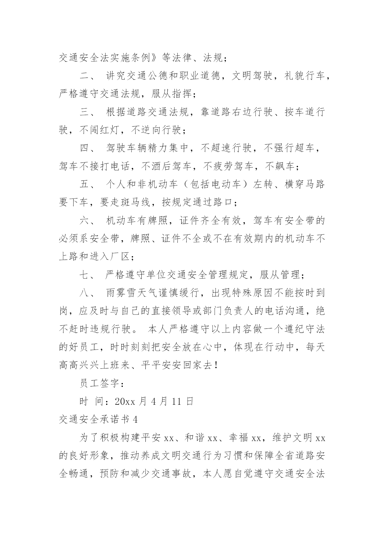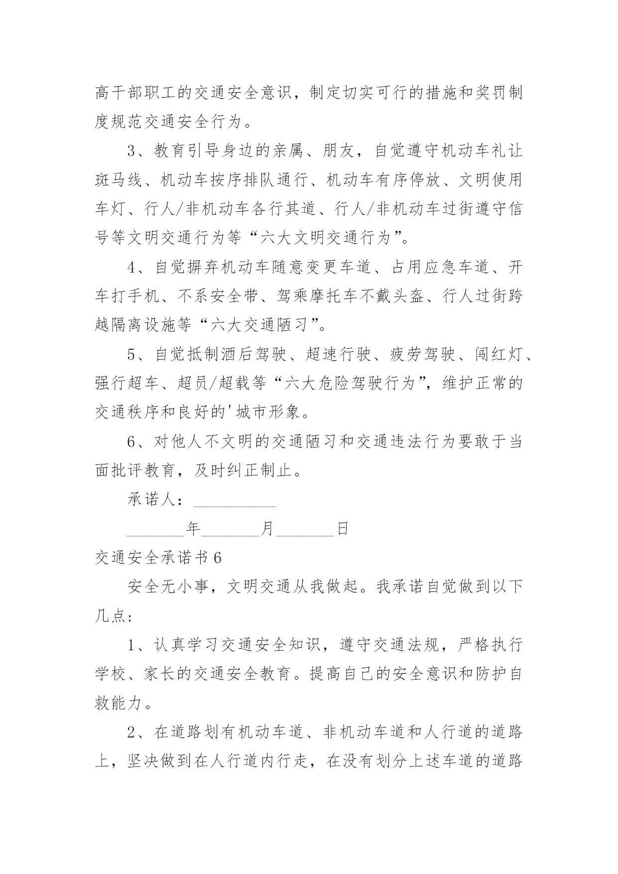 交通安全承诺书交通安全承诺书集合15篇在不断进步的时代,承诺书的使用越来越广泛,承诺书是承诺人对要约人的要约完全同意的意思,表示以书面形式。你知道承诺书怎样才能写的好吗?下面是小编整理的交通安全承诺书,欢迎阅读与收藏。交通安全承诺书1我们生活在一个喧嚣繁华的城镇里,我们每天都要在行人、车辆拥挤的街道上行走,公司门口正在分半扩建维修,拥挤的车辆在我们眼前来来往往。因为上班赶时间不遵守交通法规或存有麻痹和侥幸心理,我们看到了血的事实,经受了血的教训。多少惨痛的教训和血的代价让我们深深地体悟到维护交通安全的重要性,遵守交通法规是我们应尽的责任和义务,只有遵守交通法规,平安才会伴我们一生,只有文明交通,事故才会与我们无缘。为了珍惜和关爱自己和他人的生命,做一名自觉遵守交通法规的模范,我们承诺如下:一、认真学习交通法规知识,自觉遵守交通法规规定,文明交通,各行其道,养成良好的`交通习惯。二、行路走人行道,没有人行道的,须靠右边行走;过马路走斑马线,不准穿越、倚坐人行道、车行道和铁路道口的护栏。三、乘车时不准携带易燃、易爆等危险物品,不准乘坐货车、农用车、无牌无证以及非客运车辆。乘坐公交车时需在站台等候,不得追车或强行拦车。四、骑自行车、电瓶车和摩托车等非机动车时要走非机动车道,骑车时不戴耳塞听歌,不双手离车,不攀扶其他车辆或手中持物行驶;不牵引车辆或被其他车辆牵引,不扶身并行,互相追逐曲折竞驶;进出公司大门时要减速慢行或下车推行,未戴头盔或无驾驶证不驾驶摩托车,不违规带人,不驾驶“三无”车辆。五、驾驶机动车辆时,不酒后或服用药物后驾驶,做到开车不喝酒,酒后不开车;不无证驾车、不闯红灯不飚车,自觉遵守交通规定。生命只有一次,遵守交通法规,就是珍爱生命,我们要从自身做起,增强交通安全意识,积极维护交通秩序,行安全路,做文明人,以上承诺我坚决遵守,若有违反后果自负。承诺人:________________年_______月_______日交通安全承诺书2为了积极构建平安上良、和谐上良、多彩上良、幸福上良,维护文明上良的良好形象,推动养成文明交通行为习惯和保障全省道路安全畅通,预防和减少交通事故,本人愿自觉遵守交通安全法律法规,抵制交通违法,摒弃交通陋习,努力争当文明驾驶人。在此,我郑重承诺:一、严格遵守《中华人民共和国道路交通安全法》、《甘肃省道路交通安全条例》等法律法规,自觉养成良好的'交通职业习惯,摒弃交通陋习,抵制交通违法,坚决做到谨慎、安全、文明驾驶。二、牢记“安全第一、以人为本,预防事故、从我做起”的理念,不超速行驶,不超员超载,不疲劳驾驶,不酒后驾驶,开车不接听手机。三、遵守交通信号,系好安全带,不违反交通标志标线规定。四、增强文明交通意识,做到按道行驶。自觉礼让行人,不争道抢行,不随意变更车道,不抢道猛拐,不向车外乱扔杂物。五、维护公共秩序,做到按位停车。确保停车有序,不违法停放车辆,不影响别人的正常通行。六、自觉消除无证驾驶、酒后驾驶、醉酒驾驶、违反规定客货混装,禁止“双超”和拖拉机货箱载人等道路交通安全违法行为。七、争当文明交通志愿者,积极参与文明交通宣传安全活动及交通安全公益事业,营造文明和谐的交通环境。承诺人(驾驶人)签名:xxx交通安全承诺书3为了提高自身道路交通中的安全意识,保证自身上下班途中的.人身安全,更好地防止意外交通事故给个人、家庭及企业带来伤害或损失,特签订本安全承诺书。一、本人自觉学习并遵守《道路交通安全法》、《道路交通安全法实施条例》等法律、法规;二、讲究交通公德和职业道德,文明驾驶,礼貌行车,严格遵守交通法规,服从指挥;三、根据道路交通法规,靠道路右边行驶、按车道行驶,不闯红灯,不逆向行驶;四、驾驶车辆精力集中,不超速行驶,不强行超车,驾车不接打电话,不酒后驾车,不疲劳驾车,不飙车;五、个人和非机动车(包括电动车)左转、横穿马路要下车,要走斑马线,按规定通过路口;六、机动车有牌照,证件齐全有效,驾车有安全带的必须系安全带,牌照、证件不全或不在有效期内的机动车不上路和进入厂区;七、严格遵守单位交通安全管理规定,服从管理;八、雨雾雪天气谨慎缓行,出现特殊原因不能按时到岗,应及时与自己的直接领导或部门负责人的电话沟通,绝不赶时违规行驶。本人严格遵守以上内容做一个遵纪守法的好员工,时时刻刻把安全放在心中,体现在行动中,每天高高兴兴上班来、平平安安回家去!员工签字:时间:20xx月4月11日交通安全承诺书4为了积极构建平安xx、和谐xx、幸福xx,维护文明xx的良好形象,推动养成文明交通行为习惯和保障全省道路安全畅通,预防和减少交通事故,本人愿自觉遵守交通安全法律法规,抵制交通违法,摒弃交通陋习,争当“xx好司机”、“陇原最美驾驶人”。在此,我郑重承诺:一、严格遵守《中华人民共和国安全生产法》、《中华人民共