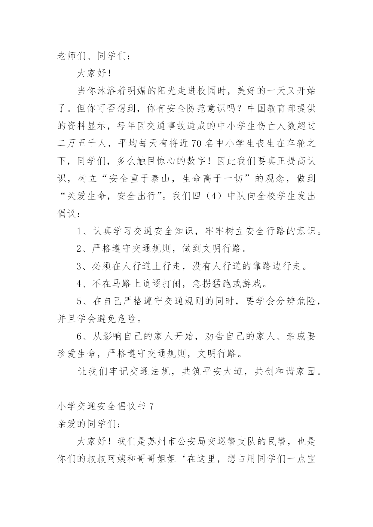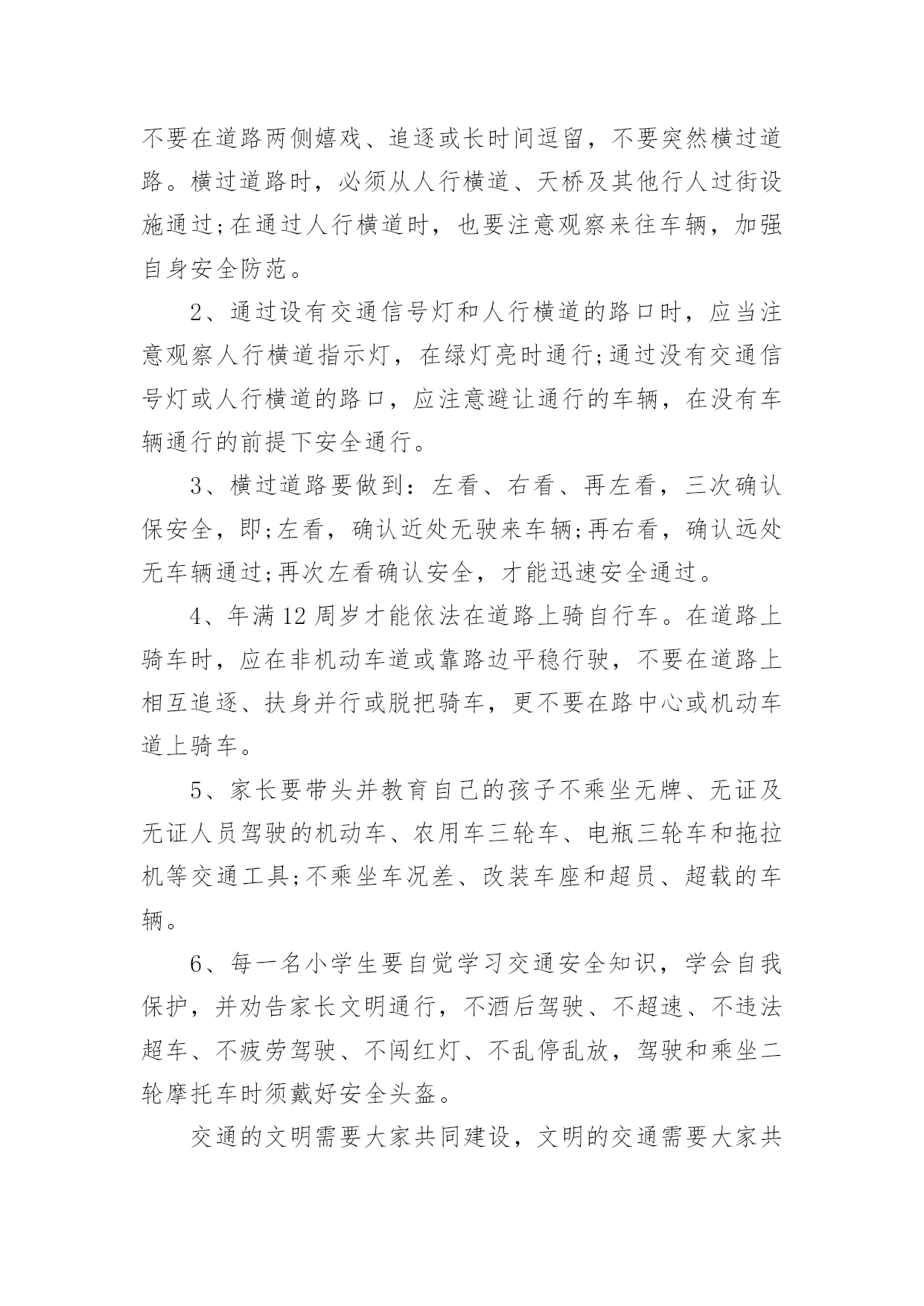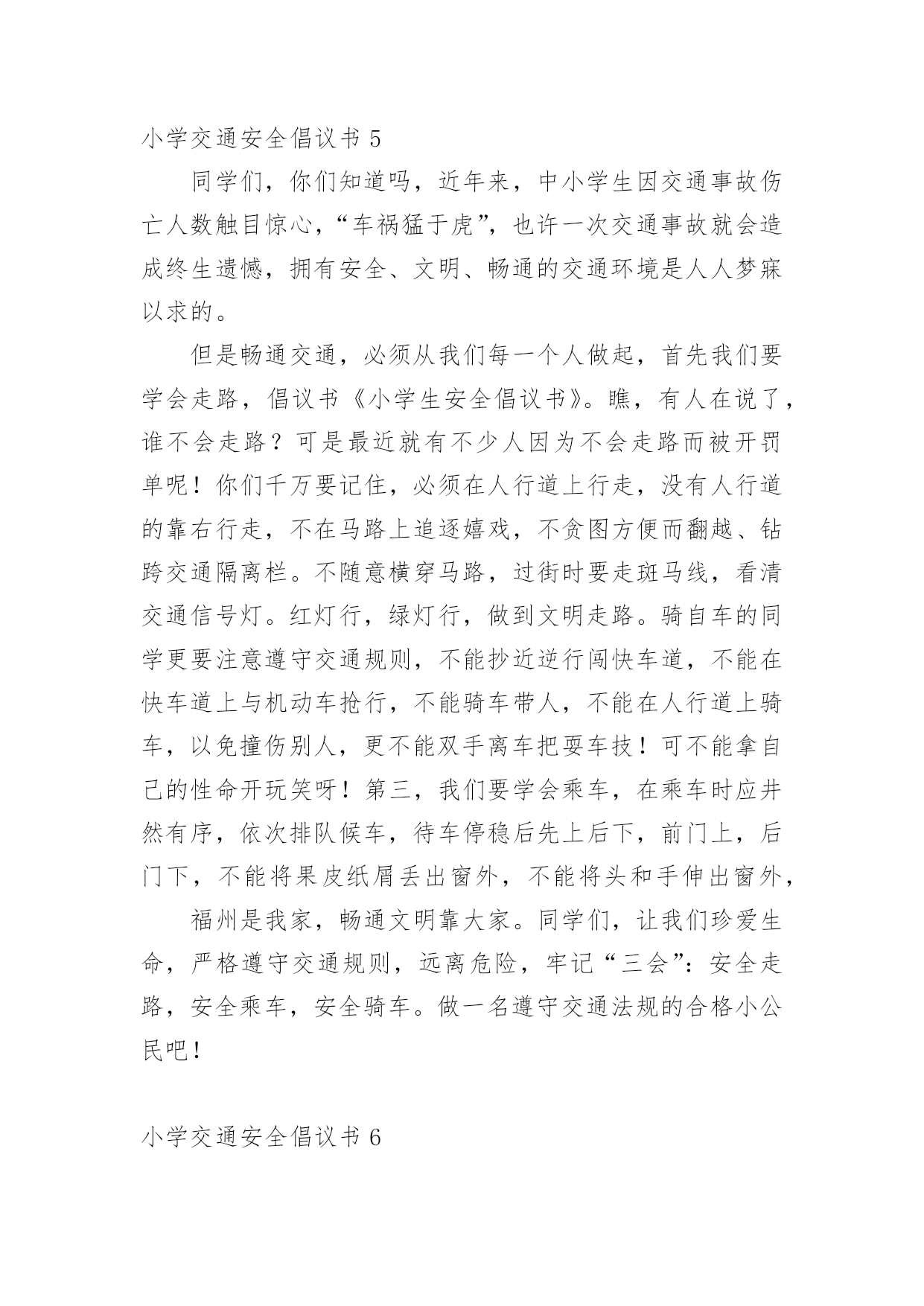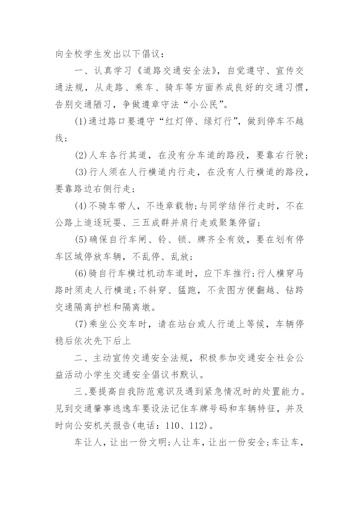 小学交通安全倡议书随着社会不断地进步,在很多情况下我们需要用到倡议书,倡议书本身不具有很强的约束力,有关人员可以表示响应,也可以不表示响应。相信写倡议书是一个让许多人都头痛的问题,以下是小编帮大家整理的小学交通安全倡议书,欢迎大家借鉴与参考,希望对大家有所帮助。小学交通安全倡议书1尊敬的家长朋友、亲爱的同学们:你们好!根据上级文件精神要求,近期,我们小学组织了广大师生认真学习有关交通法律法规和龙口市教育系统开展的“文明交通从我做起”主题教育实施意见,在校园内利用班会、校园网、黑板报等多种方式宣传交通安全。本周还将请交警到校讲座。同时还开展“家长送我上学校,我给家长提个醒”的“小手拉大手”活动,由我校小学生对接送自己的家长、长辈的不文明交通行为进行劝导。把交通安全延伸到每一个家庭,使文明交通活动家喻户晓,深入人心。为确保学生的出行安全,请家长配合学校和交警部门,教育引导孩子认真学习交通安全知识,提高交通安全意识和自我防护能力,同时要规范自己的交通行为,以自身的一言一行引导孩子养成良好的交通习惯。为此,我们倡议全校学生、家长做到:1、在道路上行走时,要在人行道内行走或靠路边行走。不要在道路两侧嬉戏、追逐或长时间逗留,不要突然横过道路。横过道路时,必须从人行横道、天桥及其他行人过街设施通过;在通过人行横道时,也要注意观察来往车辆,加强自身安全防范。2、通过设有交通信号灯和人行横道的路口时,应当注意观察人行横道指示灯,在绿灯亮时通行;通过没有交通信号灯或人行横道的路口,应注意避让通行的车辆,在没有车辆通行的前提下安全通行。3、横过道路要做到:左看、右看、再左看,三次确认保安全,即;左看,确认近处无驶来车辆;再右看,确认远处无车辆通过;再次左看确认安全,才能迅速安全通过。4、年满12周岁才能依法在道路上骑自行车。在道路上骑车时,应在非机动车道或靠路边平稳行驶,不要在道路上相互追逐、扶身并行或脱把骑车,更不要在路中心或机动车道上骑车。5、家长要带头并教育自己的孩子不乘坐无牌、无证及无证人员驾驶的机动车、农用车三轮车、电瓶三轮车和拖拉机等交通工具;不乘坐车况差、改装车座和超员、超载的车辆。6、每一名小学生要自觉学习交通安全知识,学会自我保护,并劝告家长文明通行,不酒后驾驶、不超速、不违法超车、不疲劳驾驶、不闯红灯、不乱停乱放,驾驶和乘坐二轮摩托车时须戴好安全头盔。交通的文明需要大家共同建设,文明的交通需要大家共同呵护。让我们携起手来,倡导文明交通,树立文明新风,为我市安全、畅通、和谐、文明的交通环境作出自已应有的贡献!小学交通安全倡议书2亲爱的同学们:随着社会的进步,我们的交通条件也日趋完善。大家在享受这种便利的同时,一些违反交通安全秩序的行为也时有发生。在行人车辆拥挤的道路上,同学们,你们是否注意到了潜藏的危险呢?我们大家都拥有一个快乐幸福的家庭,我们每一位同学都拥有深爱我们的父母,对于父母来说,孩子的安全是他们心头时刻的牵挂,我们每天如果能快快乐乐出门,平平安安回家,就是父母最大的幸福和快乐。同时,作为子女,父母和每一位我们深爱的亲朋好友的交通安全都与我们息息相关。大家只有遵守《道路交通安全法》,我们的每一个家庭才会快乐、幸福。红灯短暂而生命长久小学生交通安全倡议书小学生交通安全倡议书。遵章守纪就是尊重生命,尊重自我。当我们能做到这一切的时候,我们的社会便向文明的彼岸又靠近了一步。重视交通安全是我们每个人的义务,更是我们每位同学的责任。我们要牢固树立交通安全意识,自觉遵守交通法规,掌握交通安全知识,提高自我保护能力。让我们携起手来呵护这文明之花,珍爱彼此的生命吧!在此,学校团支部向全校学生发出以下倡议:一、认真学习《道路交通安全法》,自觉遵守、宣传交通法规,从走路、乘车、骑车等方面养成良好的交通习惯,告别交通陋习,争做遵章守法“小公民”。(1)通过路口要遵守“红灯停、绿灯行”,做到停车不越线;(2)人车各行其道,在没有分车道的路段,要靠右行驶;(3)行人须在人行横道内行走,在没有人行横道的路段,要靠路边右侧行走;(4)不骑车带人,不违章载物;与同学结伴行走时,不在公路上追逐玩耍、三五成群并肩行走或聚集停留;(5)确保自行车闸、铃、锁、牌齐全有效,要在划有停车区域停放车辆,不乱停、乱放;(6)骑自行车横过机动车道时,应下车推行;行人横穿马路时须走人行横道;不斜穿、猛跑,不贪图方便翻越、钻跨交通隔离护栏和隔离墩。(7)乘坐公交车时,请在站台或人行道上等候,车辆停稳后依次先下后上二、主动宣传交通安全法规,积极参加交通安全社会公益活动小学生交通安全倡议书默认。三、要提高自我防范意识及遇到紧急情况时的处置能力。见到交通肇事逃逸车要设法记住车牌号码和车辆特征,并及时向公安机关报告(电话:110、112)。车让人,让出一份文明;人让车,让出一份安