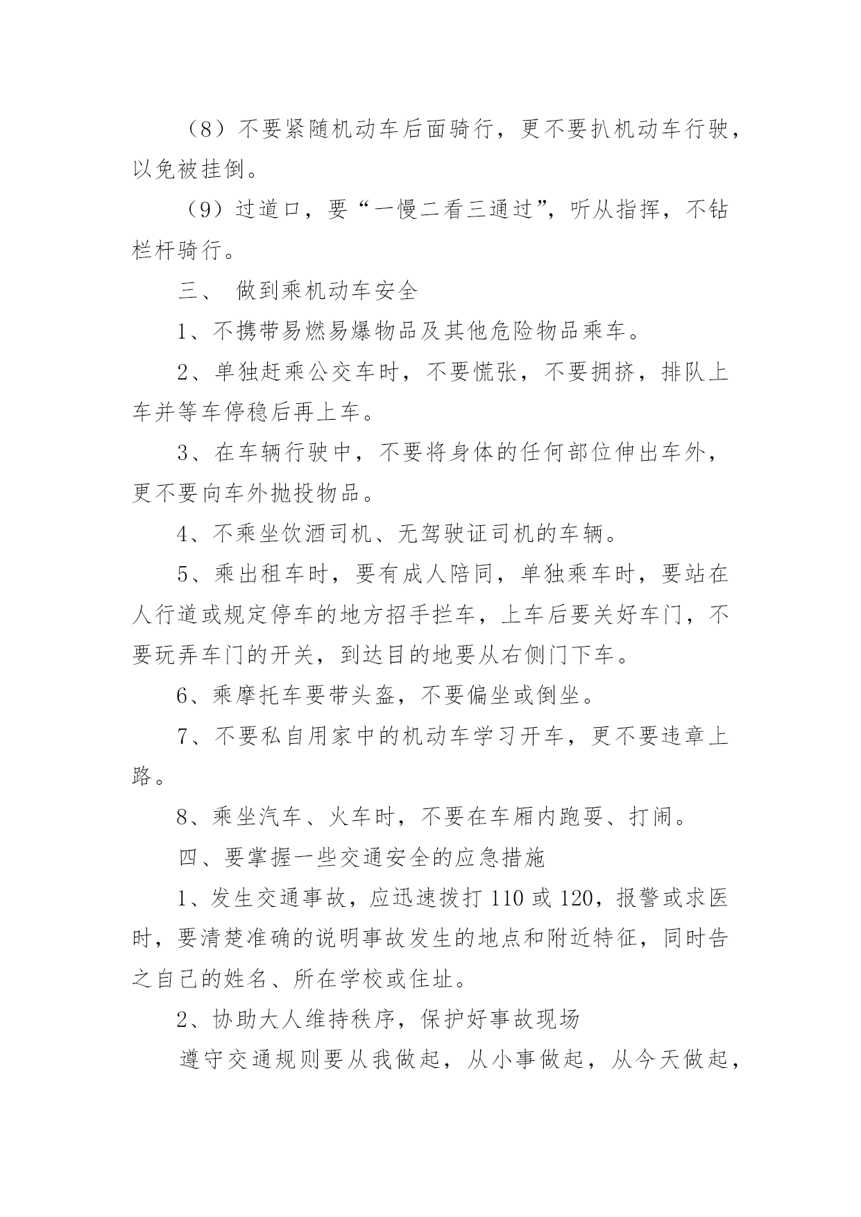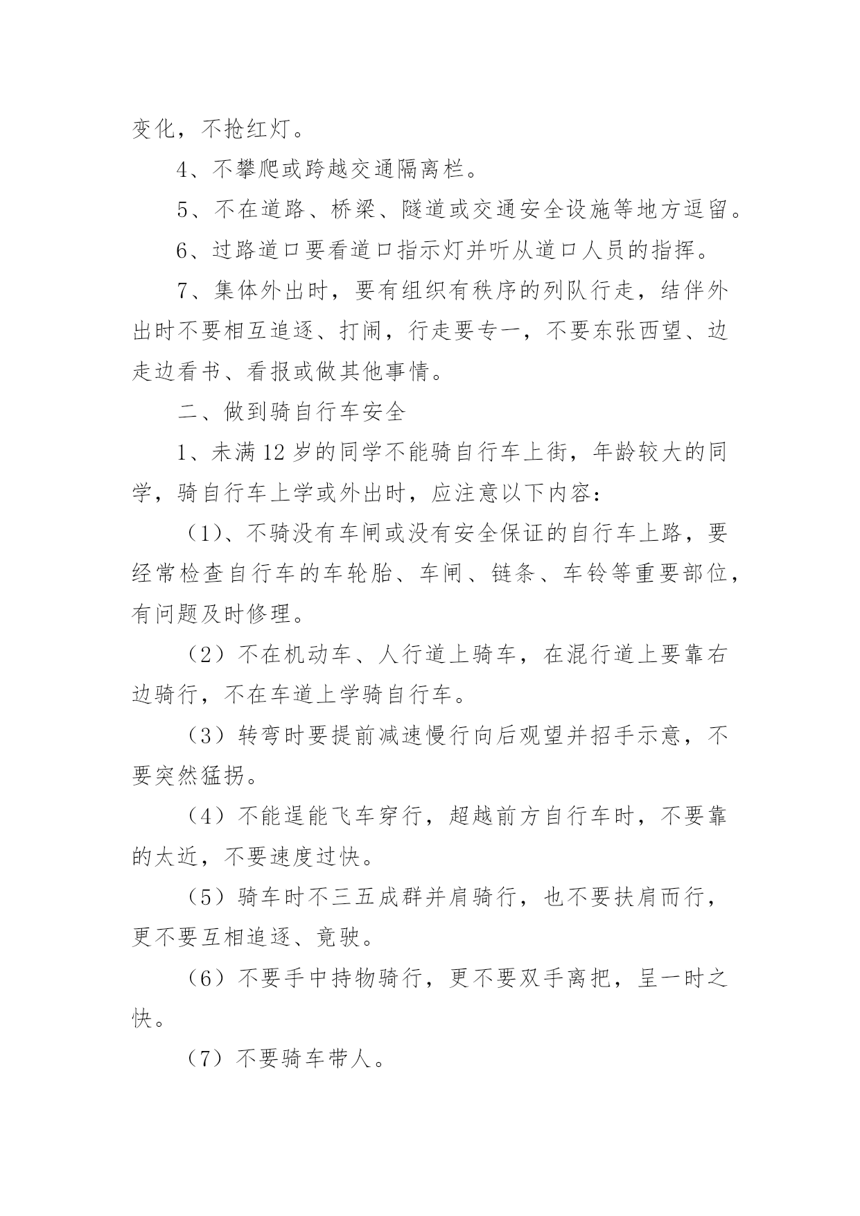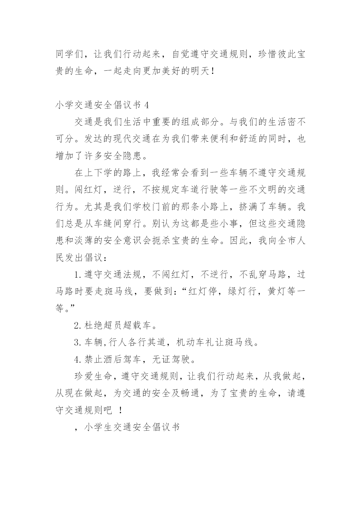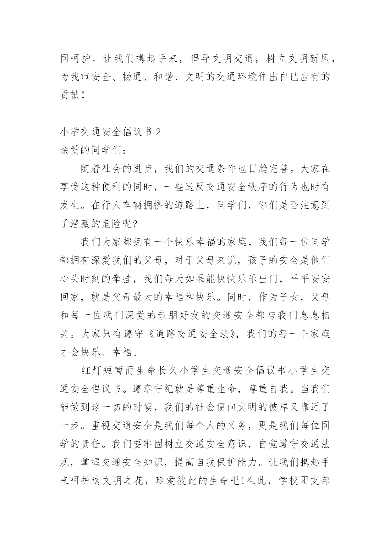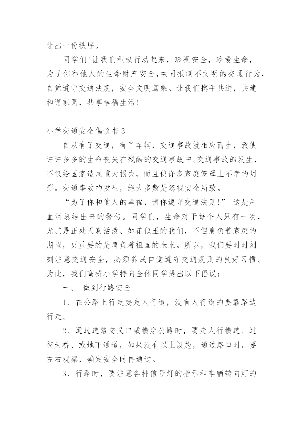小学交通安全倡议书随着社会不断地进步,在很多情况下我们需要用到倡议书,倡议书本身不具有很强的约束力,有关人员可以表示响应,也可以不表示响应。相信写倡议书是一个让许多人都头痛的问题,以下是小编帮大家整理的小学交通安全倡议书,欢迎大家借鉴与参考,希望对大家有所帮助。小学交通安全倡议书1尊敬的家长朋友、亲爱的同学们:你们好!根据上级文件精神要求,近期,我们小学组织了广大师生认真学习有关交通法律法规和龙口市教育系统开展的“文明交通从我做起”主题教育实施意见,在校园内利用班会、校园网、黑板报等多种方式宣传交通安全。本周还将请交警到校讲座。同时还开展“家长送我上学校,我给家长提个醒”的“小手拉大手”活动,由我校小学生对接送自己的家长、长辈的不文明交通行为进行劝导。把交通安全延伸到每一个家庭,使文明交通活动家喻户晓,深入人心。为确保学生的出行安全,请家长配合学校和交警部门,教育引导孩子认真学习交通安全知识,提高交通安全意识和自我防护能力,同时要规范自己的交通行为,以自身的一言一行引导孩子养成良好的交通习惯。为此,我们倡议全校学生、家长做到:1、在道路上行走时,要在人行道内行走或靠路边行走。不要在道路两侧嬉戏、追逐或长时间逗留,不要突然横过道路。横过道路时,必须从人行横道、天桥及其他行人过街设施通过;在通过人行横道时,也要注意观察来往车辆,加强自身安全防范。2、通过设有交通信号灯和人行横道的路口时,应当注意观察人行横道指示灯,在绿灯亮时通行;通过没有交通信号灯或人行横道的路口,应注意避让通行的车辆,在没有车辆通行的前提下安全通行。3、横过道路要做到:左看、右看、再左看,三次确认保安全,即;左看,确认近处无驶来车辆;再右看,确认远处无车辆通过;再次左看确认安全,才能迅速安全通过。4、年满12周岁才能依法在道路上骑自行车。在道路上骑车时,应在非机动车道或靠路边平稳行驶,不要在道路上相互追逐、扶身并行或脱把骑车,更不要在路中心或机动车道上骑车。5、家长要带头并教育自己的孩子不乘坐无牌、无证及无证人员驾驶的机动车、农用车三轮车、电瓶三轮车和拖拉机等交通工具;不乘坐车况差、改装车座和超员、超载的车辆。6、每一名小学生要自觉学习交通安全知识,学会自我保护,并劝告家长文明通行,不酒后驾驶、不超速、不违法超车、不疲劳驾驶、不闯红灯、不乱停乱放,驾驶和乘坐二轮摩托车时须戴好安全头盔。交通的文明需要大家共同建设,文明的交通需要大家共同呵护。让我们携起手来,倡导文明交通,树立文明新风,为我市安全、畅通、和谐、文明的交通环境作出自已应有的贡献!小学交通安全倡议书2亲爱的同学们:随着社会的进步,我们的交通条件也日趋完善。大家在享受这种便利的同时,一些违反交通安全秩序的行为也时有发生。在行人车辆拥挤的道路上,同学们,你们是否注意到了潜藏的危险呢?我们大家都拥有一个快乐幸福的家庭,我们每一位同学都拥有深爱我们的父母,对于父母来说,孩子的安全是他们心头时刻的牵挂,我们每天如果能快快乐乐出门,平平安安回家,就是父母最大的幸福和快乐。同时,作为子女,父母和每一位我们深爱的亲朋好友的交通安全都与我们息息相关。大家只有遵守《道路交通安全法》,我们的每一个家庭才会快乐、幸福。红灯短暂而生命长久小学生交通安全倡议书小学生交通安全倡议书。遵章守纪就是尊重生命,尊重自我。当我们能做到这一切的时候,我们的社会便向文明的彼岸又靠近了一步。重视交通安全是我们每个人的义务,更是我们每位同学的责任。我们要牢固树立交通安全意识,自觉遵守交通法规,掌握交通安全知识,提高自我保护能力。让我们携起手来呵护这文明之花,珍爱彼此的生命吧!在此,学校团支部向全校学生发出以下倡议:一、认真学习《道路交通安全法》,自觉遵守、宣传交通法规,从走路、乘车、骑车等方面养成良好的交通习惯,告别交通陋习,争做遵章守法“小公民”。(1)通过路口要遵守“红灯停、绿灯行”,做到停车不越线;(2)人车各行其道,在没有分车道的路段,要靠右行驶;(3)行人须在人行横道内行走,在没有人行横道的路段,要靠路边右侧行走;(4)不骑车带人,不违章载物;与同学结伴行走时,不在公路上追逐玩耍、三五成群并肩行走或聚集停留;(5)确保自行车闸、铃、锁、牌齐全有效,要在划有停车区域停放车辆,不乱停、乱放;(6)骑自行车横过机动车道时,应下车推行;行人横穿马路时须走人行横道;不斜穿、猛跑,不贪图方便翻越、钻跨交通隔离护栏和隔离墩。(7)乘坐公交车时,请在站台或人行道上等候,车辆停稳后依次先下后上二、主动宣传交通安全法规,积极参加交通安全社会公益活动小学生交通安全倡议书默认。三、要提高自我防范意识及遇到紧急情况时的处置能力。见到交通肇事逃逸车要设法记住车牌号码和车辆特征,并及时向公安机关报告(电话:110、112)。车让人,让出一份文明;人让车,让出一份安