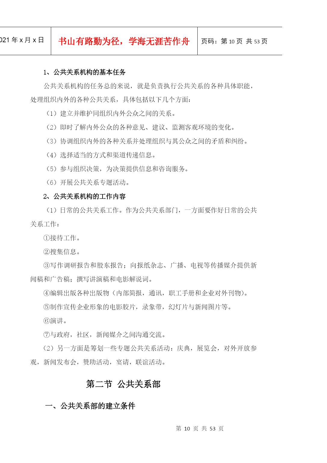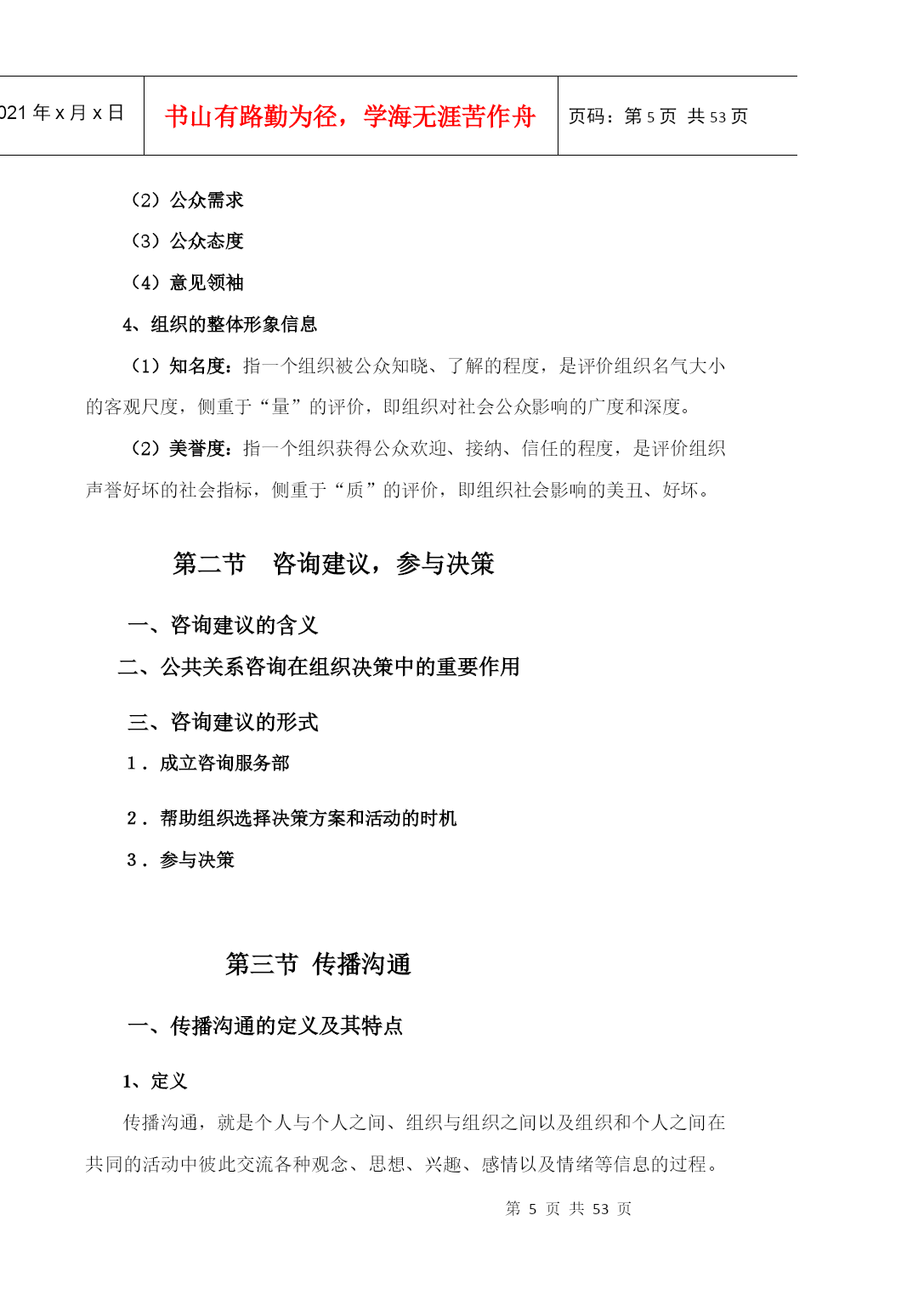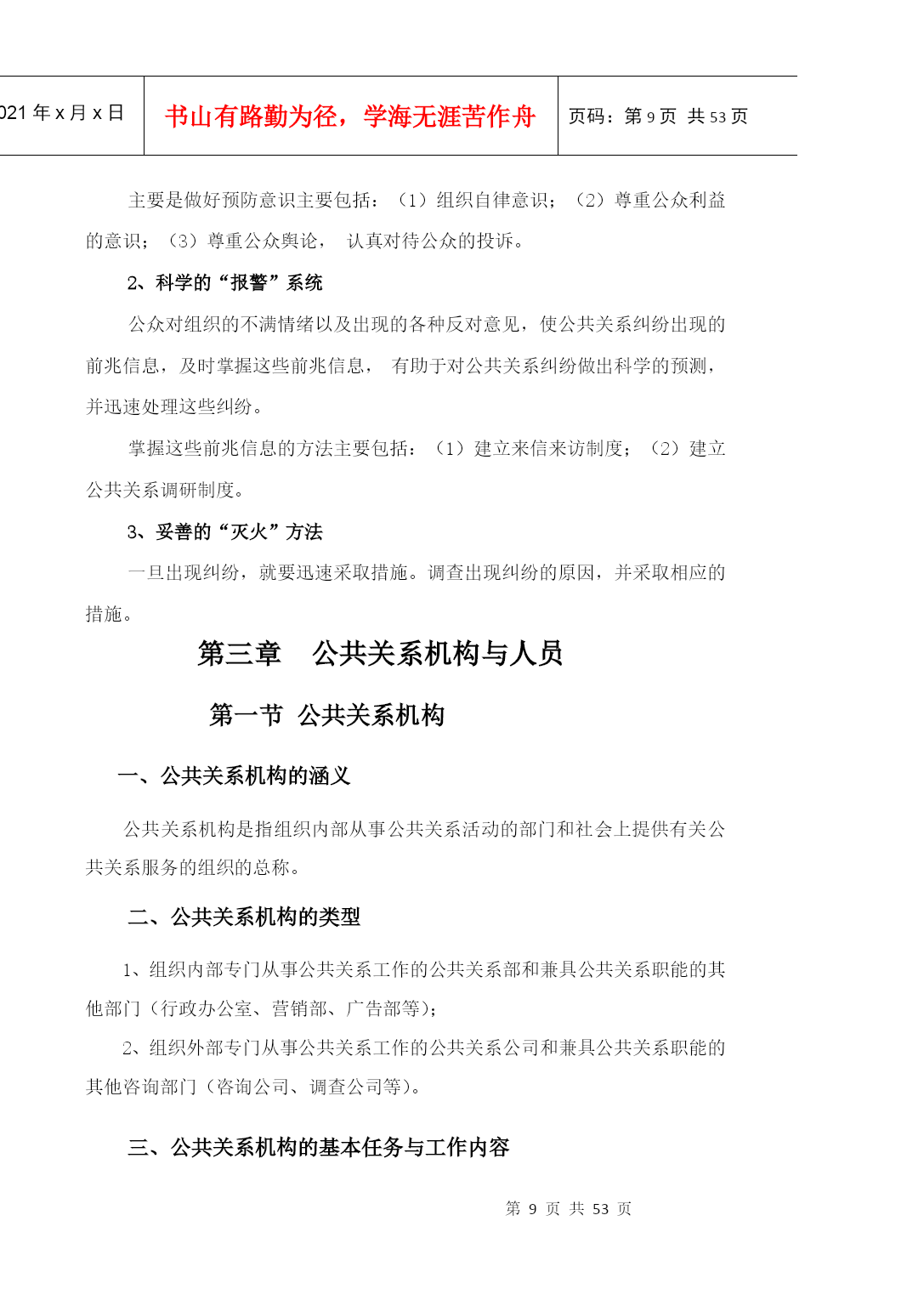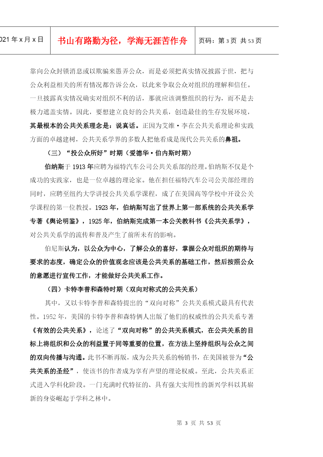 编号:时间:2021年x月x日书山有路勤为径,学海无涯苦作舟页码:第PAGE53页共NUMPAGES53页第PAGE\*MERGEFORMAT53页共NUMPAGES\*MERGEFORMAT53页第一章绪论第一节什么是公共关系一、公共关系的概念界定1、传播沟通论定义2、管理职能类定义3、利益均衡论定义我国最早研究公共关系学的一位学者明香安教授在其主编的《公共关系概论》中给出的定义是:“公共关系就是一个企业或组织,为了增进内部及外部公众的信任和支持,为自身事业的发展创造最佳的社会关系环境,在分析自身面临的各种内部、外部环境的前提下,采取一系列科学的政策和行动”。在此我们更倾向于明香安所给出的定义,以下的研究也是根据这个定义进行展开的。二、公共关系的内涵1、公共关系是一种客观存在的状态2、公共关系是一种有意识的活动三、公共关系活动与其它活动的区别1、公共关系活动不同于庸俗的人际关系(1)目的不同。一个是为了实现组织的利益,一个是为了实现个人的私利。(2)后果不同。公共关系最终谋求社会组织和公众利益的一致,而后者则是谋求个人的利益。2、公共关系并非单纯的迎来送往招待工作公共关系活动需要热情地接到宾客,进行必要的交际应酬工作,但只是公共关系活动的一个方面而已。公共关系活动更主要的工作是通过传播沟通,为组织创造最佳的公共关系环境。3、公共关系与宣传的区别(1)目的不同。公共关系的主要目的是争取公众的理解、信任、支持和合作;而宣传的主要目的是通过传播活动来影响和控制他人的思想。(2)宣传是一种单向的传播,而公共关系却是社会组织和公众之间的双向沟通。(3)宣传容易产生报喜不报忧,而公共关系生命力在于真实,必须“说真话”,既要报喜也要报忧。4、公共关系与广告的区别广告的直接目的在于促进产品销售。当广告用来影响特定公众对广告出资者的态度和行为时,便成为了一种公共关系活动,但作为公共关系活动的广告和一般的产品(商业)广告是有区别的。(1)产品广告视为了完成一定的销售任务,而公共关系广告则是通过社会组织与公众之间的传播沟通,树立良好的组织形象,为组织的发展创造最佳的社会关系环境。(2)产品广告为了达到一定的目的,可以采取艺术夸张的形式,而公共关系广告则必须实事求是,不允许夸张。第二节公共关系的产生和发展一、古代公共关系思想的萌芽二、现代公共关系的起源和发展(一)“公众受愚弄期”(巴纳姆时期)(二)“说真话”时期(艾维·李时期)艾维·李在受理调停后不久,即向报界发表了著名的《原则宣言》,提出了提出的“说真话”,“公众必须被告知”。在艾维·李看来,一个企业、一个组织要获得良好的形象和声誉,不是依靠向公众封锁消息或以欺骗来愚弄公众,而是必须把真实情况披露于世,把与公众利益相关的所有情况都告诉公众,以此来争取公众对组织的理解和信任。一旦披露真实情况确实对组织不利的话,那就应该调整组织的行为,而不是去极力遮盖实情。因此,要想建立良好的公共关系,创造最佳的生存发展环境,其最根本的公共关系理念是:说真话。正因为艾维·李在公共关系理论和实践方面的卓越建树,公共关系学界的多数人把他看成是现代公共关系的鼻祖。(三)“投公众所好”时期(爱德华·伯内斯时期)伯纳斯于1913年应聘为福特汽车公司公共关系部的经理。伯纳斯不仅是个成功的实践家,也是一位卓越的理论家。他在担任福特汽车公司公关部经理的同时,应聘至纽约大学讲授公共关系学课程,成了在美国高等学校中开设公关学课程的第一位教授。1923年,伯纳斯写出了世界上第一部系统的公共关系学专著《舆论明鉴》,1925年,伯纳斯完成第一本公关教科书《公共关系学》,对公共关系学的流传和普及产生了前所未有的影响。伯尼斯认为,以公众为中心,了解公众的喜好,掌握公众对组织的期待与要求的态度,确定公众的价值观念应该是公共关系的基础工作,然后按照公众的意愿进行宣传工作,才能做好公共关系工作。(四)卡特李普和森特时期(双向对称式的公共关系)其中,又以卡特李普和森特提出的“双向对称”公共关系模式最具有代表性。1952年,美国的卡特李普和森特俩人出版了他们的权威性的公共关系专著《有效的公共关系》,论述了“双向对称”的公共关系模式,在公共关系的目标上将组织和公众的利益置于同等重要的位置,在方法上坚持组织与公众之间的双向传播与沟通。此书不断再版,成为公共关系的畅销书,在美国被誉为“公共关系的圣经”,使该书的作者成为享有声望的理论权威。至此,公共关系正式进入学科化阶段。一门充满时代特征的、具有强大实用性的新兴学科以其崭新的身姿崛起于学科之林中。三、公共关系在中国的推广第二章公共关系的职能第一节采集信息,监测环境一、信息的来源制约和影响组织生存和发
