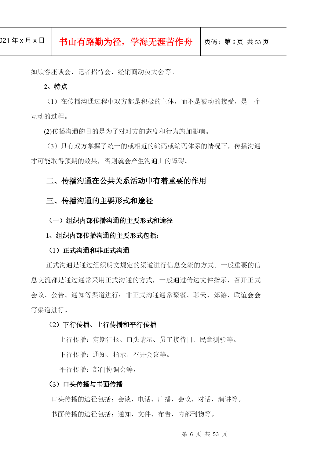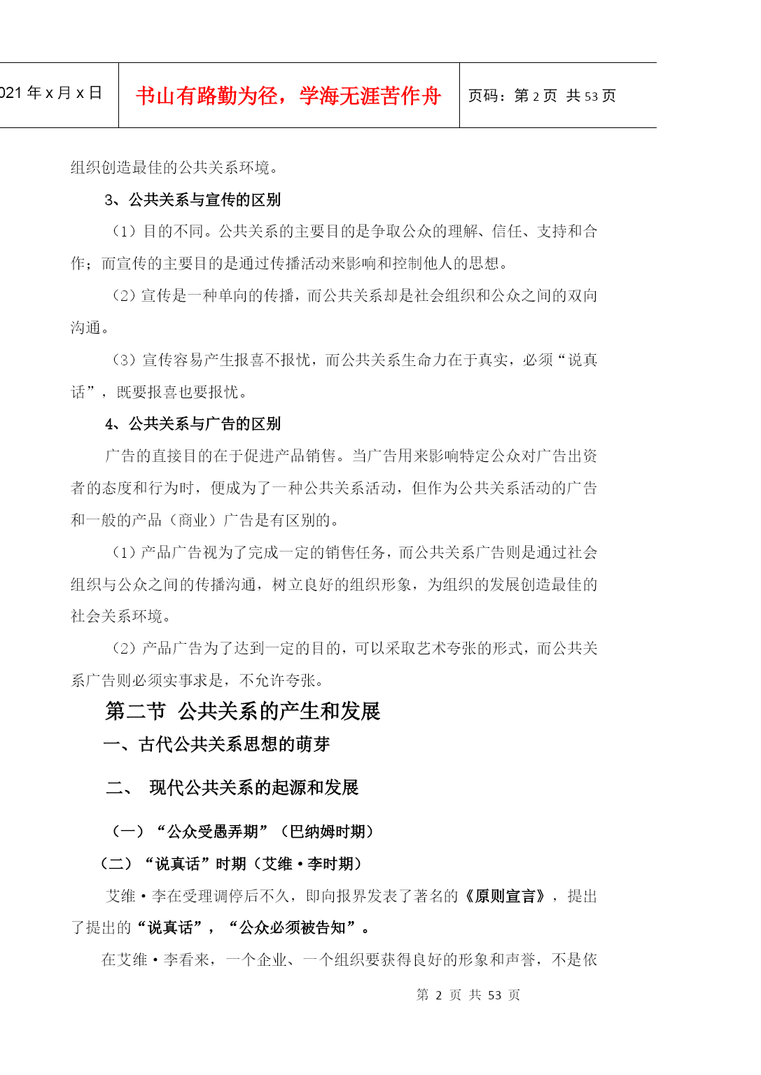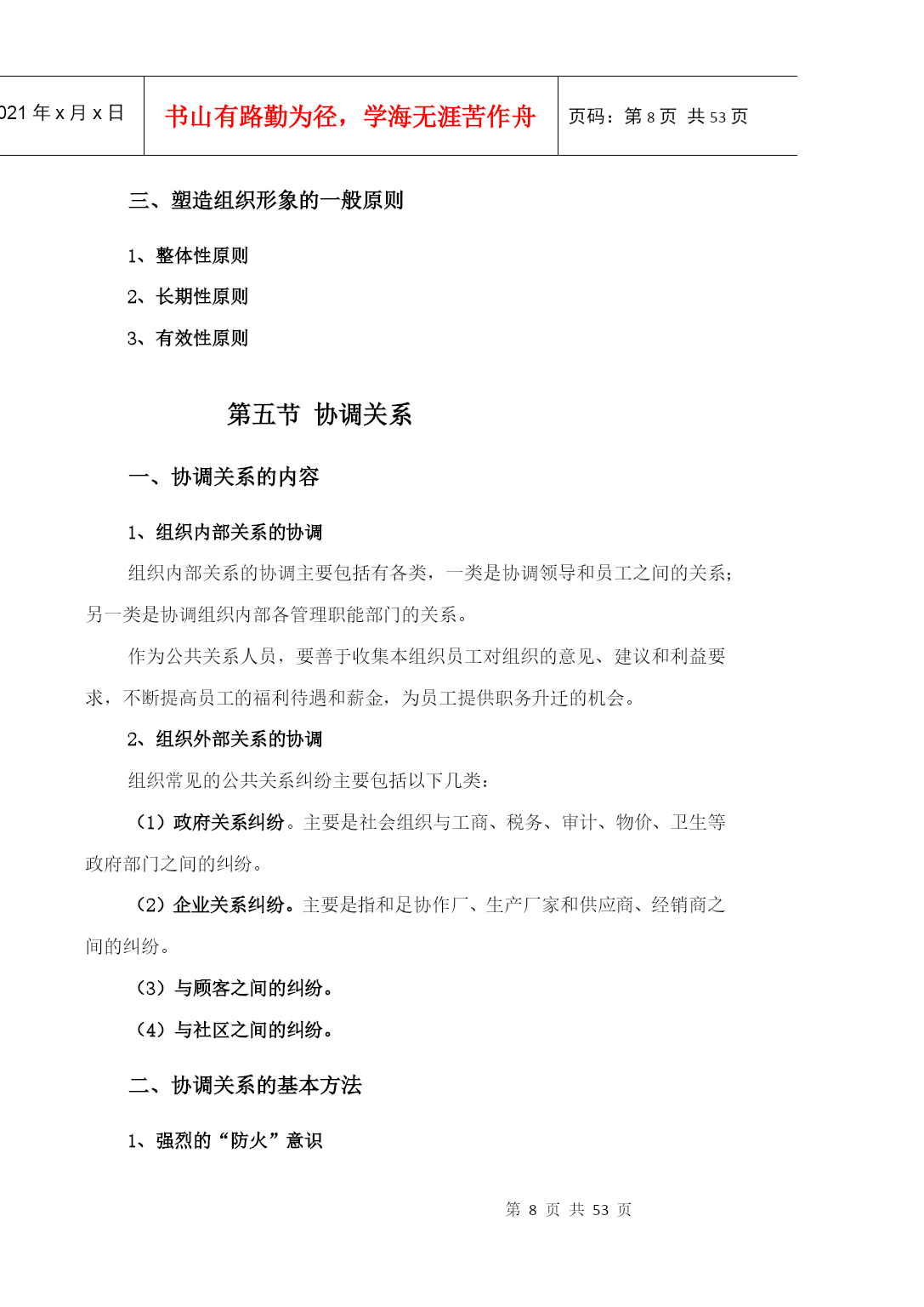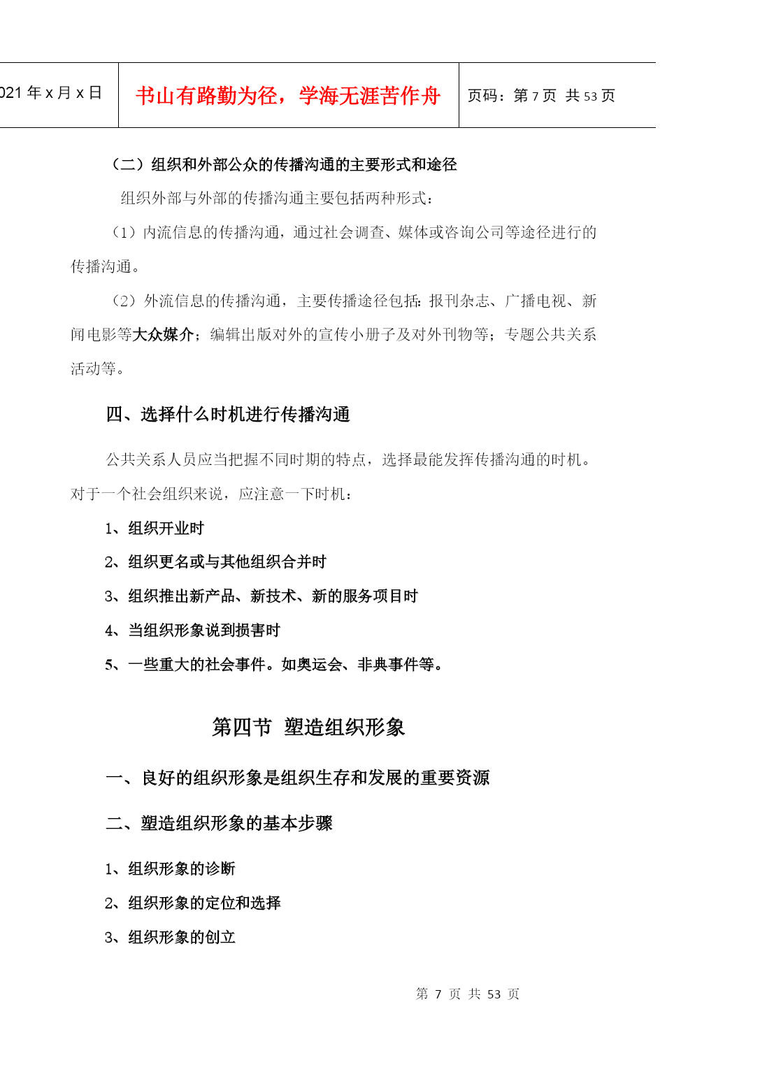 编号:时间:2021年x月x日书山有路勤为径,学海无涯苦作舟页码:第PAGE53页共NUMPAGES53页第PAGE\*MERGEFORMAT53页共NUMPAGES\*MERGEFORMAT53页第一章绪论第一节什么是公共关系一、公共关系的概念界定1、传播沟通论定义2、管理职能类定义3、利益均衡论定义我国最早研究公共关系学的一位学者明香安教授在其主编的《公共关系概论》中给出的定义是:“公共关系就是一个企业或组织,为了增进内部及外部公众的信任和支持,为自身事业的发展创造最佳的社会关系环境,在分析自身面临的各种内部、外部环境的前提下,采取一系列科学的政策和行动”。在此我们更倾向于明香安所给出的定义,以下的研究也是根据这个定义进行展开的。二、公共关系的内涵1、公共关系是一种客观存在的状态2、公共关系是一种有意识的活动三、公共关系活动与其它活动的区别1、公共关系活动不同于庸俗的人际关系(1)目的不同。一个是为了实现组织的利益,一个是为了实现个人的私利。(2)后果不同。公共关系最终谋求社会组织和公众利益的一致,而后者则是谋求个人的利益。2、公共关系并非单纯的迎来送往招待工作公共关系活动需要热情地接到宾客,进行必要的交际应酬工作,但只是公共关系活动的一个方面而已。公共关系活动更主要的工作是通过传播沟通,为组织创造最佳的公共关系环境。3、公共关系与宣传的区别(1)目的不同。公共关系的主要目的是争取公众的理解、信任、支持和合作;而宣传的主要目的是通过传播活动来影响和控制他人的思想。(2)宣传是一种单向的传播,而公共关系却是社会组织和公众之间的双向沟通。(3)宣传容易产生报喜不报忧,而公共关系生命力在于真实,必须“说真话”,既要报喜也要报忧。4、公共关系与广告的区别广告的直接目的在于促进产品销售。当广告用来影响特定公众对广告出资者的态度和行为时,便成为了一种公共关系活动,但作为公共关系活动的广告和一般的产品(商业)广告是有区别的。(1)产品广告视为了完成一定的销售任务,而公共关系广告则是通过社会组织与公众之间的传播沟通,树立良好的组织形象,为组织的发展创造最佳的社会关系环境。(2)产品广告为了达到一定的目的,可以采取艺术夸张的形式,而公共关系广告则必须实事求是,不允许夸张。第二节公共关系的产生和发展一、古代公共关系思想的萌芽二、现代公共关系的起源和发展(一)“公众受愚弄期”(巴纳姆时期)(二)“说真话”时期(艾维·李时期)艾维·李在受理调停后不久,即向报界发表了著名的《原则宣言》,提出了提出的“说真话”,“公众必须被告知”。在艾维·李看来,一个企业、一个组织要获得良好的形象和声誉,不是依靠向公众封锁消息或以欺骗来愚弄公众,而是必须把真实情况披露于世,把与公众利益相关的所有情况都告诉公众,以此来争取公众对组织的理解和信任。一旦披露真实情况确实对组织不利的话,那就应该调整组织的行为,而不是去极力遮盖实情。因此,要想建立良好的公共关系,创造最佳的生存发展环境,其最根本的公共关系理念是:说真话。正因为艾维·李在公共关系理论和实践方面的卓越建树,公共关系学界的多数人把他看成是现代公共关系的鼻祖。(三)“投公众所好”时期(爱德华·伯内斯时期)伯纳斯于1913年应聘为福特汽车公司公共关系部的经理。伯纳斯不仅是个成功的实践家,也是一位卓越的理论家。他在担任福特汽车公司公关部经理的同时,应聘至纽约大学讲授公共关系学课程,成了在美国高等学校中开设公关学课程的第一位教授。1923年,伯纳斯写出了世界上第一部系统的公共关系学专著《舆论明鉴》,1925年,伯纳斯完成第一本公关教科书《公共关系学》,对公共关系学的流传和普及产生了前所未有的影响。伯尼斯认为,以公众为中心,了解公众的喜好,掌握公众对组织的期待与要求的态度,确定公众的价值观念应该是公共关系的基础工作,然后按照公众的意愿进行宣传工作,才能做好公共关系工作。(四)卡特李普和森特时期(双向对称式的公共关系)其中,又以卡特李普和森特提出的“双向对称”公共关系模式最具有代表性。1952年,美国的卡特李普和森特俩人出版了他们的权威性的公共关系专著《有效的公共关系》,论述了“双向对称”的公共关系模式,在公共关系的目标上将组织和公众的利益置于同等重要的位置,在方法上坚持组织与公众之间的双向传播与沟通。此书不断再版,成为公共关系的畅销书,在美国被誉为“公共关系的圣经”,使该书的作者成为享有声望的理论权威。至此,公共关系正式进入学科化阶段。一门充满时代特征的、具有强大实用性的新兴学科以其崭新的身姿崛起于学科之林中。三、公共关系在中国的推广第二章公共关系的职能第一节采集信息,监测环境一、信息的来源制约和影响组织生存和发