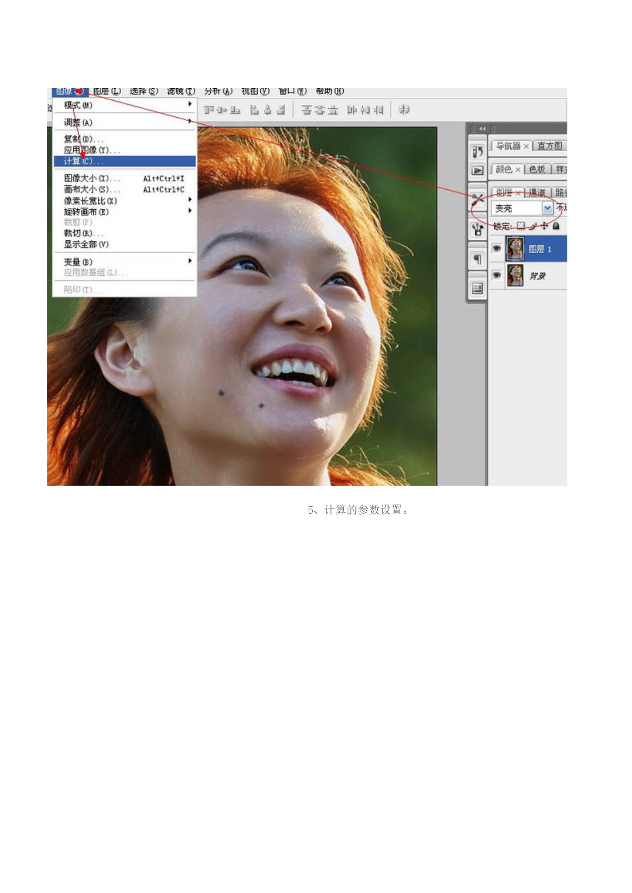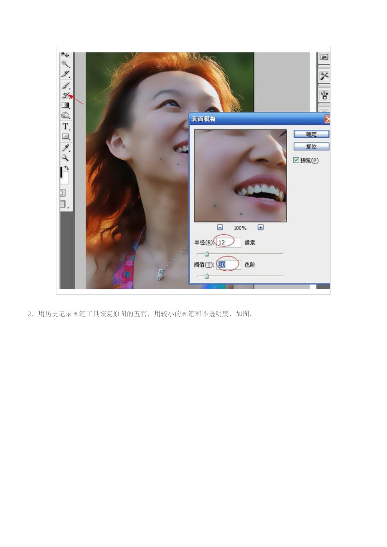 智能双曲线快速磨皮教程[2011-10-2]来源:照片处理网作者:昆山小镇虽然用的是双曲线的磨皮方法。不过本文的双曲线操作上更为简单和智能。人物脸部斑点及痘痘的暗部及高光选区都用计算工具得出,然后分别调暗及调亮即可消除斑点,省去了双曲线中用手工具涂抹的复杂过程。原图<点小图查看大图>最终效果<点小图查看大图>1、复制图层1(ctrl+j)后,点击一下历史记录画笔工具,然后滤镜-模糊—表面模糊,参数如下。2、用历史记录画笔工具恢复原图的五官,用较小的画笔和不透明度,如图。3、耳朵项链黑痣等地方都要用小画笔放大图像N倍细心还原。4、图层1——变亮模式,图像——计算。5、计算的参数设置。6、计算参数设置好后点确定会弹出此窗口,确定。7、右下角点击“创建新的填充或调整图层”按钮,点曲线,为计算出来的泛白选区做曲线调整层。8、在生成的曲线1图层,图像——调整——自动色阶,拉开对比,生成选区。9、回到图层1图层,将原先的混合模式变亮改为变暗,然后计算,得到我们需要的暗黑斑点选区。10、同样给该图层做个曲线图层,参数都不用设置。11、同样做个自动色阶。12、然后分别对两个曲线蒙版图层填充50%黑,此法可以更加精确选取需要的过白过暗选区。13、再分别对两个曲线蒙版做高斯模糊0.5两次,以柔化选区边缘,使选区非选区能融合自然。14、点掉图层1的眼睛后,如图建一个纯黑填充图层。15、然后选取混合模式里的颜色,此法的用途是为了回避有色图层对曲线图层的视觉干扰。16、双击曲线1缩览图,弹出曲线面板,拉动曲线,密切注意脸部暗黑斑点,以自然融合到皮肤里是最好了,不要有太大反差。17、双击曲线2缩览图,弹出面板,下拉曲线,让泛白选区融合到皮肤像素即可。18、点掉最上面的颜色填充层眼睛,可以看到斑点都去干净了。最终效果:<点小图查看大图>