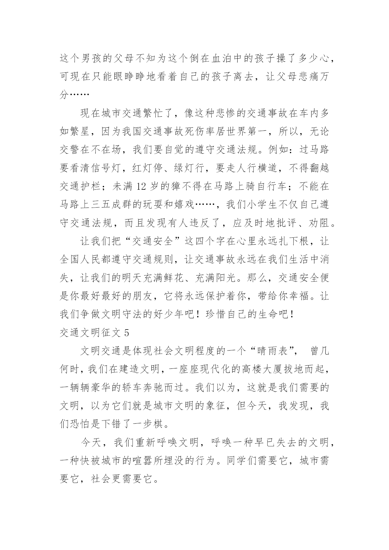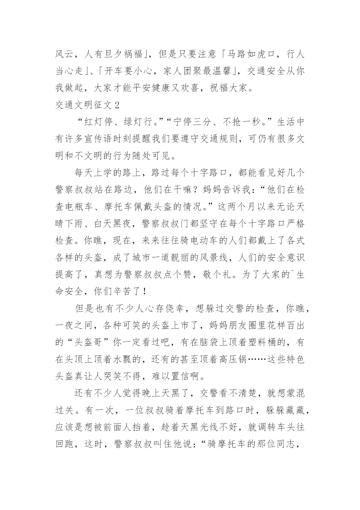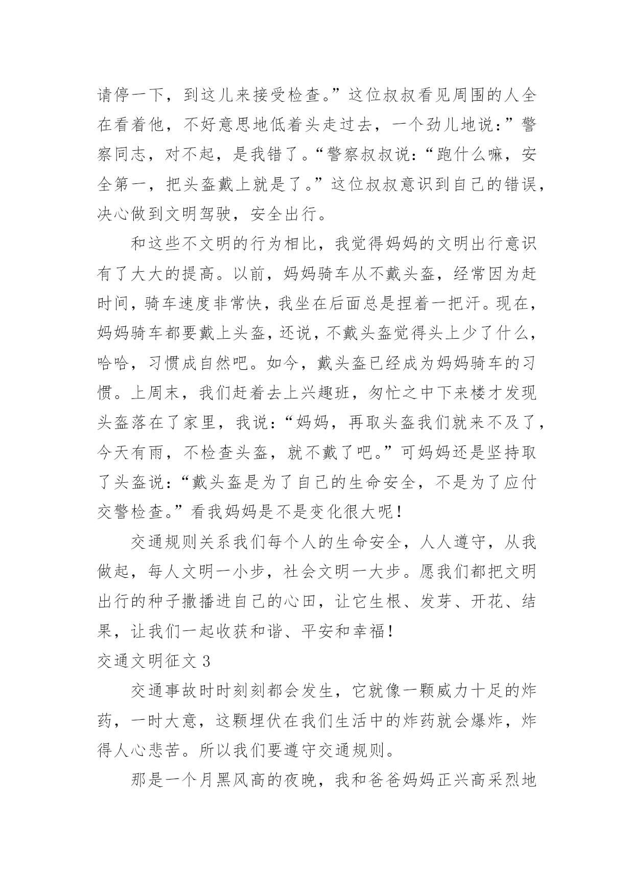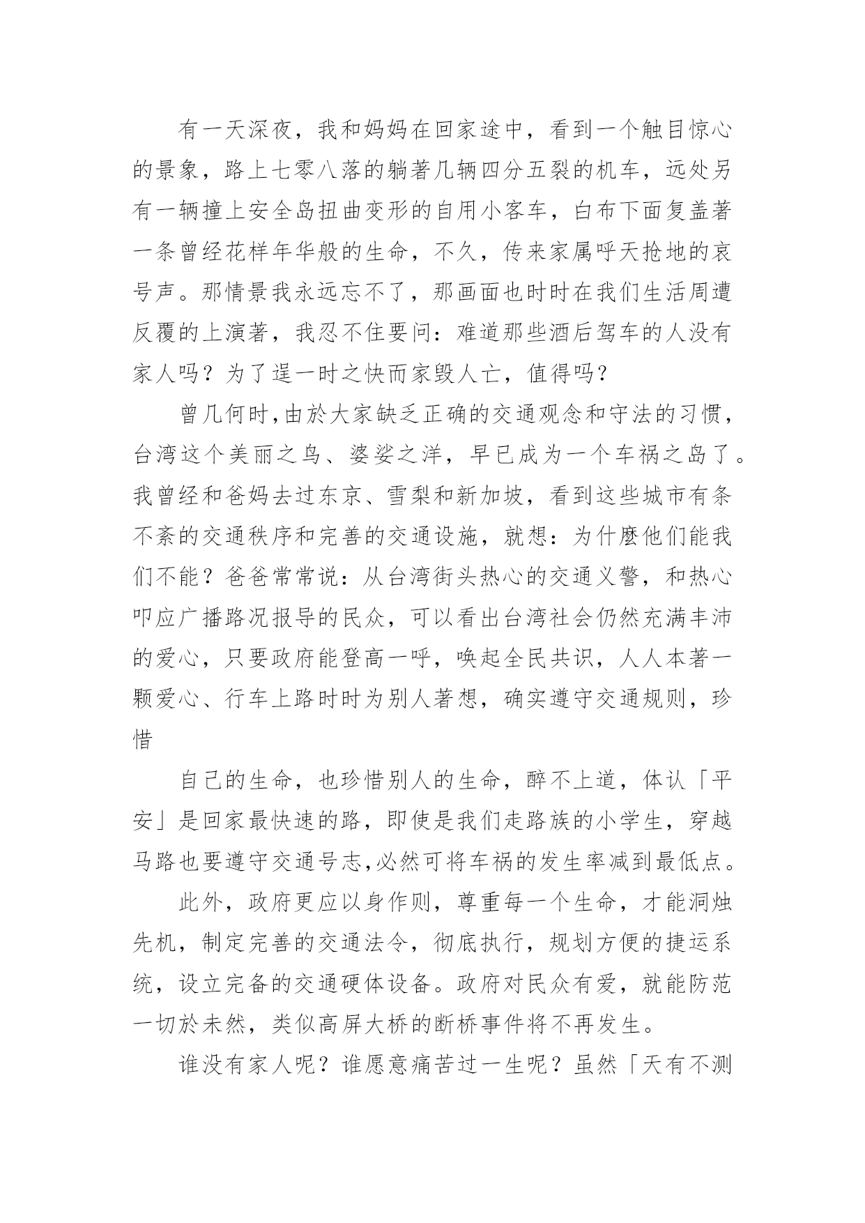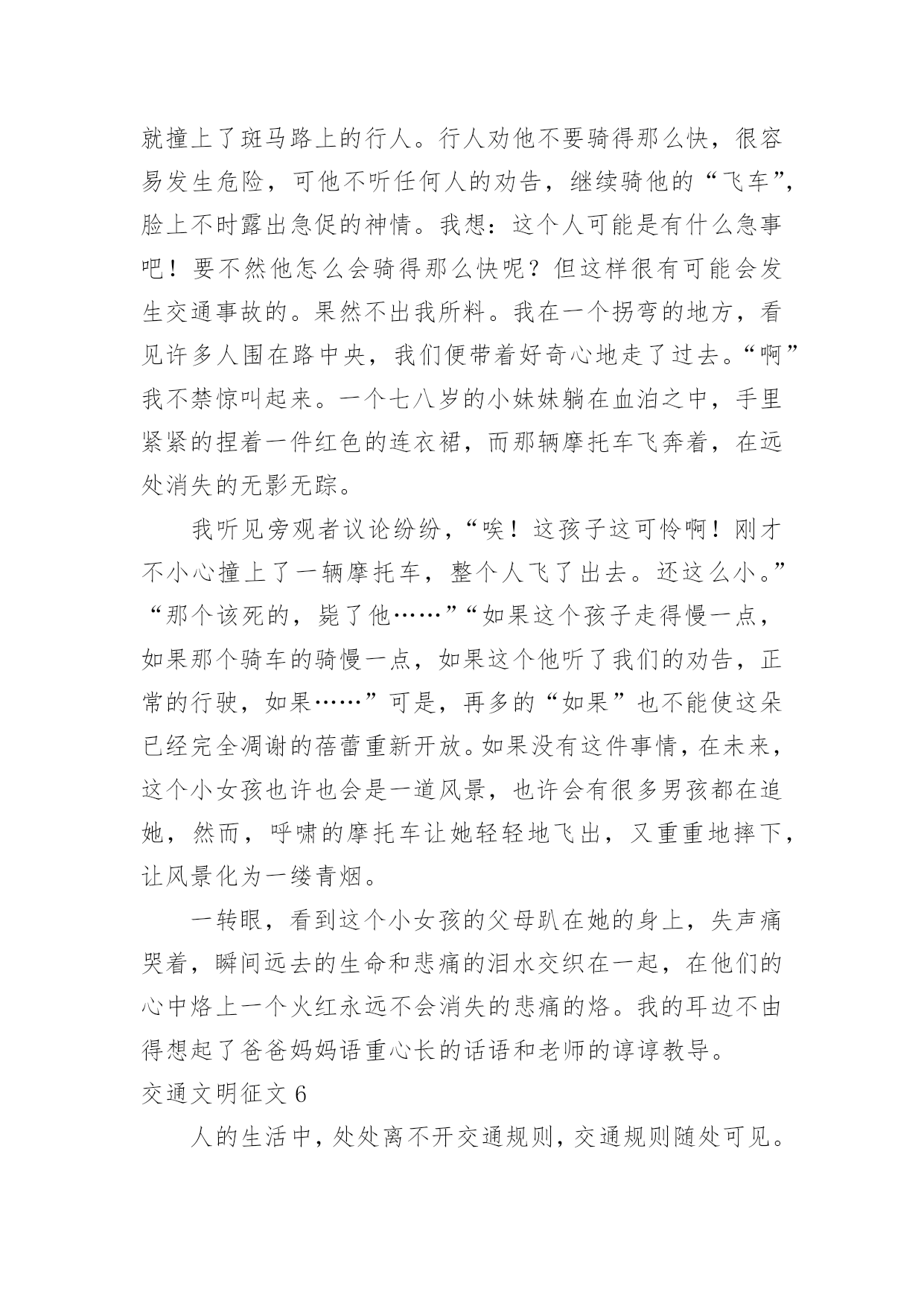 交通文明征文交通文明征文合集15篇在日常学习、工作抑或是生活中,大家都经常接触到征文吧,借助征文可以提高我们的语言组织能力。还是对征文一筹莫展吗?以下是小编帮大家整理的交通文明征文,希望对大家有所帮助。交通文明征文1当我们坐在舒服的汽车上时,可能会舒心地听歌,悠闲地欣赏窗外的风景。但你们可曾想过有多少生命丧失在车轮之下呢?我们嘴里唱着“红灯停,绿灯行。”如今又有几个司机遵守法规呢?就因为大多数司机超速行驶,而导致一些血案的发生。在我的印象中深刻的事故中有这样一件事:一个大约三四岁的小男孩,在跑向对面街的时候发生了一场惨剧。这是司机的大意,还是男孩的不小心,还是小学生交通安全作文我觉得应该有双方面的责任,一方面是司机不应该酒后驾车,而且驾车时要有熟练的技术,随时要有警惕性。二是人们应该遵守交通规则,要做到“宁停1分,不抢一秒。”这一个个血的教训还不够吗?如果不控制住,那世界会变成什么样子呀。一个个小生命萌芽了,但一个个生命又死于车轮之下我们作为小学生应该广泛宣传交通知识,也有义务向自己的亲朋好友宣传,并争做一个文明守纪的小学生。交通安全征文随着科技的发展,社会的进步,人类的运输方式也越来越多元化。这样一个庞大的运输体系必定需要一部合理的法规来调控,才能正常运作。这便是《交通法规》,一部需要我们每个人用实际行动维护的法规。除了我们自己要注意“过马路走斑马线”,“不骑车带人”等基本的交通法规外,还应提醒自己的父母安全驾车。一部指导安全行车的《交通法规》并不是一纸简单的文字规定,它是人们从长期的交通实践中由几代人乃至数十代人的经验与血的教训中孕育而成,是指导每个驾驶员安全行车的宝贵财富,从广义上说,《交通法规》是每个交通参与者的宝贵财富。有一句交通安全宣传语说得好:“交通法规生命之友”。《交通法规》的作用是体现在方方面面的。比如:在交叉路口,为了保证各方行经路口的车辆都能有序地安全通过,防止拥挤、堵塞、交通事故的发生,就在路口设置红绿灯及相关信号设施。红灯是危险的信号,红灯是“鲜血”的象征、“死亡”的招唤,应该在我们的思想上引起足够的重视,在红灯面前我们应该坚决地STOP。只有绿灯才能带领我们进入安全的.坦途,绿灯象征着“生命”与“平安”。我们要牢记:没有红灯的约束,就没有绿灯的通行。愿我们共同的努力,可以使交通更通畅,生活更安全。值得我们深思的交通安全有一天深夜,我和妈妈在回家途中,看到一个触目惊心的景象,路上七零八落的躺著几辆四分五裂的机车,远处另有一辆撞上安全岛扭曲变形的自用小客车,白布下面复盖著一条曾经花样年华般的生命,不久,传来家属呼天抢地的哀号声。那情景我永远忘不了,那画面也时时在我们生活周遭反覆的上演著,我忍不住要问:难道那些酒后驾车的人没有家人吗?为了逞一时之快而家毁人亡,值得吗?曾几何时,由於大家缺乏正确的交通观念和守法的习惯,台湾这个美丽之鸟、婆娑之洋,早已成为一个车祸之岛了。我曾经和爸妈去过东京、雪梨和新加坡,看到这些城市有条不紊的交通秩序和完善的交通设施,就想:为什麼他们能我们不能?爸爸常常说:从台湾街头热心的交通义警,和热心叩应广播路况报导的民众,可以看出台湾社会仍然充满丰沛的爱心,只要政府能登高一呼,唤起全民共识,人人本著一颗爱心、行车上路时时为别人著想,确实遵守交通规则,珍惜自己的生命,也珍惜别人的生命,醉不上道,体认「平安」是回家最快速的路,即使是我们走路族的小学生,穿越马路也要遵守交通号志,必然可将车祸的发生率减到最低点。此外,政府更应以身作则,尊重每一个生命,才能洞烛先机,制定完善的交通法令,彻底执行,规划方便的捷运系统,设立完备的交通硬体设备。政府对民众有爱,就能防范一切於未然,类似高屏大桥的断桥事件将不再发生。谁没有家人呢?谁愿意痛苦过一生呢?虽然「天有不测风云,人有旦夕祸福」,但是只要注意「马路如虎口,行人当心走」、「开车要小心,家人团聚最温馨」,交通安全从你我做起,大家才能平安健康又欢喜,祝福大家。交通文明征文2“红灯停、绿灯行。”“宁停三分、不抢一秒。”生活中有许多宣传语时刻提醒我们要遵守交通规则,可仍有很多文明和不文明的行为随处可见。每天上学的路上,路过每个十字路口,都能看见好几个警察叔叔站在路边,他们在干嘛?妈妈告诉我:“他们在检查电瓶车、摩托车佩戴头盔的情况。”这两个月以来无论天晴下雨、白天黑夜,警察叔叔门都坚守在每个十字路口严格检查。你瞧,现在,来来往往骑电动车的人们都戴上了各式各样的头盔,成了城市一道靓丽的风景线,人们的安全意识提高了,真想为警察叔叔点个赞,敬个礼。为了大家的`生命安全,你们辛苦了!但是也有不少人心存侥幸,想躲过交警的检查,你瞧,一夜之间,各种可笑的头盔上市了,妈妈朋友圈里花样百出的“头盔哥”你一定看过吧,有在脑袋上顶着塑料桶的,有在头顶上顶着水瓢的,还有的甚
