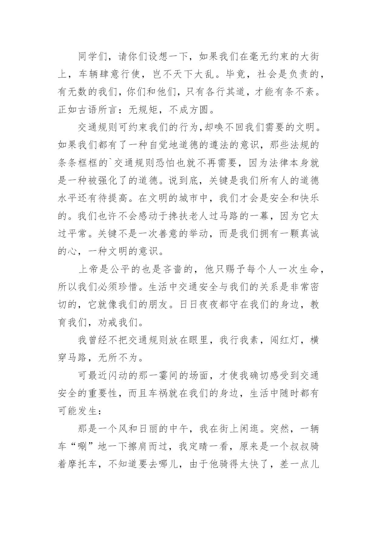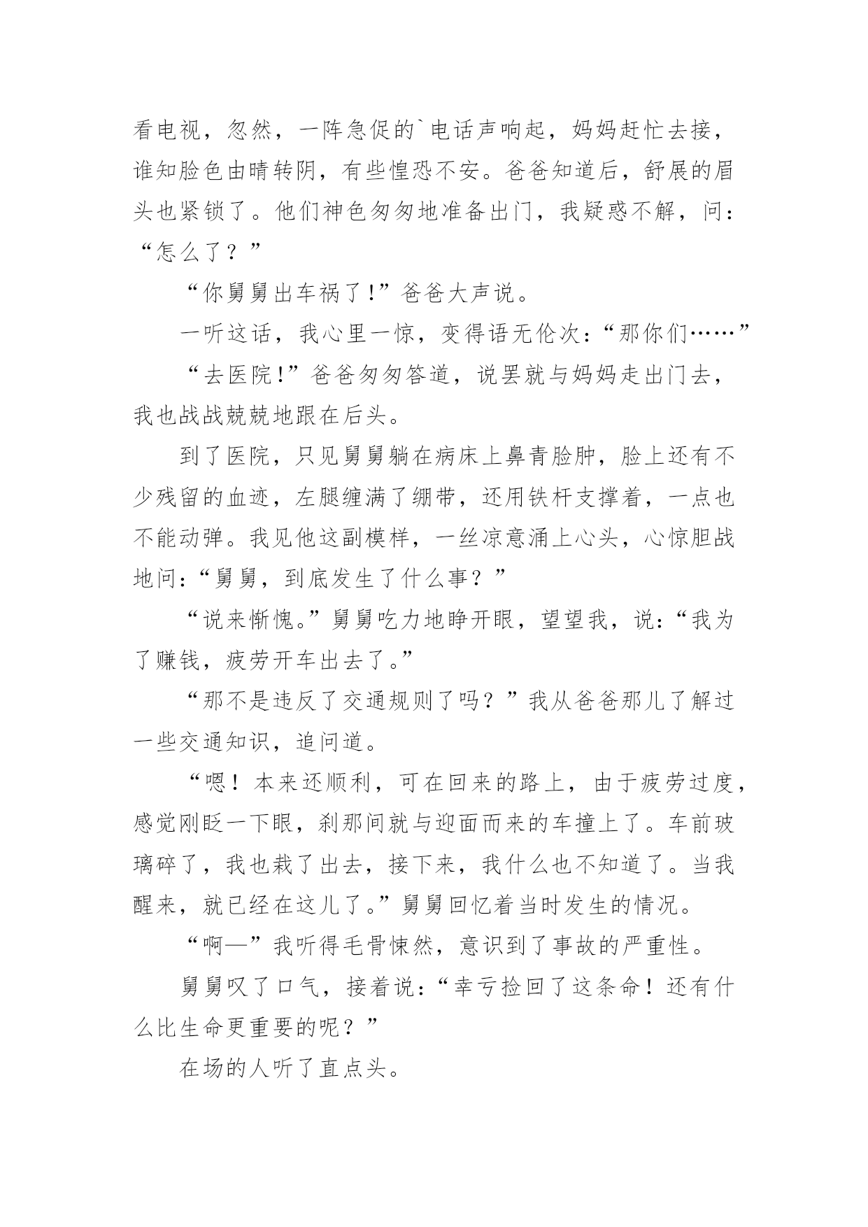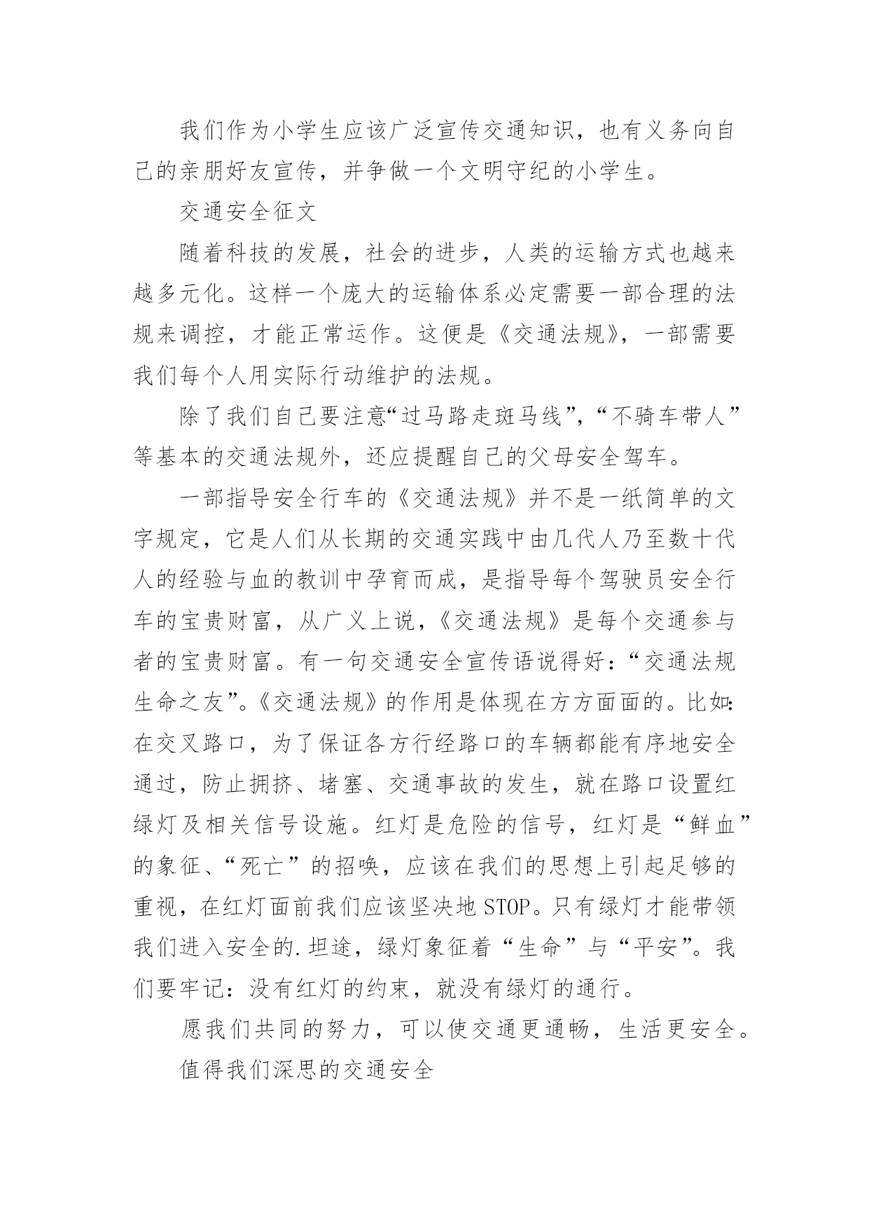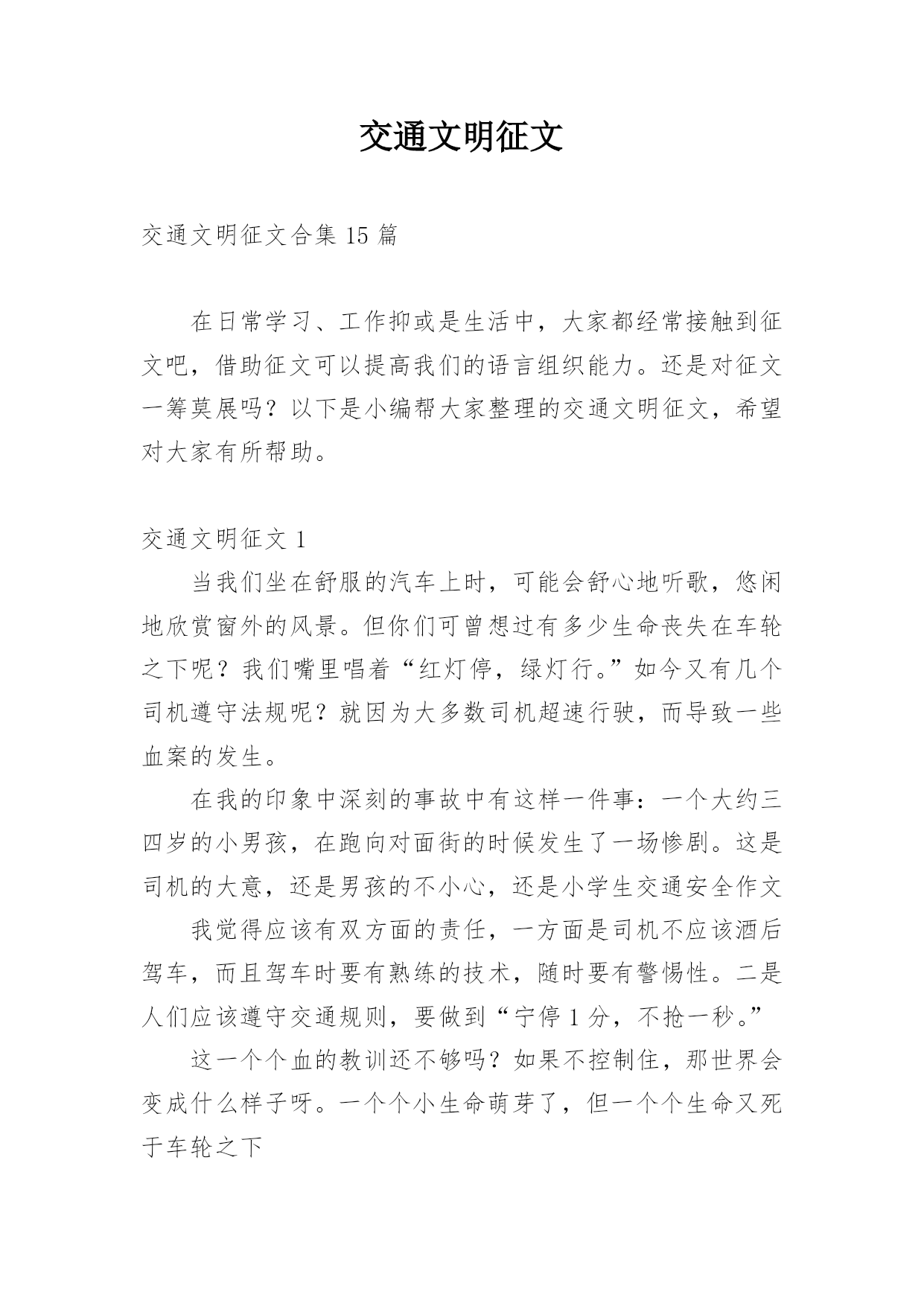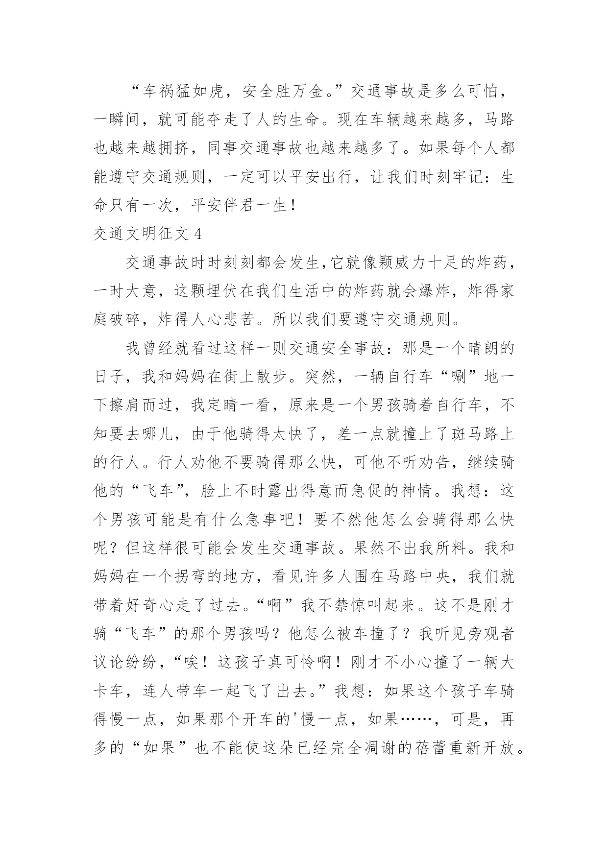 交通文明征文交通文明征文合集15篇在日常学习、工作抑或是生活中,大家都经常接触到征文吧,借助征文可以提高我们的语言组织能力。还是对征文一筹莫展吗?以下是小编帮大家整理的交通文明征文,希望对大家有所帮助。交通文明征文1当我们坐在舒服的汽车上时,可能会舒心地听歌,悠闲地欣赏窗外的风景。但你们可曾想过有多少生命丧失在车轮之下呢?我们嘴里唱着“红灯停,绿灯行。”如今又有几个司机遵守法规呢?就因为大多数司机超速行驶,而导致一些血案的发生。在我的印象中深刻的事故中有这样一件事:一个大约三四岁的小男孩,在跑向对面街的时候发生了一场惨剧。这是司机的大意,还是男孩的不小心,还是小学生交通安全作文我觉得应该有双方面的责任,一方面是司机不应该酒后驾车,而且驾车时要有熟练的技术,随时要有警惕性。二是人们应该遵守交通规则,要做到“宁停1分,不抢一秒。”这一个个血的教训还不够吗?如果不控制住,那世界会变成什么样子呀。一个个小生命萌芽了,但一个个生命又死于车轮之下我们作为小学生应该广泛宣传交通知识,也有义务向自己的亲朋好友宣传,并争做一个文明守纪的小学生。交通安全征文随着科技的发展,社会的进步,人类的运输方式也越来越多元化。这样一个庞大的运输体系必定需要一部合理的法规来调控,才能正常运作。这便是《交通法规》,一部需要我们每个人用实际行动维护的法规。除了我们自己要注意“过马路走斑马线”,“不骑车带人”等基本的交通法规外,还应提醒自己的父母安全驾车。一部指导安全行车的《交通法规》并不是一纸简单的文字规定,它是人们从长期的交通实践中由几代人乃至数十代人的经验与血的教训中孕育而成,是指导每个驾驶员安全行车的宝贵财富,从广义上说,《交通法规》是每个交通参与者的宝贵财富。有一句交通安全宣传语说得好:“交通法规生命之友”。《交通法规》的作用是体现在方方面面的。比如:在交叉路口,为了保证各方行经路口的车辆都能有序地安全通过,防止拥挤、堵塞、交通事故的发生,就在路口设置红绿灯及相关信号设施。红灯是危险的信号,红灯是“鲜血”的象征、“死亡”的招唤,应该在我们的思想上引起足够的重视,在红灯面前我们应该坚决地STOP。只有绿灯才能带领我们进入安全的.坦途,绿灯象征着“生命”与“平安”。我们要牢记:没有红灯的约束,就没有绿灯的通行。愿我们共同的努力,可以使交通更通畅,生活更安全。值得我们深思的交通安全有一天深夜,我和妈妈在回家途中,看到一个触目惊心的景象,路上七零八落的躺著几辆四分五裂的机车,远处另有一辆撞上安全岛扭曲变形的自用小客车,白布下面复盖著一条曾经花样年华般的生命,不久,传来家属呼天抢地的哀号声。那情景我永远忘不了,那画面也时时在我们生活周遭反覆的上演著,我忍不住要问:难道那些酒后驾车的人没有家人吗?为了逞一时之快而家毁人亡,值得吗?曾几何时,由於大家缺乏正确的交通观念和守法的习惯,台湾这个美丽之鸟、婆娑之洋,早已成为一个车祸之岛了。我曾经和爸妈去过东京、雪梨和新加坡,看到这些城市有条不紊的交通秩序和完善的交通设施,就想:为什麼他们能我们不能?爸爸常常说:从台湾街头热心的交通义警,和热心叩应广播路况报导的民众,可以看出台湾社会仍然充满丰沛的爱心,只要政府能登高一呼,唤起全民共识,人人本著一颗爱心、行车上路时时为别人著想,确实遵守交通规则,珍惜自己的生命,也珍惜别人的生命,醉不上道,体认「平安」是回家最快速的路,即使是我们走路族的小学生,穿越马路也要遵守交通号志,必然可将车祸的发生率减到最低点。此外,政府更应以身作则,尊重每一个生命,才能洞烛先机,制定完善的交通法令,彻底执行,规划方便的捷运系统,设立完备的交通硬体设备。政府对民众有爱,就能防范一切於未然,类似高屏大桥的断桥事件将不再发生。谁没有家人呢?谁愿意痛苦过一生呢?虽然「天有不测风云,人有旦夕祸福」,但是只要注意「马路如虎口,行人当心走」、「开车要小心,家人团聚最温馨」,交通安全从你我做起,大家才能平安健康又欢喜,祝福大家。交通文明征文2“红灯停、绿灯行。”“宁停三分、不抢一秒。”生活中有许多宣传语时刻提醒我们要遵守交通规则,可仍有很多文明和不文明的行为随处可见。每天上学的路上,路过每个十字路口,都能看见好几个警察叔叔站在路边,他们在干嘛?妈妈告诉我:“他们在检查电瓶车、摩托车佩戴头盔的情况。”这两个月以来无论天晴下雨、白天黑夜,警察叔叔门都坚守在每个十字路口严格检查。你瞧,现在,来来往往骑电动车的人们都戴上了各式各样的头盔,成了城市一道靓丽的风景线,人们的安全意识提高了,真想为警察叔叔点个赞,敬个礼。为了大家的`生命安全,你们辛苦了!但是也有不少人心存侥幸,想躲过交警的检查,你瞧,一夜之间,各种可笑的头盔上市了,妈妈朋友圈里花样百出的“头盔哥”你一定看过吧,有在脑袋上顶着塑料桶的,有在头顶上顶着水瓢的,还有的甚