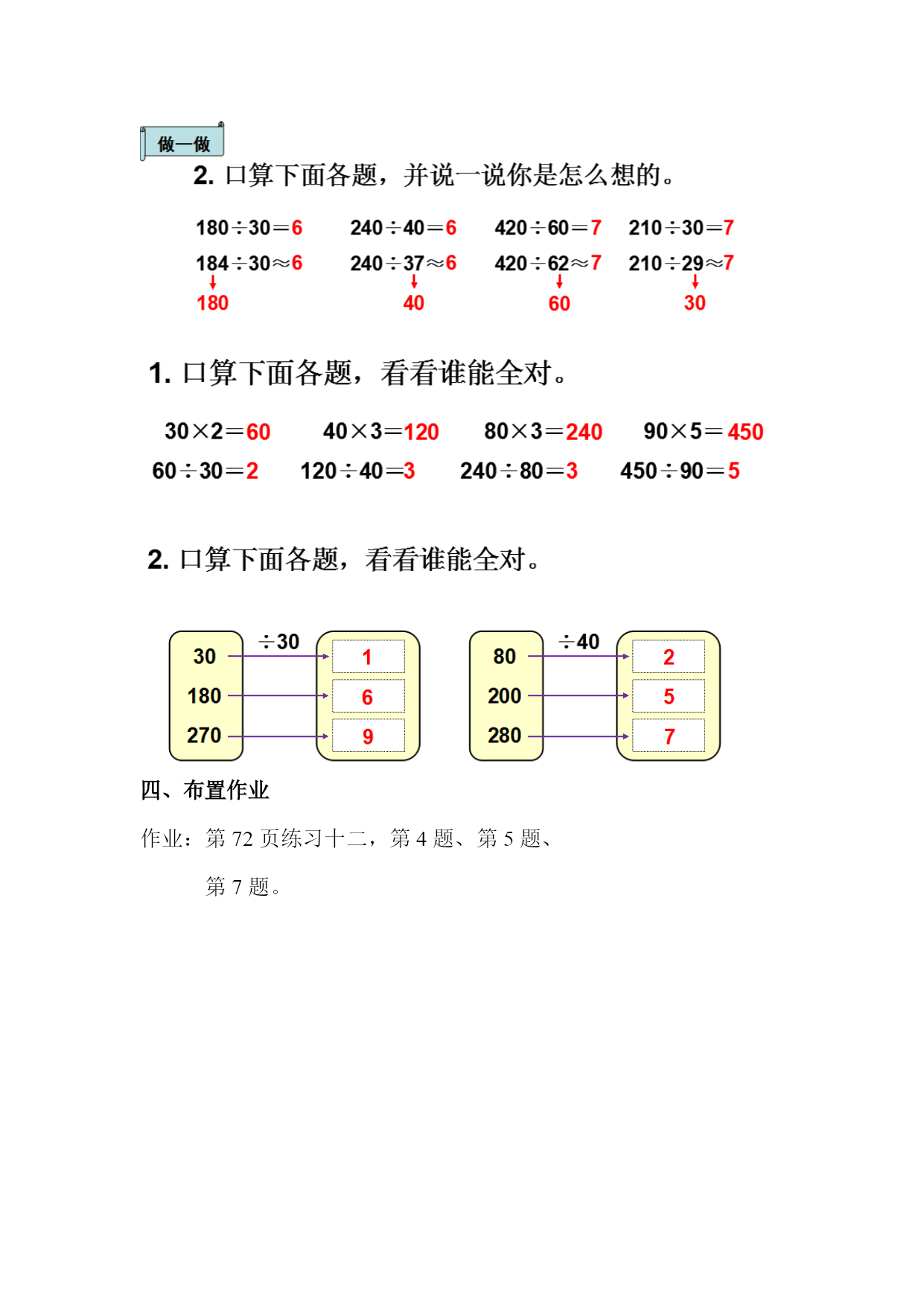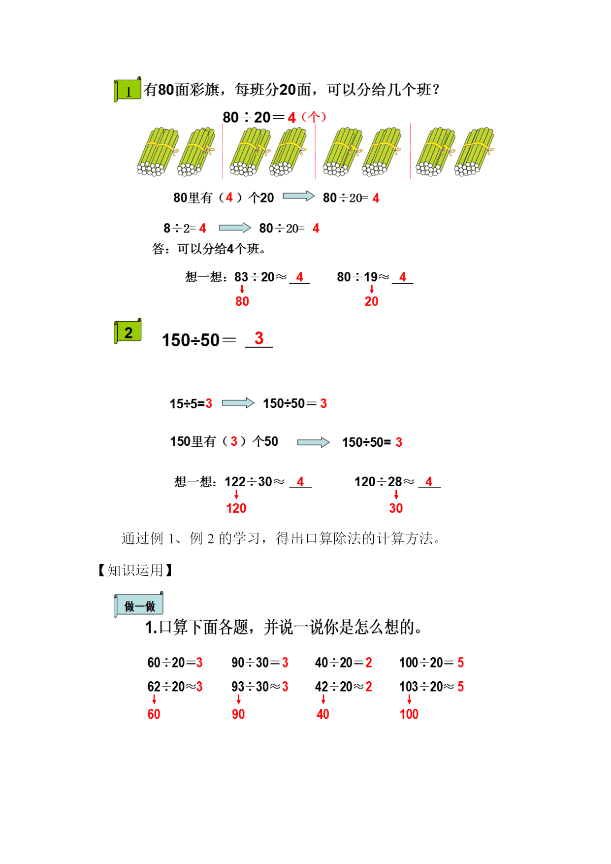 《口算除法》教学设计授课教师:王强【教学内容】人教版课标实验教材小学数学四年级上册例1、例2。【教学目标】1.知识与技能:通过复习旧知与学习新知让学生了解口算的简便快捷性;2.过程与方法:通过练习例1、例2的计算来掌握口算除法的方法;3.情感态度与价值观:培养学生在日常生活中运用口算除法的兴趣,提高学生的计算能力。【教学重点】使学生掌握口算除法的方法。【教学难点】灵活运用口算除法来解决实际生活中的具体问题。【教学准备】课件及教材【教学过程】一、复习导入,揭示课题通过“给小动物们找家”来复习表内除法进而揭示课题。探究新知通过例1、例2的学习,得出口算除法的计算方法。【知识运用】四、布置作业作业:练习十二,第4题、第5题、第7题。
