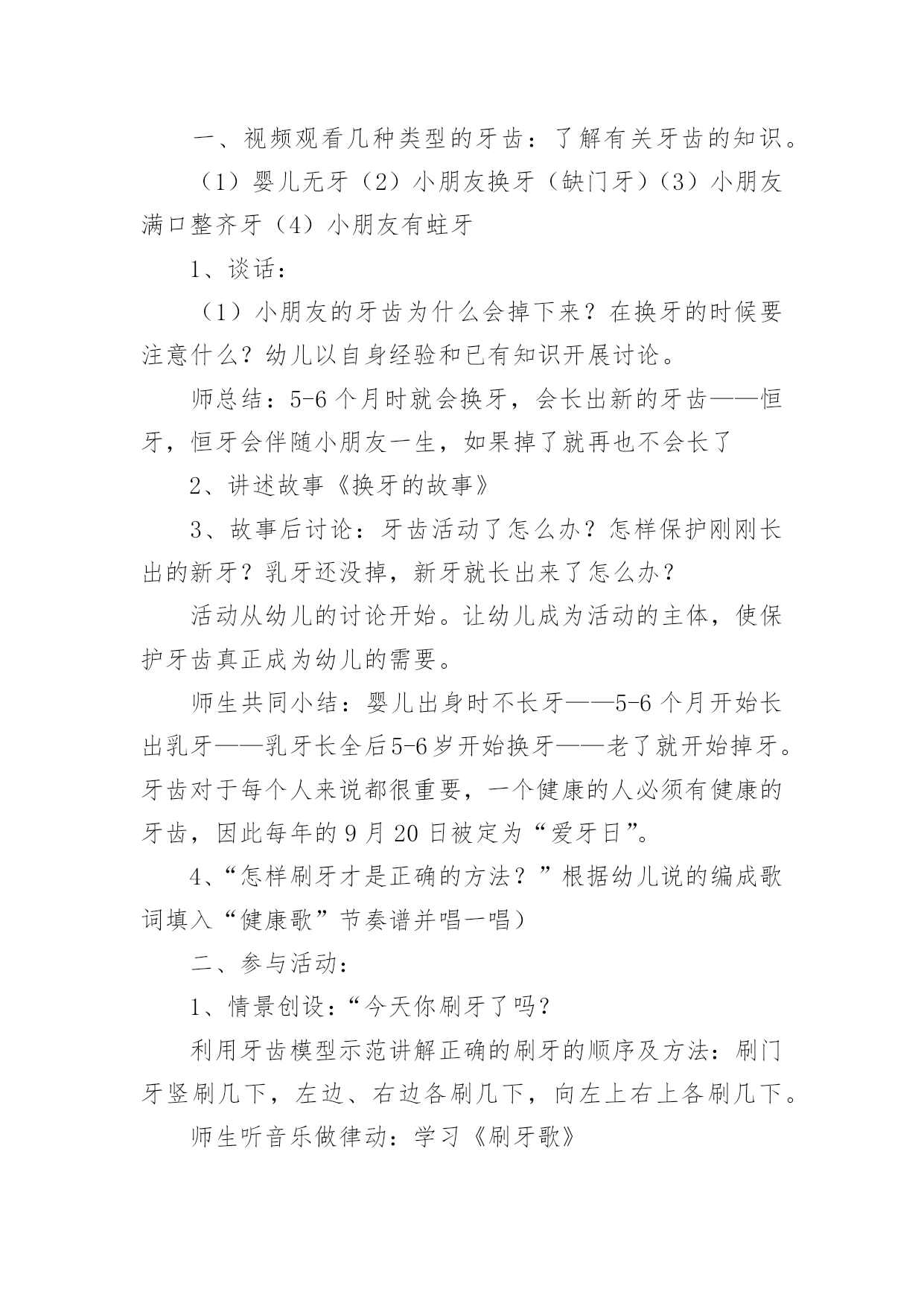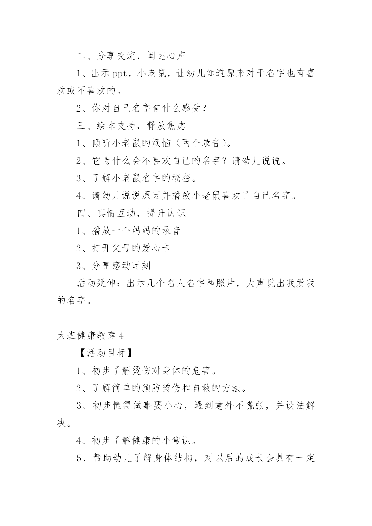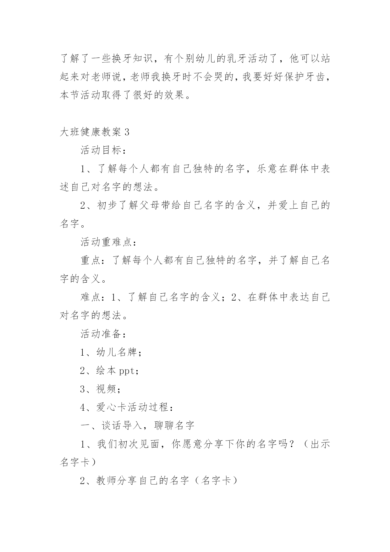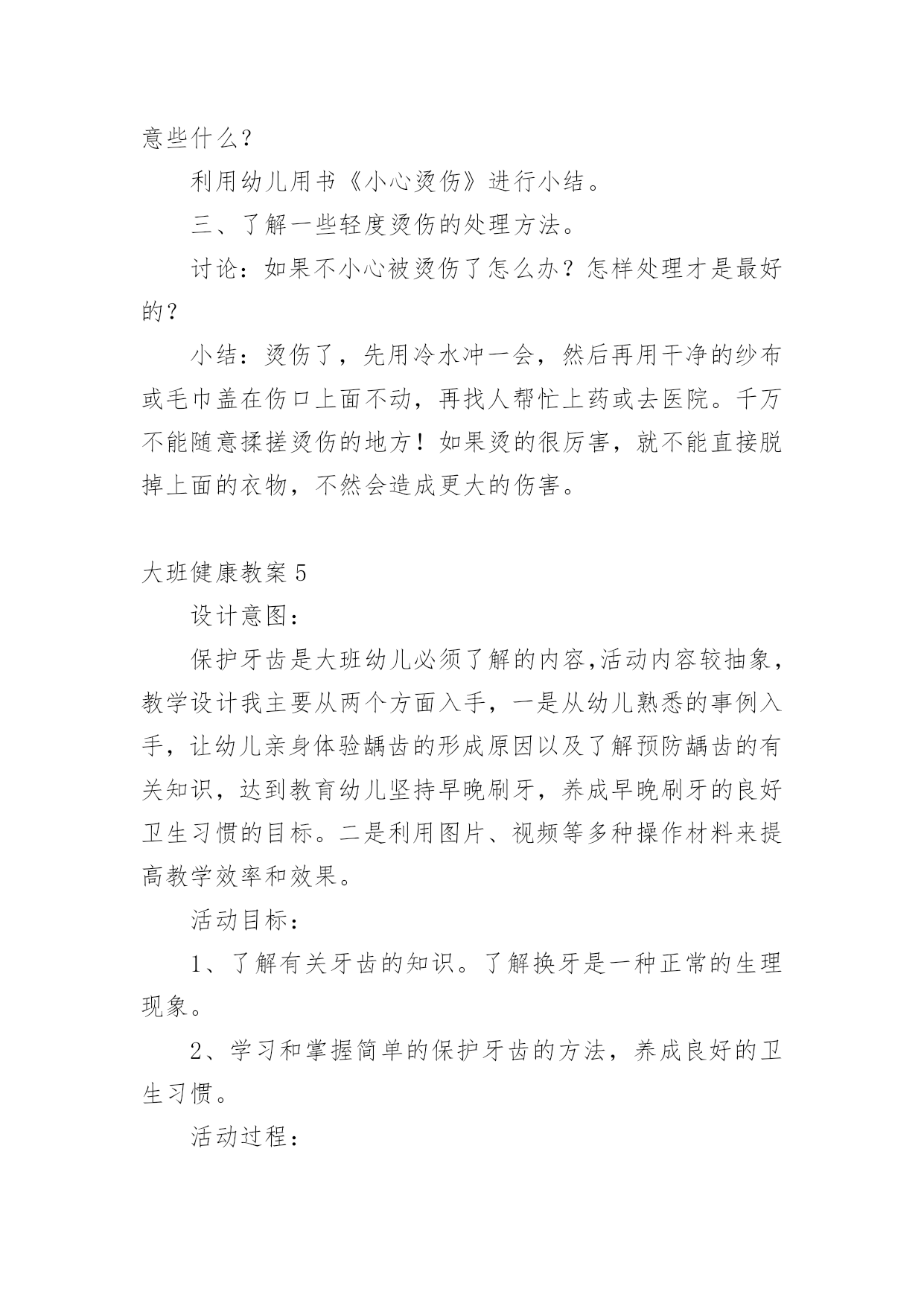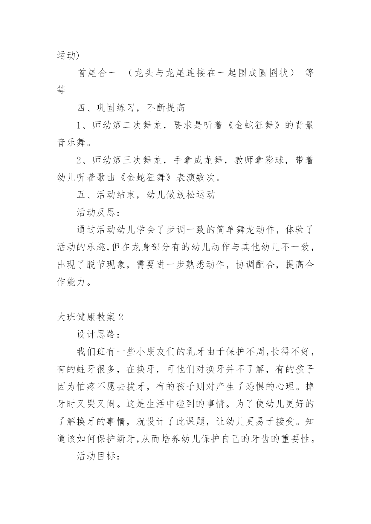 大班健康教案大班健康教案15篇作为一位杰出的教职工,通常会被要求编写教案,教案是备课向课堂教学转化的关节点。如何把教案做到重点突出呢?以下是小编收集整理的大班健康教案,仅供参考,欢迎大家阅读。大班健康教案1活动目标:1、通过多人配合创编各种舞龙的方法,培养幼儿相互合作的能力。2、通过活动培养幼儿对民间舞龙活动的兴趣,体验舞龙的快乐。3、考验小朋友们的反应能力,锻炼他们的个人能力。4、探索、发现生活中的多样性及特征。5、初步了解健康的小常识。活动重点难点:活动重点:能够跟随音乐熟悉舞龙动作。活动难点:龙头、龙身、龙尾在跑动的过程中动作协调一致。活动准备:人手一面做操红旗、舞龙视频、自制成龙一条。活动过程:一、创设情境,激趣导入出示舞龙的视频画面,引起幼儿的兴趣。他们在干什么?我们在过年的时候,总会在电视里看到好多人兴高采烈舞龙、舞狮,今天我们也来学学舞龙。(进行热身活动,活动一下。)二、学习舞龙,主动合作1、小朋友自己学一学舞龙的动作(幼儿自由练习)2、教师示范:舞龙有很多种,今天我们就来学一下“蟠龙出海”。教师先做一遍。讲解动作,手上动作:双手伸平,先向左,左手在上向上伸直,换右手在上伸直,向右伸平。幼儿自由练习,教师巡视纠正动作。幼儿说说自己的感受。3、幼儿人手一面做操红旗,手拿红旗自由组队进行练习。(教师巡回指导,帮助幼儿纠正动作。)4、教师小结幼儿刚才舞龙情况,并请各组舞给老师看。三、激发思维,开拓创新:小朋友想到的舞龙动作还有那些?(幼儿积极表演,师幼共同总结)摇头摆尾(左右摆臂、上下抖动、后面的人紧跟着龙头做动作彩龙旋转)灵龙戏珠(龙头跟着彩球灵活运动,后面的人跟着龙头运动)首尾合一(龙头与龙尾连接在一起围成圆圈状)等等四、巩固练习,不断提高1、师幼第二次舞龙,要求是听着《金蛇狂舞》的背景音乐舞。2、师幼第三次舞龙,手拿成龙舞,教师拿彩球,带着幼儿听着歌曲《金蛇狂舞》表演数次。五、活动结束,幼儿做放松运动活动反思:通过活动幼儿学会了步调一致的简单舞龙动作,体验了活动的乐趣,但在龙身部分有的幼儿动作与其他幼儿不一致,出现了脱节现象,需要进一步熟悉动作,协调配合,提高合作能力。大班健康教案2设计思路:我们班有一些小朋友们的乳牙由于保护不周,长得不好,有的蛀牙很多,在换牙,可他们对换牙并不了解,有的孩子因为怕疼不愿去拔牙,有的孩子则对产生了恐惧的心理。掉牙时又哭又闹。这是生活中碰到的事情。为了使幼儿更好的了解换牙的事情,就设计了此课题,让幼儿更易于接受。知道该如何保护新牙,从而培养幼儿保护自己的牙齿的重要性。活动目标:一、知道换牙是一种正常的生理现象,不用害怕。二、能围绕换牙话题进行讨论,并大胆、清楚的表达自己的见解。三、了解换牙时应注意的卫生,并学会保护新长出的牙齿。活动准备:一、活动前了解本班幼儿换牙的情况,部分幼儿已开始换牙。二、乳牙图片、恒牙模型;汉字:换牙、乳牙、恒牙;记号笔、手工纸每人一份。三、事先与卫生老师联系好。活动过程:一、回忆经验:通过讲故事,引起兴趣。乐乐的牙齿怎么了?好好的牙齿怎么会掉下来呢?谁来说说换牙是怎么回事?:我们生下来以后慢慢长出来的一口牙齿叫乳牙,乳牙比较小,也不够坚硬,当我们慢慢长大后,到了五六岁的时候,乳牙就会脱落,开始长出新牙,这新长出的牙叫恒牙。恒牙比较大而且很坚硬,比乳牙还要多,对人的身体很重要。恒牙掉了就不会再长出新牙。乳牙脱掉长出恒牙,就叫换牙。二、经验交流:结合自身经验,掌握换牙的卫生知识。1.请班上个别牙齿松动的或脱落长出新牙的小朋友,分别让大家看看。你们想不想知道换牙的时候是什么感觉?谁想问问他们?2.提问:1)如果你的牙齿活动了,能不能用手摇摇让它快一点掉下来?为什么?2)有的小朋友喜欢用舌头去舔刚长出来的牙齿,这样做对吗?为什么?3)有些小朋友,乳牙还没掉,新牙就在旁边长出来了,这时该怎么办?有些小朋友的牙齿掉了很长很长时间了,还没有长出新牙,怎么办呢?4)你们还有什么换牙的问题要问吗?:原来我们在换牙时用不着害怕,对活动的牙齿不要用手去摇,也不要用舌头舔刚长出的新牙,对换牙时出现的问题,可以请爸爸、妈妈帮忙,也可以到医院请医生帮忙。三、绘画:如何保护新牙。1.当我们换牙齿的时候,应该怎样保护新牙齿呢?2.交流幼儿的护齿方法。四、经验提升:1.说说除了这些方法,还有其它保护牙齿的方法吗?2.请卫生老师。平时换牙时,如果你还有什么问题,可以问问大家,也可以问问卫生老师。活动反思:通过师生互动,让幼儿大胆、清楚的说己的见解,从而提高幼儿的语言表达能力,在老师的引导之下,幼儿画画,说说中了解了该如何保护自己的牙齿。幼儿经过本次活动都了解了一些换牙知识,有个别幼儿的乳牙活动了,他可以站起来对老师说,老师我换牙时不会哭的,我要好好保护牙齿,本节活动取得了很好的效果。大班
