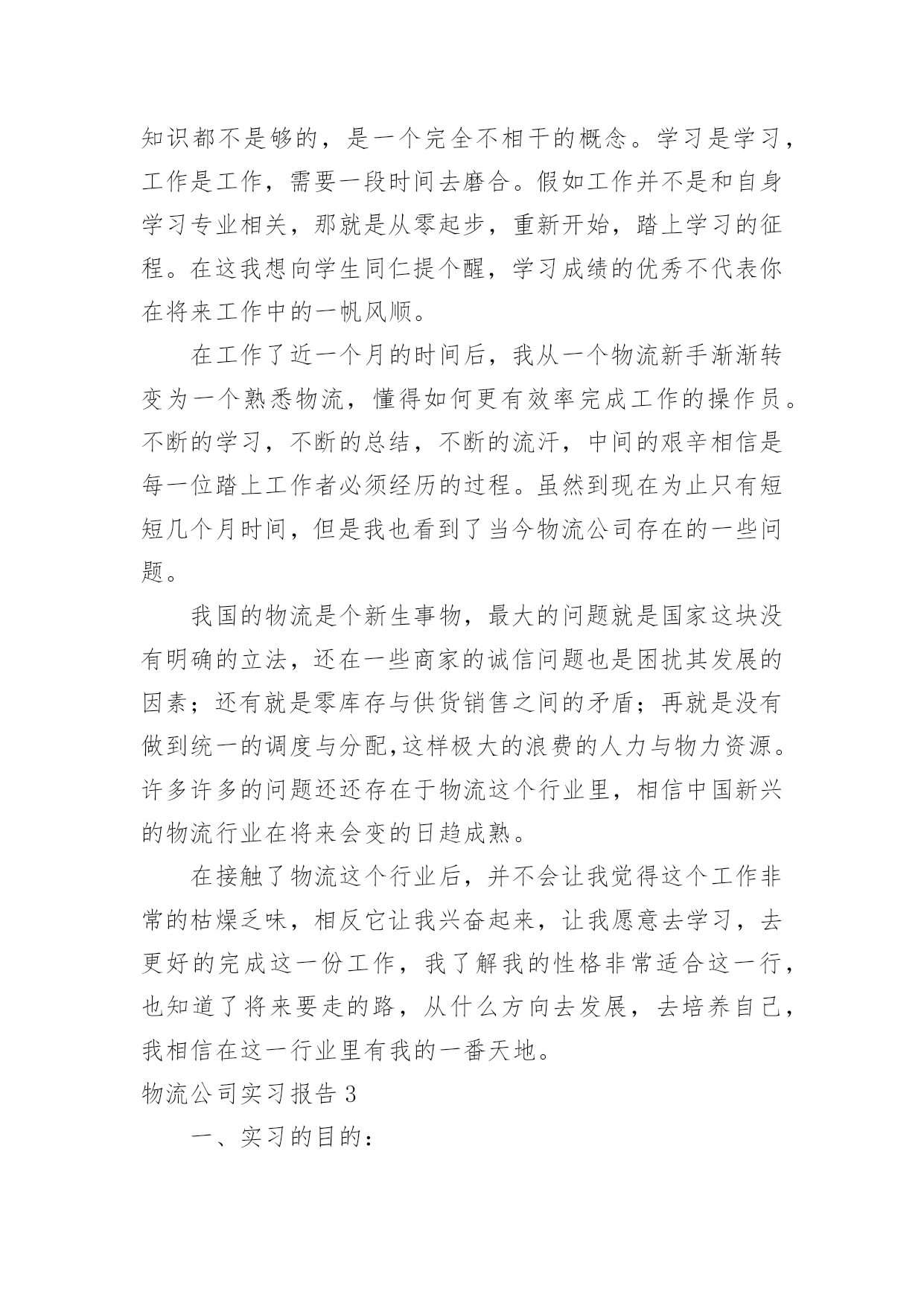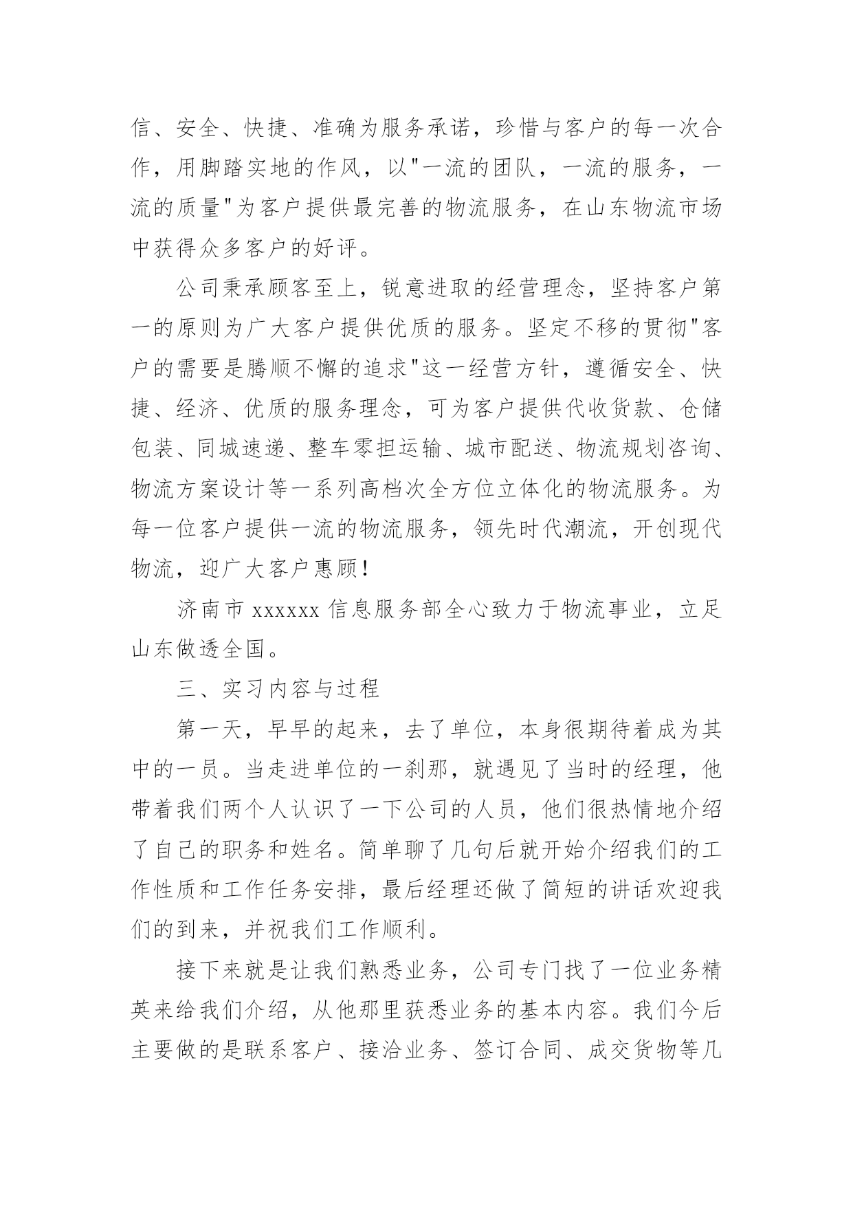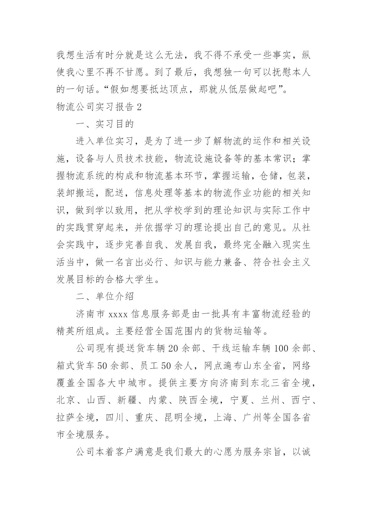 物流公司实习报告物流公司实习报告汇编15篇随着个人的文明素养不断提升,报告与我们的生活紧密相连,我们在写报告的时候要注意逻辑的合理性。一起来参考报告是怎么写的吧,下面是小编为大家整理的物流公司实习报告,供大家参考借鉴,希望可以帮助到有需要的朋友。物流公司实习报告120xx年1月19日至3月30日这一段时间,我在广州市新邦物流效劳有限公司花都花东停业部停止毕业消费实习。这是第一次正式与社会接轨踏上工作岗位,开端与以往完整不一样的生活。时间如梭,三个多月的实习锻炼时间在人生的长河中只要那么一小段,虽说实习的时间是有限的,但我的收获却很大。我永远不会遗忘与同事们一同走过的短暂而充实的日子,谢谢你们的照顾和批判、时间太短暂了,我们只能走马观花似地去接触和吸收新的事物,但我们经过时间也学到了很多书本上没有的学问,即增长了见识,开阔了视野,又增长了理论操作才能,丰厚了生活阅历,这将是我们走向社会的一笔最为珍贵的财富,从基本上处理了我的一些思想认识问题,促进了本身世界观的转变。经过在广州市新邦物流效劳有限公司花都花动停业部遭到的暖和,教育和鼓舞,使我加强了自自信心和骄傲感,坚决了本人的信心,更为本人日后就业指明了方向,对本人的社会定位和本身价值停止了一次客观评价,发现本人与理想之间的差距,处理了眼高手低的问题。从学生的身份转变到一名公司职员,短短3个多月的工作过程使我收获颇丰。不只是在专业学问方面,最主要是在为人处事方面。社会在加速度地发作变化,对人才的请求也越来越高,要用开展的目光看问题,得不时进步思想认识,完善本人。经过3个月的实习,让我学会了许多,学会了生活,学会了做人,学会了工作。懂得了也了解了“能够享用的生活是短暂的”的真实含义。在这里还要感激一切的人,赵经理,客服主管小燕,柜台主管张海桃,业务学问丰厚的小谭,生动搞笑的北方人小史,认真担任的广东人小刘,热心协助我的同事小玉,小殷,小钟,小伍,小李,小冯,三个小王。还有会计小陈,配送部小余,谢谢你们。你们让我学会了很多学不到的东西,我想在以后的日子,我一定会比如今成熟很多。在工作的.过程中,感触最深的四个字就是"接受"和"认真",刚从学校出来的"单纯学子"对许多事都有"看不惯的态度"。如今想想,其实没必要那样一时的愤慨。由于要干好本人不喜欢的事情,不就要挨骂,最终倒运还是本人。其实许多生活的原理都晓得,凡事多一份心。只是当发作在本人身上时却显得不那么苏醒。还好,从亲身的阅历得到了分明的答案。最后,终于走了本人选择的那条路,也承受一些理想。我想生活有时分就是这么无法,我不得不承受一些事实,纵使我心里不再不甘愿。到了最后,我想独一句可以抚慰本人的一句话。“假如想要抵达顶点,那就从低层做起吧”。物流公司实习报告2一、实习目的进入单位实习,是为了进一步了解物流的运作和相关设施,设备与人员技术技能,物流设施设备等的基本常识;掌握物流系统的构成和物流基本环节,掌握运输,仓储,包装,装卸搬运,配送,信息处理等基本的物流作业功能的相关知识,做到学以致用,把从学校学到的理论知识与实际工作中的实践贯穿起来,并依据学习的理论提出自己的意见。从社会实践中,逐步完善自我、发展自我,最终完全融入现实生活当中,做一名言出必行、知识与能力兼备、符合社会主义发展目标的合格大学生。二、单位介绍济南市xxxx信息服务部是由一批具有丰富物流经验的精英所组成。主要经营全国范围内的货物运输等。公司现有提送货车辆20余部、干线运输车辆100余部、箱式货车50余部、员工50余人,网点遍布山东全省,网络覆盖全国各大中城市。提供主要方向济南到东北三省全境,北京、山西、新疆、内蒙、陕西全境,宁夏、兰州、西宁、拉萨全境,四川、重庆、昆明全境,上海、广州等全国各省市全境服务。公司本着客户满意是我们最大的心愿为服务宗旨,以诚信、安全、快捷、准确为服务承诺,珍惜与客户的每一次合作,用脚踏实地的作风,以"一流的团队,一流的服务,一流的质量"为客户提供最完善的物流服务,在山东物流市场中获得众多客户的好评。公司秉承顾客至上,锐意进取的经营理念,坚持客户第一的原则为广大客户提供优质的服务。坚定不移的贯彻"客户的需要是腾顺不懈的追求"这一经营方针,遵循安全、快捷、经济、优质的服务理念,可为客户提供代收货款、仓储包装、同城速递、整车零担运输、城市配送、物流规划咨询、物流方案设计等一系列高档次全方位立体化的物流服务。为每一位客户提供一流的物流服务,领先时代潮流,开创现代物流,迎广大客户惠顾!济南市xxxxxx信息服务部全心致力于物流事业,立足山东做透全国。三、实习内容与过程第一天,早早的起来,去了单位,本身很期待着成为其中的一员。当走进单位的一刹那,就遇见了当时的经理,他带着我们两个人认识了一下公司的人员,他们很热情地介绍了自己的职务和姓名。简单聊了几