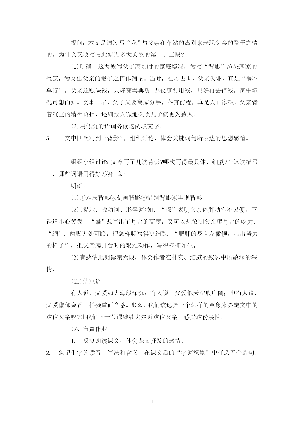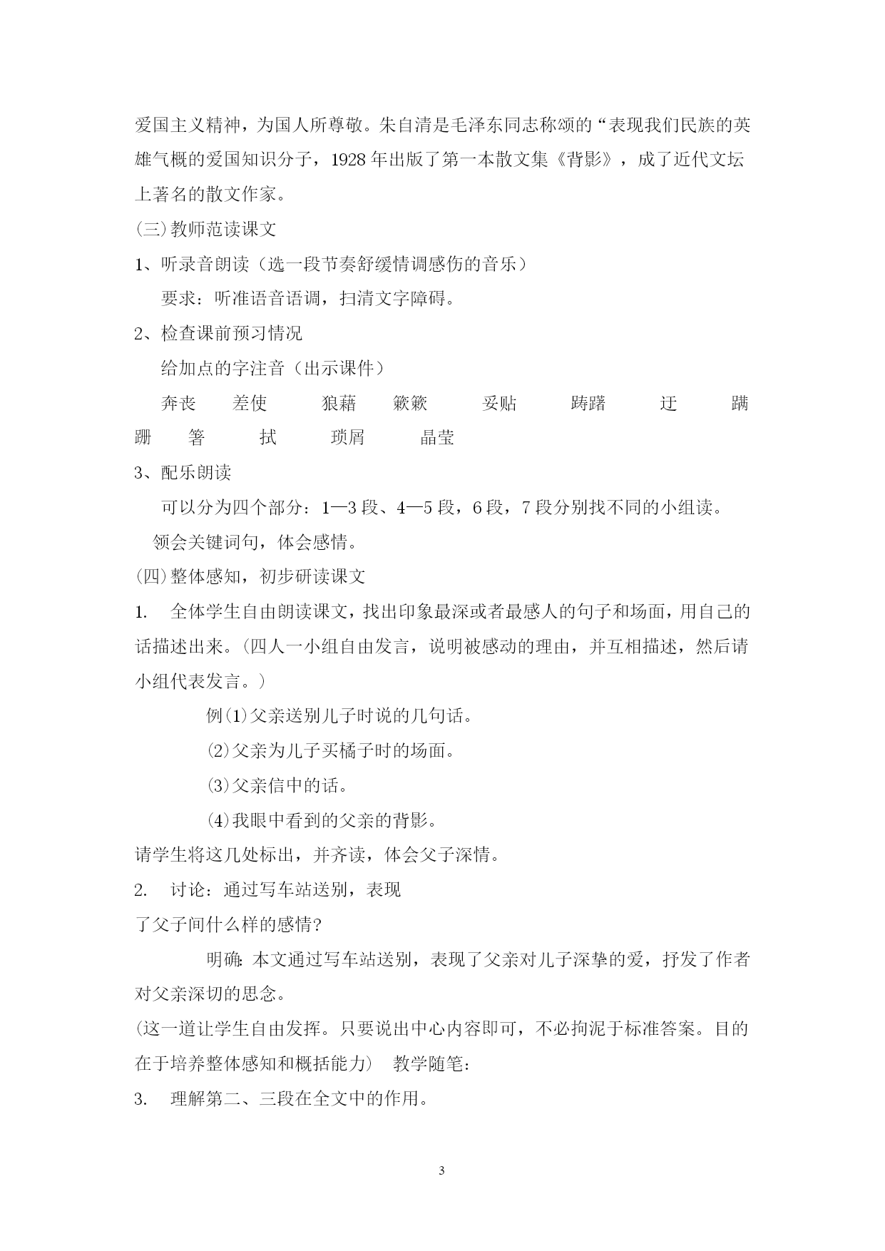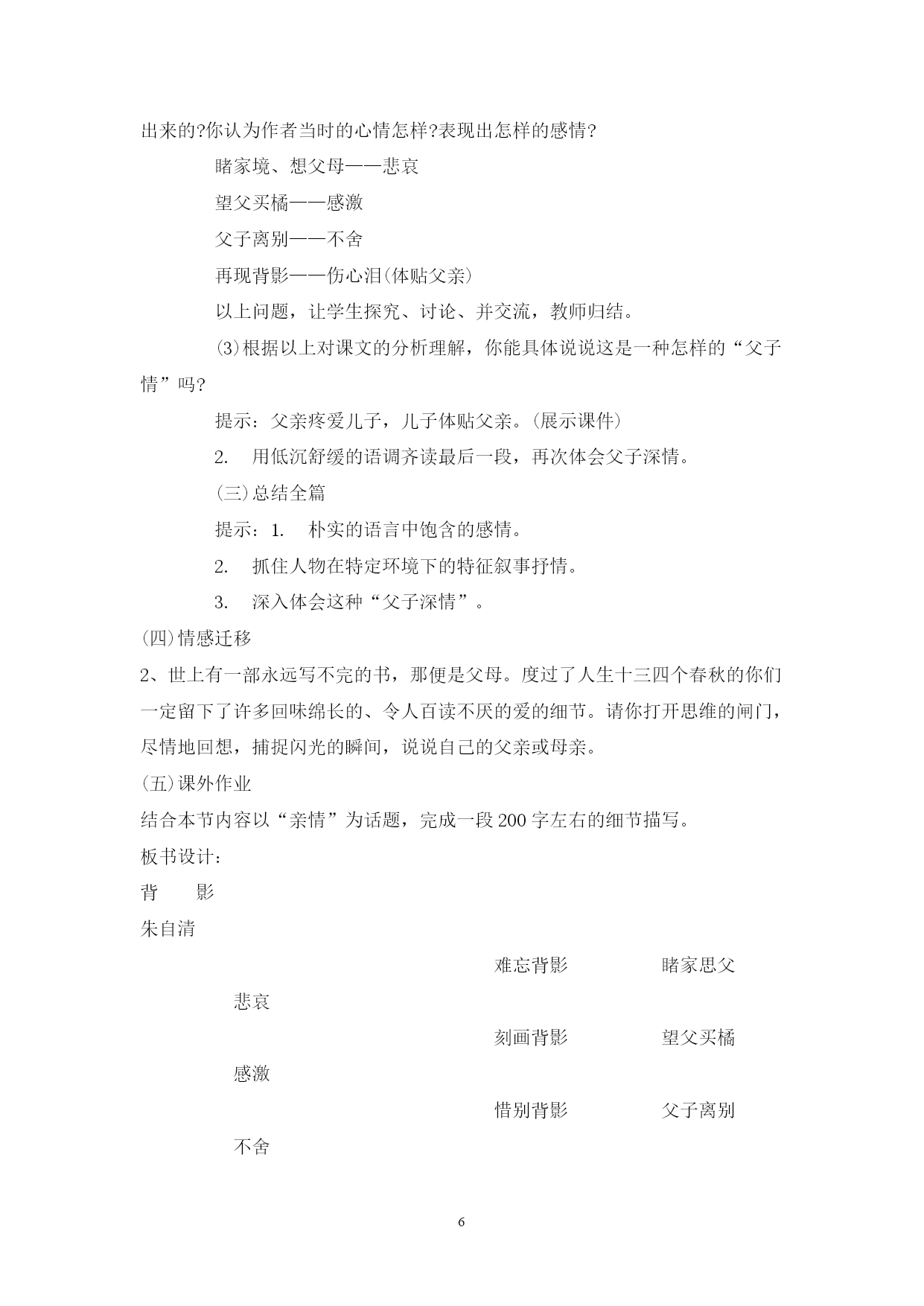 《背影》教学设计广安市前锋区虎城小学校张俊杰一、教学目标:知识目标:走近作者,认识生字、生词。抓住某一感情的聚焦点展示人物心灵的写作方法;散文的特点及散文的选材。能力目标:学习在平实的叙述、抒情中蕴藏着的极为精巧的构思;关键语句含义的理解。情感目标:,认真体会文中所表现的父子之间的深厚的感情,理解语文与家庭生活的关系。二、教学重点和难点:教学重点:背影是全文描写的焦点,但背影不仅是父亲的形与行;要深刻理解父亲的爱子之心和作者的念父之情,不能不顾及父亲所说的话。因此,我把父亲的形、行、言作为相互联系的整体进行分析并以此为重点引导学生体会作者的思想感情。教学难点:语文课程标准还要求学生在通读课文的基础上,理清思路,理解主要内容把握文章结构。初二学生,他们的阅读范围还不是很广,掌握的阅读技巧不是很多。抓住某一感情的聚焦点展示人物心灵的写作方法;如何理解文中父亲那个不怎么优美的背影?学生还无能为力。因此,我把此当作本文的教学难点。三、教学思路:这是朱自清先生写于1925年10月的一篇回忆性记叙散文。文章深刻的表现了父亲的爱子之心和作者的念父之情。背影是全文描写的焦点,也是叙事的线索。作者除了对背影作了笔酣墨畅的细致描写外,还以背影为中心,安排了许多精彩的衬托和铺垫。《背影》无论记人、叙事、抒情都十分平实,语言淳朴自然,毫无矫揉造作之处,却打动了几代读者的心。在一个平凡、朴素的背影上刻下了两个质朴而深沉的大字“父爱”。而这一主题的表达在物质充裕的今天,无论对我们还是学生都具有极其现实的教育意义。《背影》是一篇家喻户晓的名篇,作者以洗尽铅华的质朴演绎了中华传统文化的精义:亲情、孝道与感恩。新课标中指出:“语文课程丰富的人文内涵对学生的精神领域影响是深广的,学生对语文材料的反应往往是多元的。因此,应该重视语文的熏陶感染作用,注重教学内容的价值取向,同时也应尊重学生在学习过程中的独特体验。”因此,我在教学中利用多媒体充分调动学生的学习兴趣和积极性,强调情感体验,让学生在学习课文的过程中得到审美愉悦和道德情感的熏陶。语文课程标准还要求学生在通读课文的基础上,理清思路,理解主要内容把握文章结构。初二学生,他们的阅读范围还不是很广,掌握的阅读技巧不是很多。抓住某一感情的聚焦点展示人物心灵的写作方法;如何理解文中父亲那个不怎么优美的背影?学生还无能为力。因此,我把此当作本文的教学难点。背影是全文描写的焦点,但背影不仅是父亲的形与行;要深刻理解父亲的爱子之心和作者的念父之情,不能不顾及父亲所说的话。因此,我把父亲的形、行、言作为相互联系的整体进行分析并以此为重点引导学生体会作者的思想感情。四、教学过程第一课时(一)导入新课(运用多媒体播放歌曲《父亲》)一首熟悉的老歌让我们想起了自己的父亲,那些默默操劳,默默关心我们的父亲。那是怎样让人心动的一份父爱呀。今天让我们带着这份感动再来欣赏一篇文质兼美的散文。它曾以质朴的语言,真挚的亲情感动了几代人。这就是朱自清先生的散文《背影》。(板书《背影》)设计意图:激发学生情感,创设有利于本课学习的氛围。(二)作者简介朱自清(1898—1948),江苏省扬州市人。现代散文家、诗人、学者、民主战士。朱自清字佩弦。祖籍浙江绍兴,主要作品有《朱自清散文集》。我们熟知的作品有《匆匆》、《春》、《荷塘月色》、《桨声灯影里的秦淮河》等。他在贫病交加的处境下不买美国“救济粮”,表现了高尚的民族气节和爱国主义精神,为国人所尊敬。朱自清是毛泽东同志称颂的“表现我们民族的英雄气概的爱国知识分子,1928年出版了第一本散文集《背影》,成了近代文坛上著名的散文作家。(三)教师范读课文1、听录音朗读(选一段节奏舒缓情调感伤的音乐)要求:听准语音语调,扫清文字障碍。2、检查课前预习情况给加点的字注音(出示课件)奔丧差使狼藉簌簌妥贴踌躇迂蹒跚箸拭琐屑晶莹3、配乐朗读可以分为四个部分:1—3段、4—5段,6段,7段分别找不同的小组读。领会关键词句,体会感情。(四)整体感知,初步研读课文1.全体学生自由朗读课文,找出印象最深或者最感人的句子和场面,用自己的话描述出来。(四人一小组自由发言,说明被感动的理由,并互相描述,然后请小组代表发言。)例(1)父亲送别儿子时说的几句话。(2)父亲为儿子买橘子时的场面。(3)父亲信中的话。(4)我眼中看到的父亲的背影。请学生将这几处标出,并齐读,体会父子深情。2.讨论:通过写车站送别,表现了父子间什么样的感情?明确:本文通过写车站送别,表现了父亲对儿子深挚的爱,抒发了作者对父亲深切的思念。(这一道让学生自由发挥。只要说出中心内容即可,不必拘泥于标准答案。目的在于培养整体感知和概括能力)教学随笔:3.理解第二、三段在全文中的作用。提问:本文是通过写“我”与父亲在车站的离别来表现父亲的爱子之情的,为什么